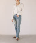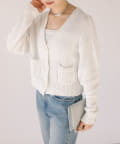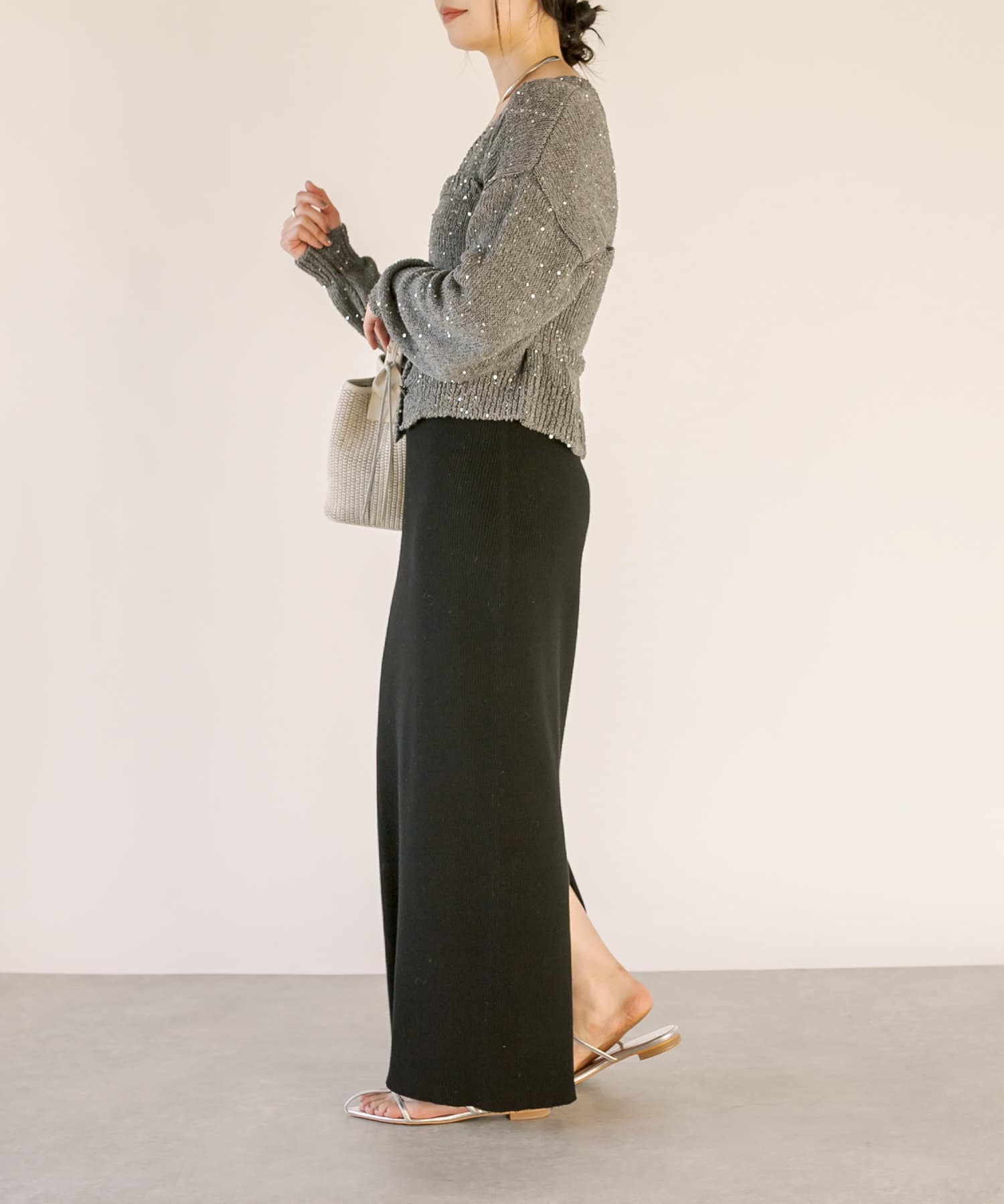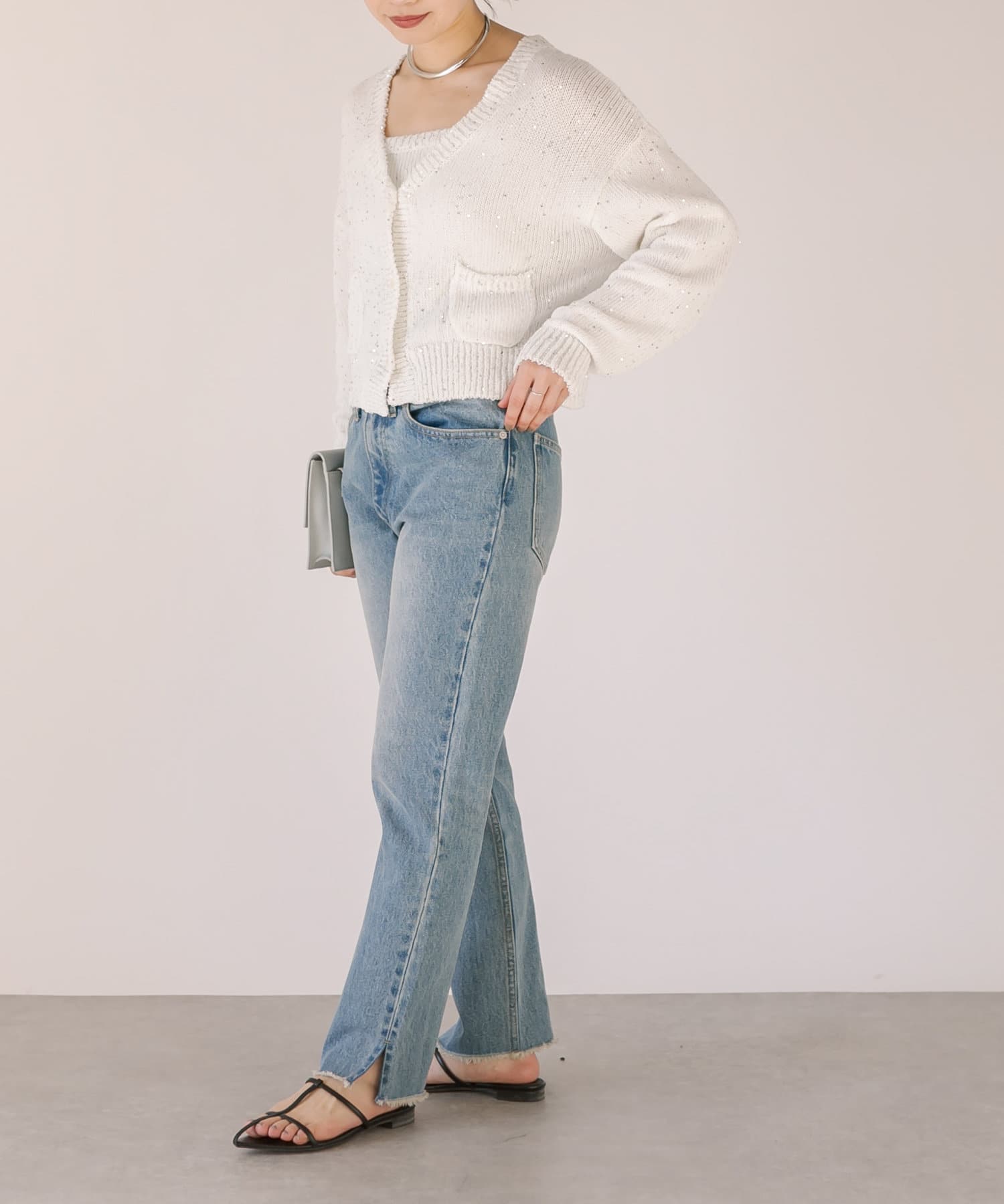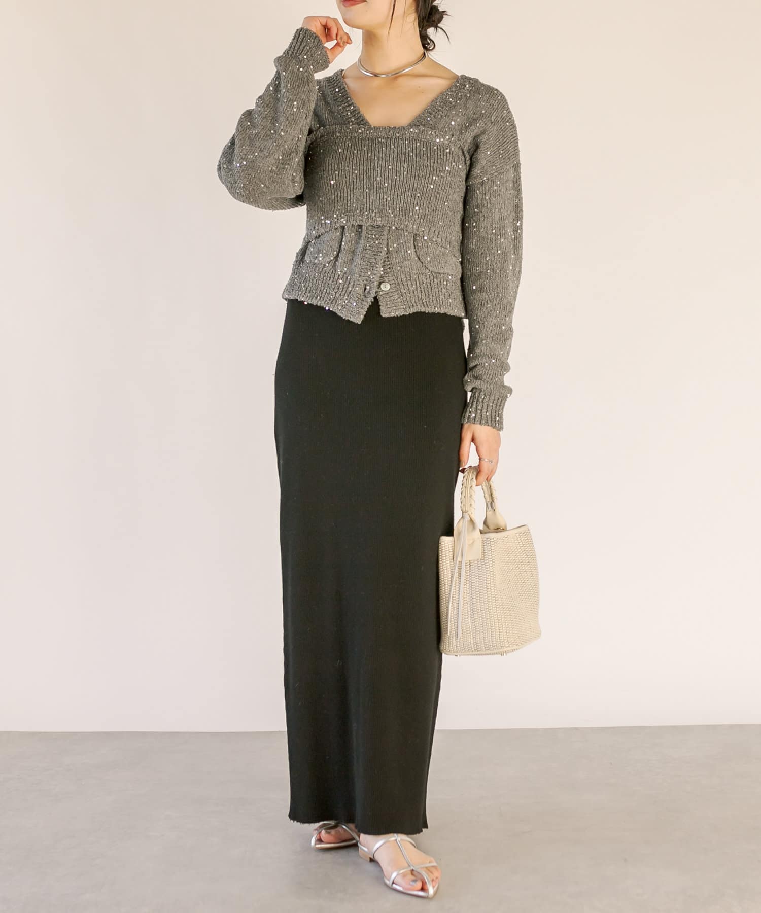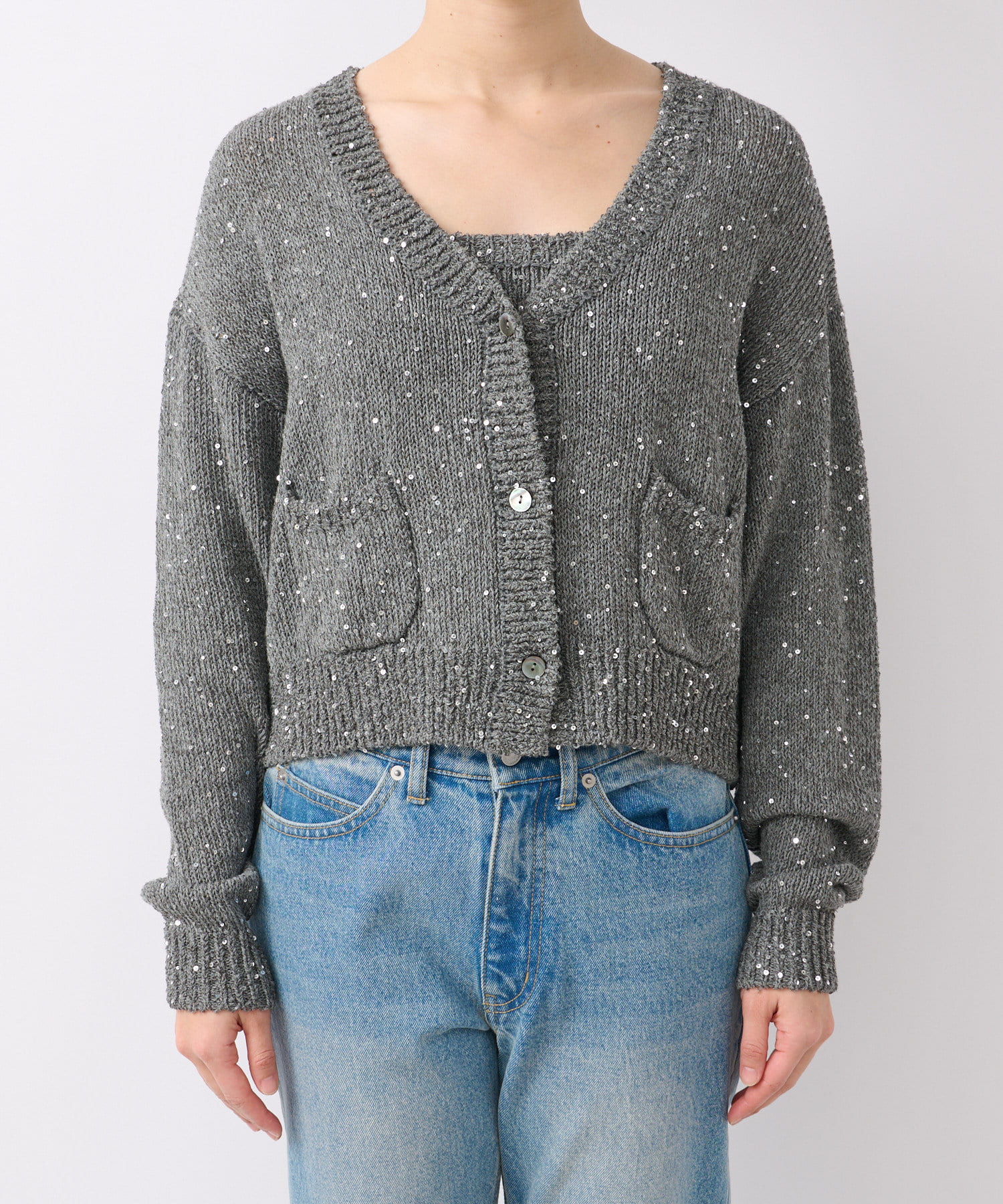 同素材のベアトップがセットになっており、インに着てカーディガンから覗かせたり、カーディガンの上から着る着こなしもおすすめ。