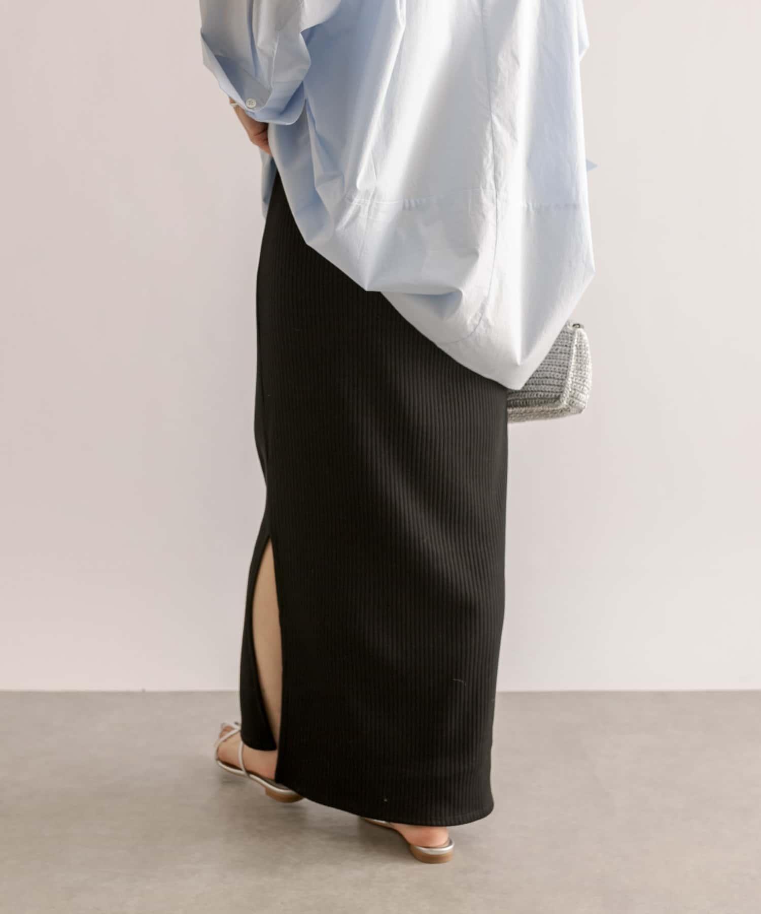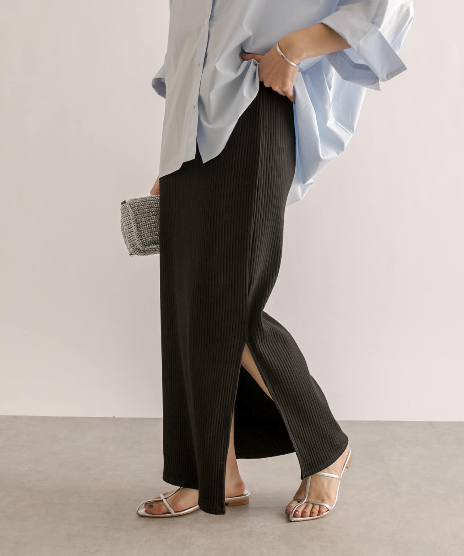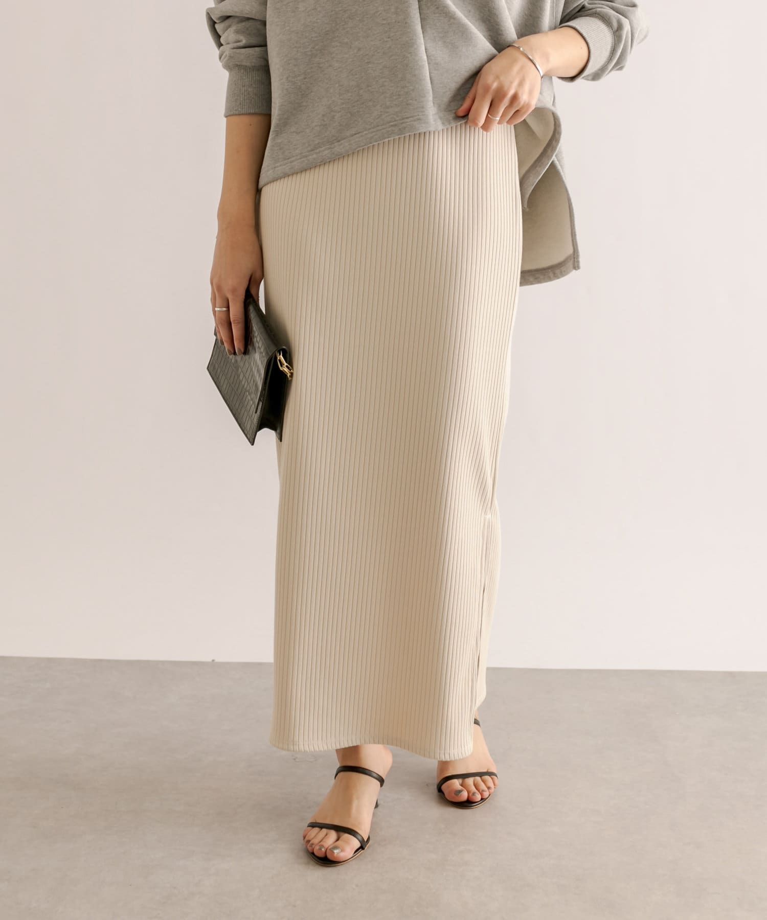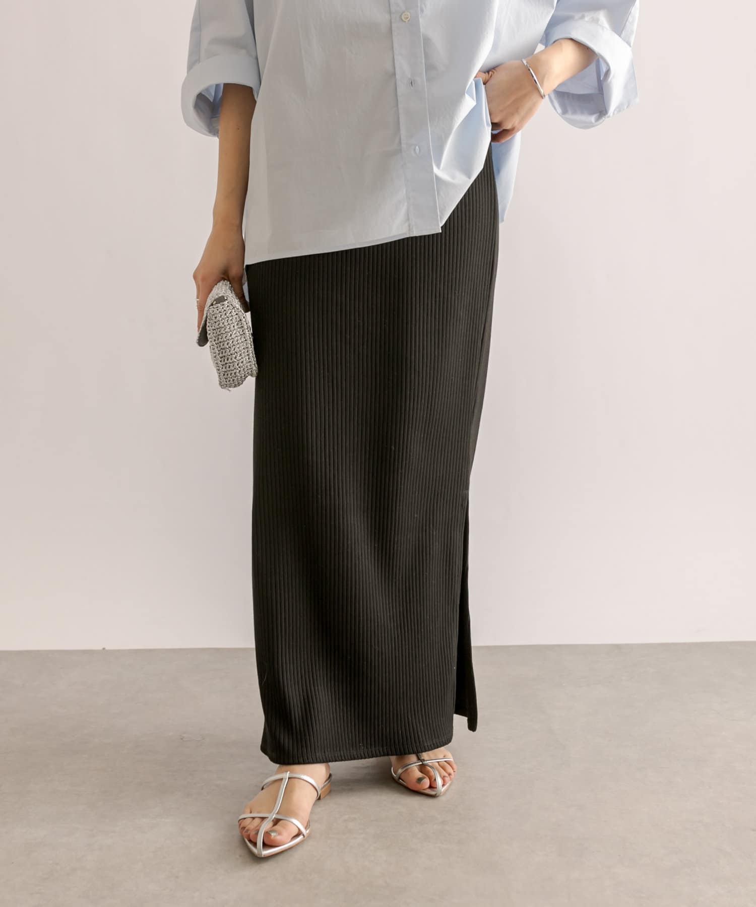 リブ素材を使用し、やわらかな着心地が魅力のタイトスカート。