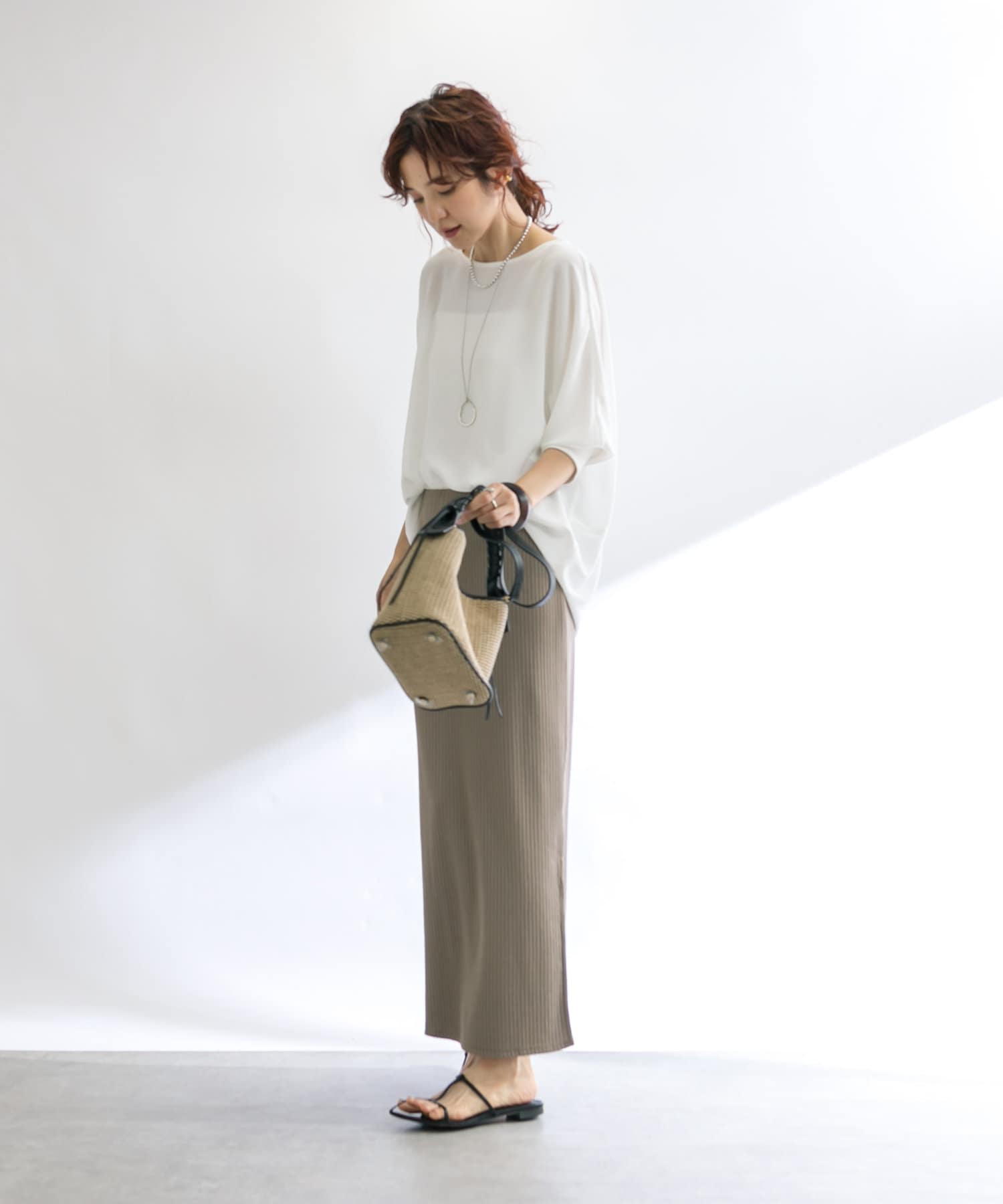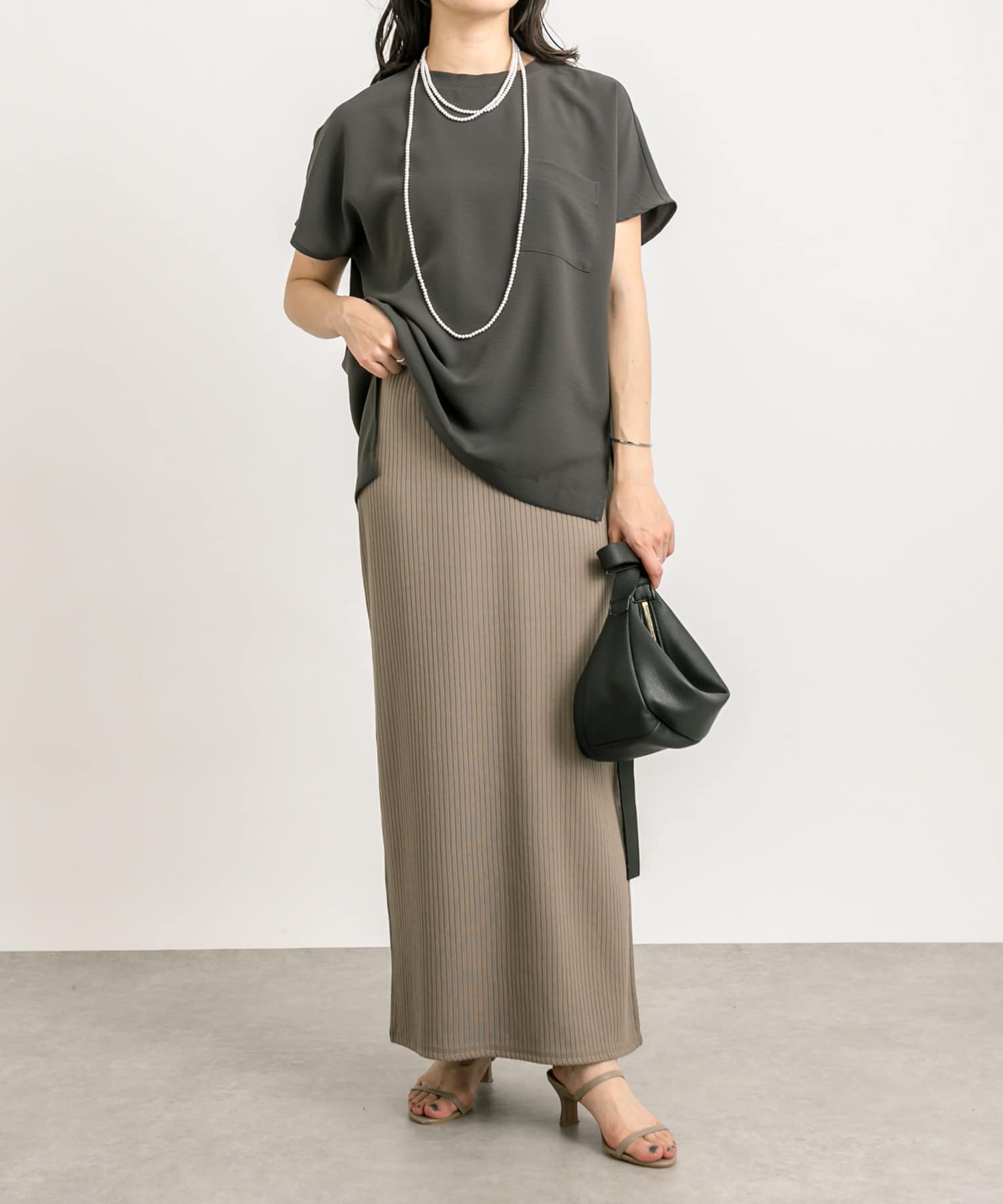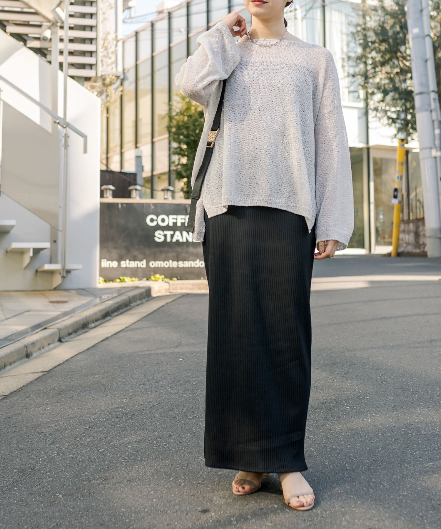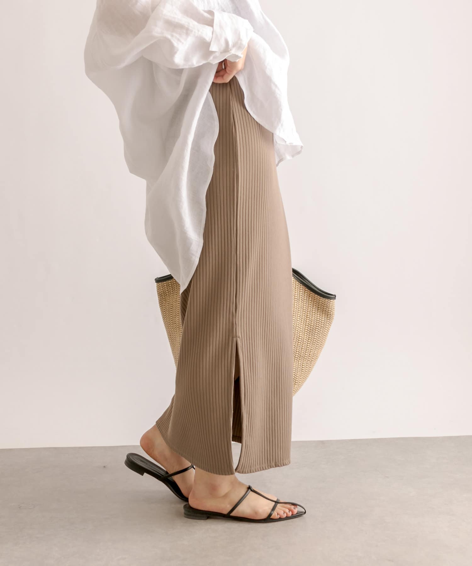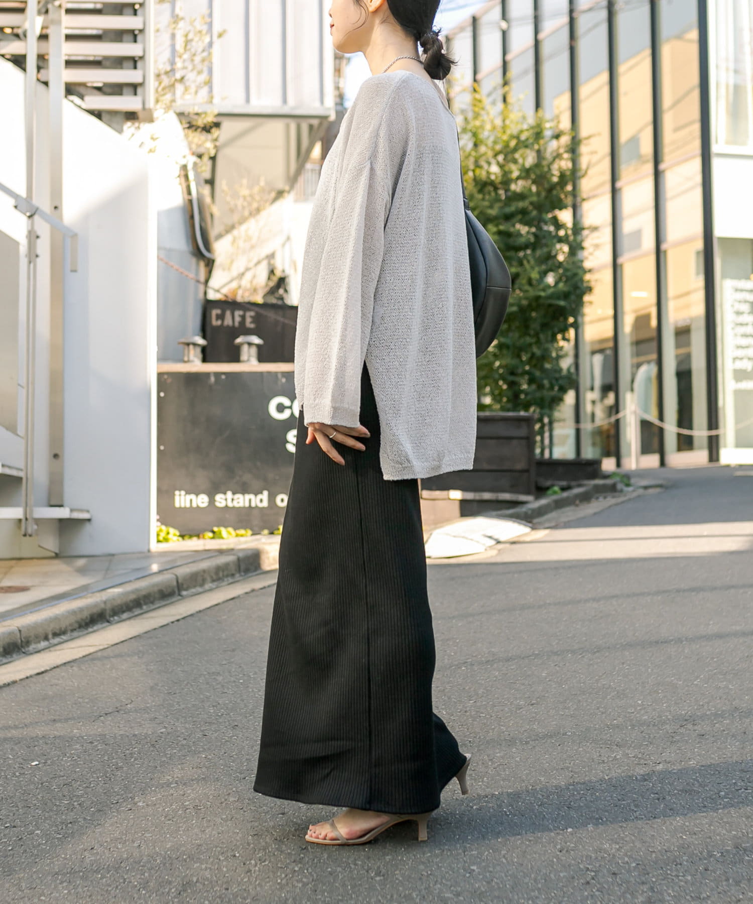 リブ素材を使用し、やわらかな着心地が魅力のタイトスカート。
