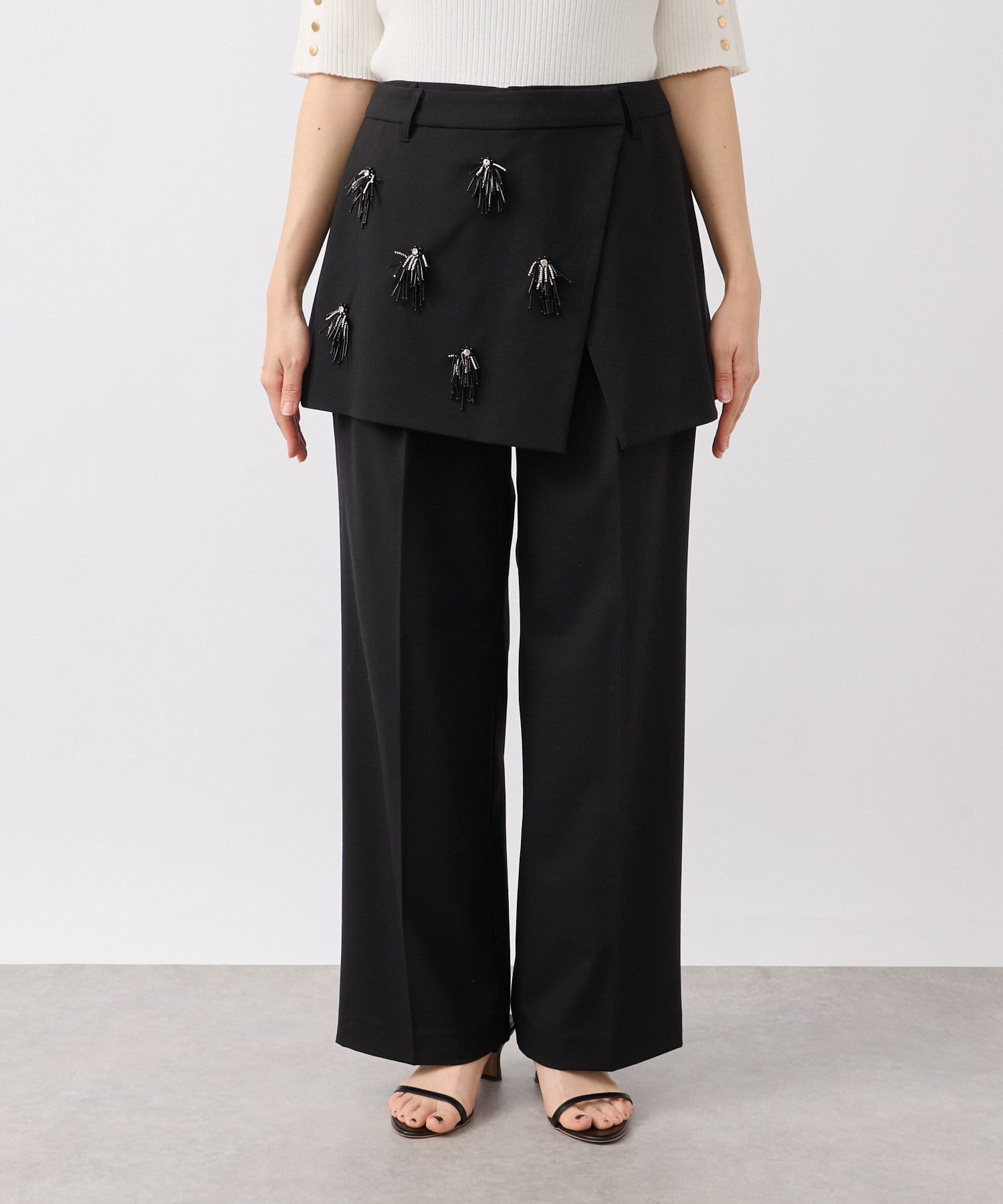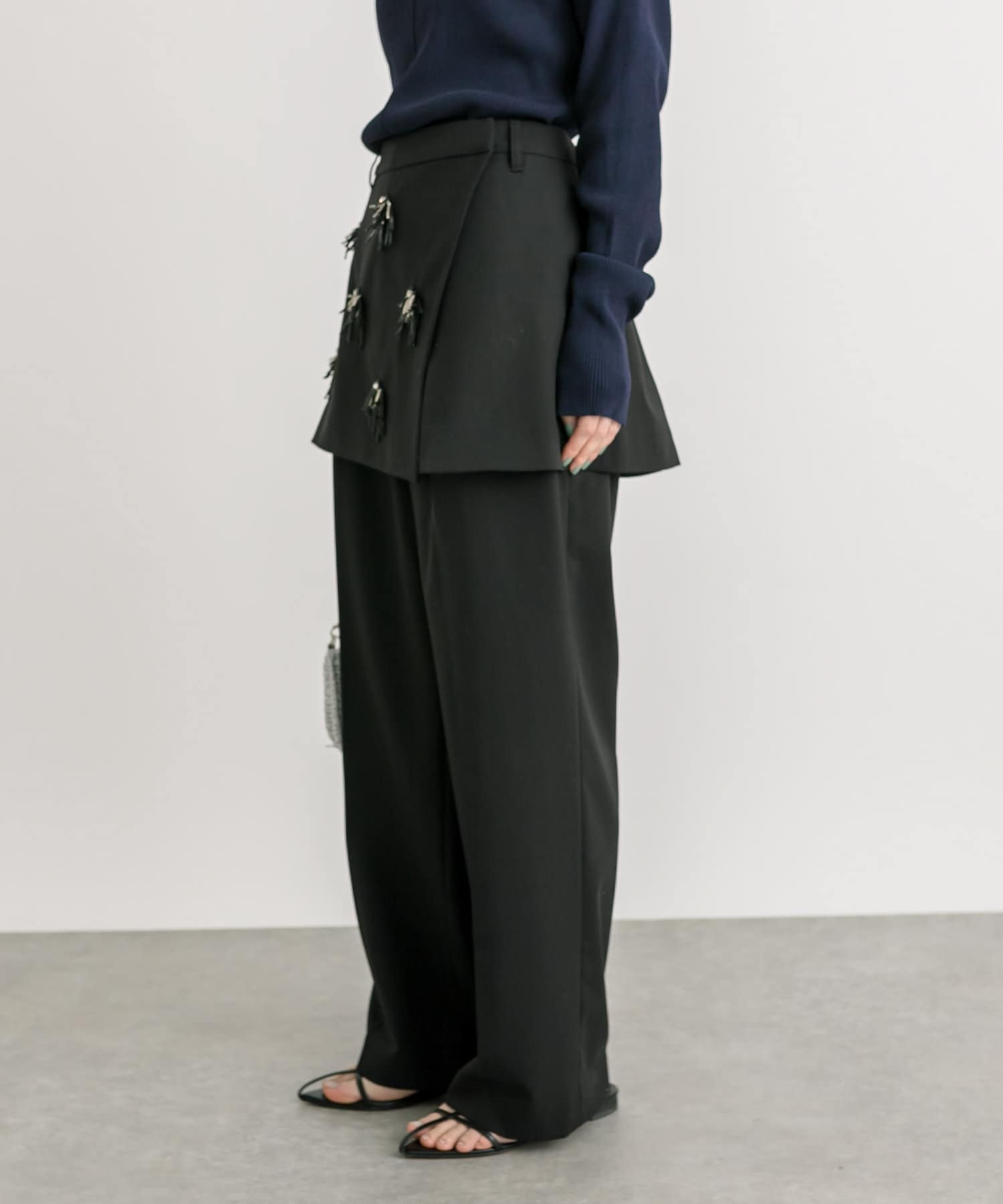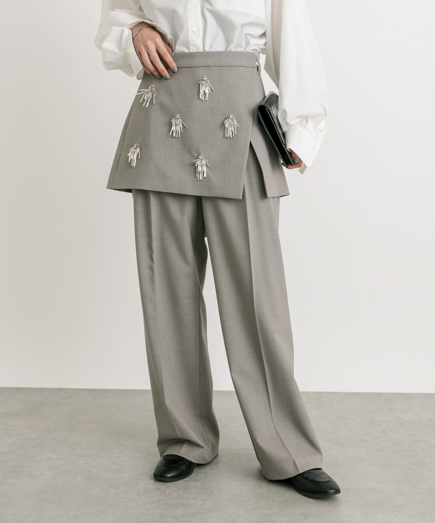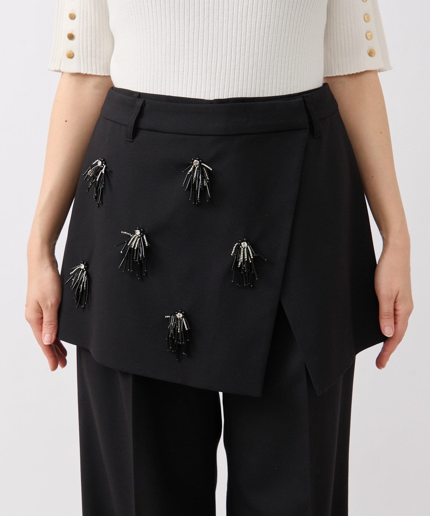 ビジューのワンポイントが付いたスカートとパンツがセットになったアイテム。