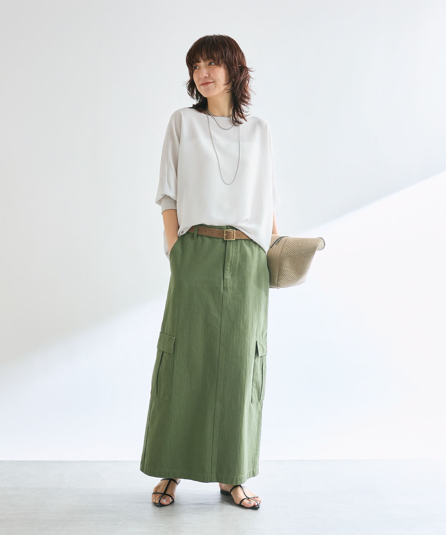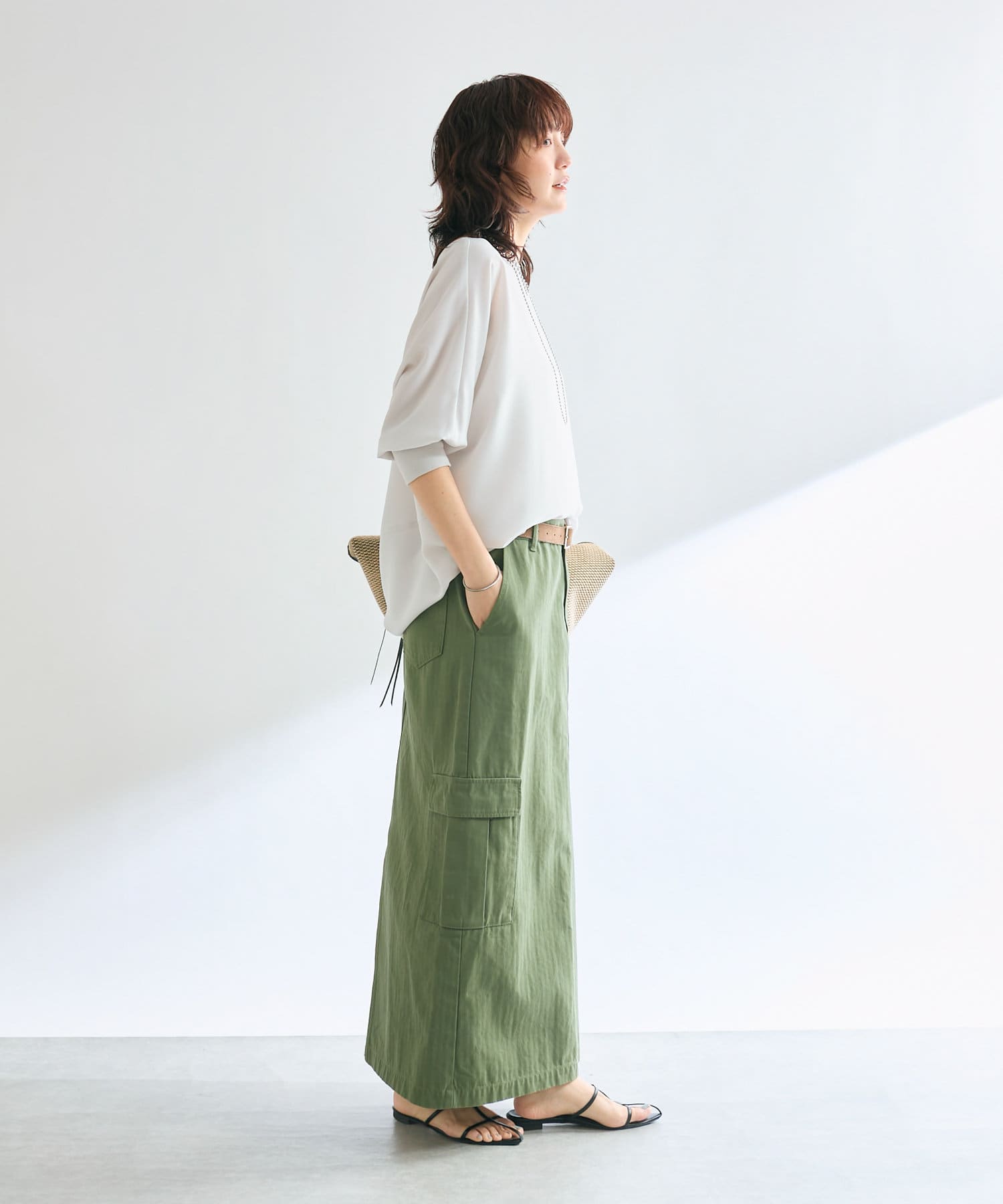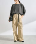 ほどよく体型をカバーして袖のリプでたくしあげてもきちっととまります。シンプルなデザインなのでバングルやネックレスなどの重ね付けも映えてカジュアルもキレイめも使い勝手よさそうです!