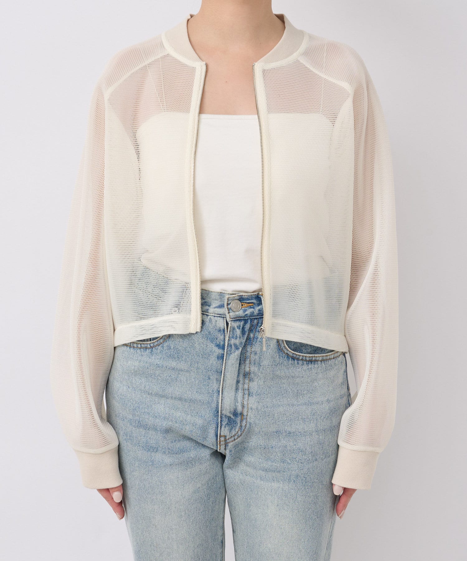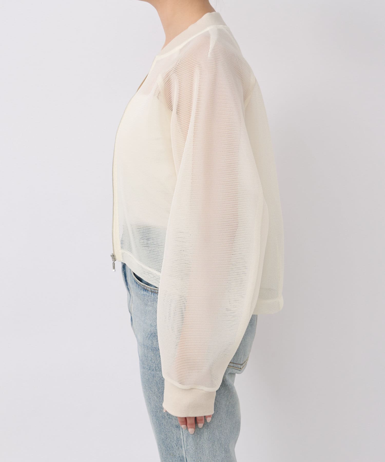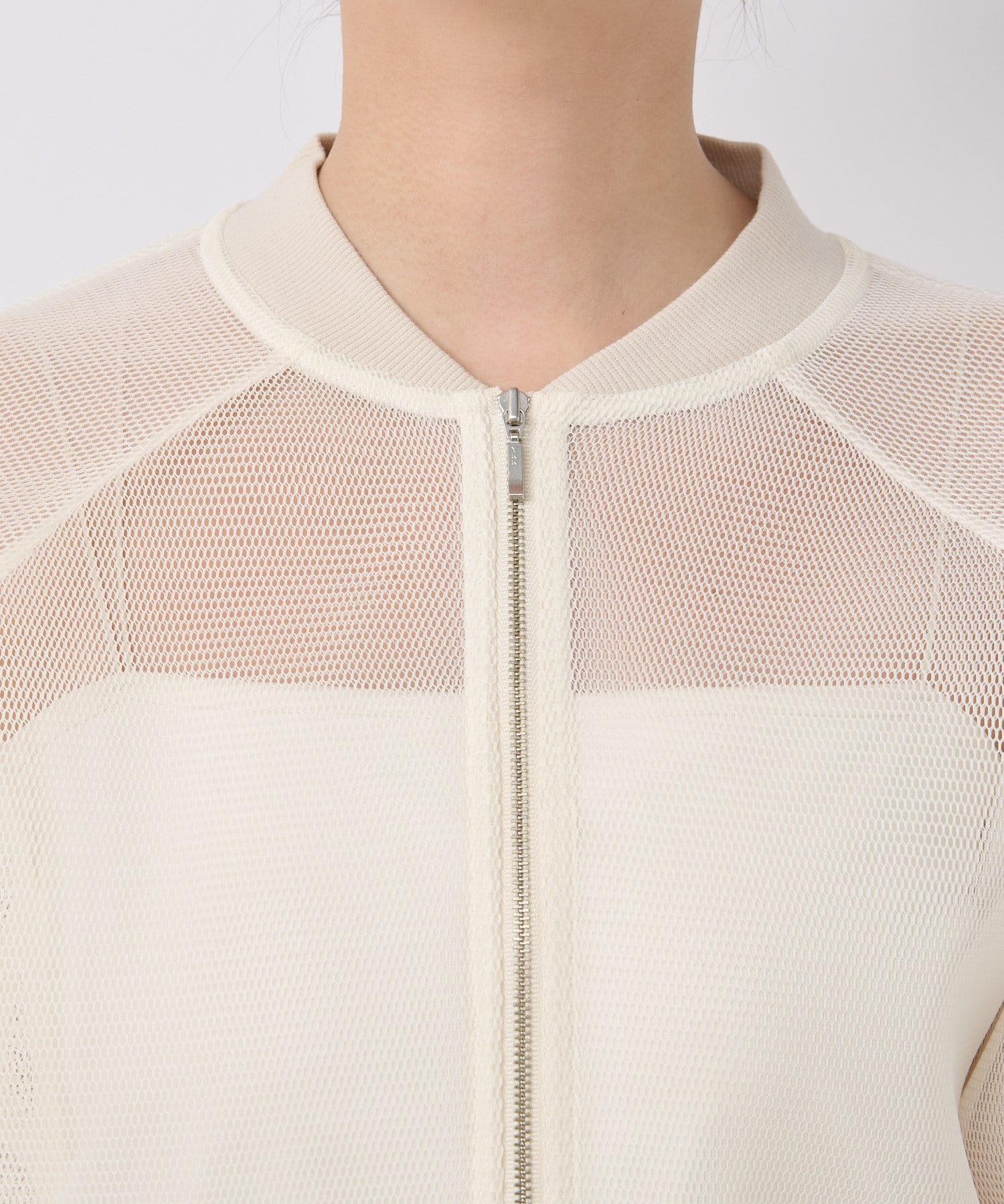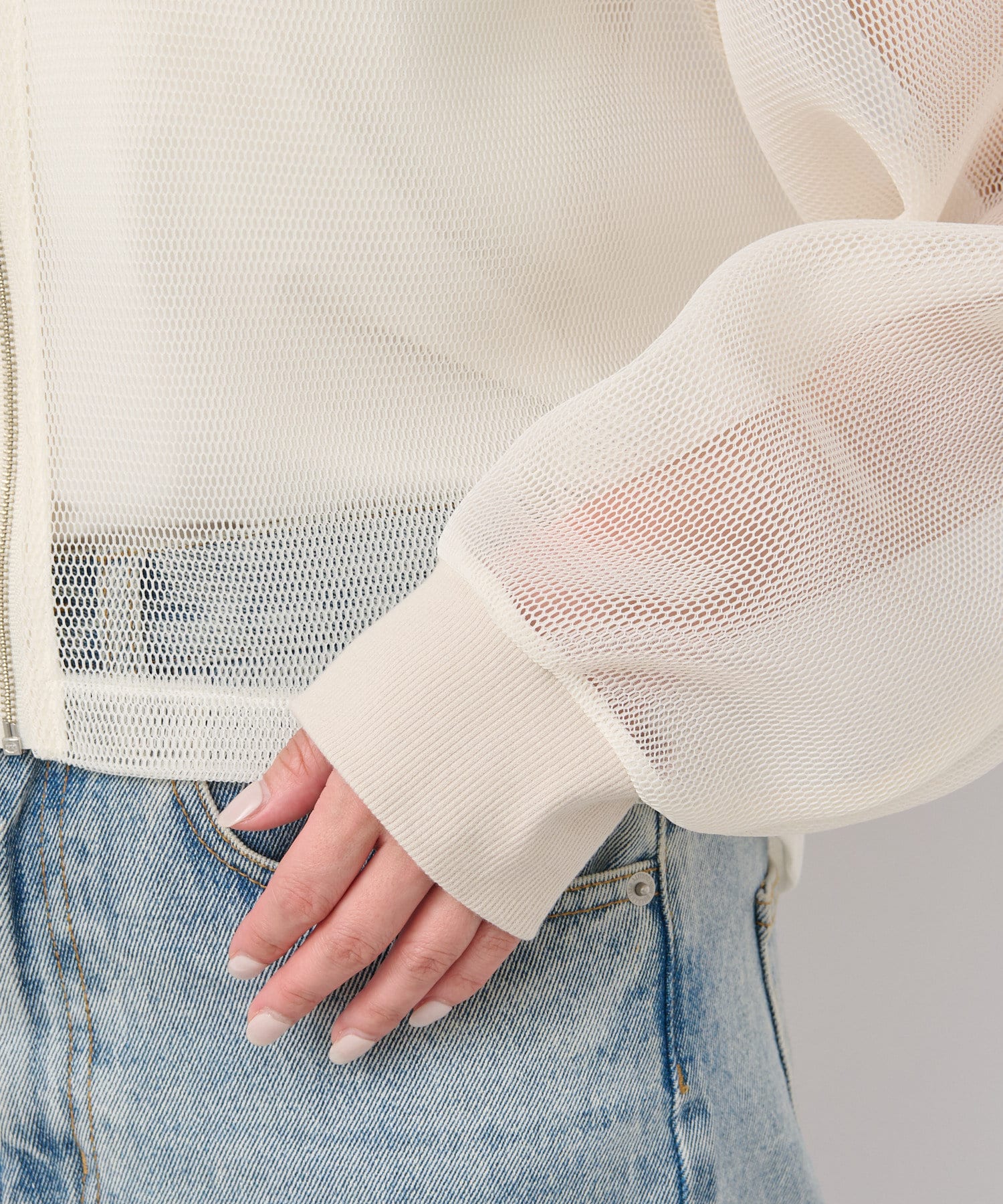 透け感を楽しむコーディネートにオススメなメッシュ素材を使用したブルゾン。