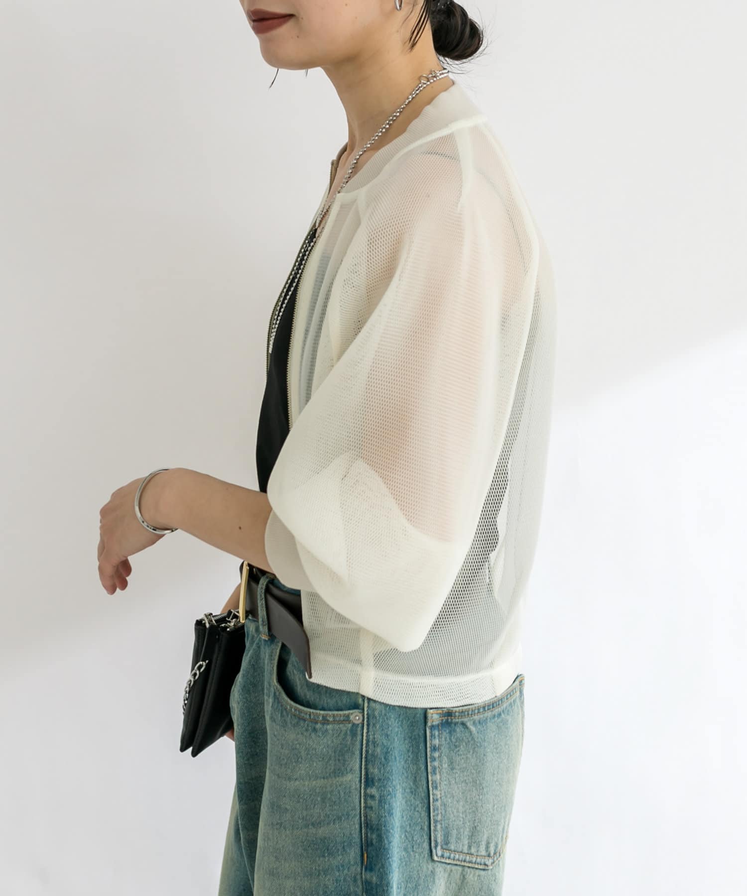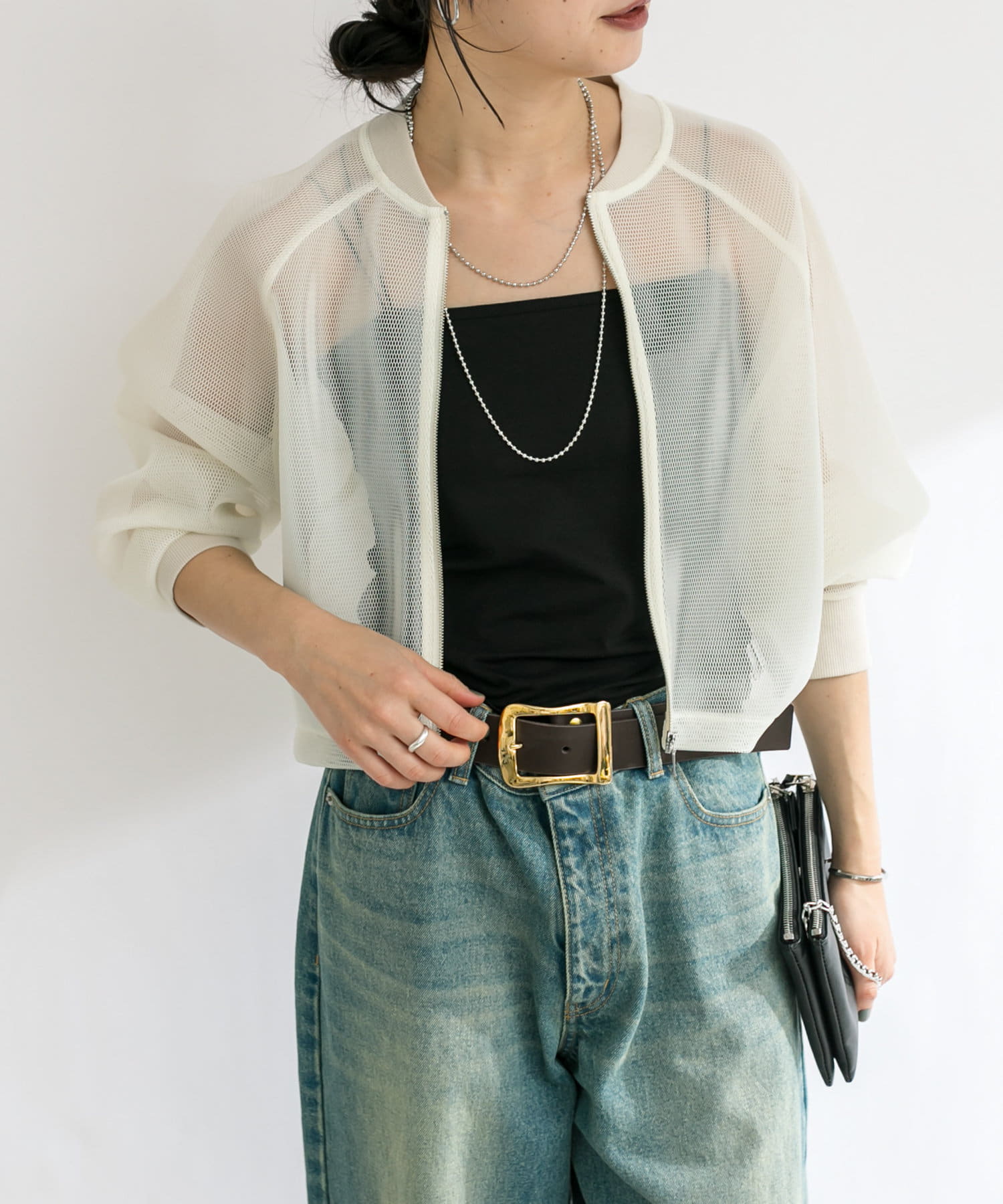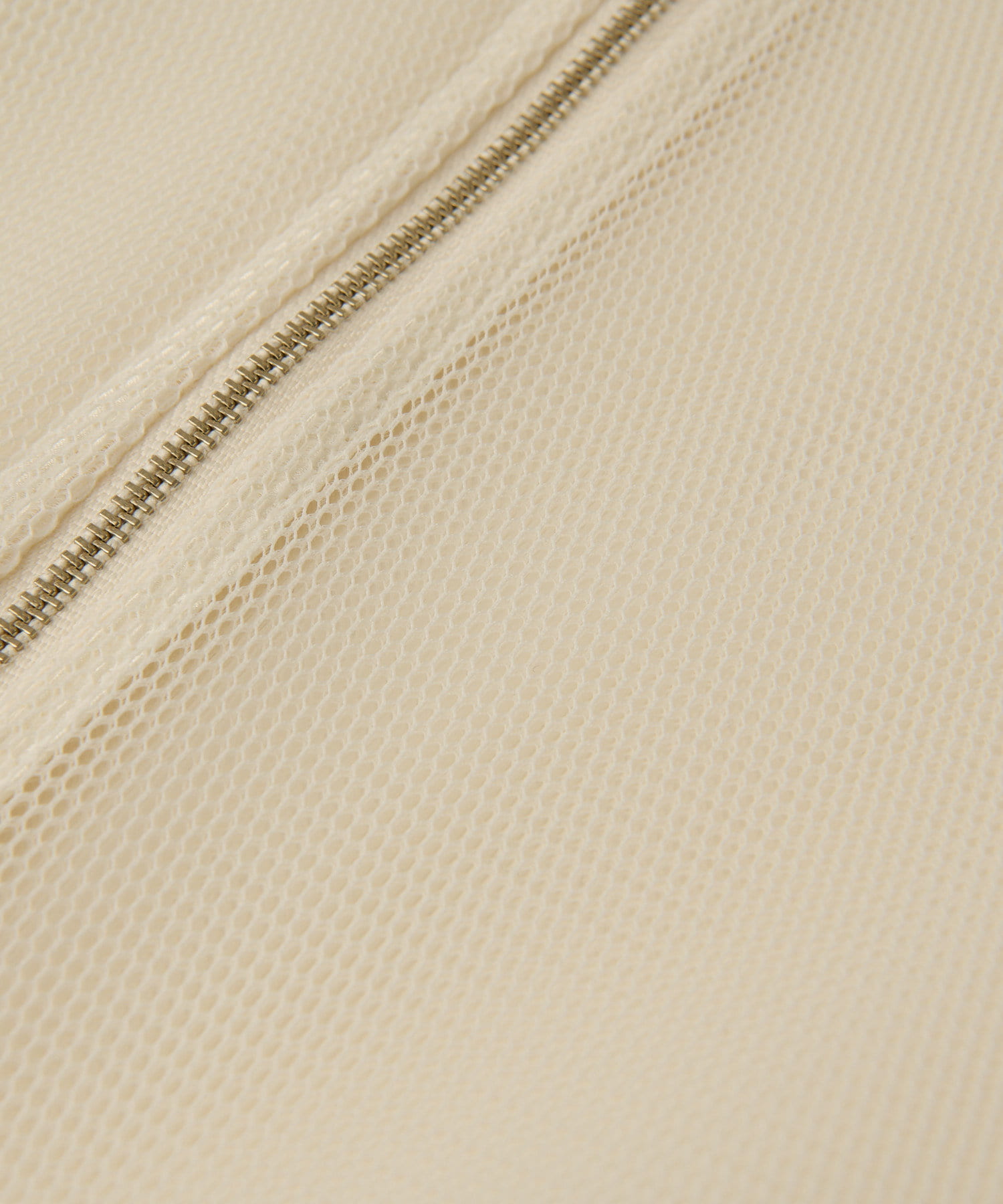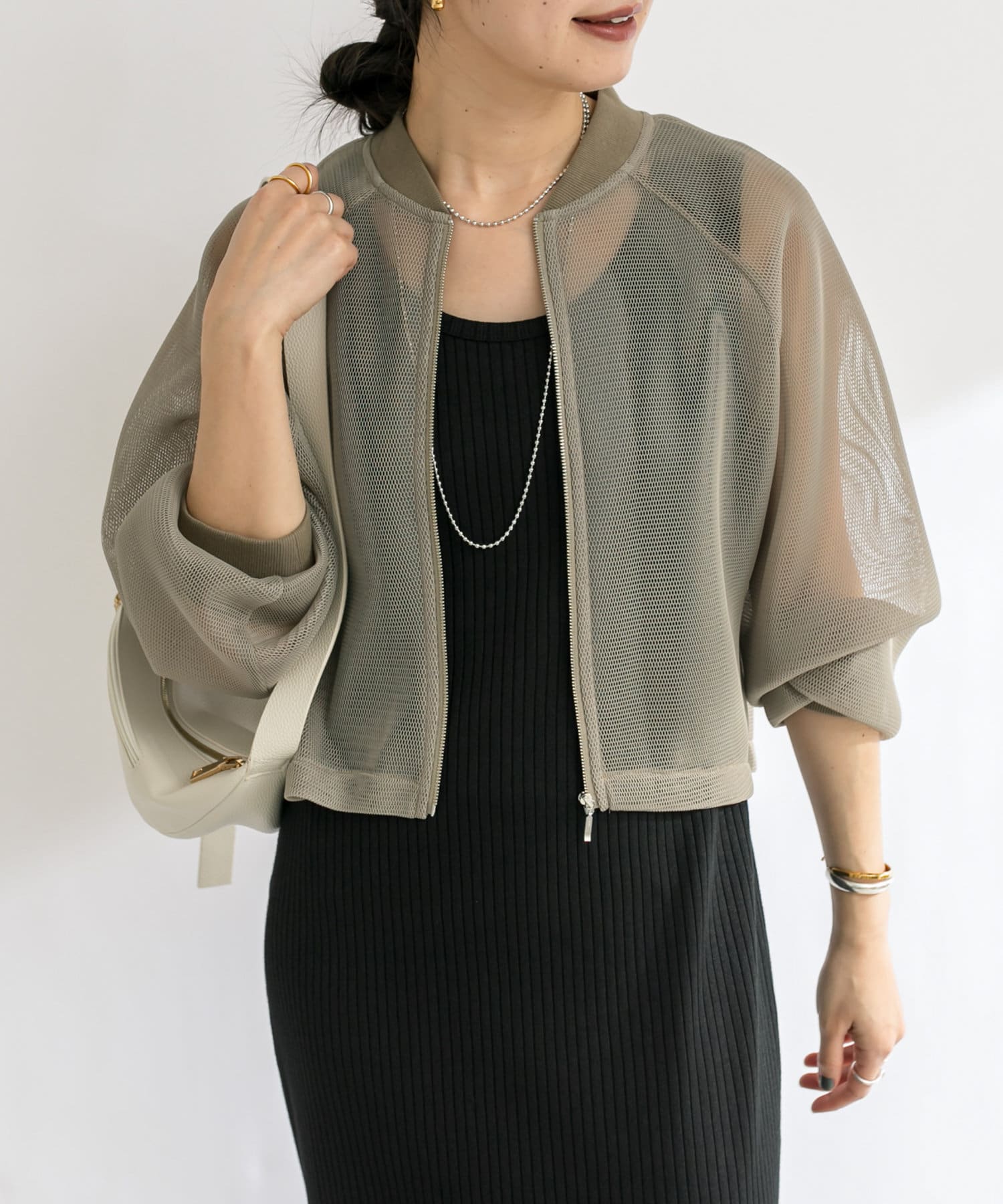 透け感を楽しむコーディネートにオススメなメッシュ素材を使用したブルゾン。