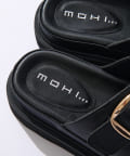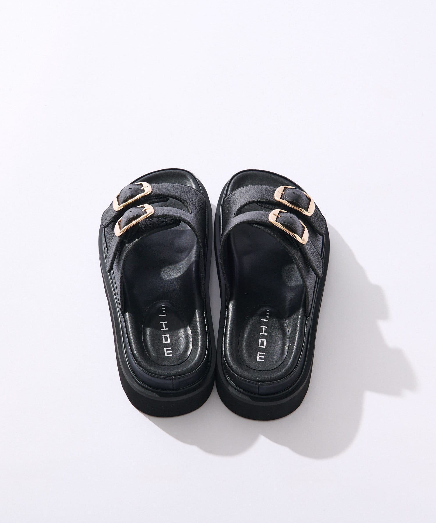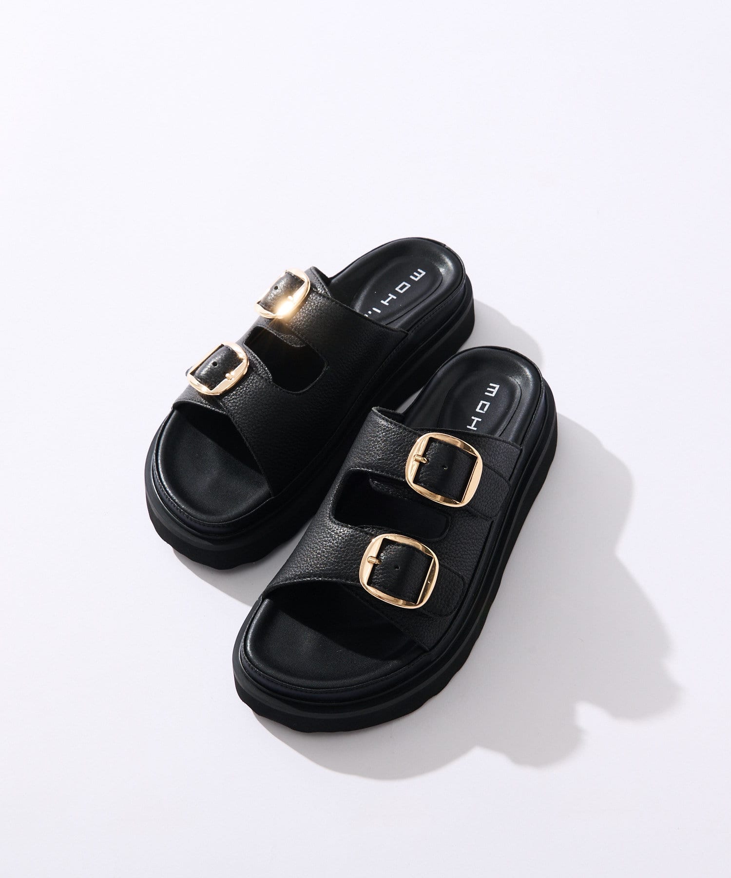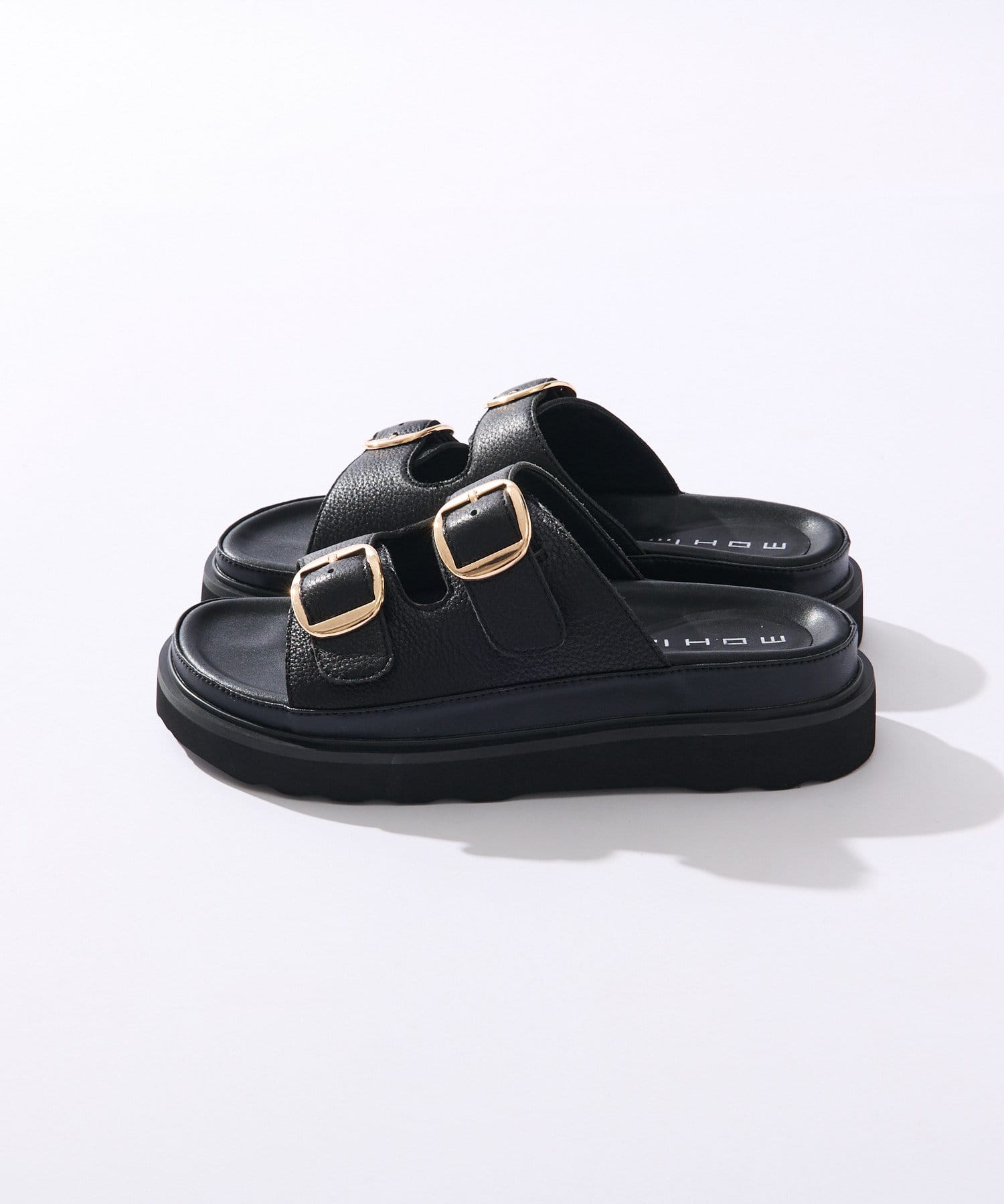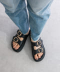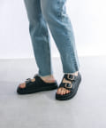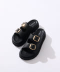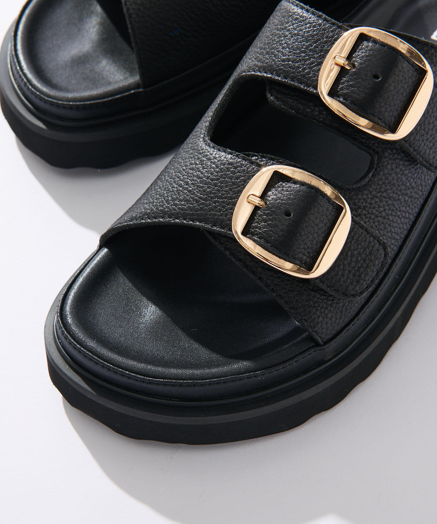 シンプルながら、存在感抜群のバックルが印象的なサンダル。