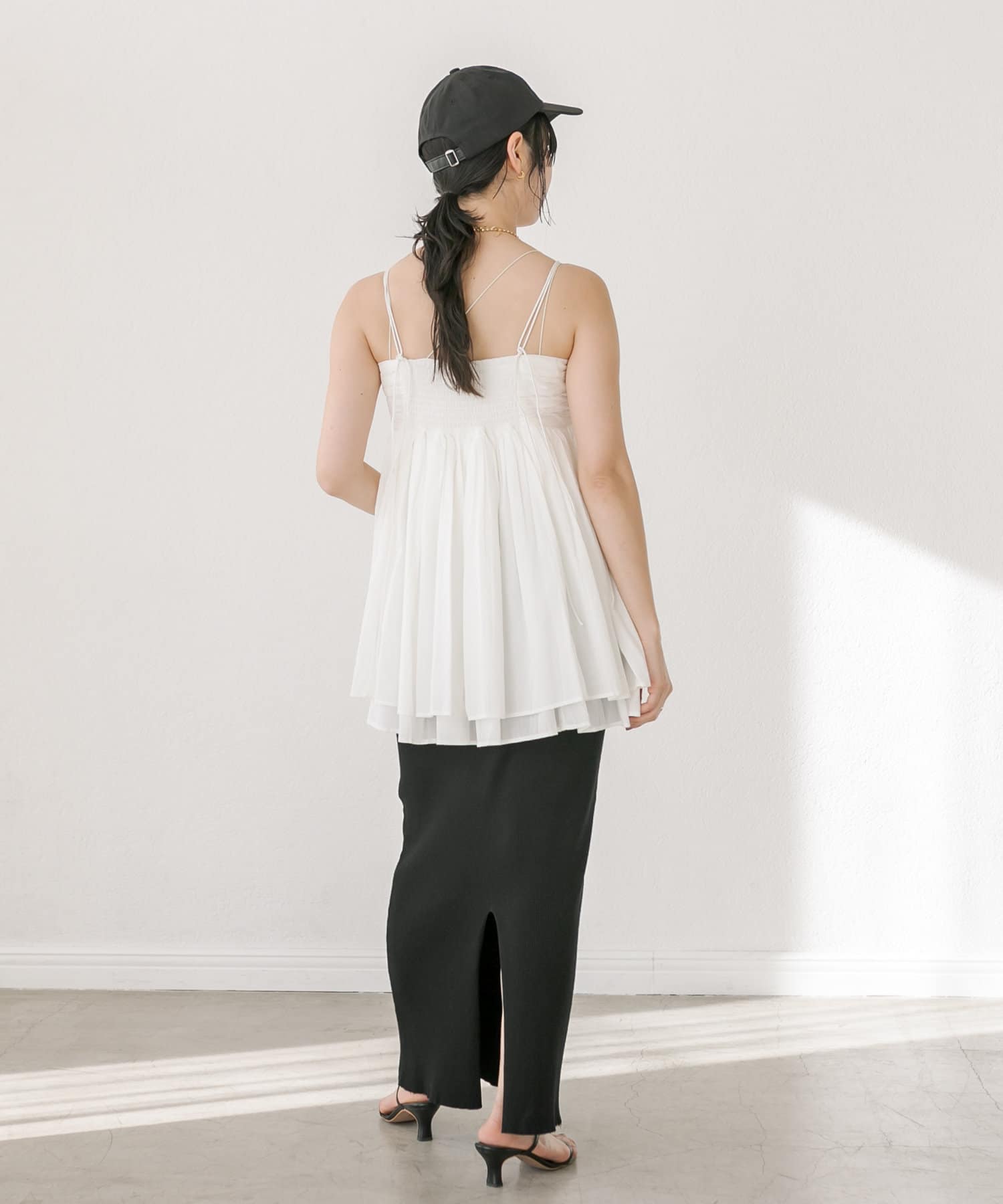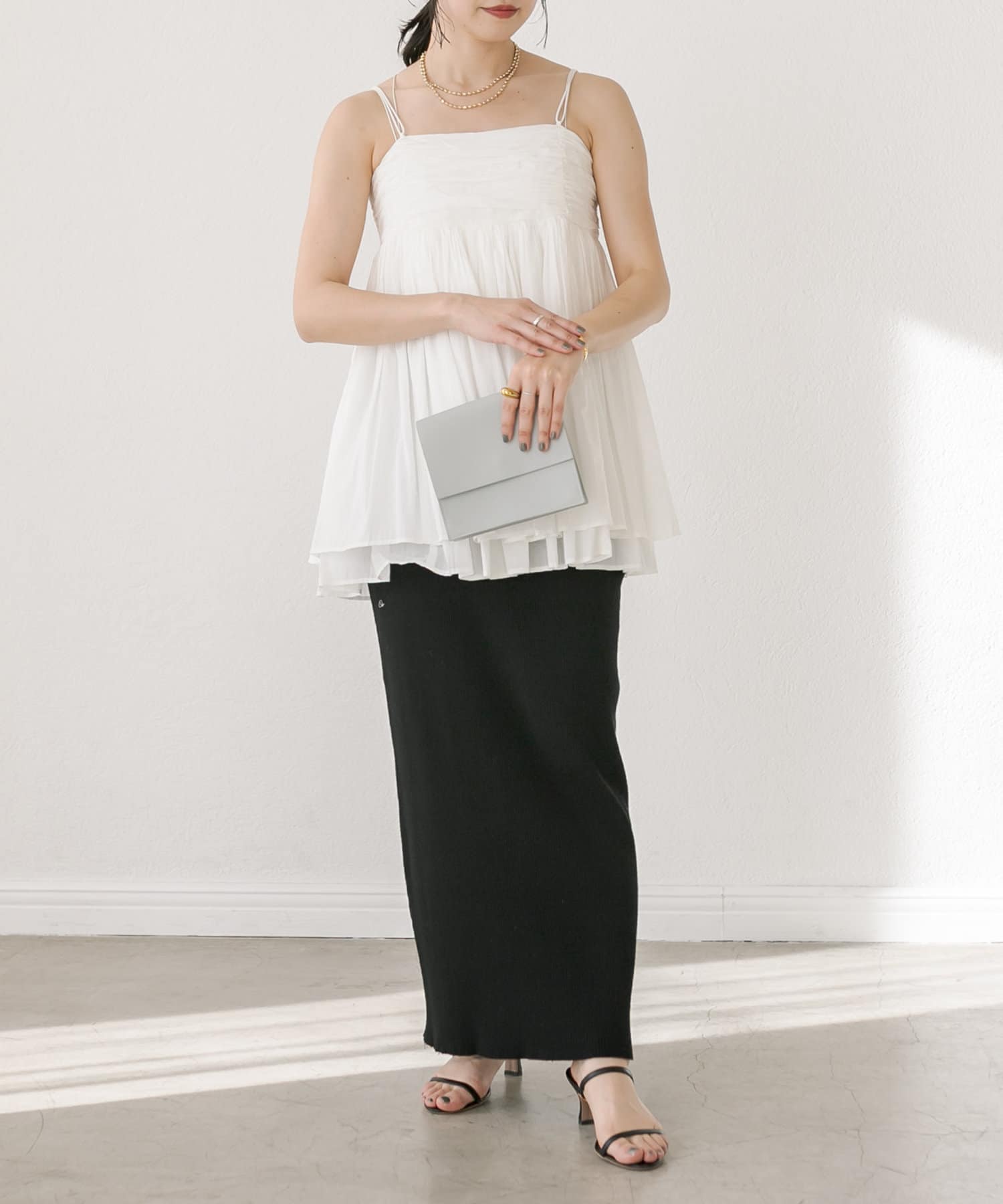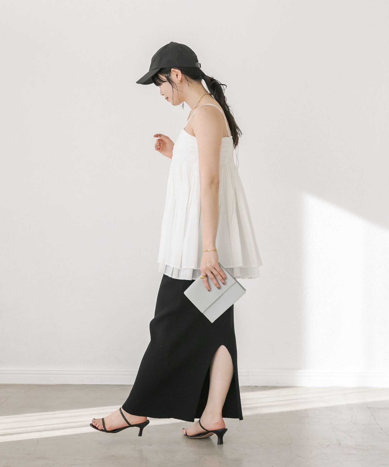 ボトムはデニムやスラックスだけでなく、タイトスカートを合わせた女性らしいコーデもおすすめ。