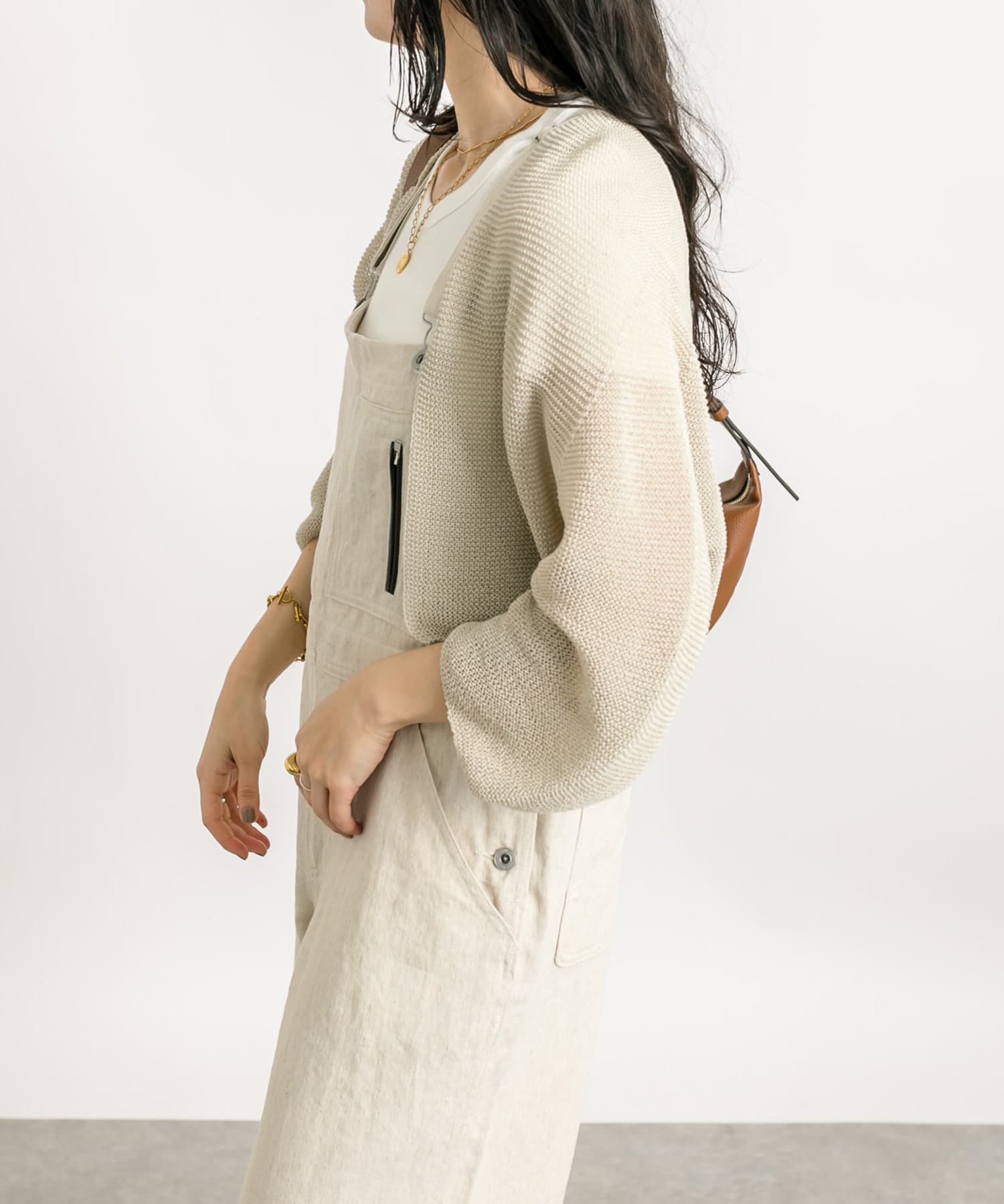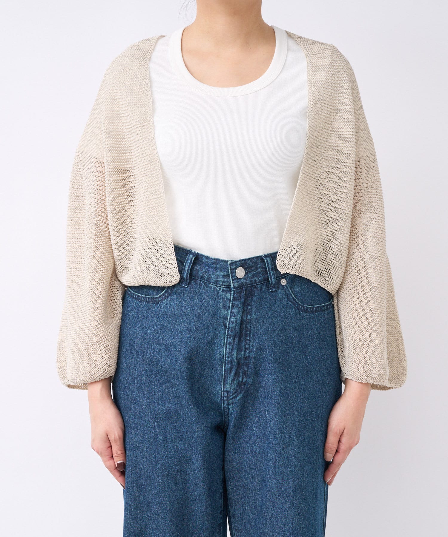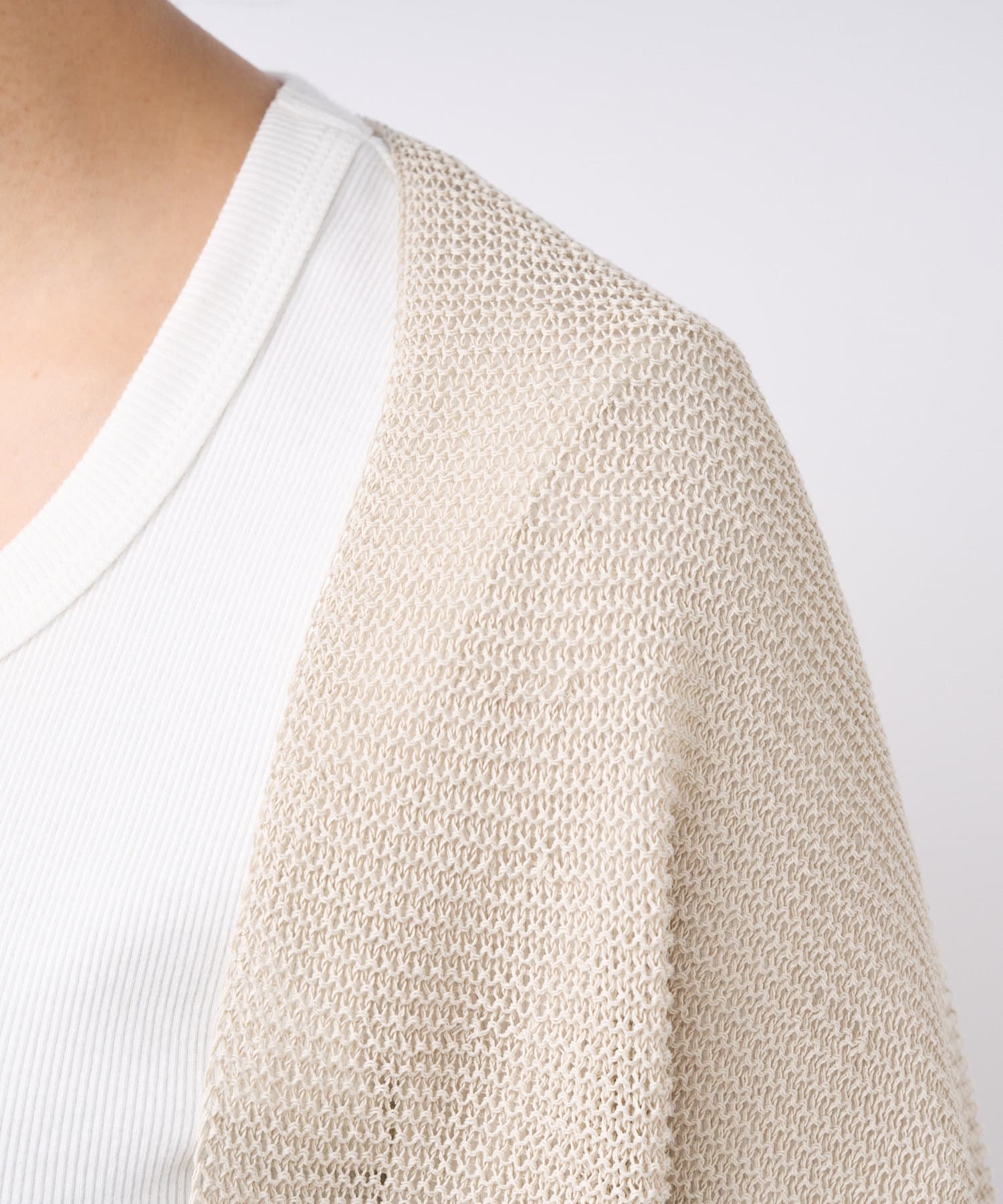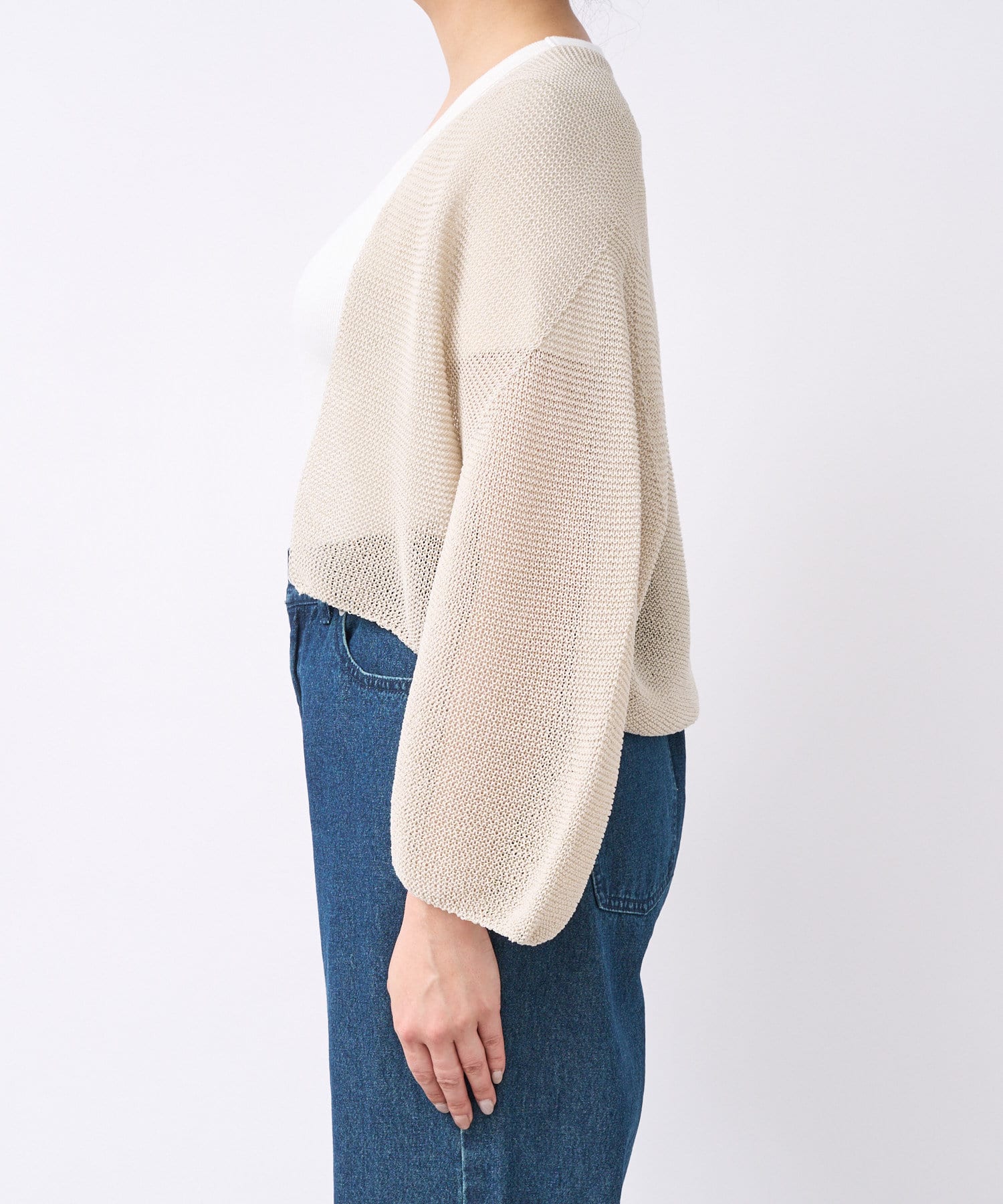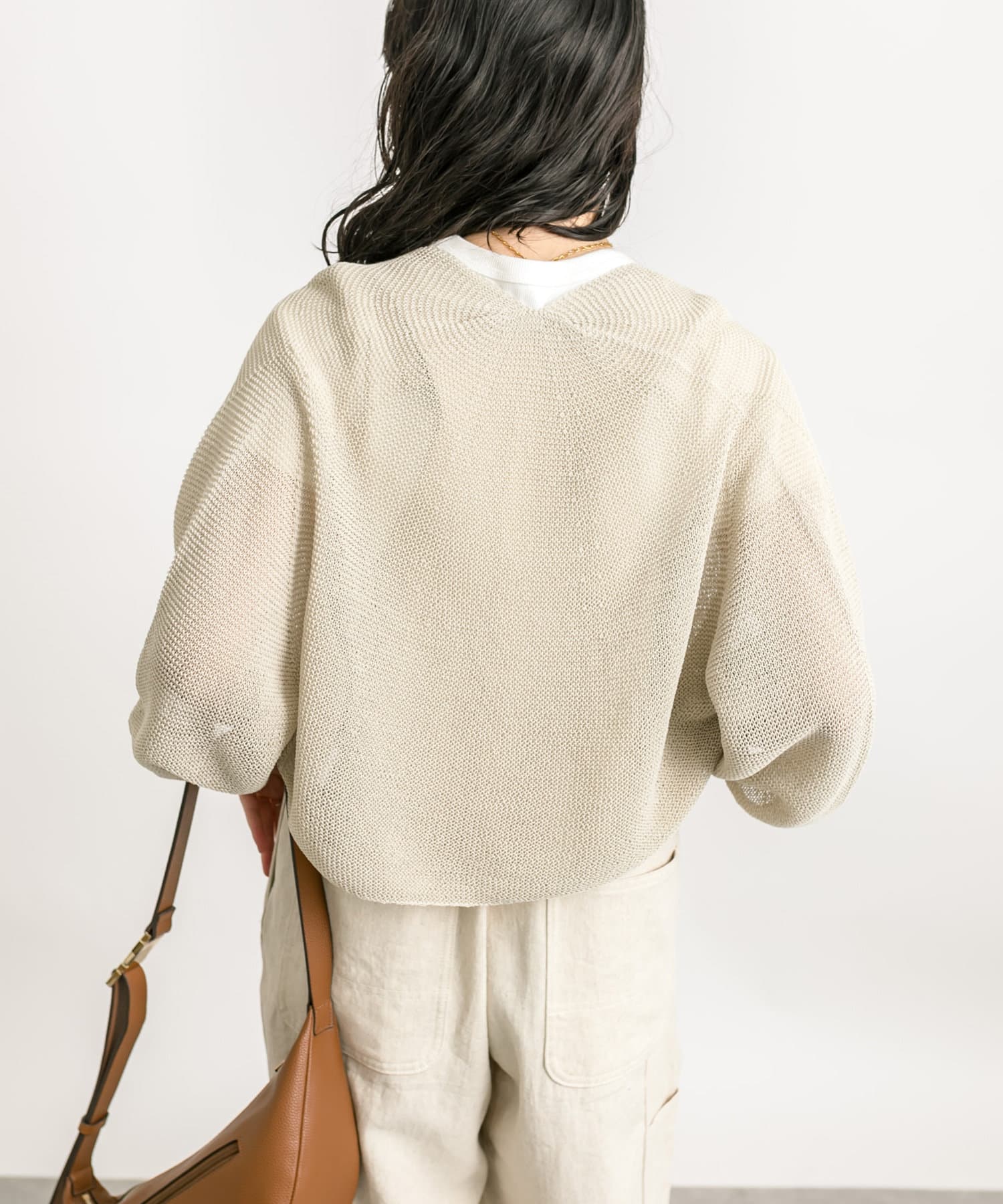 凹凸感のあるシアーな編地とふわっと軽い着心地のペーパーヤーンを使用したニットのトッパーカーディガン。