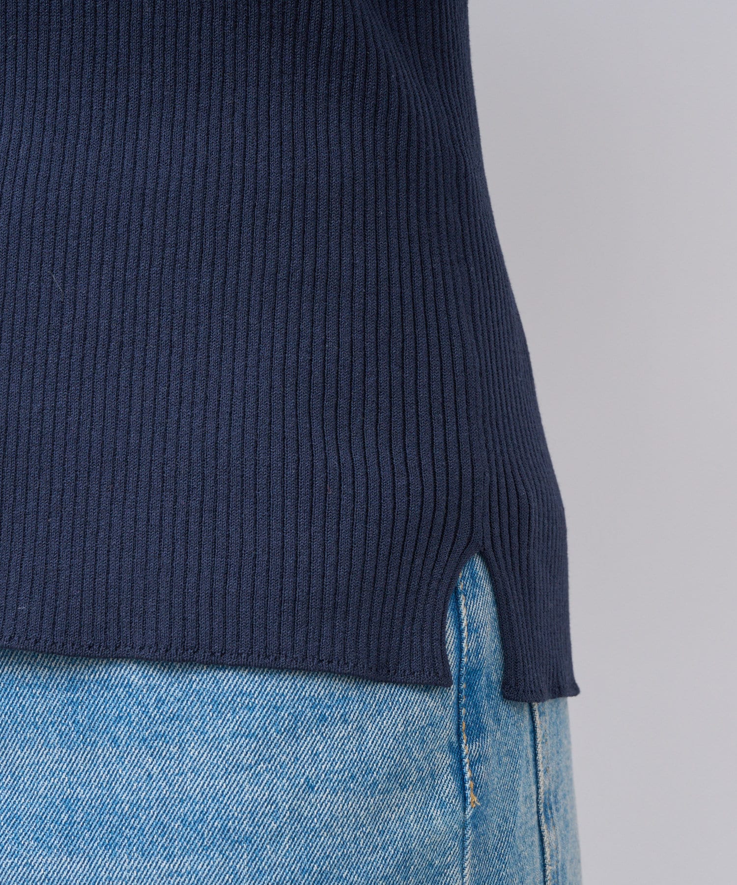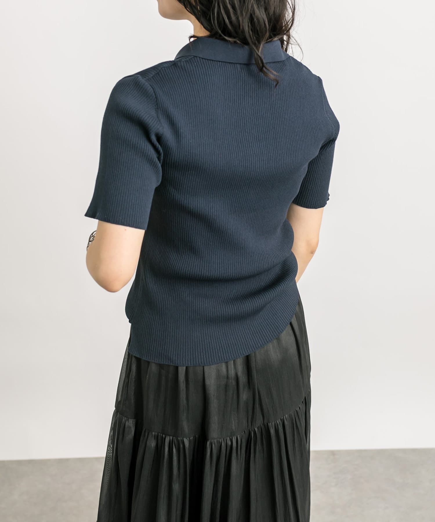 リブ編みの柔らかくすっきりとしたシルエットと深めの前あきで大人っぽく、女性らしく着用できる1枚です。