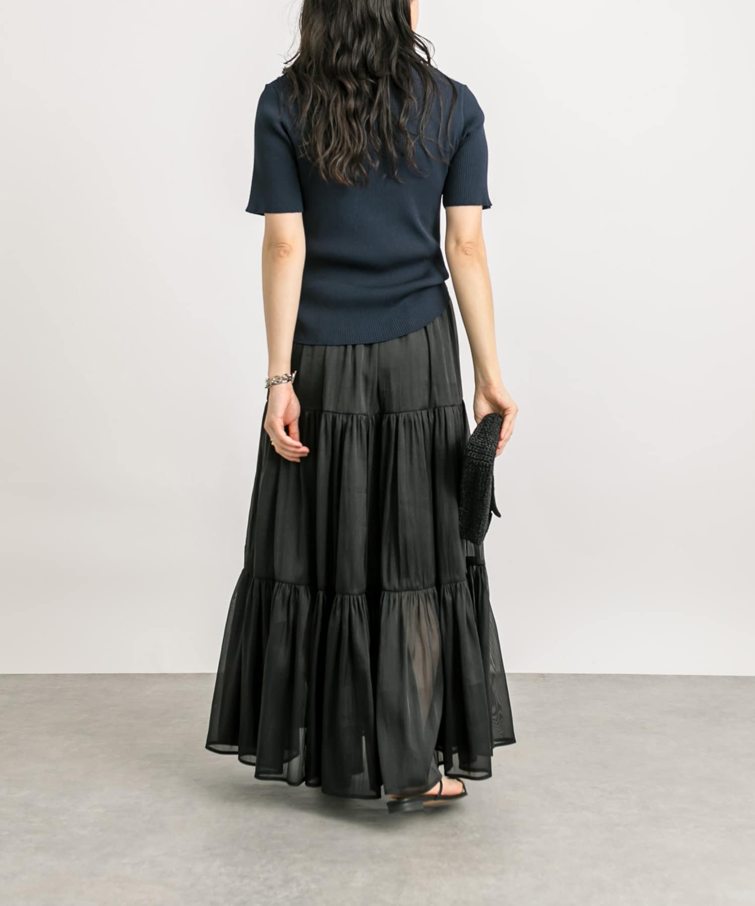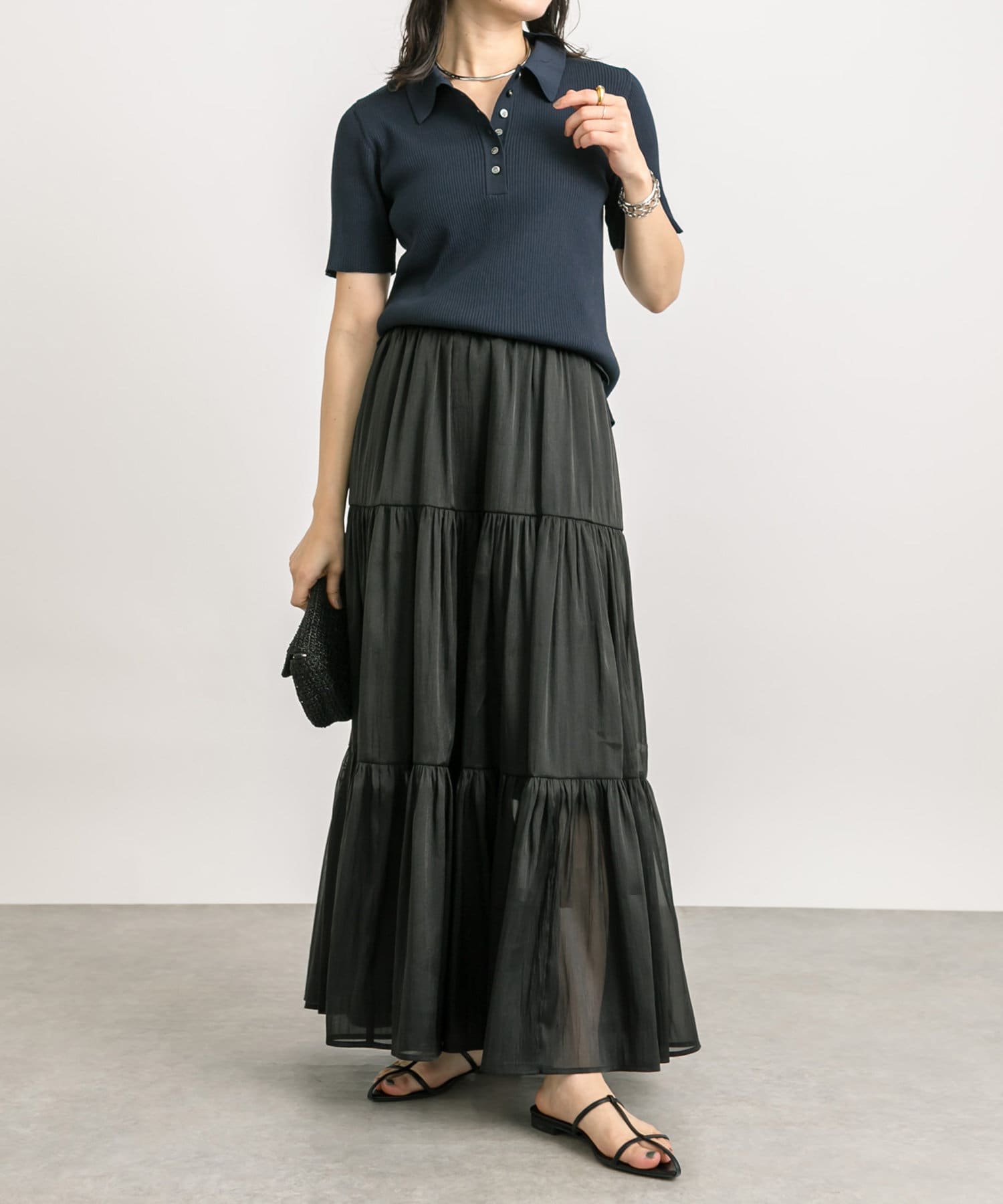 ボリュームアクセやヌーディなサンダルを合わせると、より大人らしい着こなしに。
