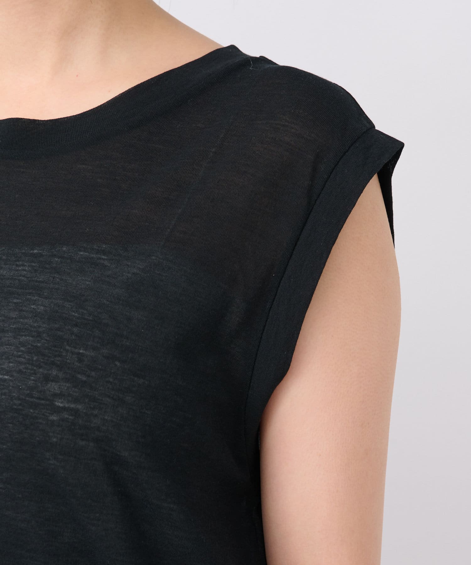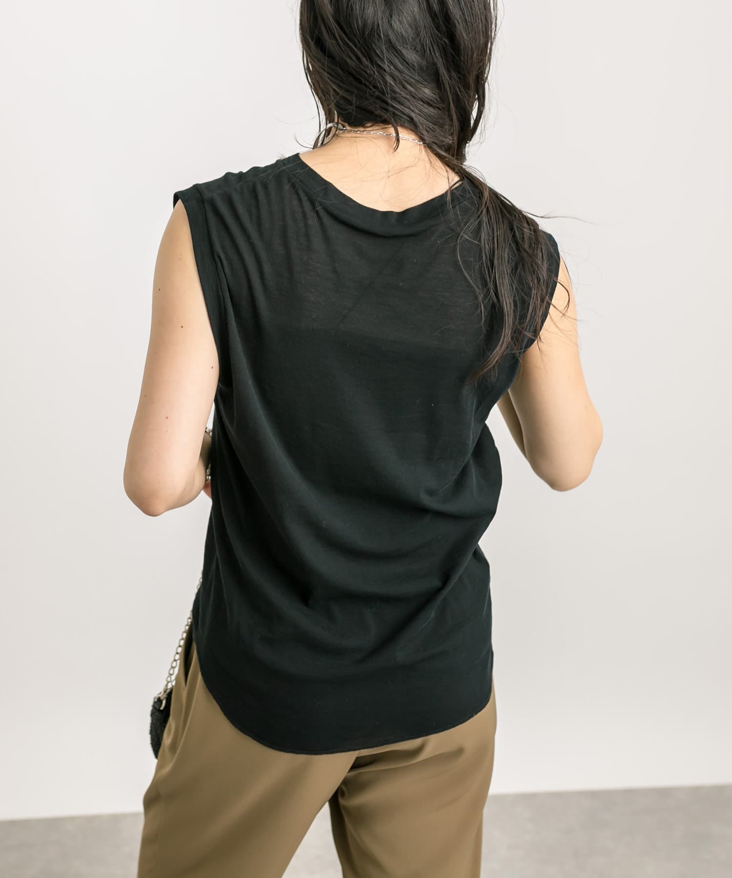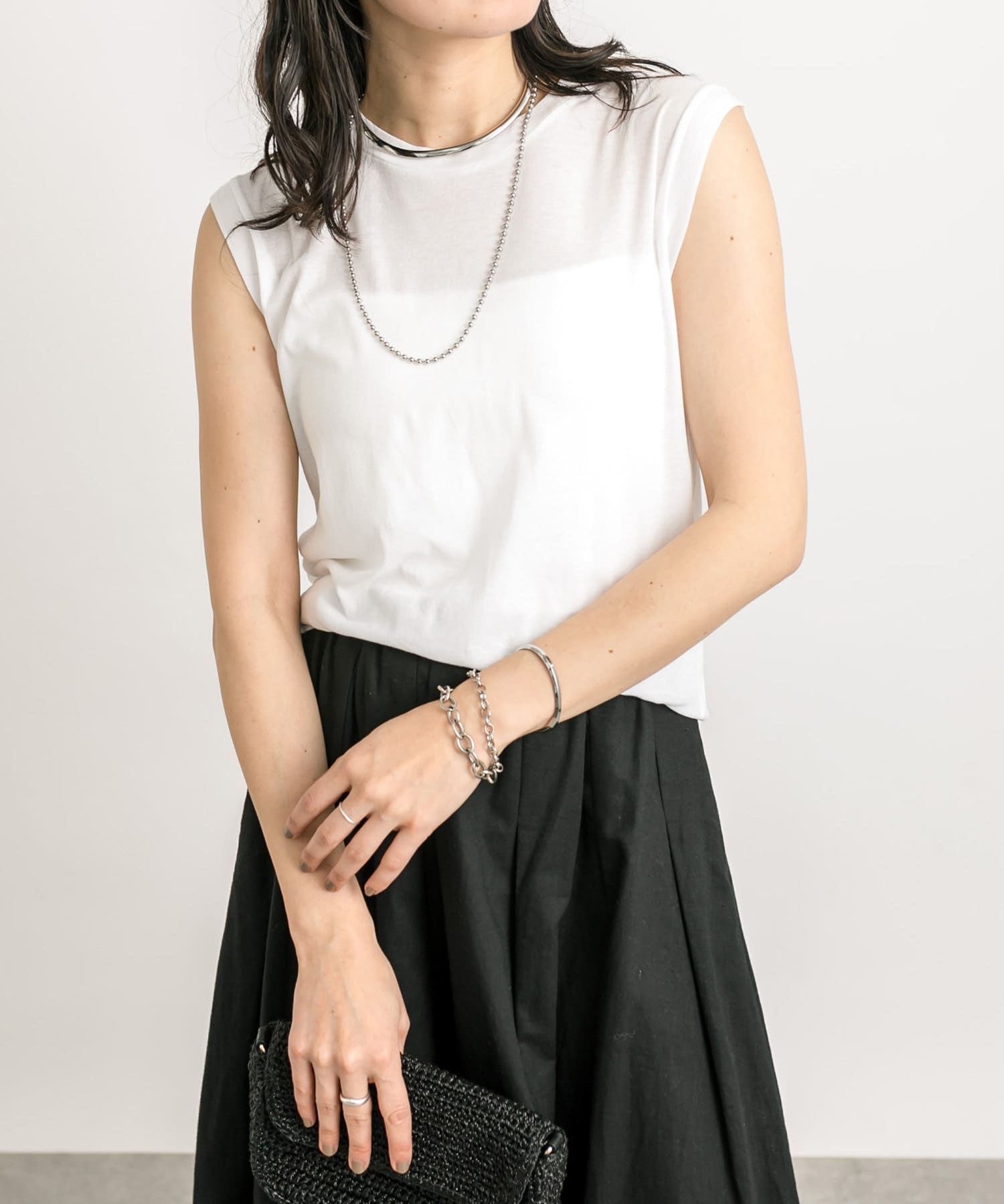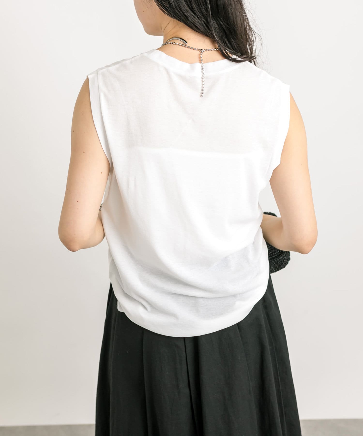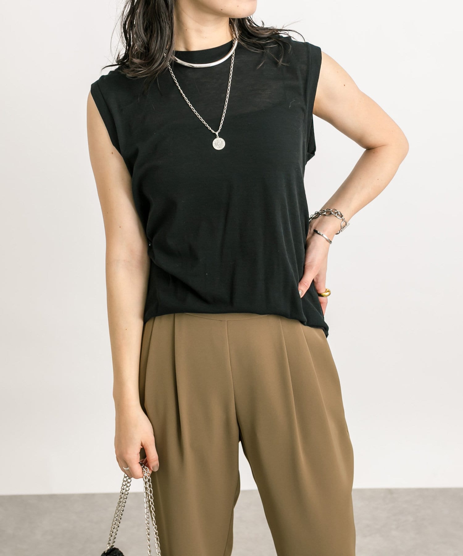 程よい透け感とやわらかな着心地が魅力のノースリTシャツ。