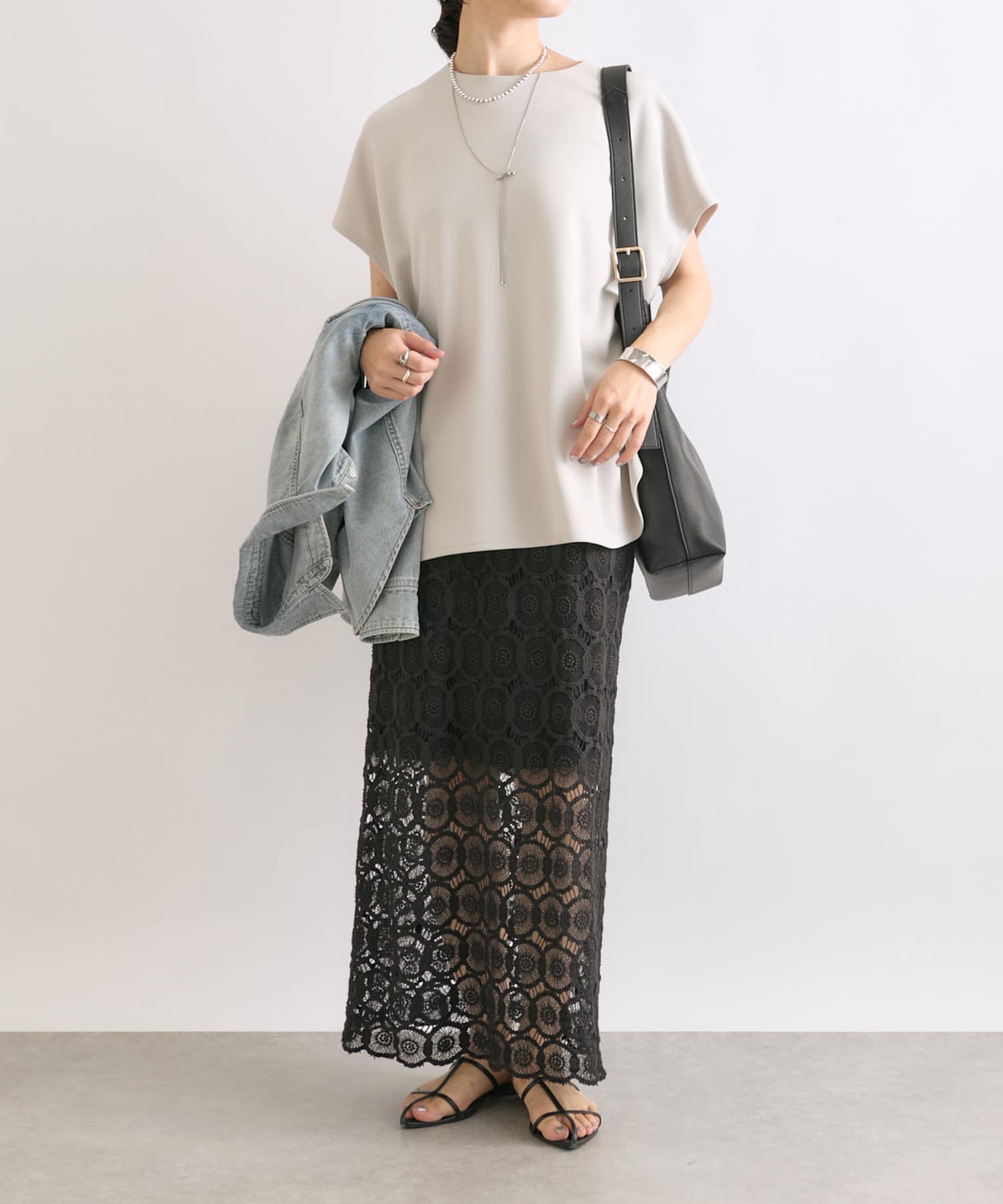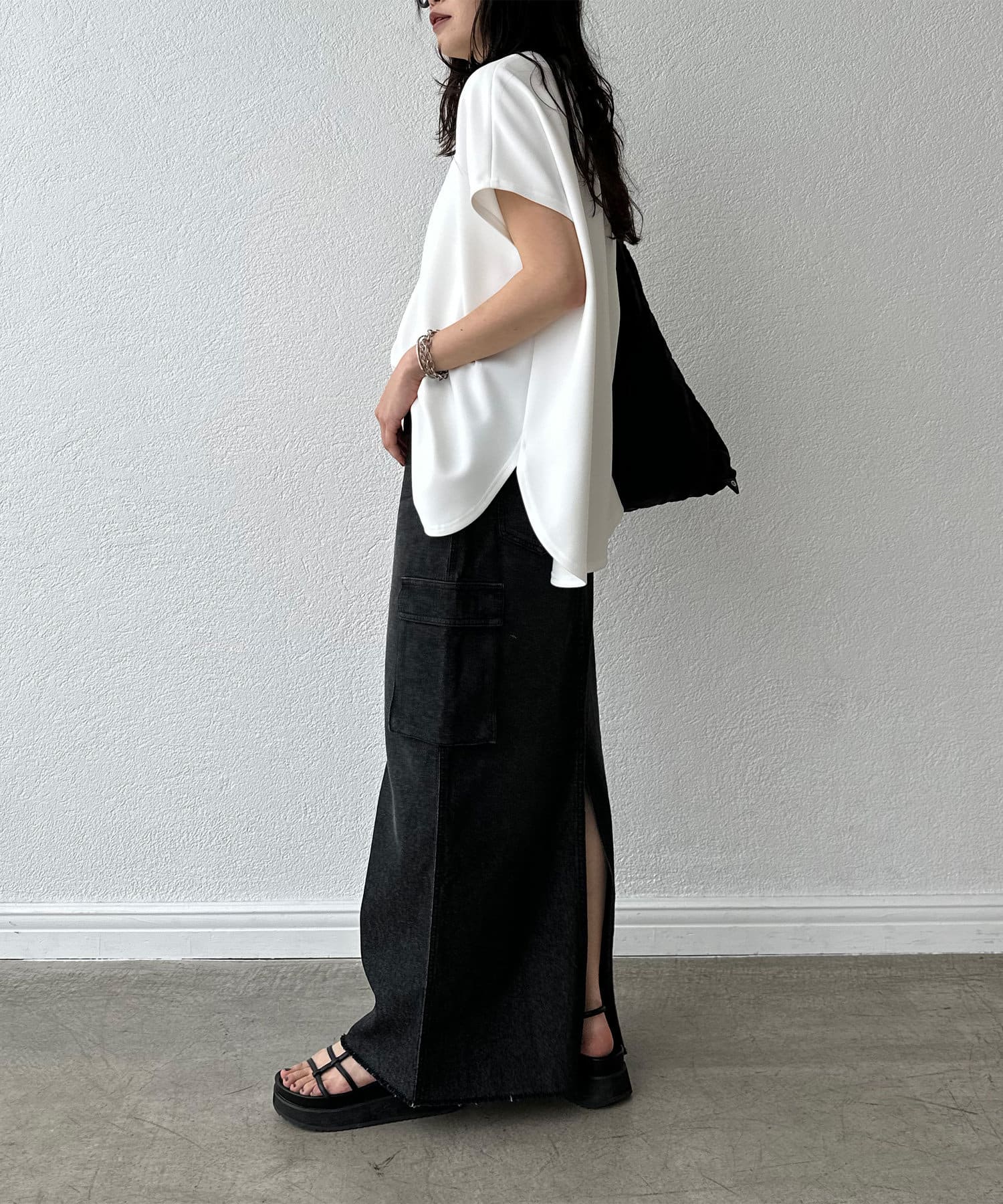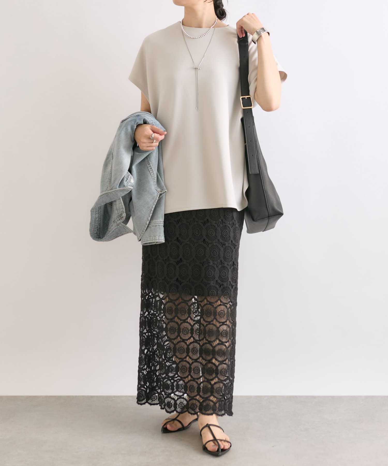 お尻がすっぽりと隠れる着丈でパンツ、スカート共に相性抜群。