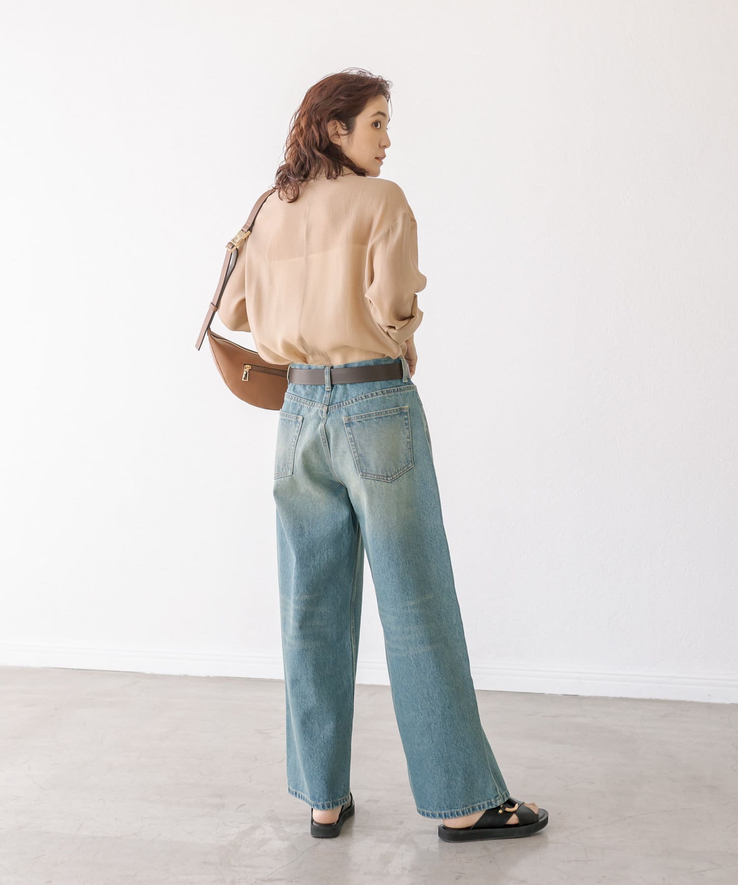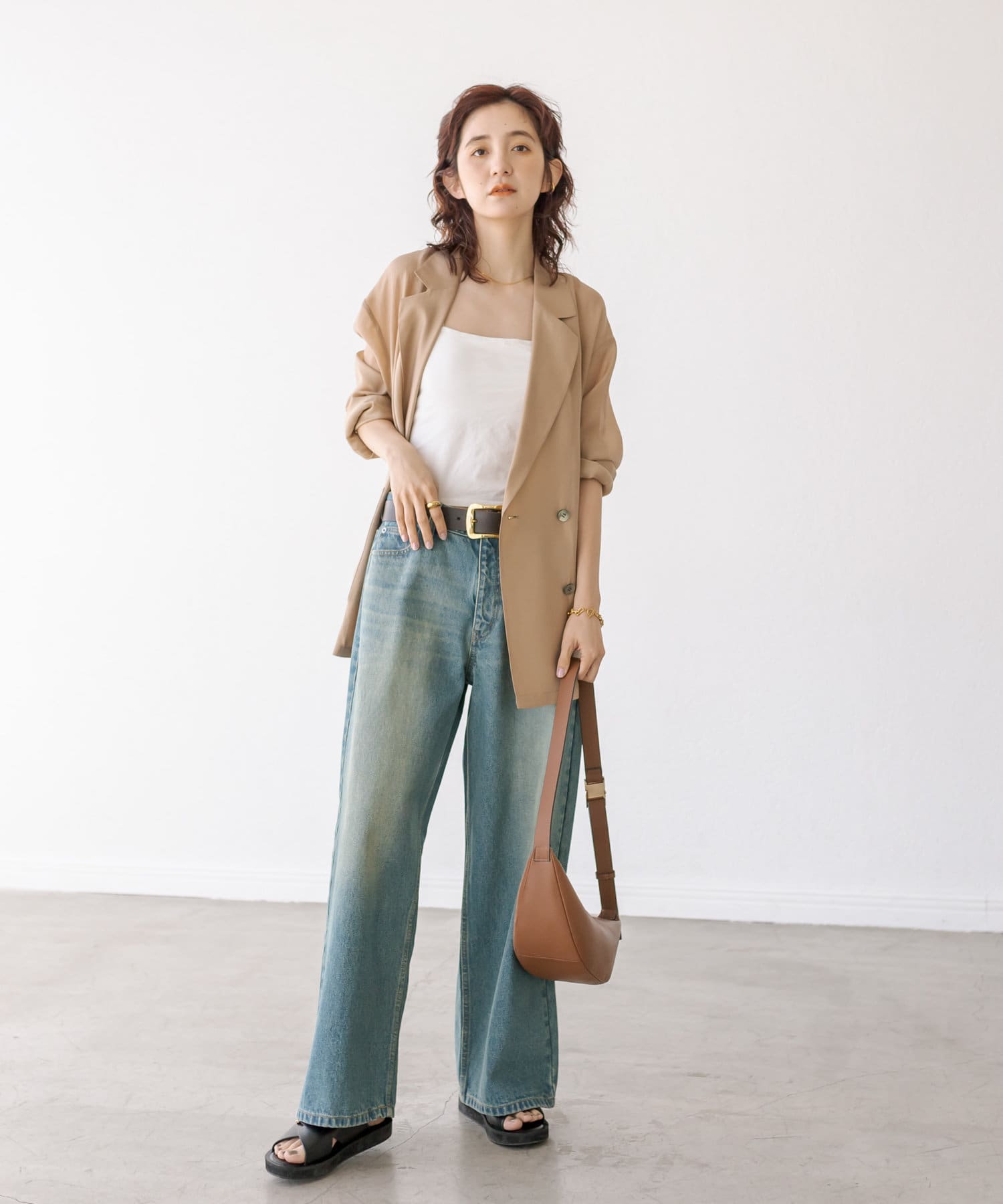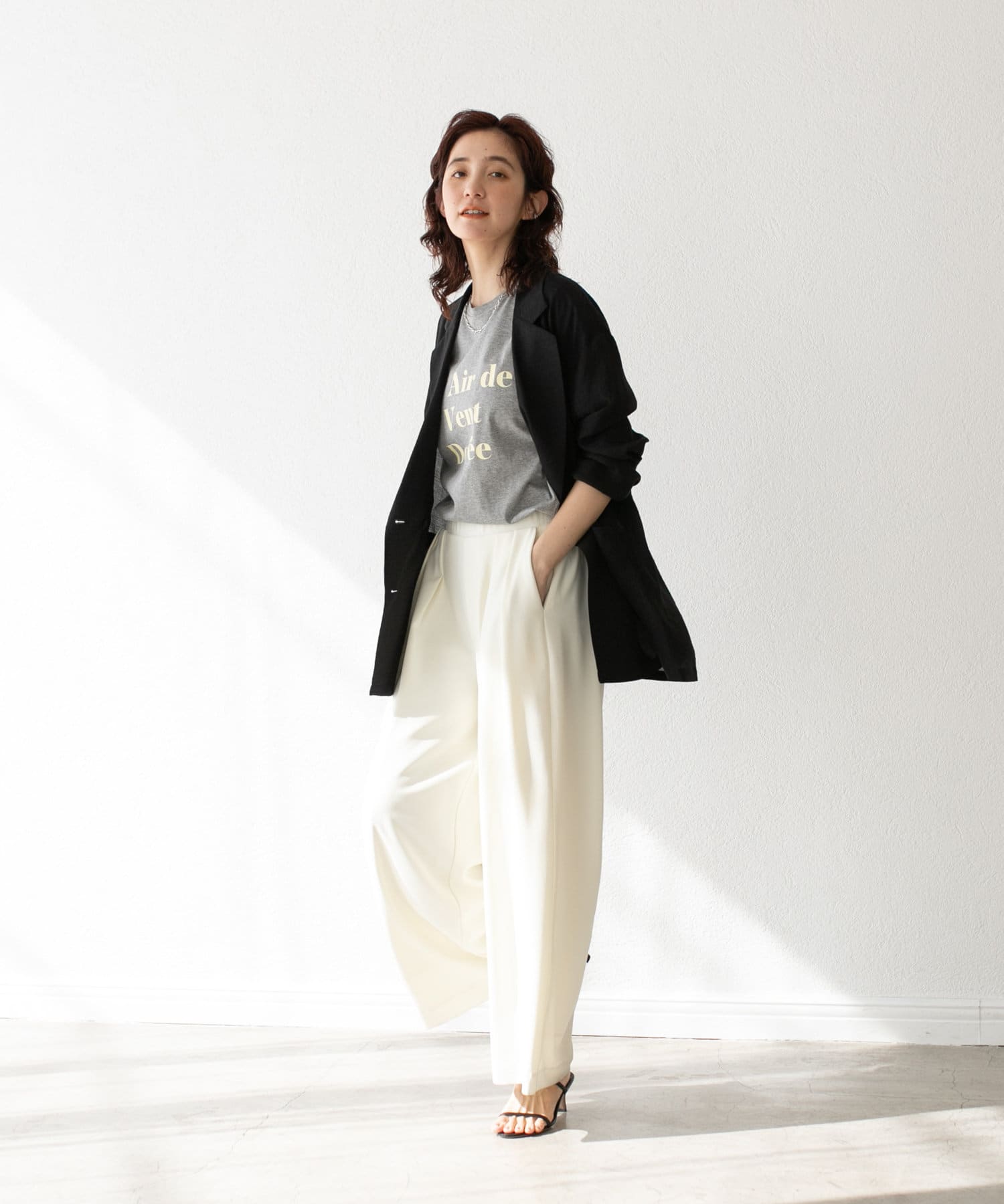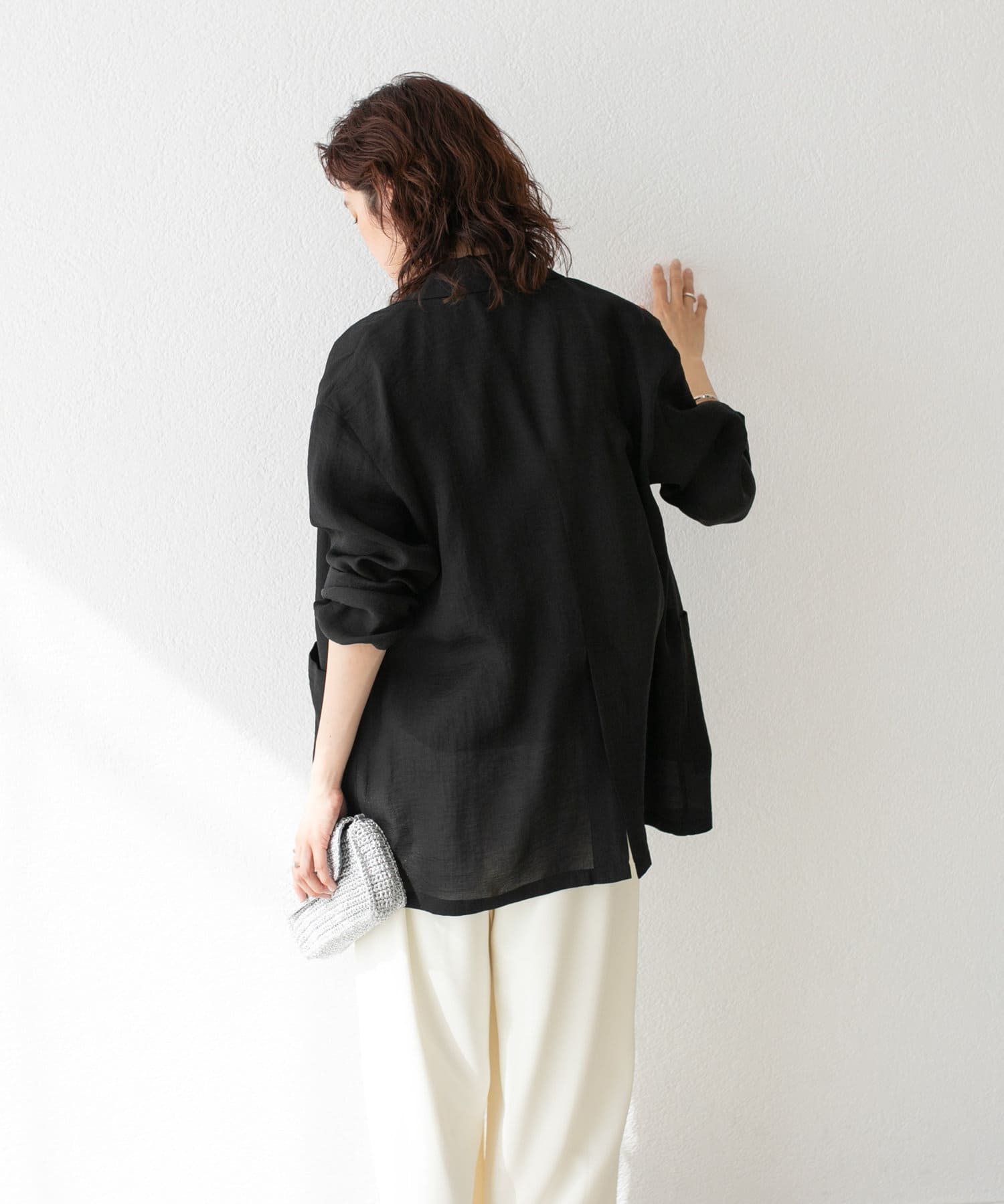 インナー・ボトムを選ばないクセの無いカタチで品良く肌見せもできるアイテム。