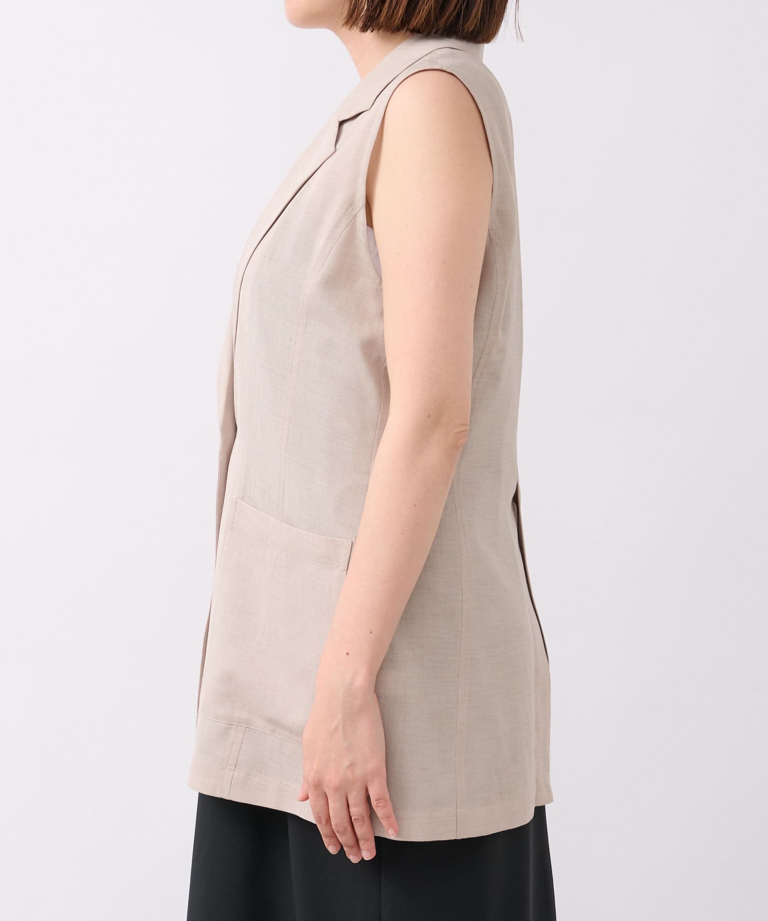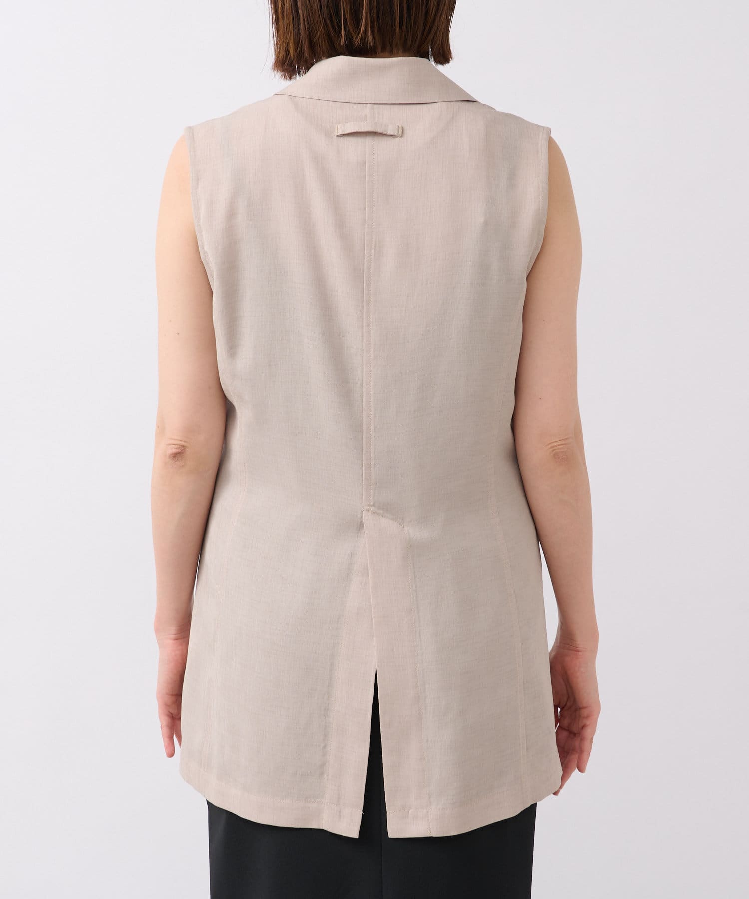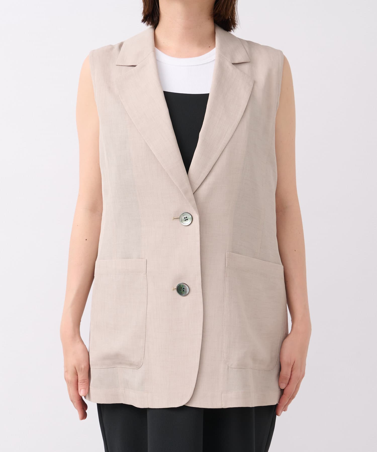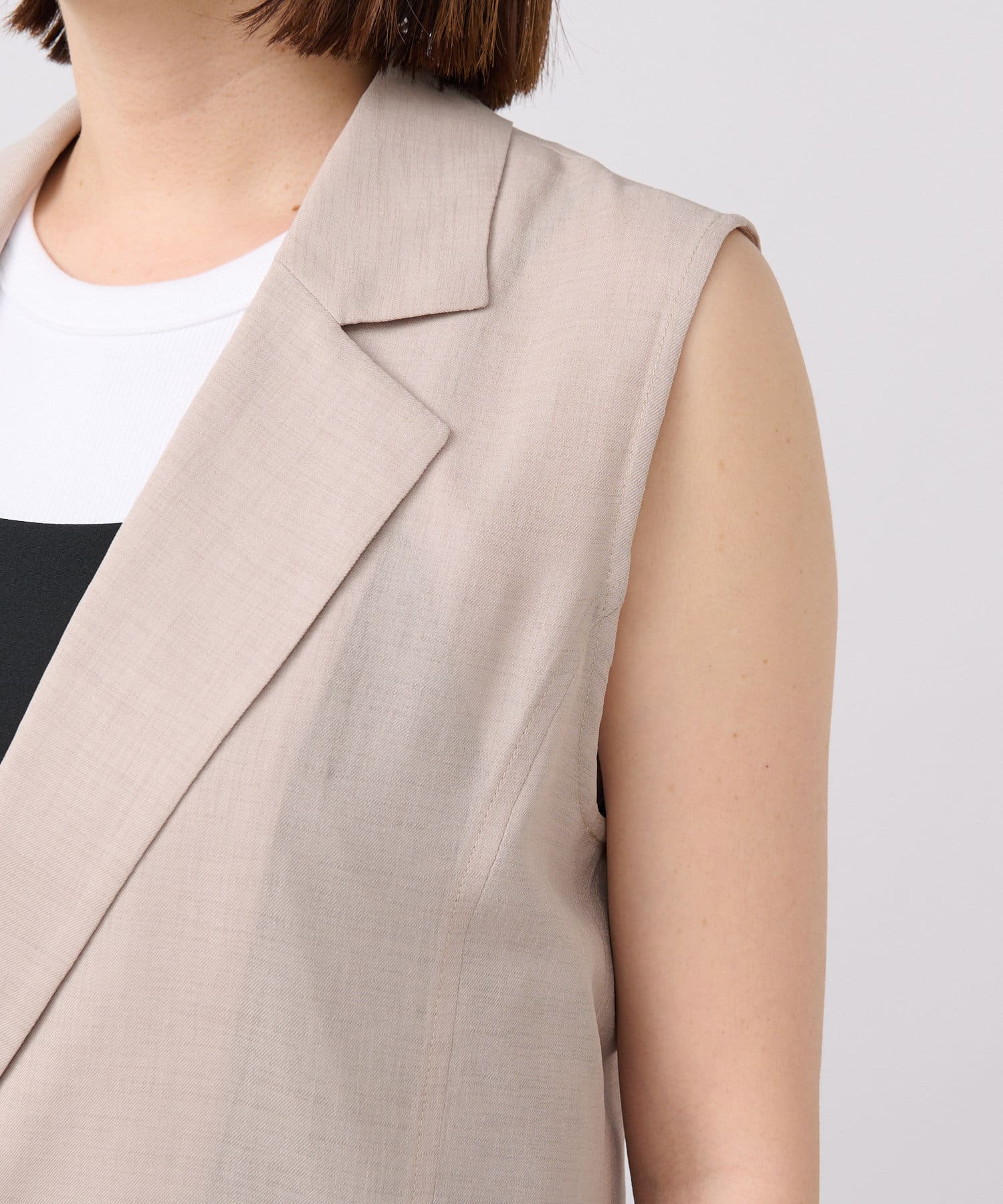 袖ナシのジャケット感覚で羽織れるテーラードシルエット。