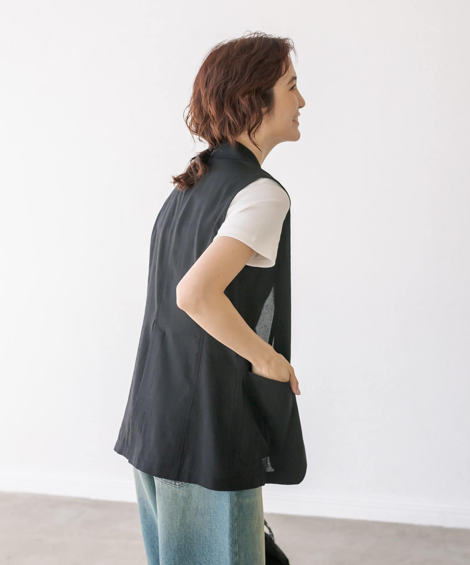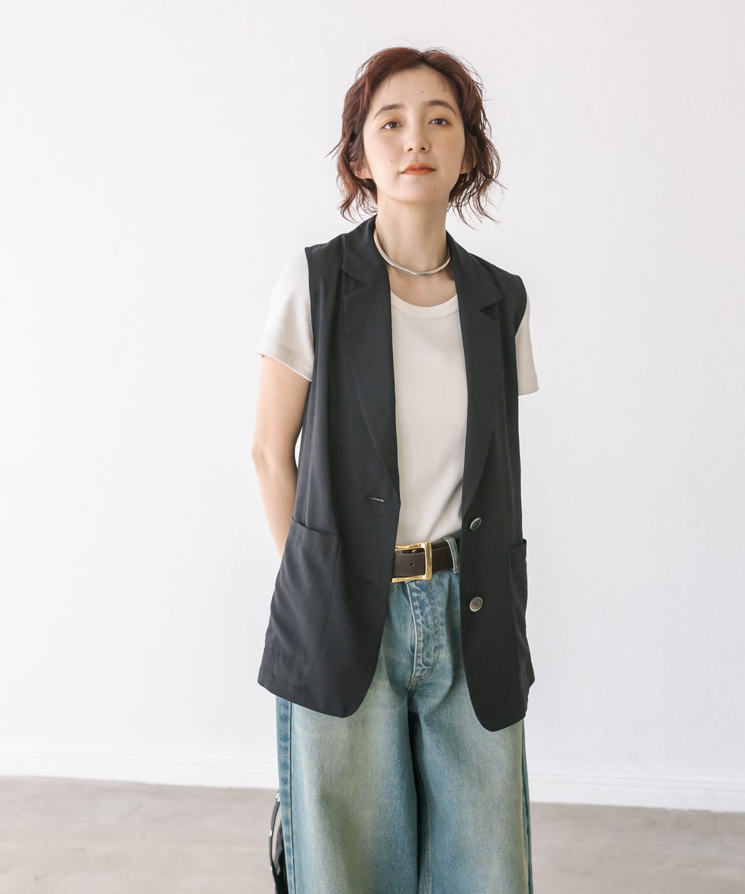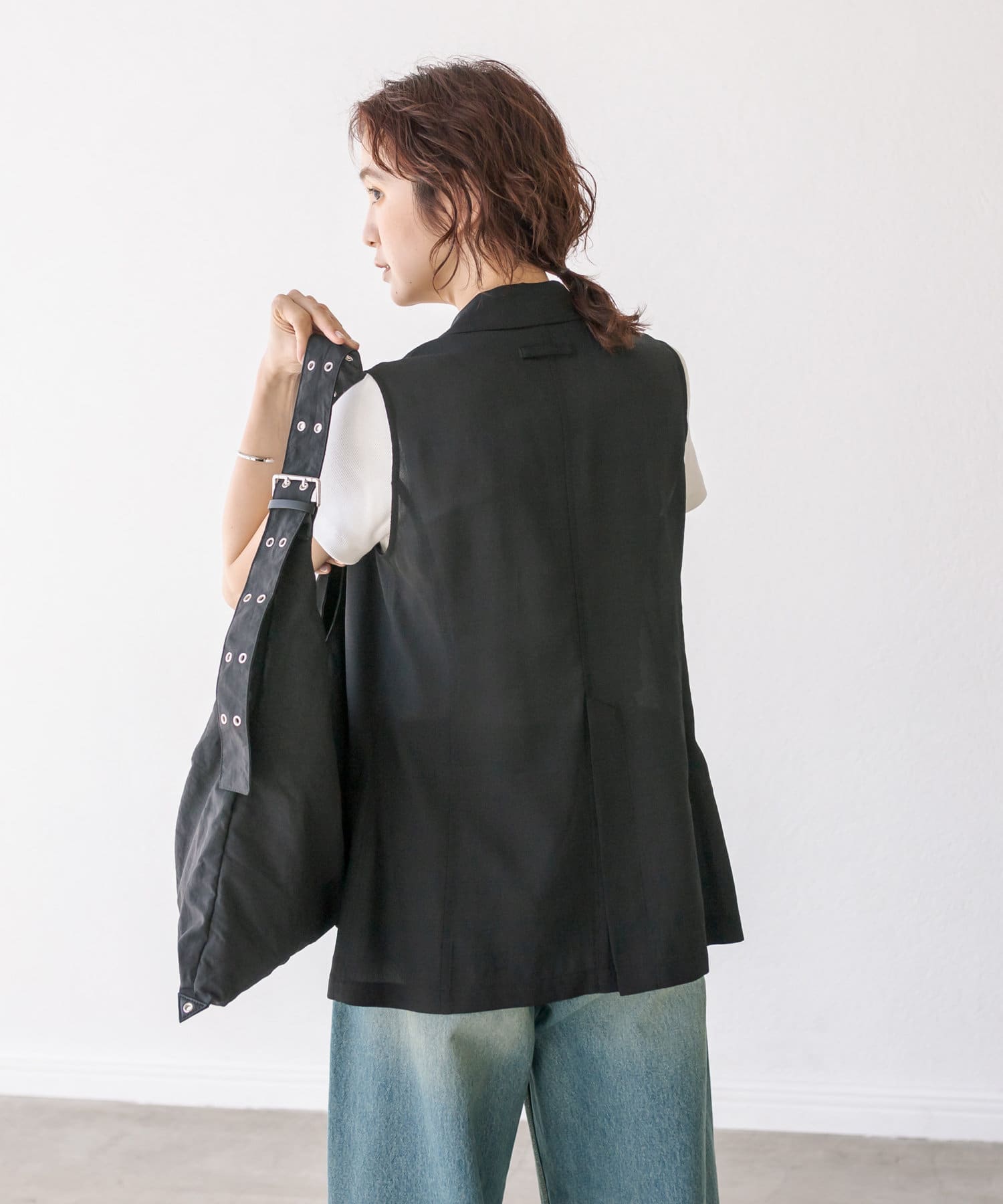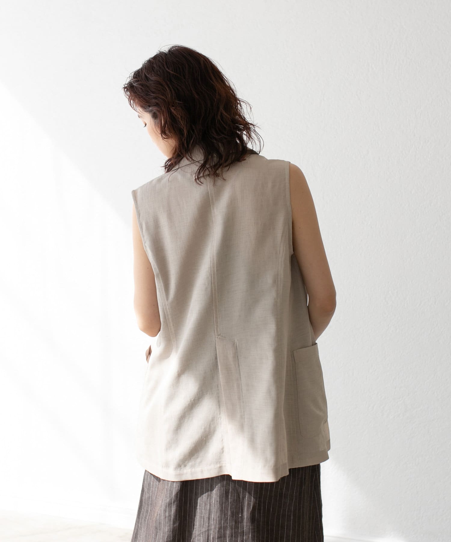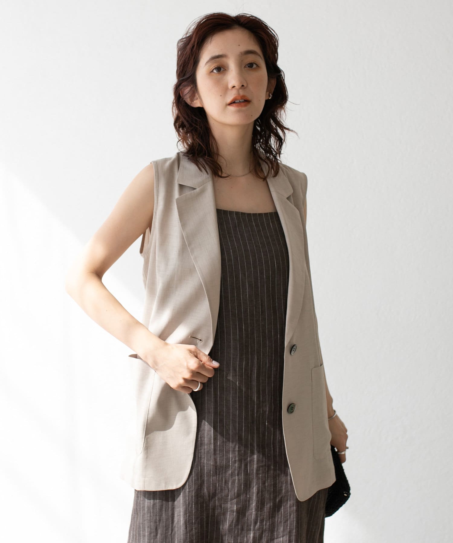 袖ナシのジャケット感覚で羽織れるテーラードシルエット。