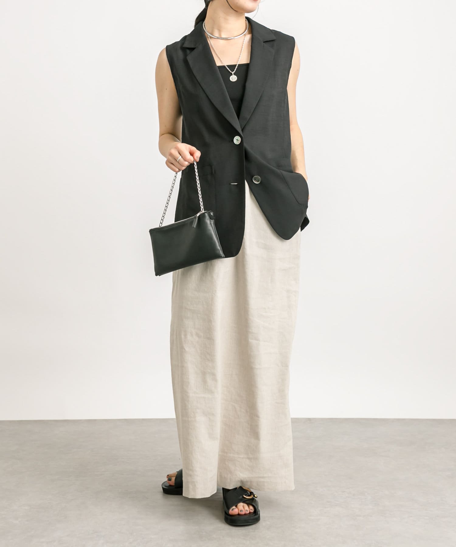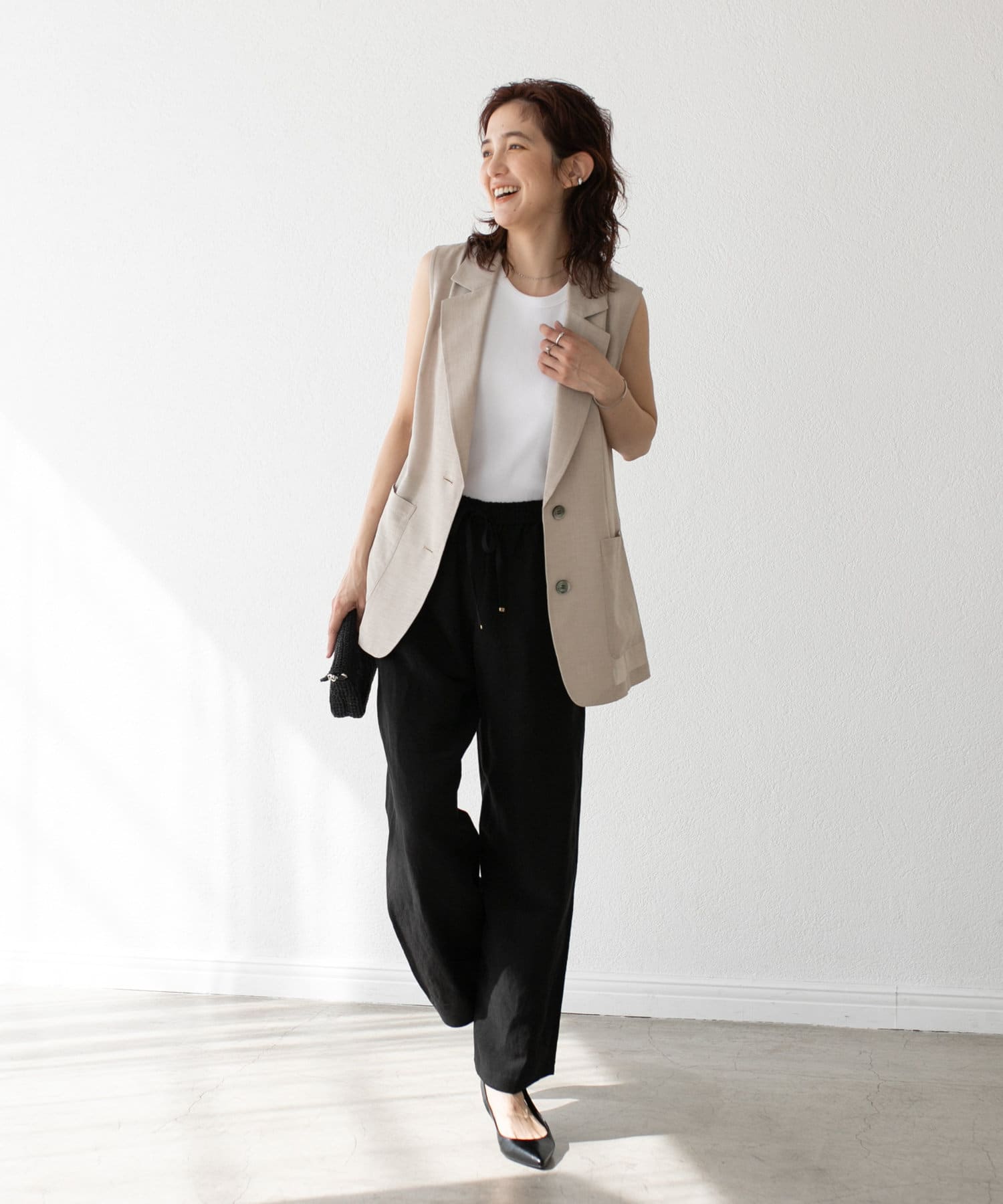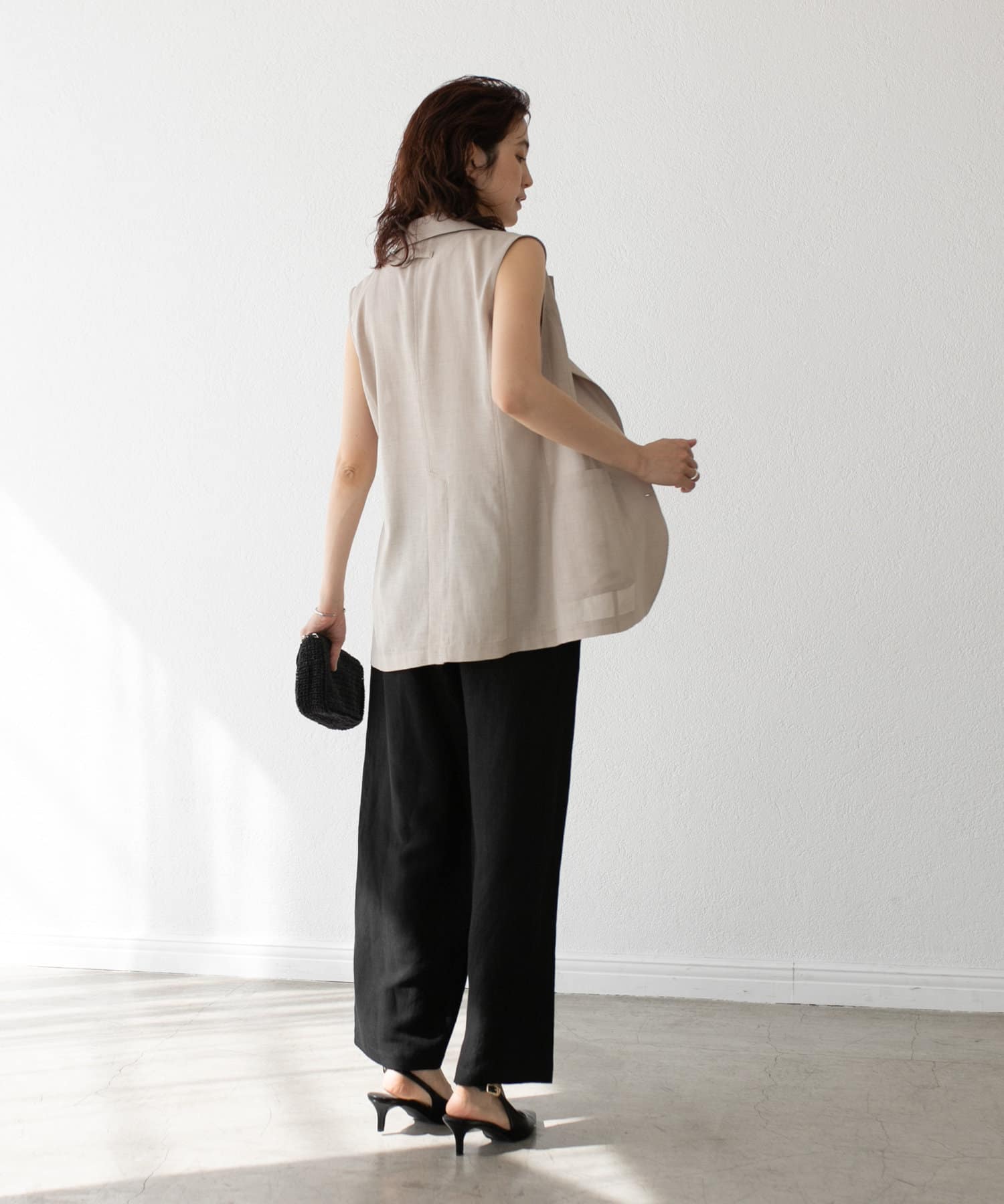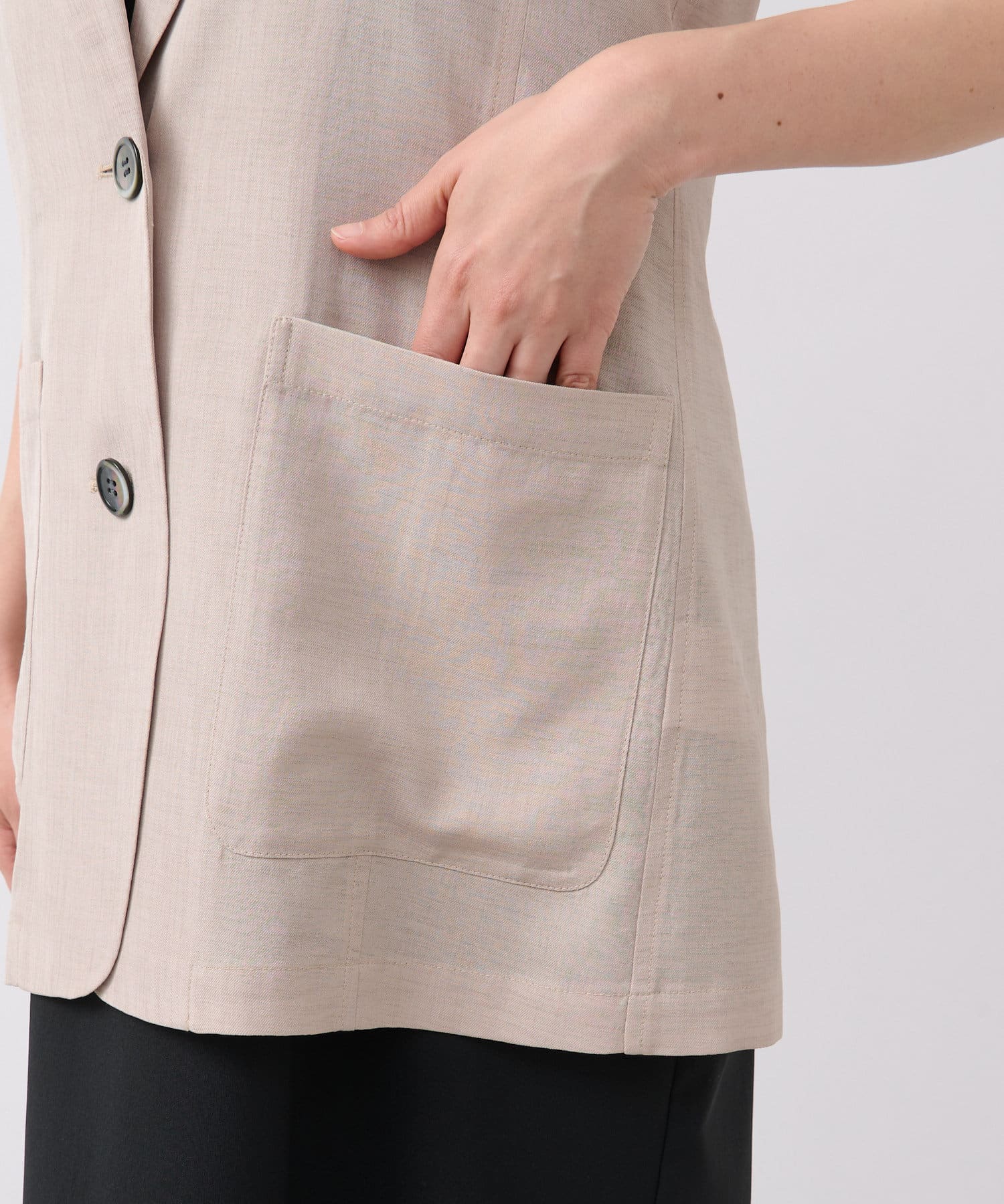 袖ナシのジャケット感覚で羽織れるテーラードシルエット。