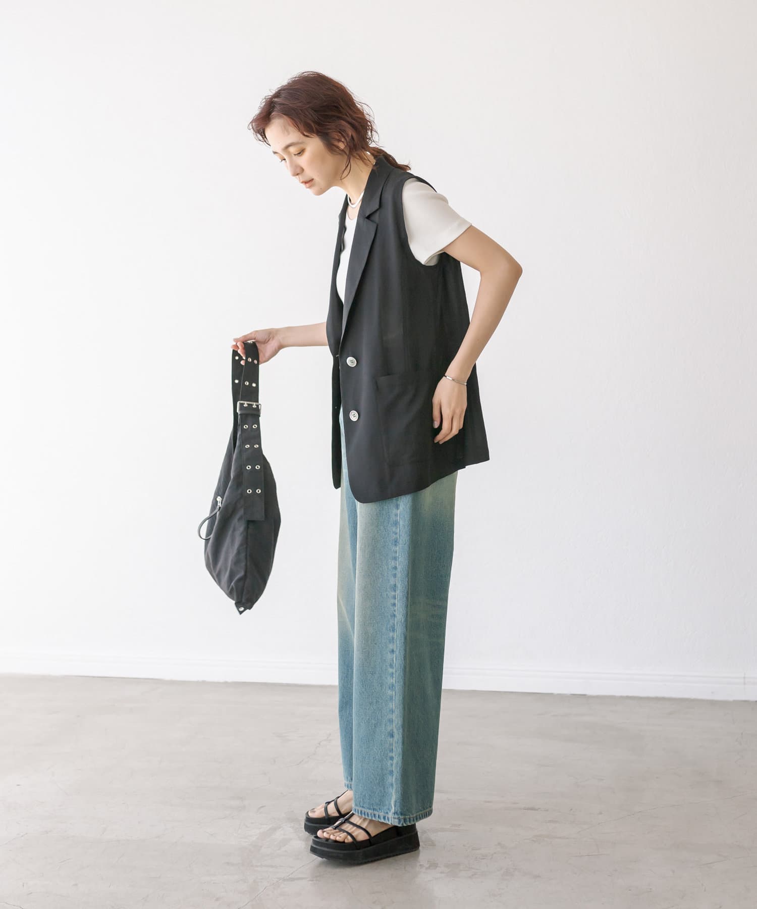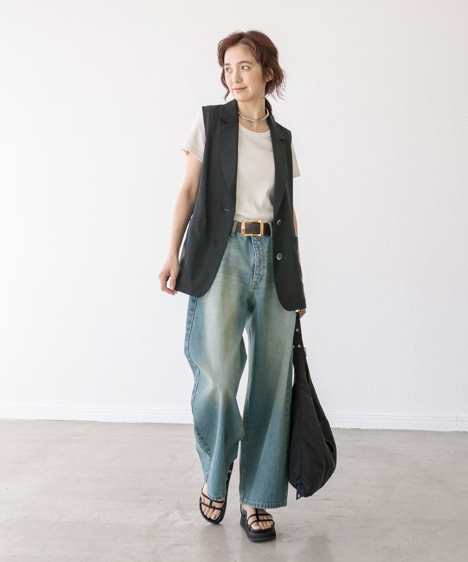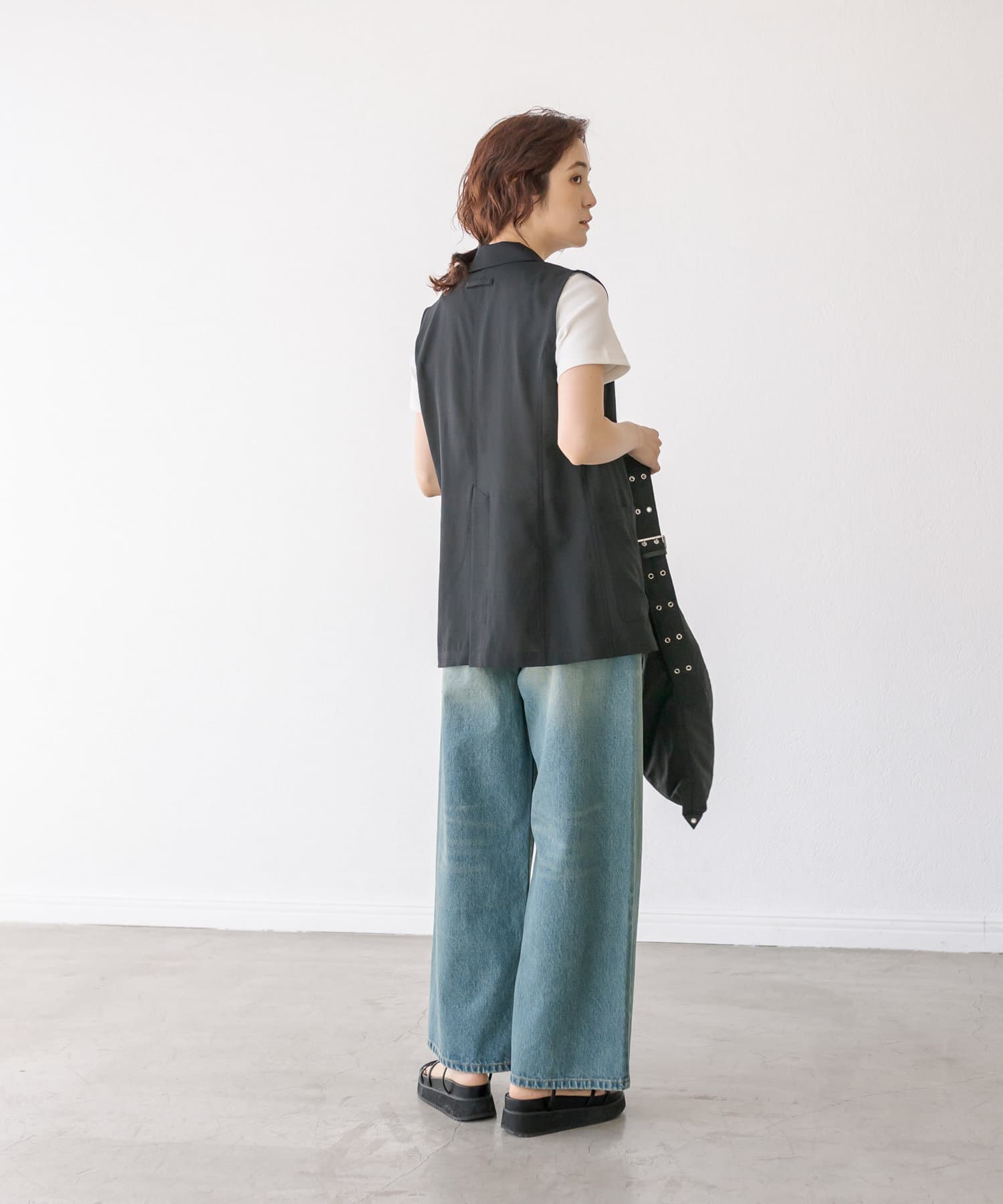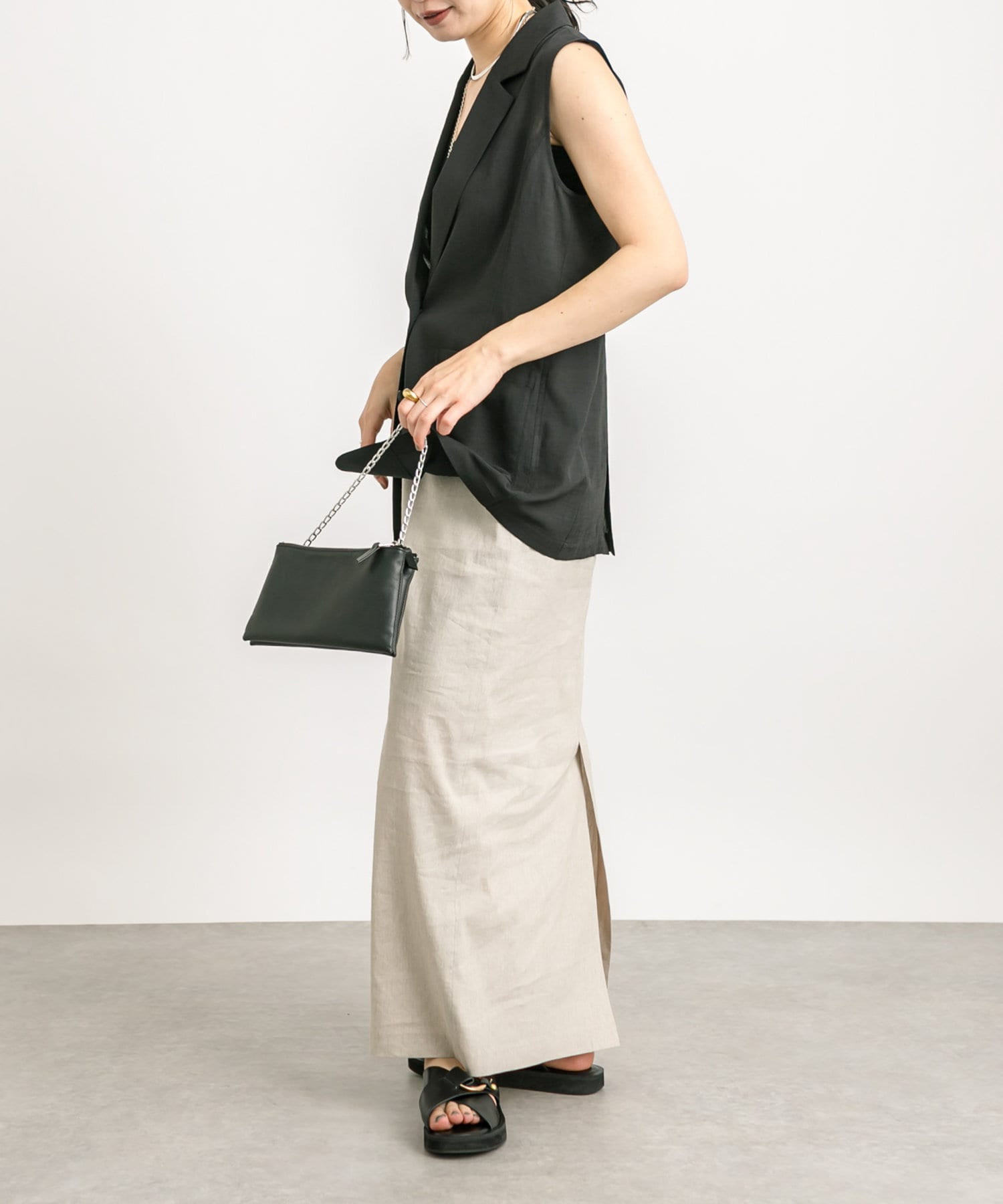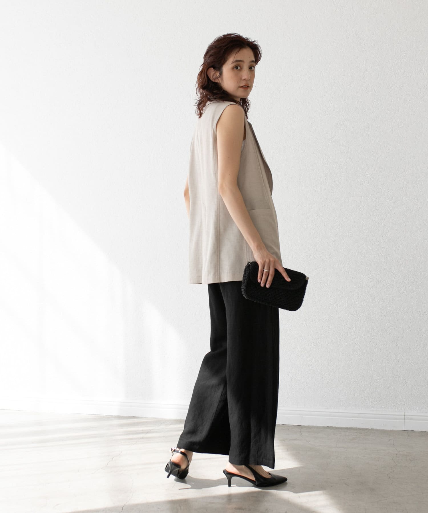 袖ナシのジャケット感覚で羽織れるテーラードシルエット。
