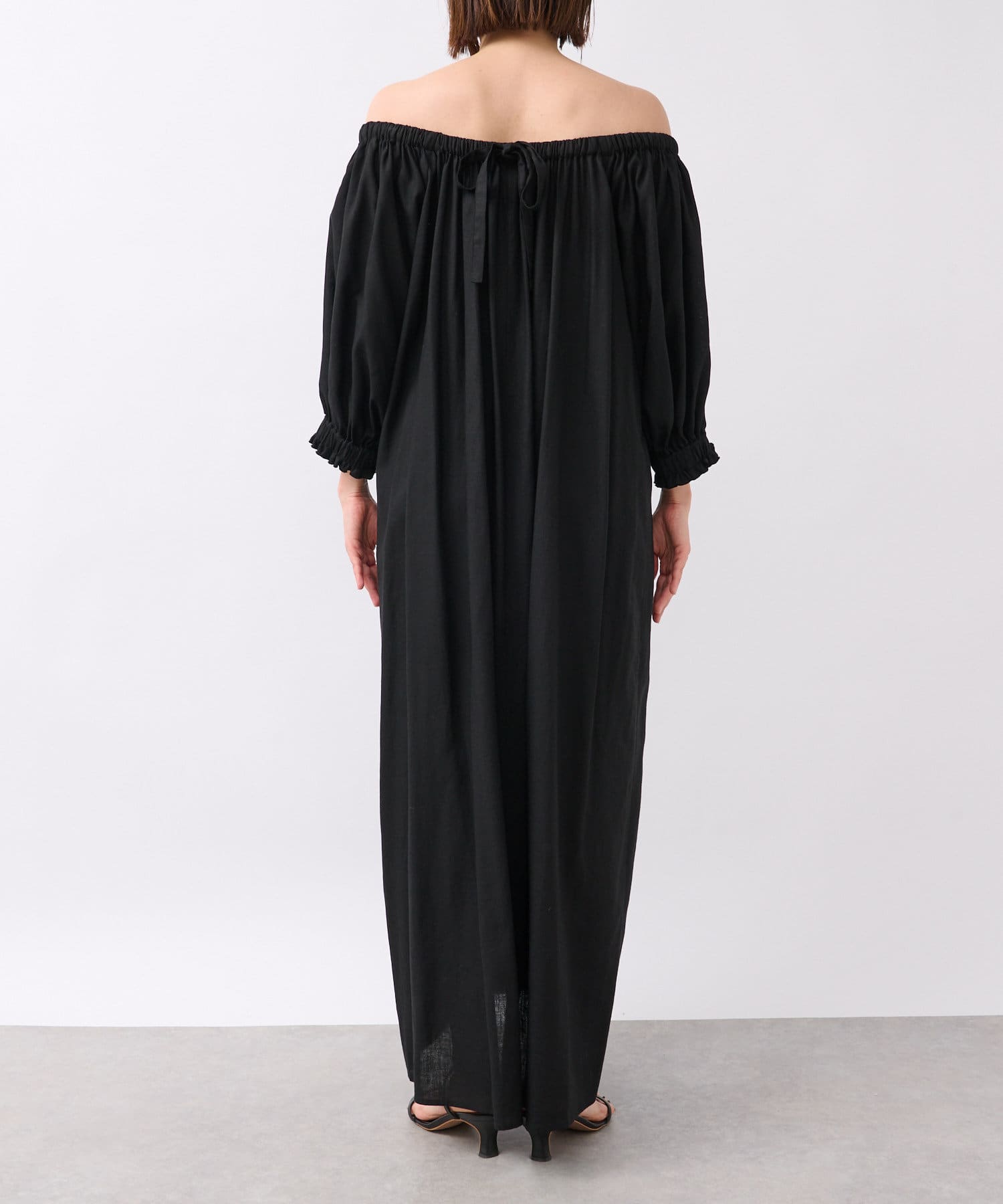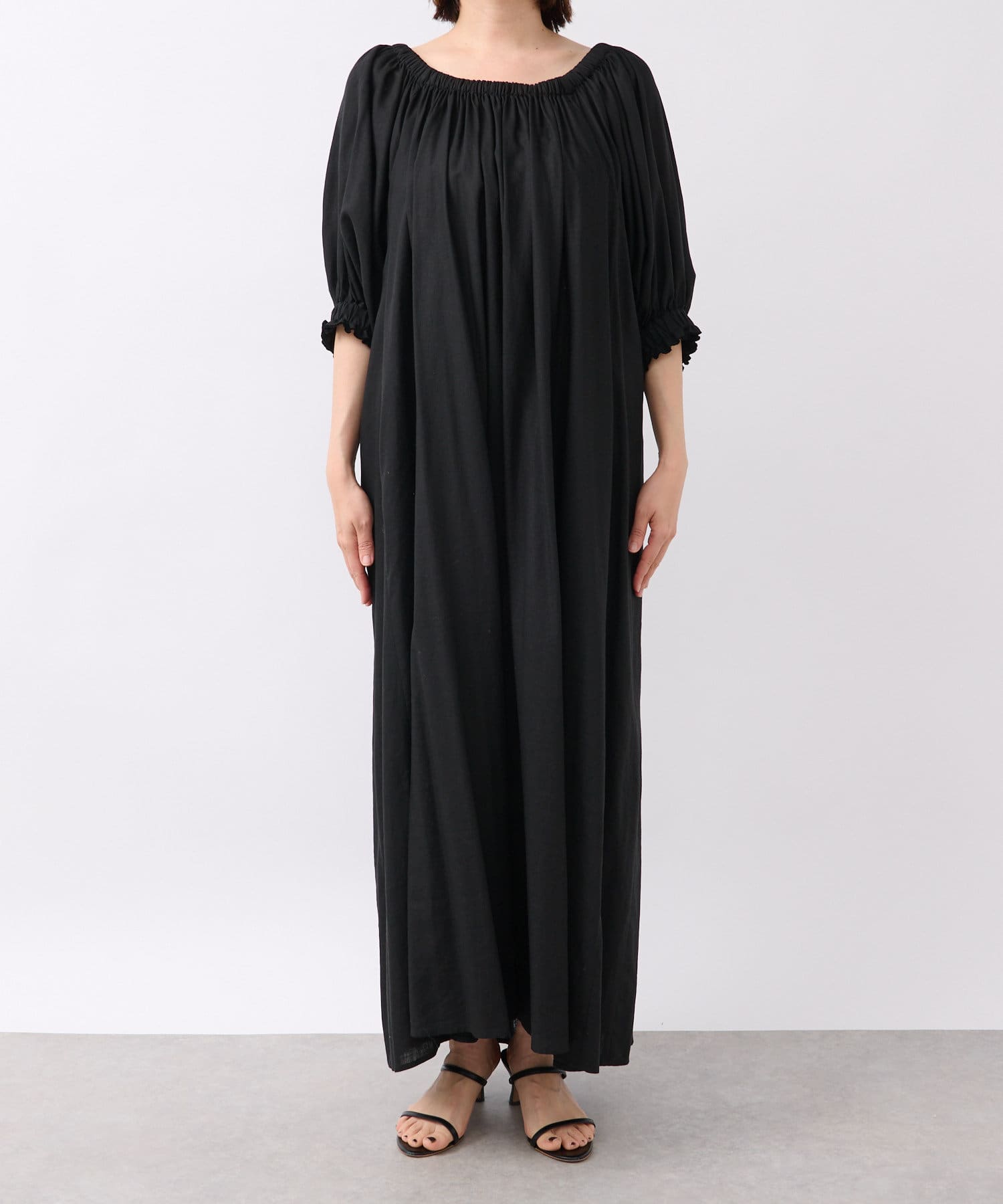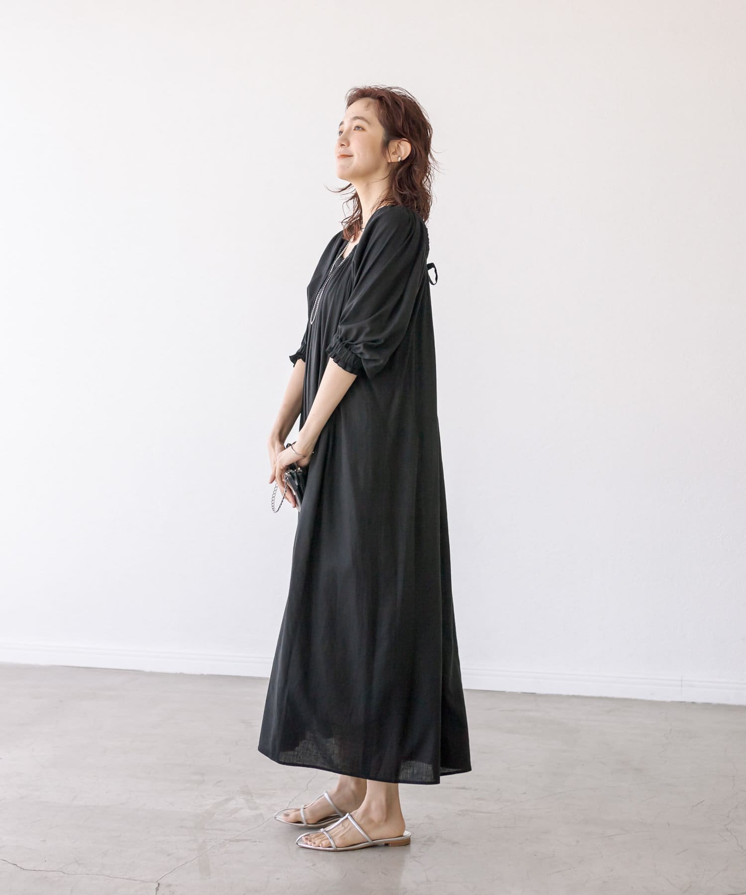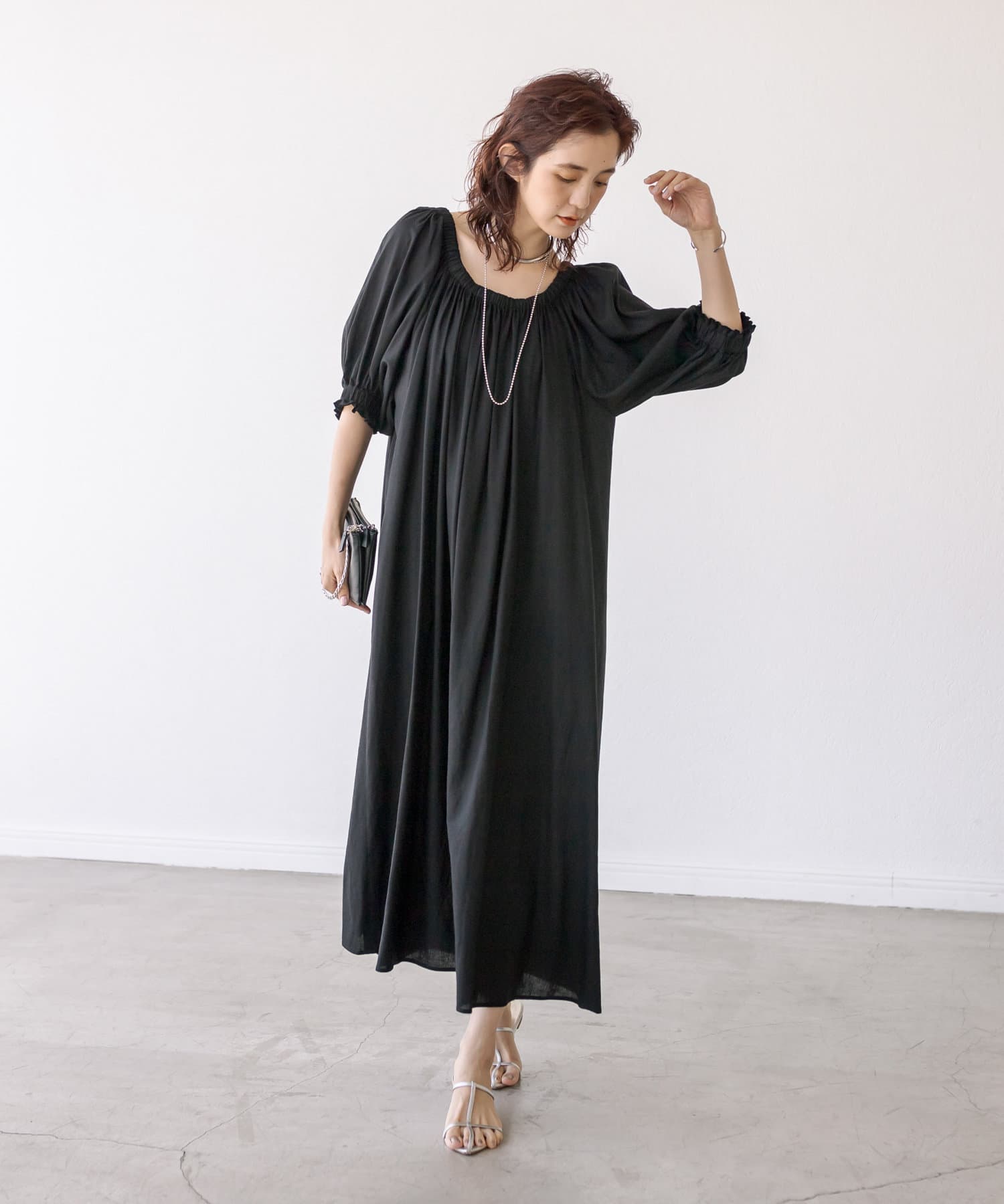 ゆったりとしたシルエットのロングワンピース。