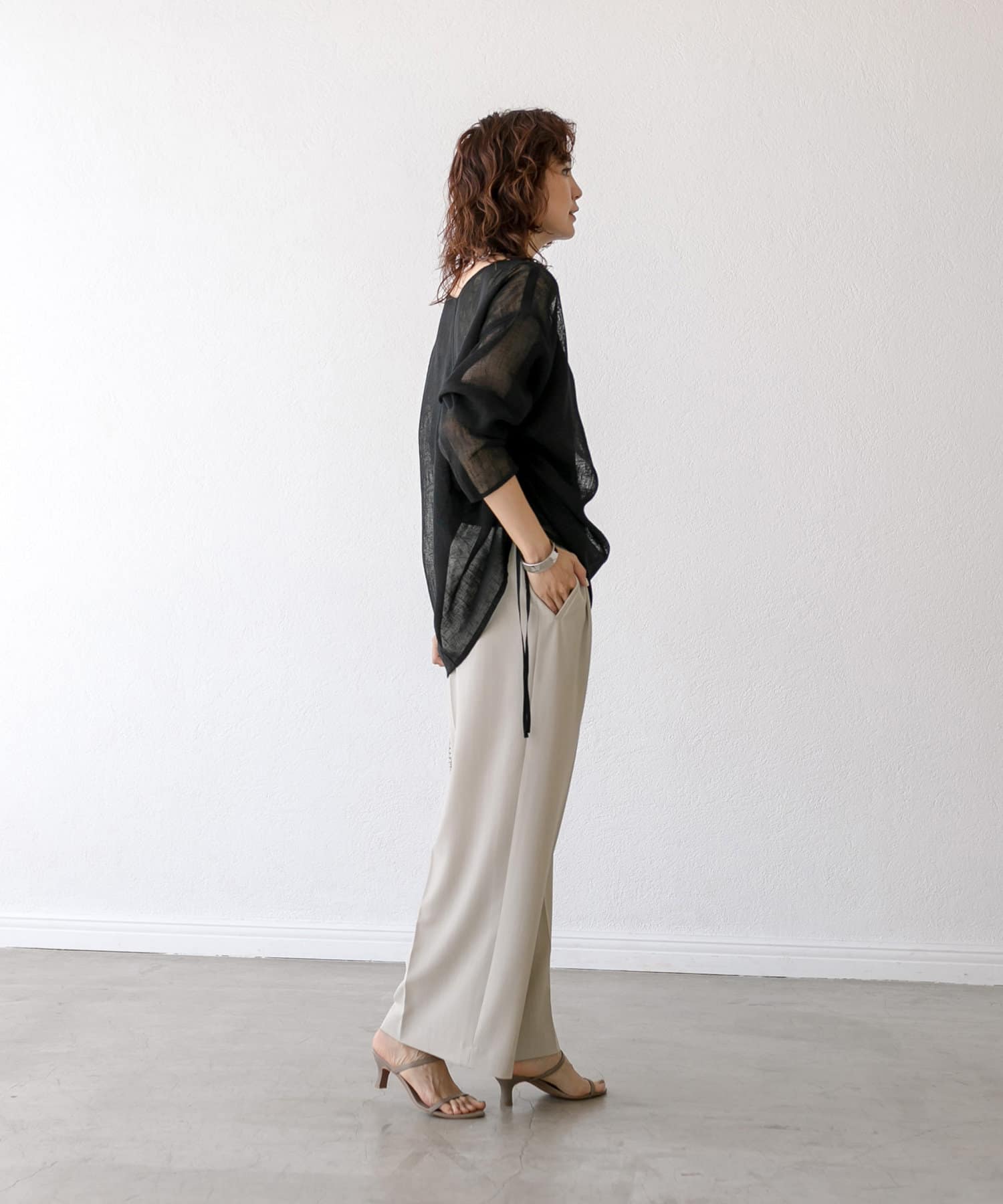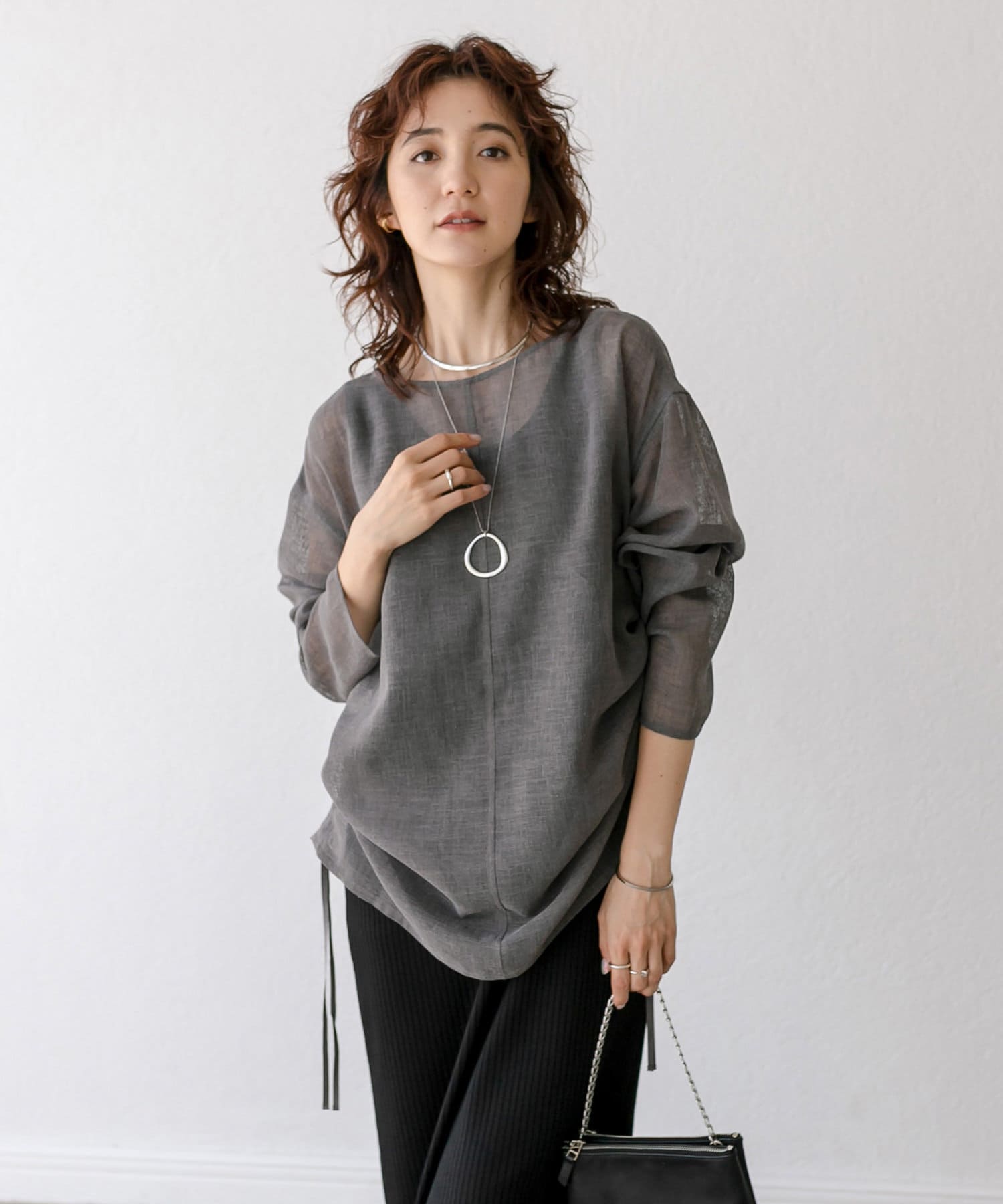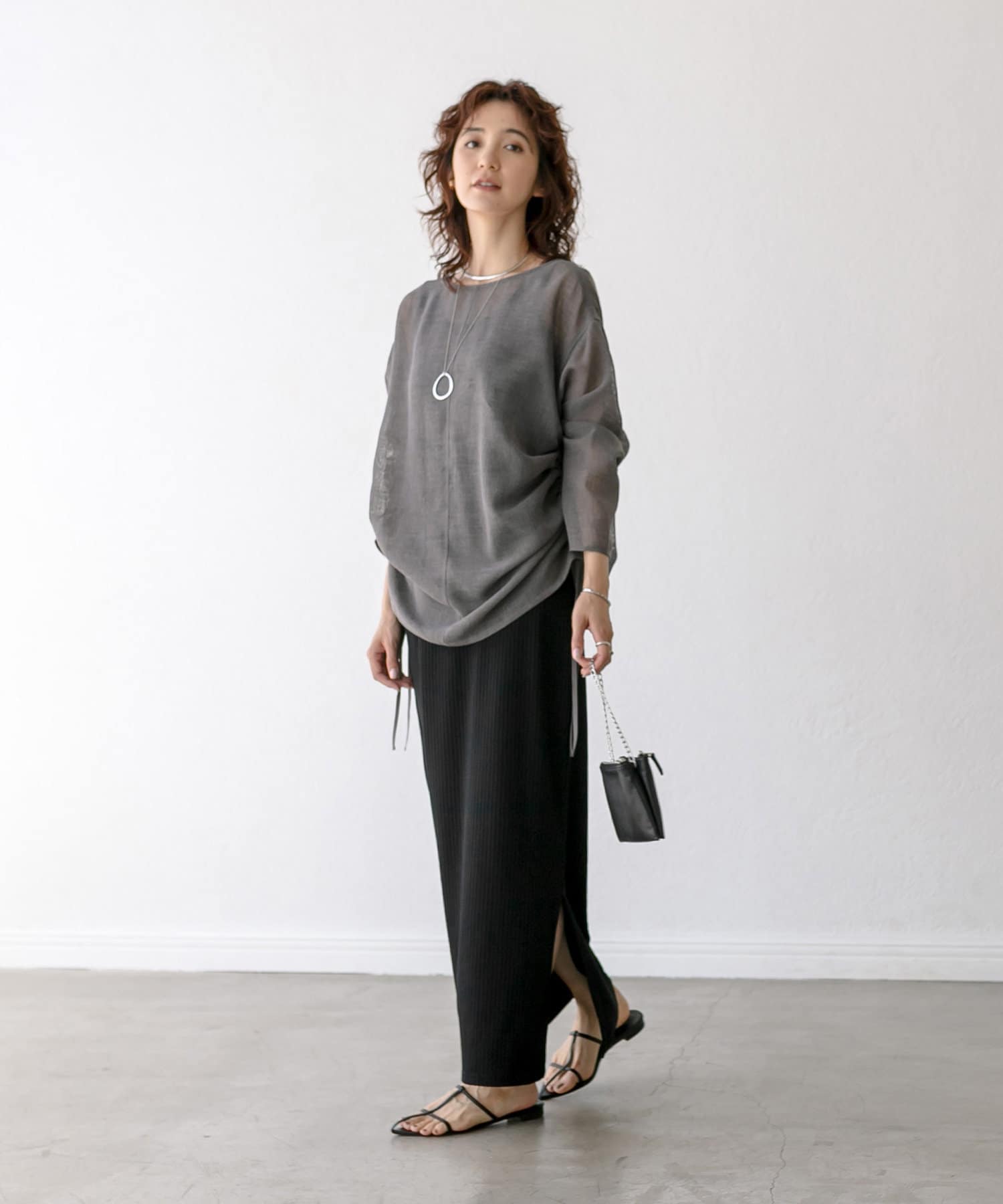 両脇を絞るも良し、片方だけ絞ってイレギュラーなヘムラインで抜け感を出すのも良し。体系カバー&抜け感の出せる万能アイテムです。