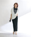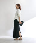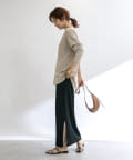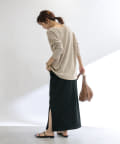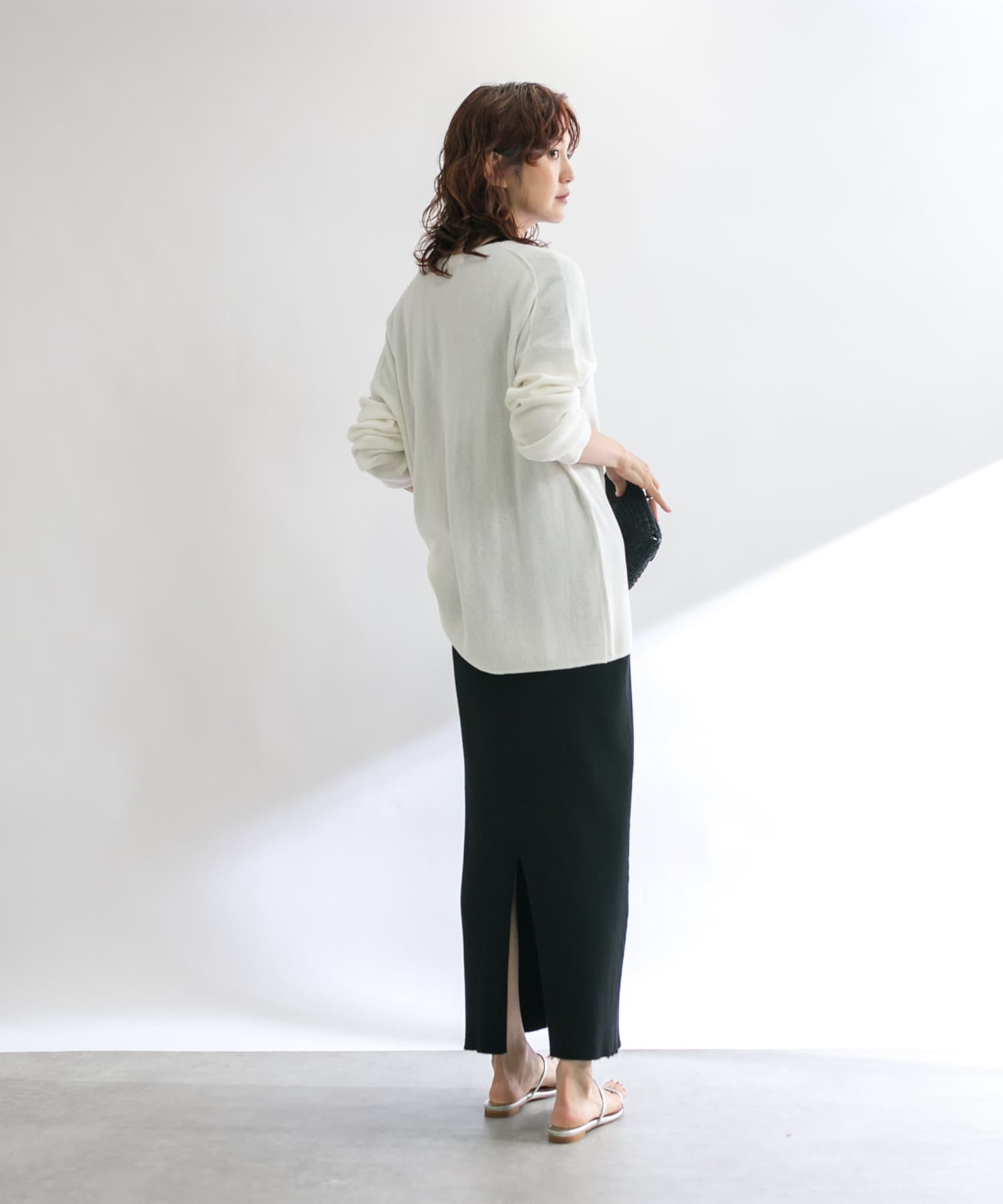 手触りは目が詰まった薄手ニットなんですが、クールタッチなので着てみるとひんやりします。絶妙なゆるさがありますが、落ち感があり着痩せします。おしりも隠れて、デニムでも、スカートでもボトムスを選びません。試着して買わない選択肢はありませんでした!