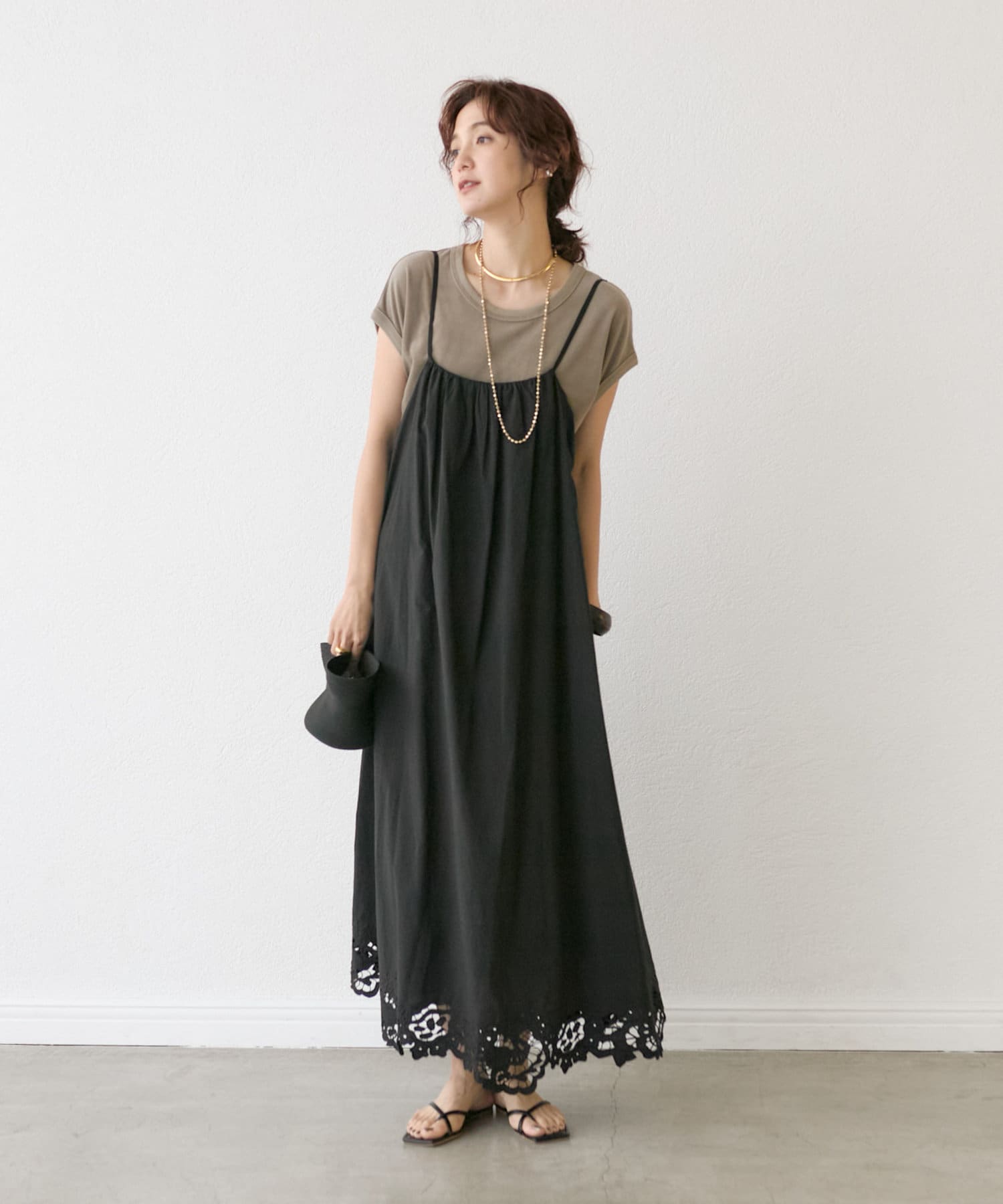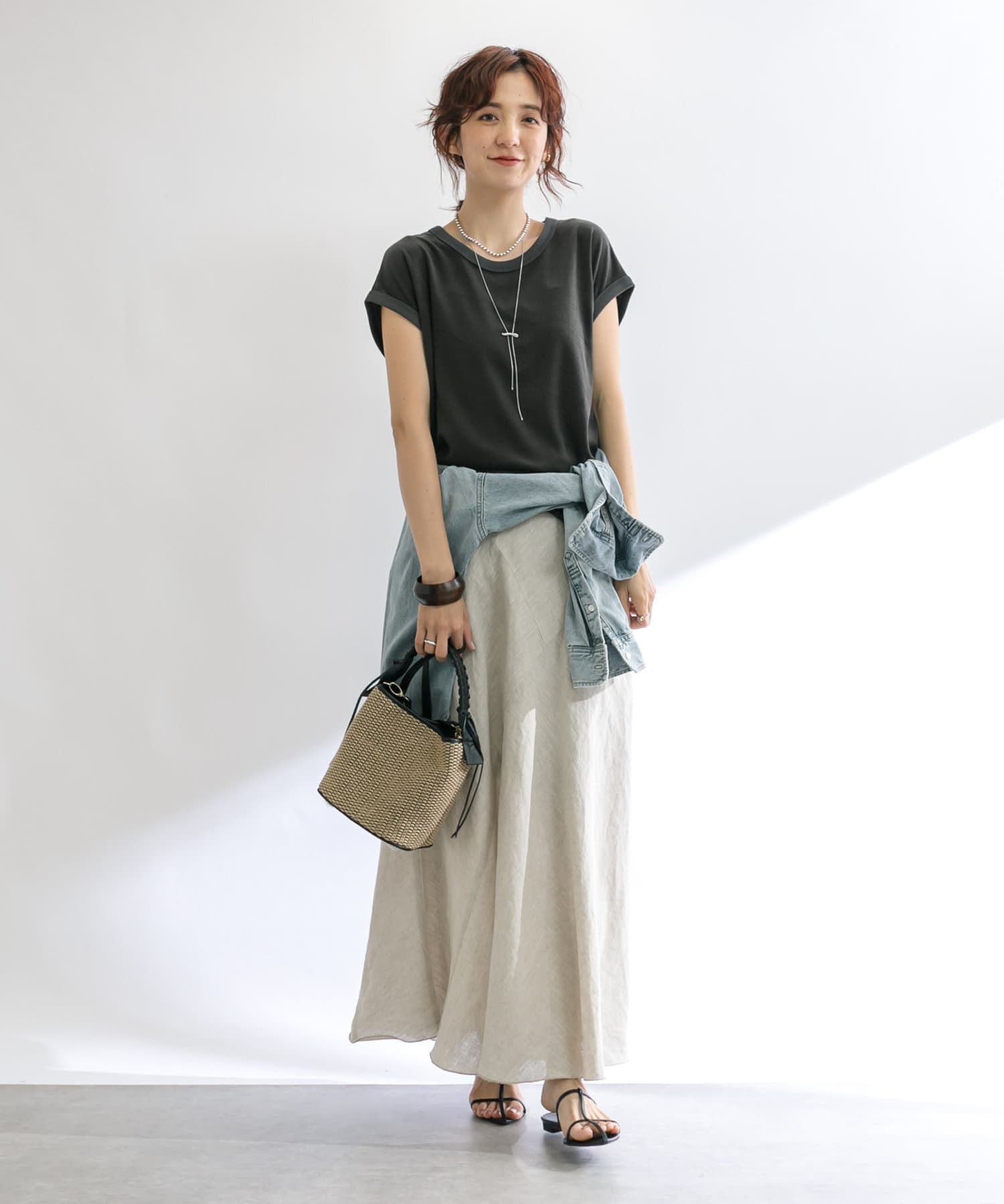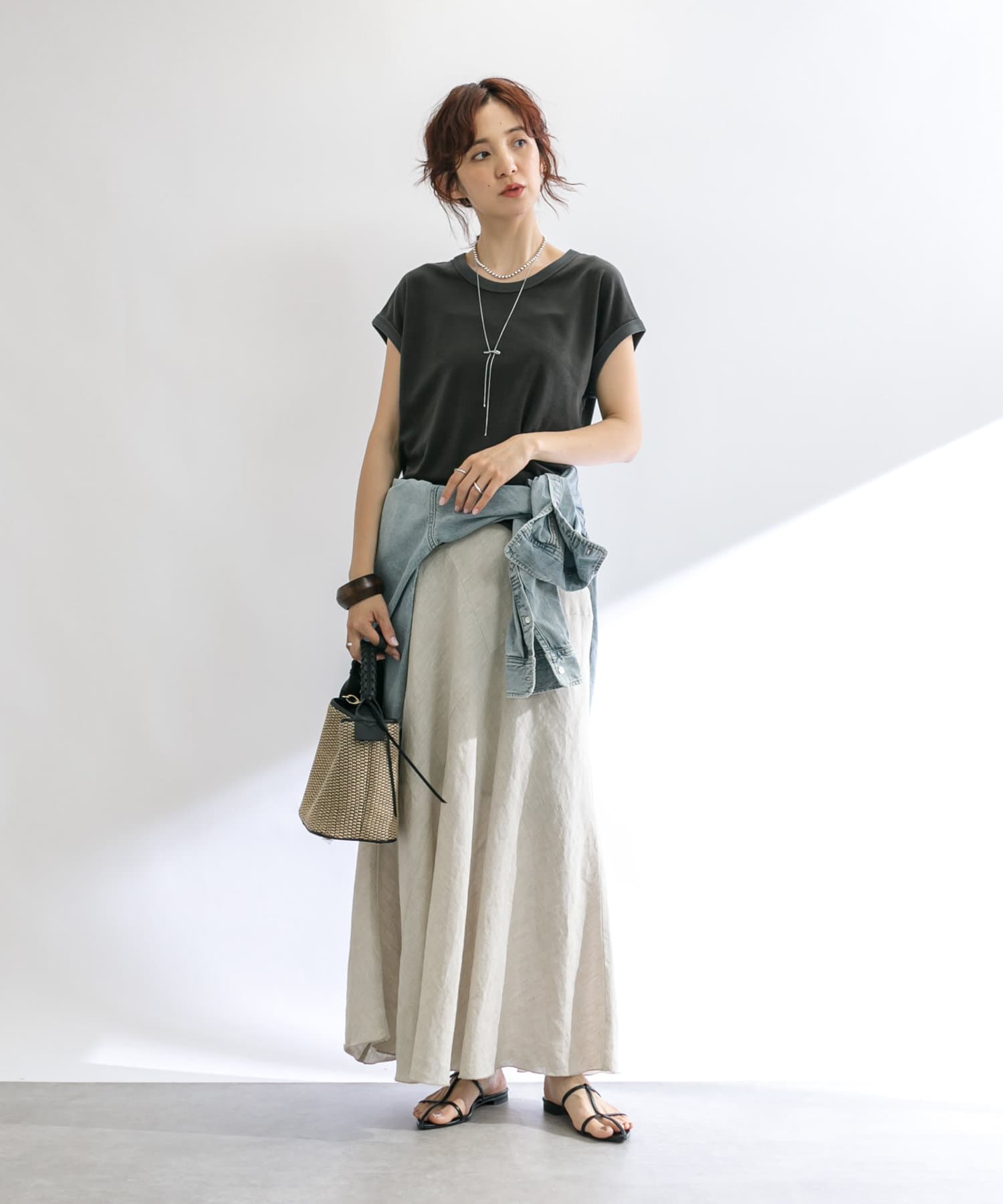 フレンチスリーブで二の腕の気になり部分はカバーしながら、肩回りがコンパクトに見えるようなデザイン。