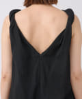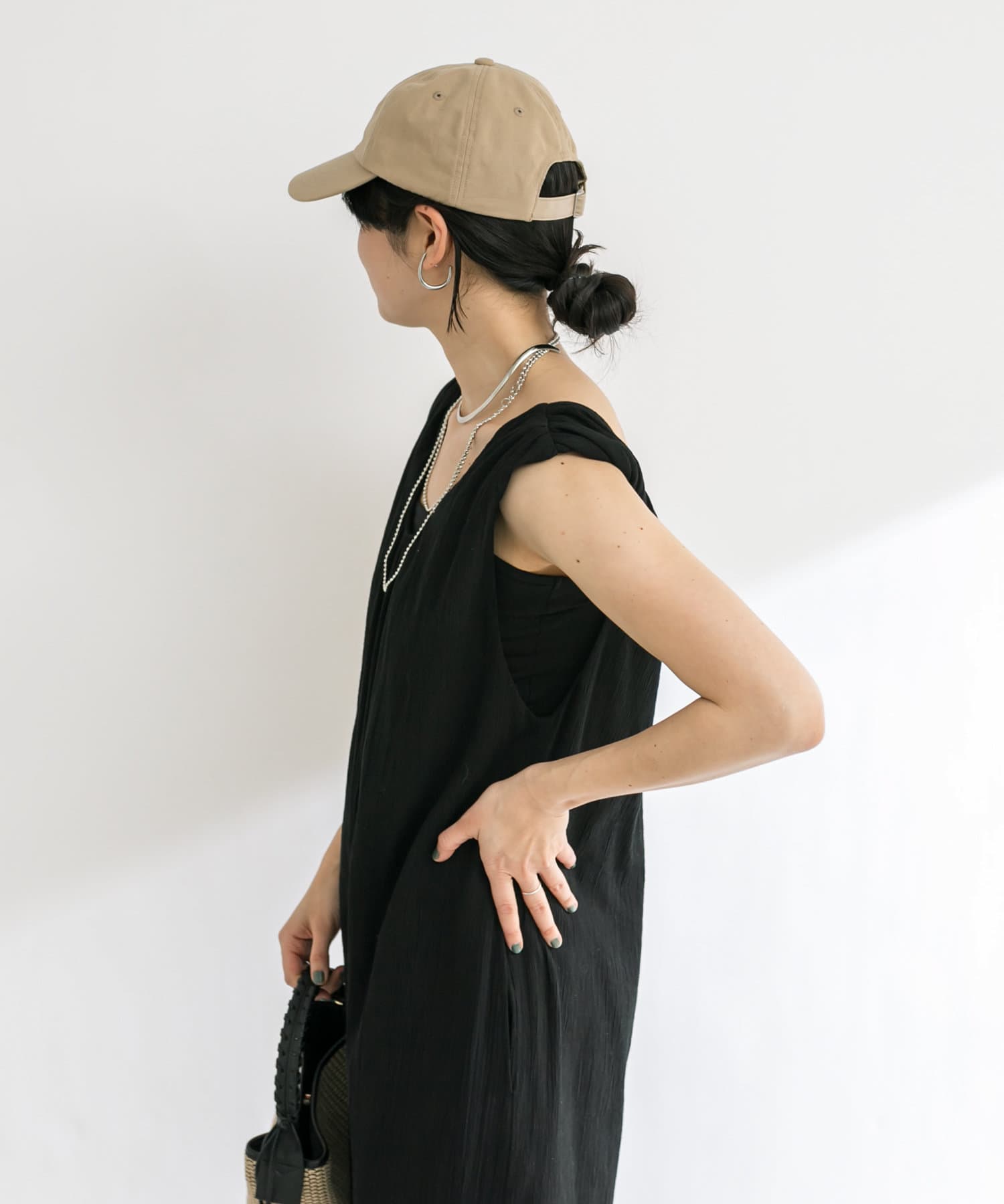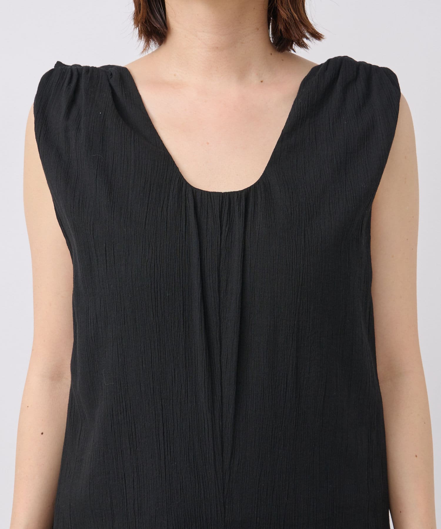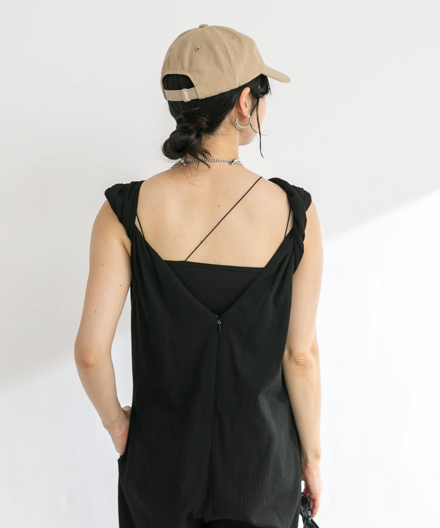 Uに開いたネックラインや、後ろのツイストディテールがポイントになり、1枚で様になります。
