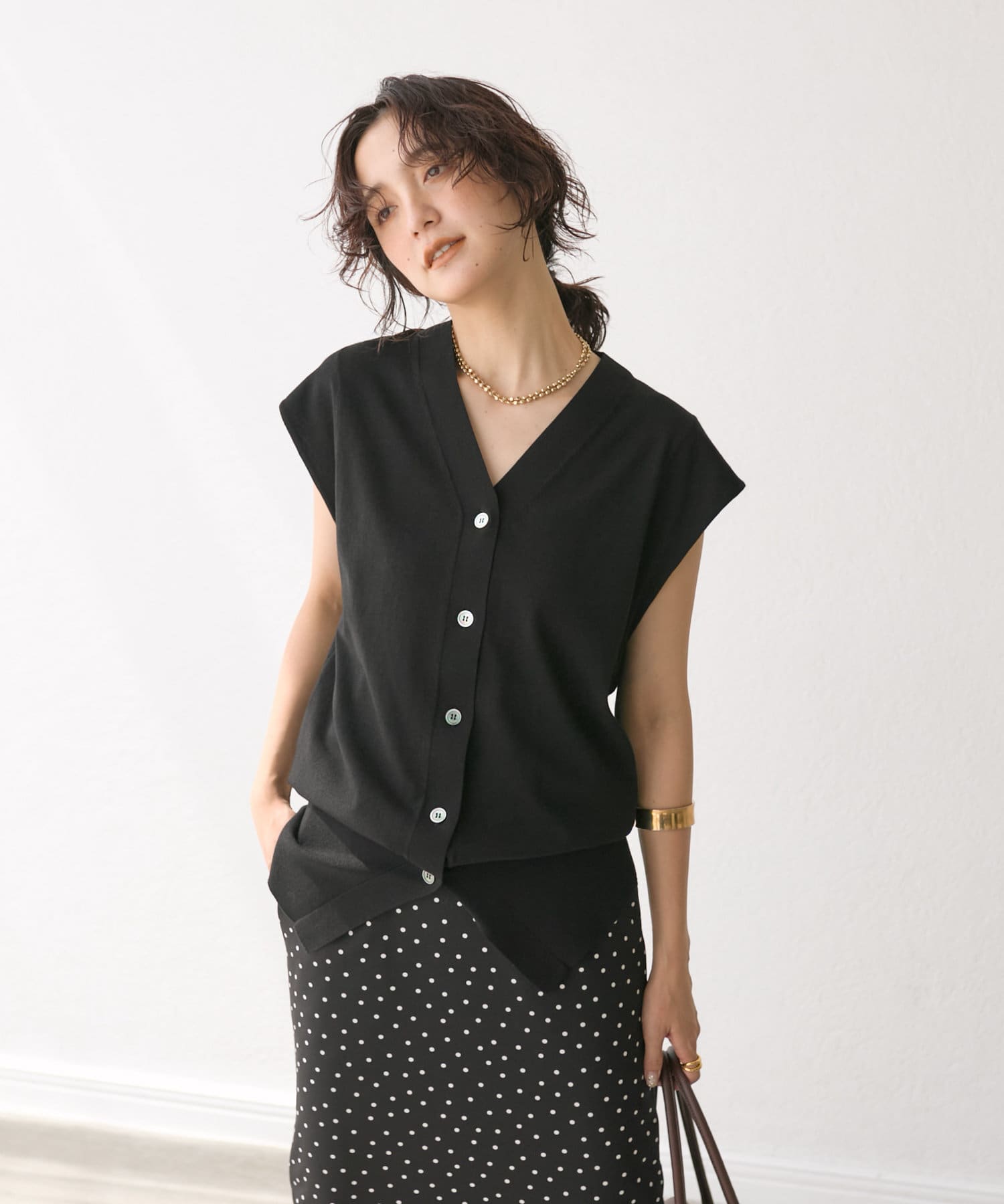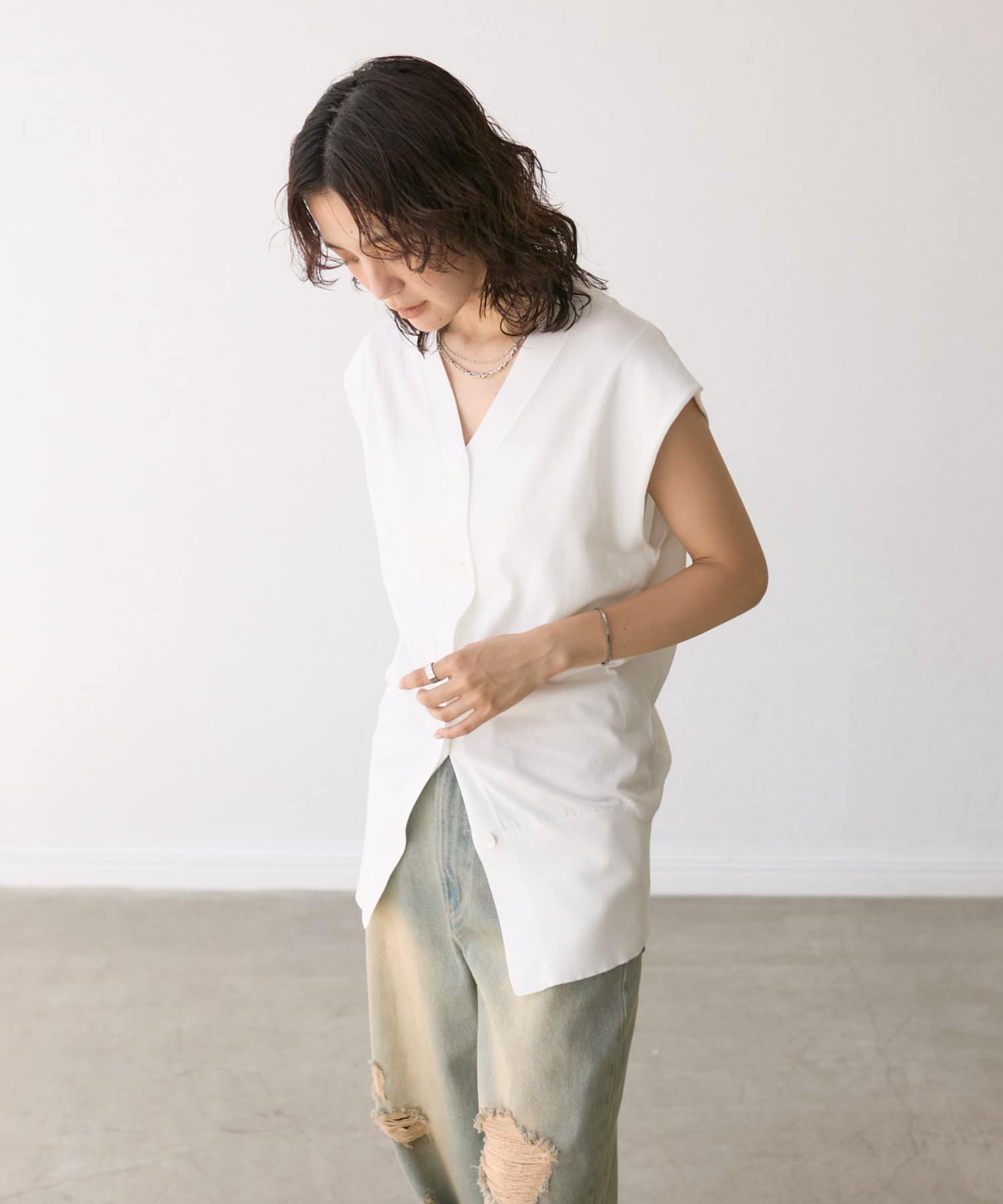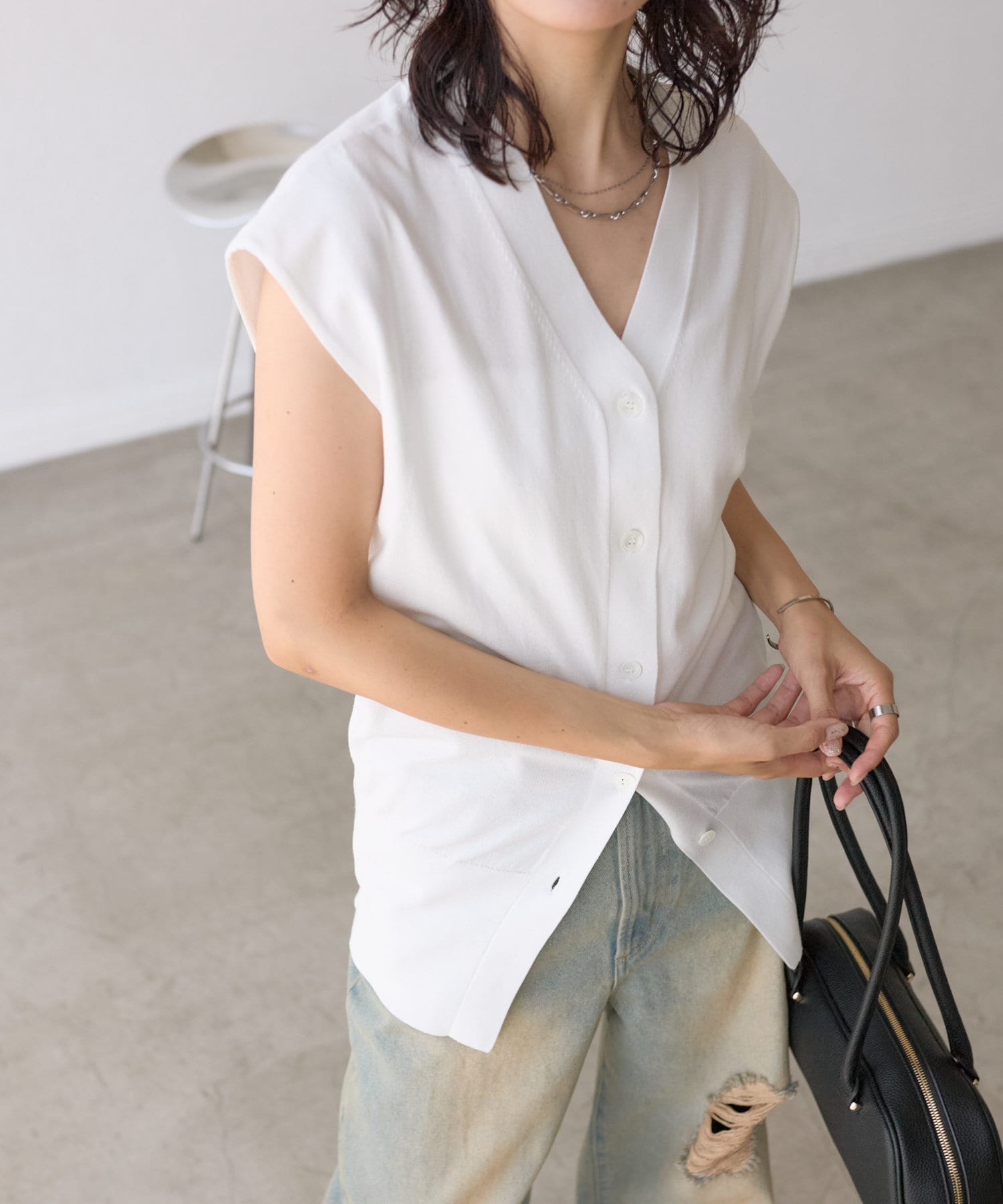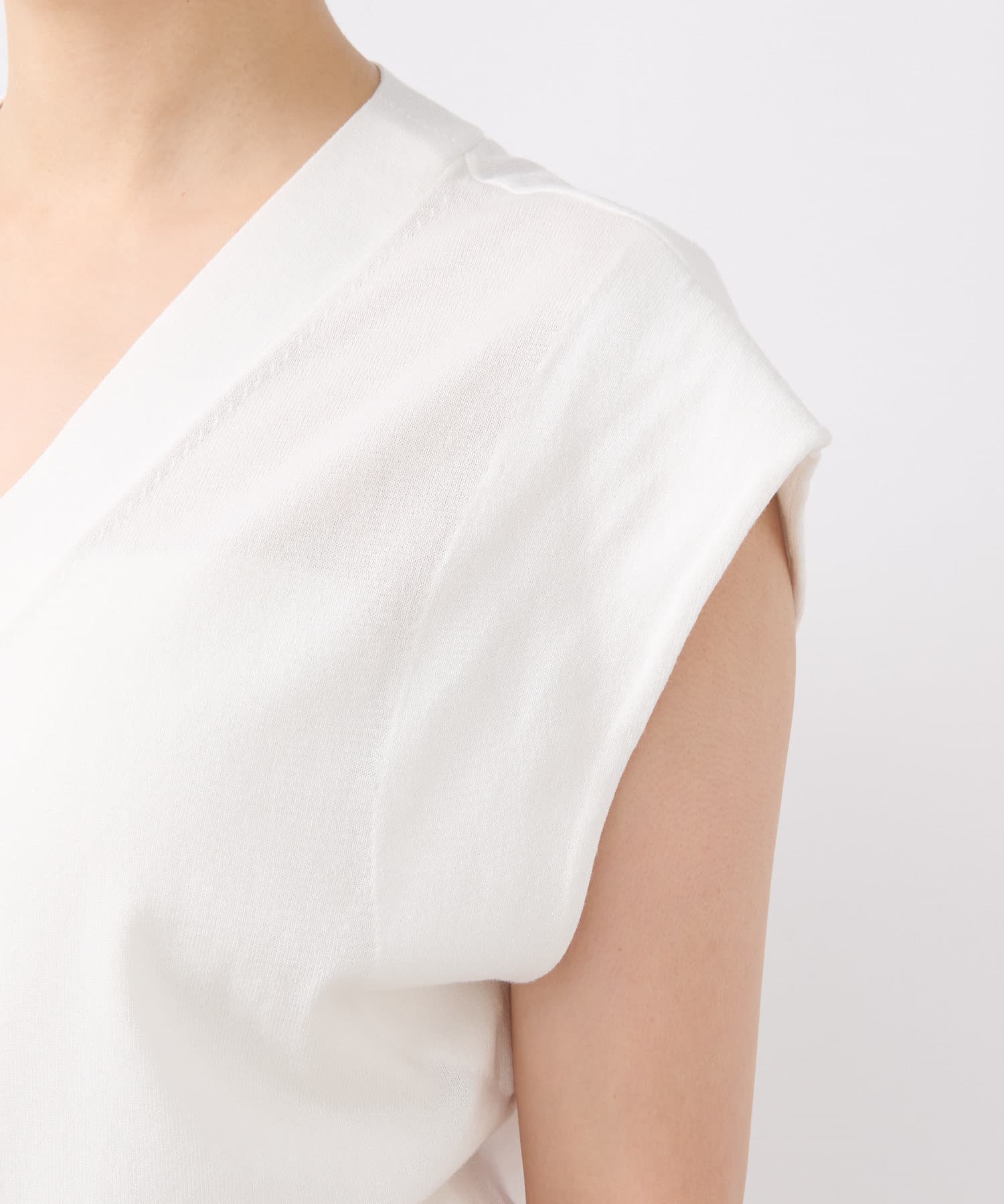 シャープなVネックと抜け感のあるリブデザインがポイント。