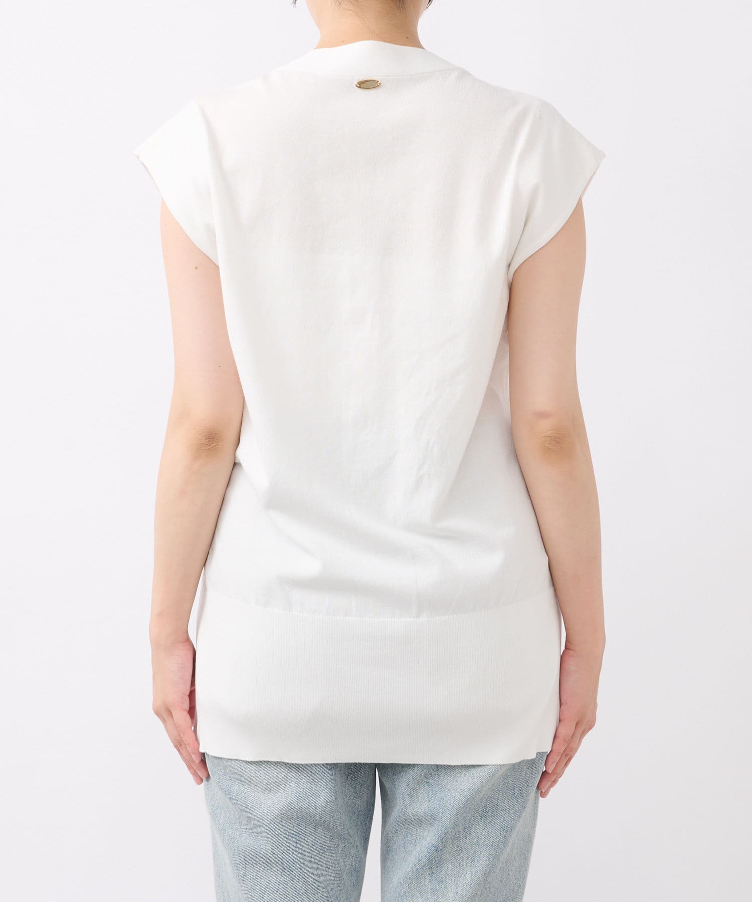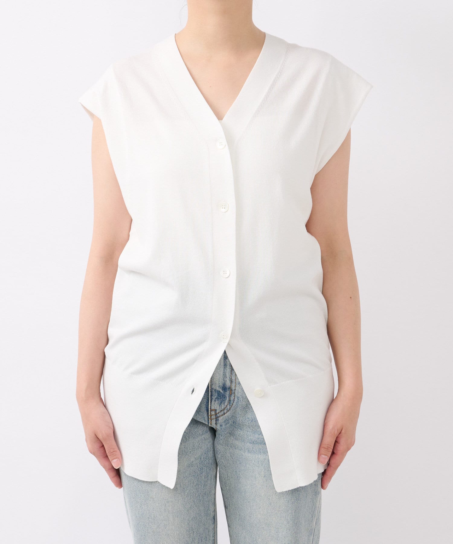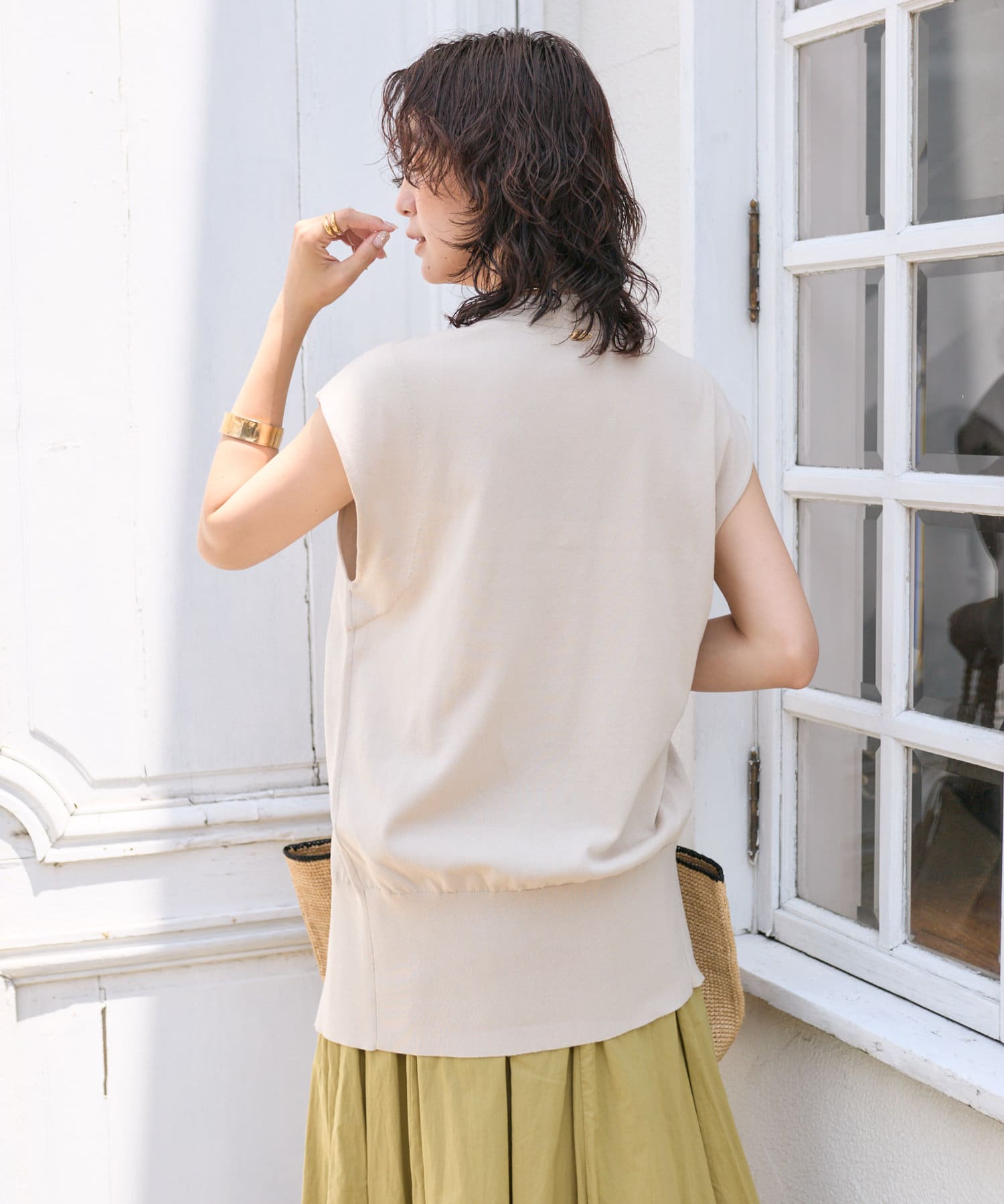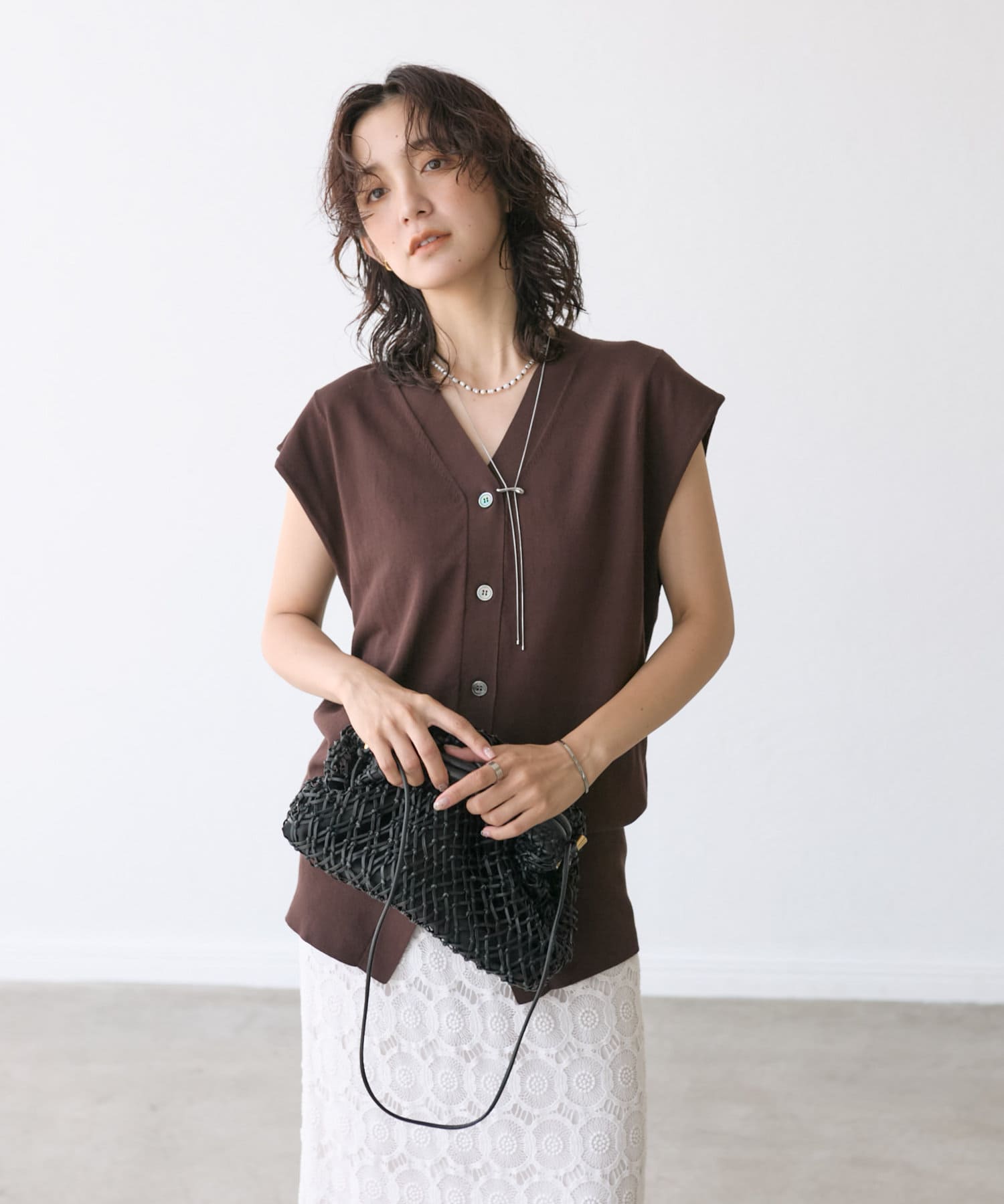 シャープなVネックと抜け感のあるリブデザインがポイント。