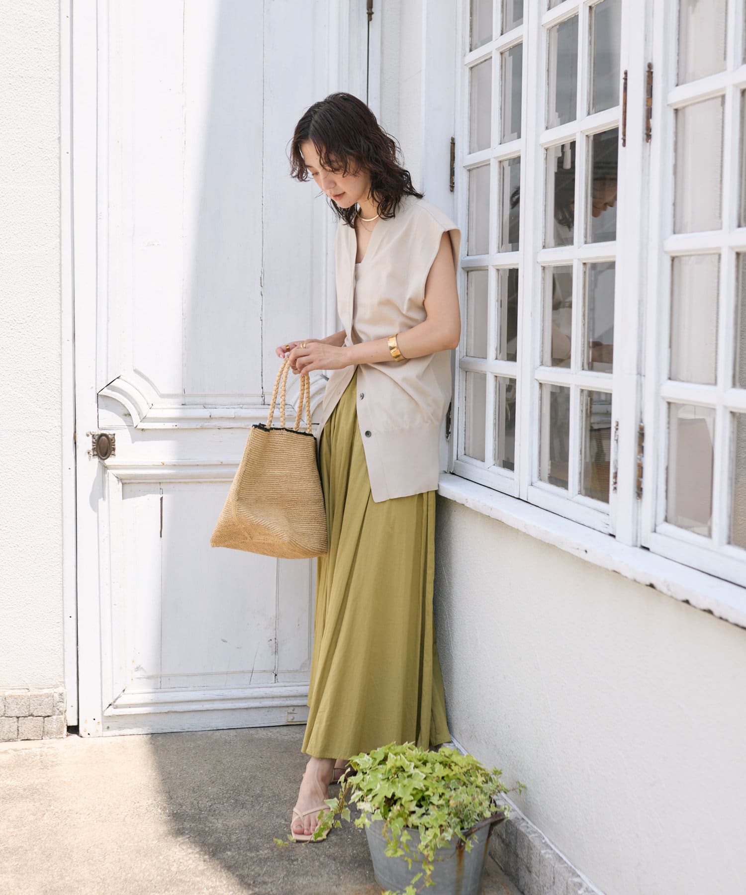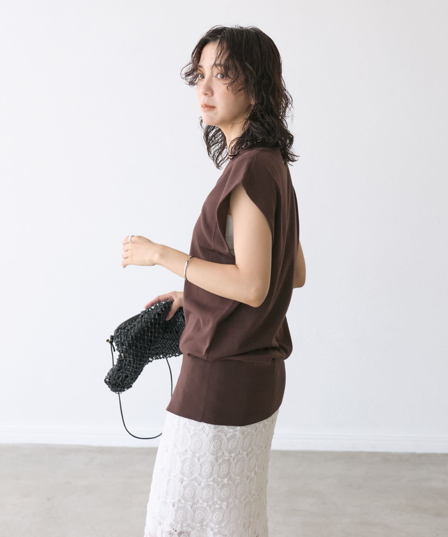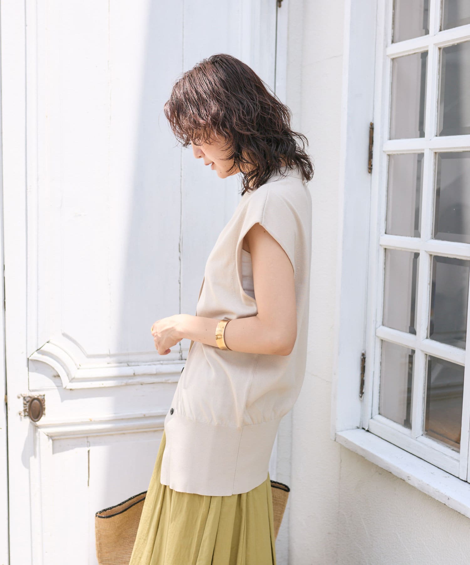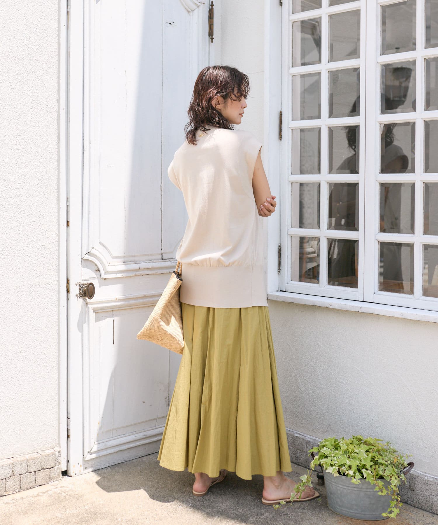 ボリュームのあるギャザーフレアースカートにも、Iラインスカートにも合わせやすく、女性らしい印象で着用いただけます。