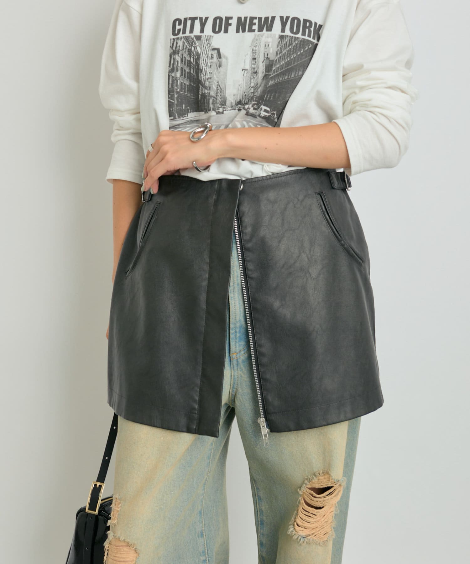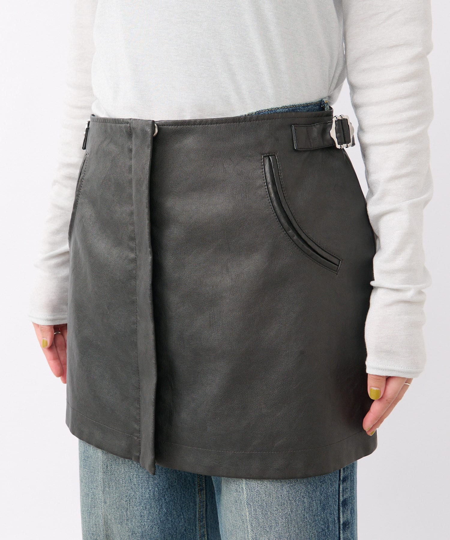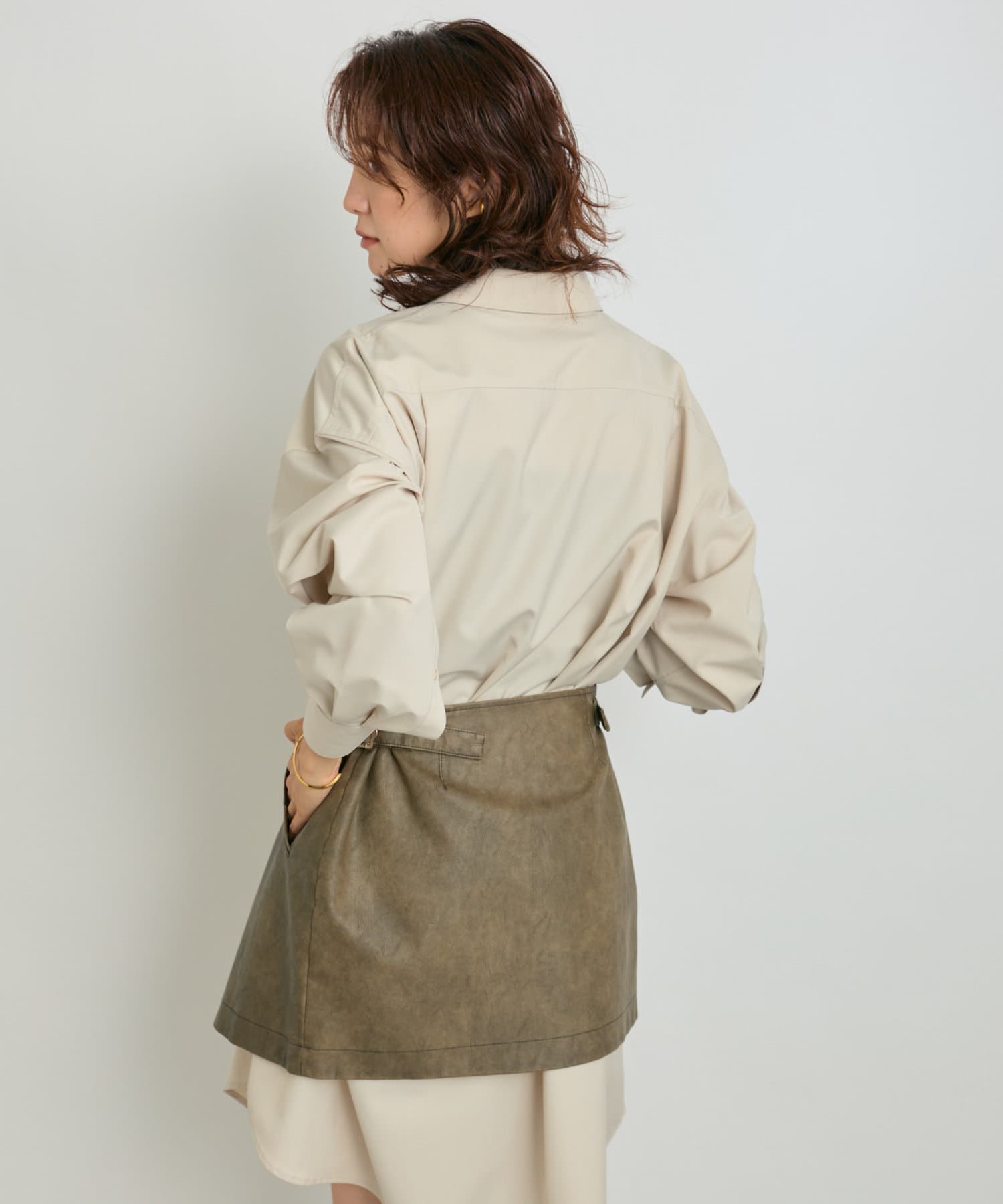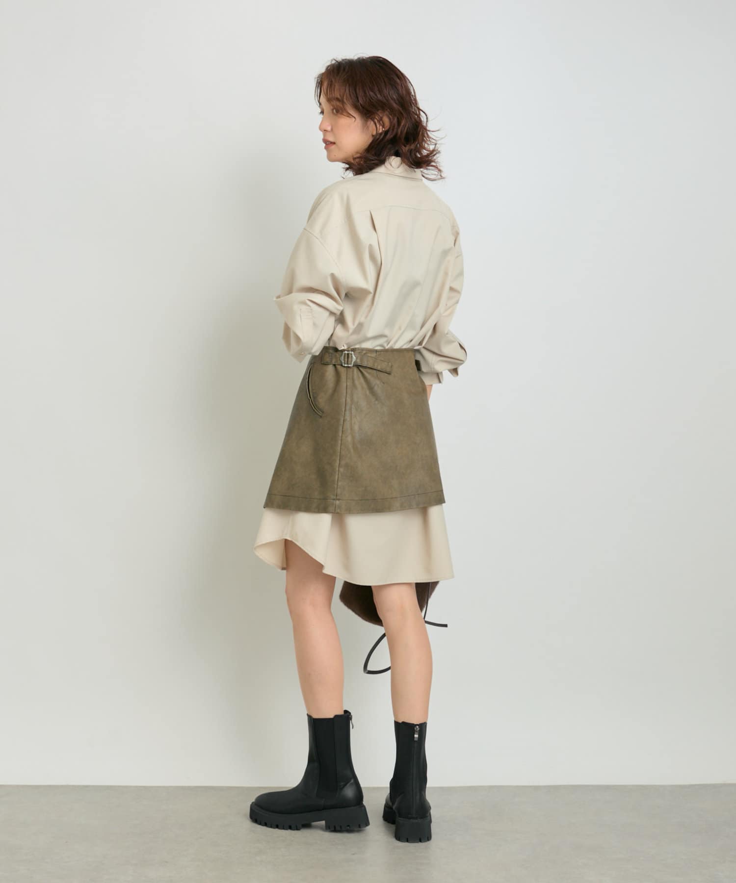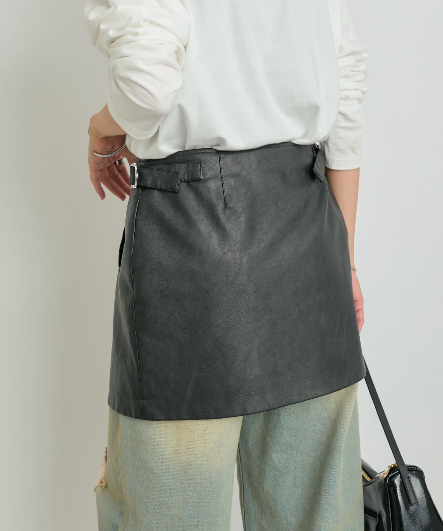 洗い加工をかけたフェイクレザーを使用したヴィンテージムードのあるオーバースカート。