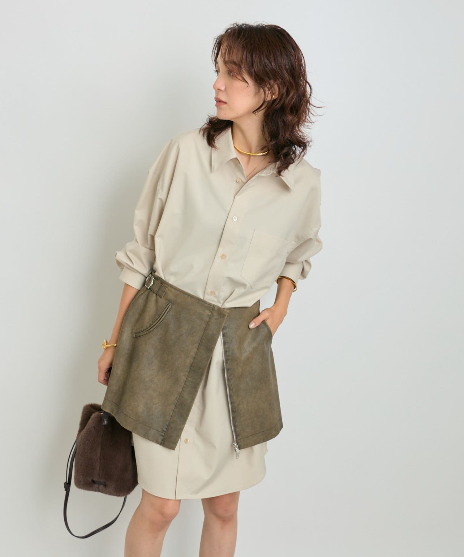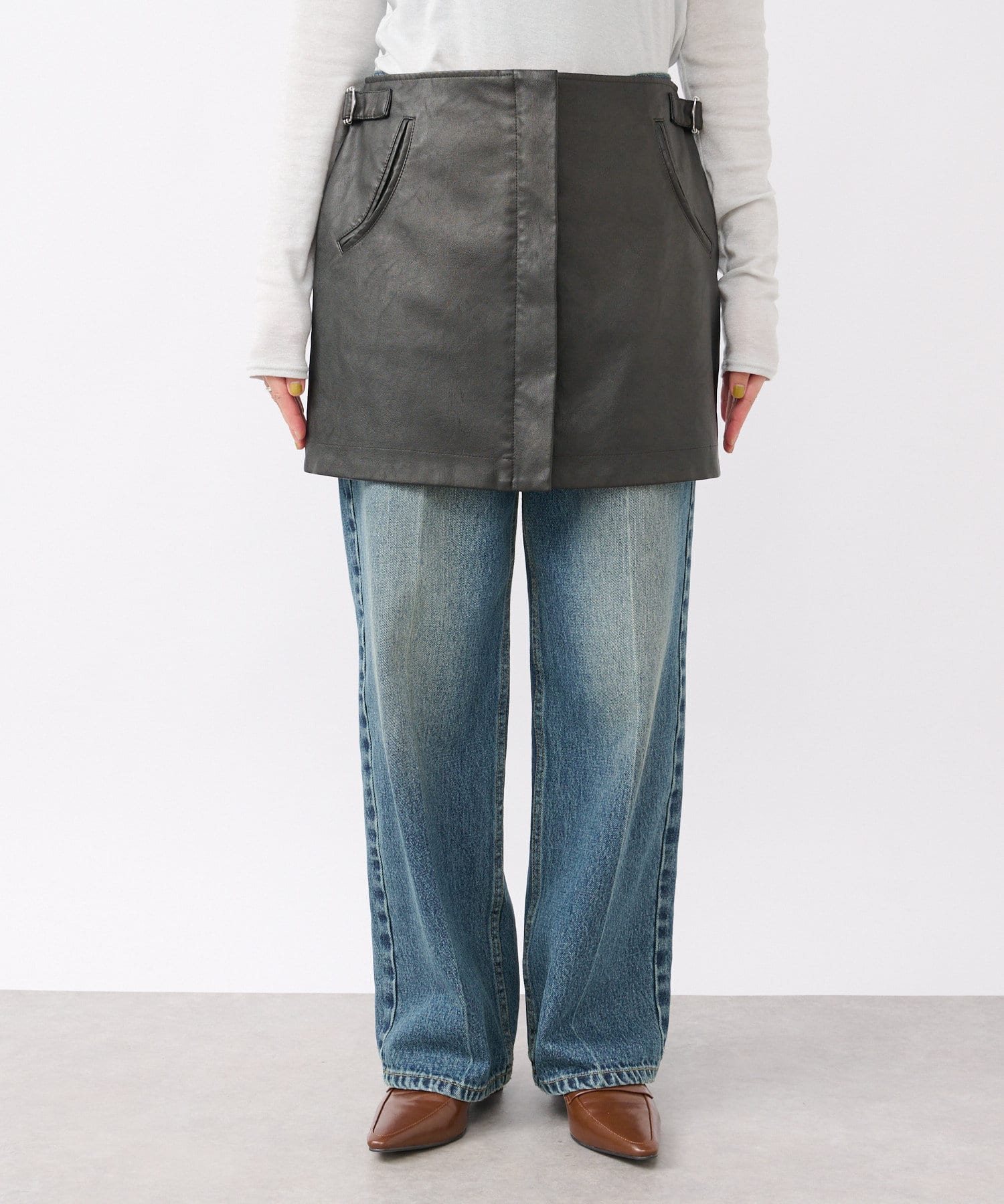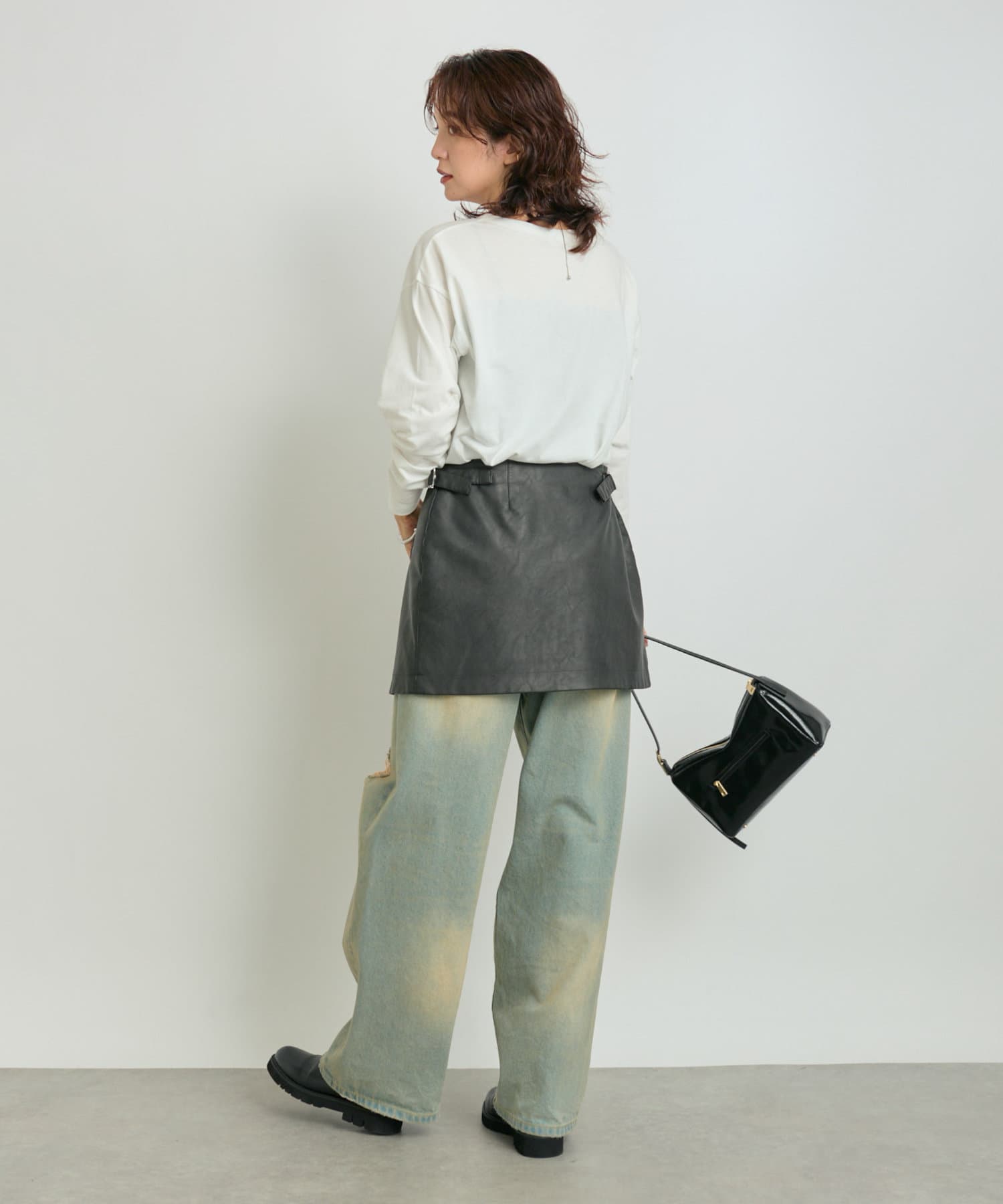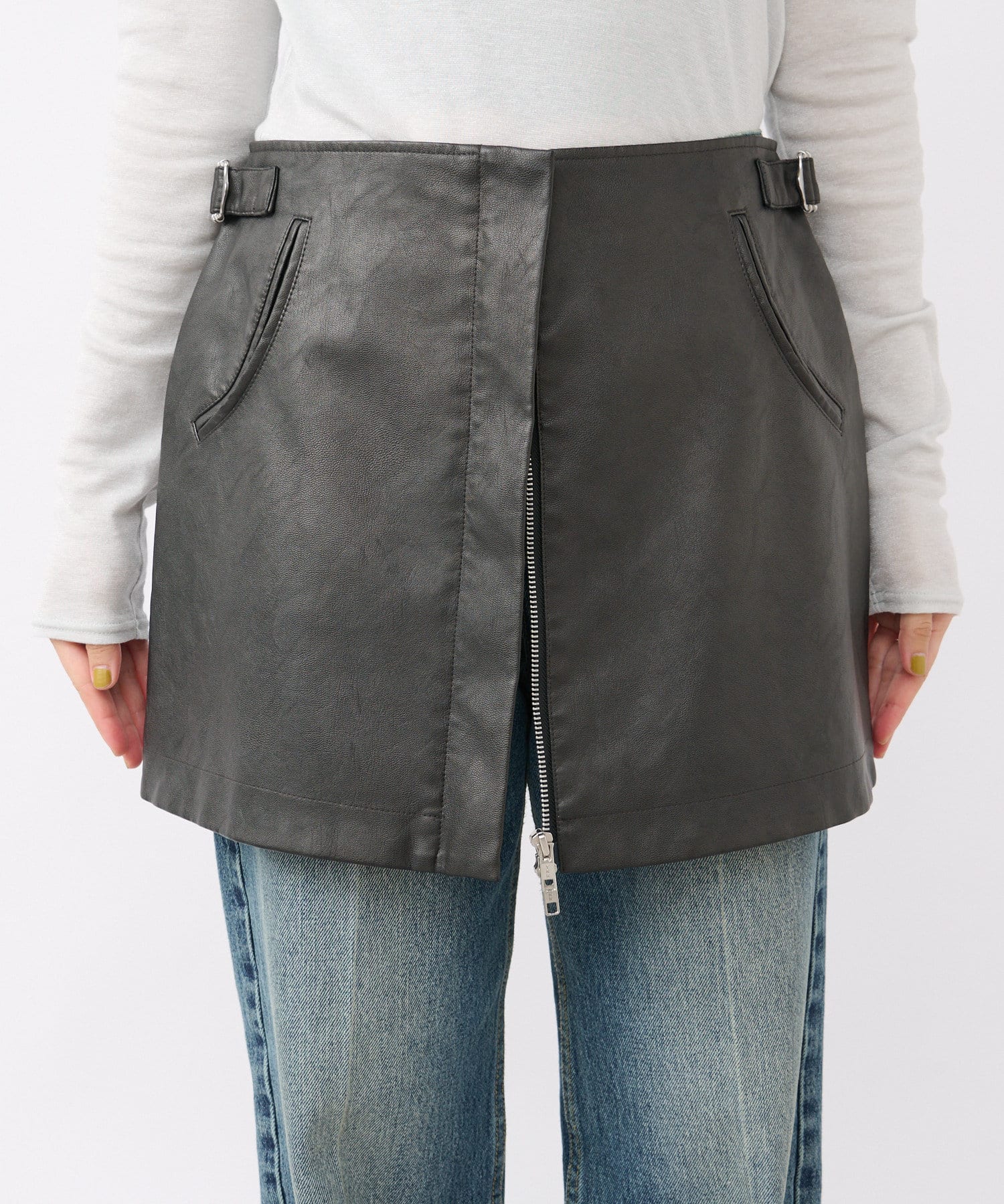 洗い加工をかけたフェイクレザーを使用したヴィンテージムードのあるオーバースカート。