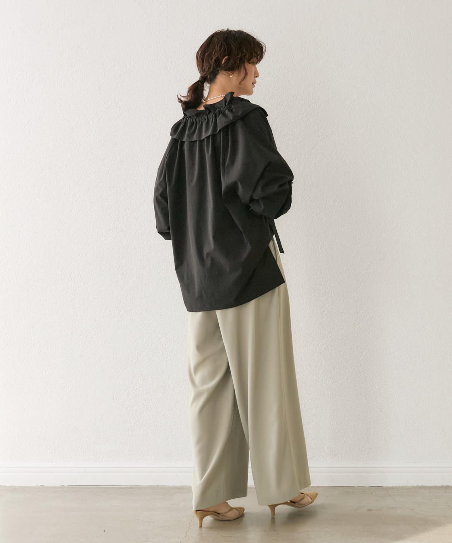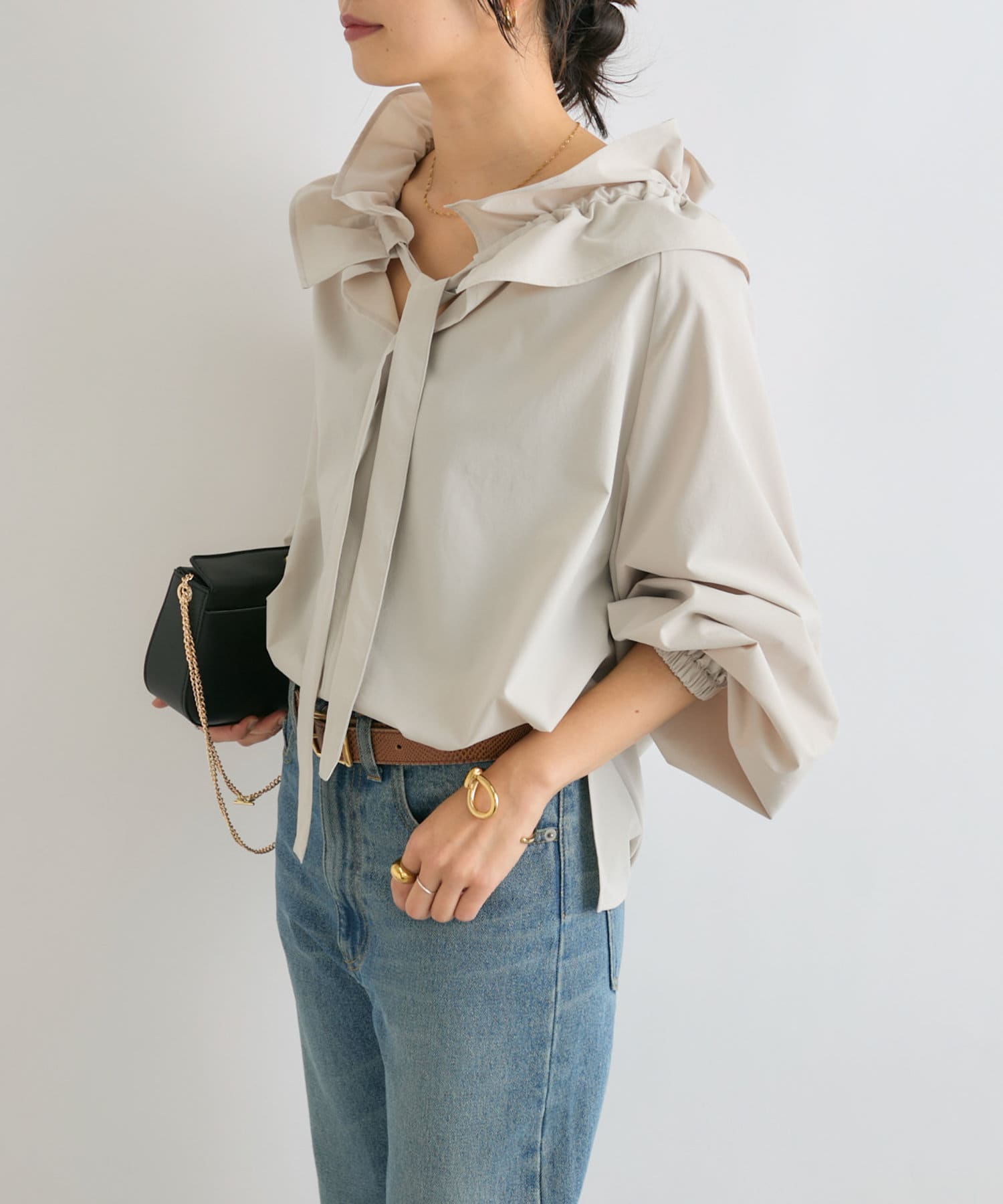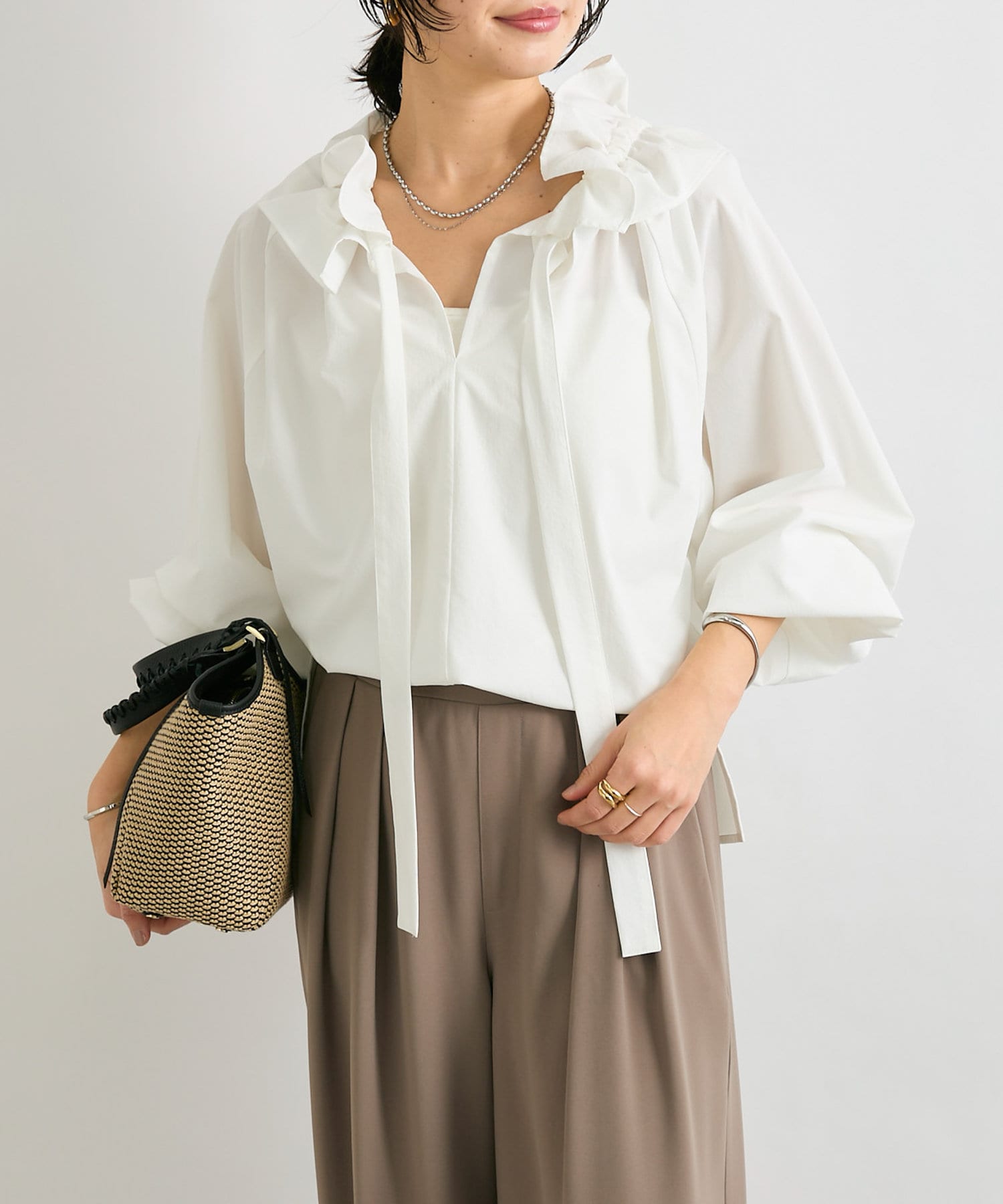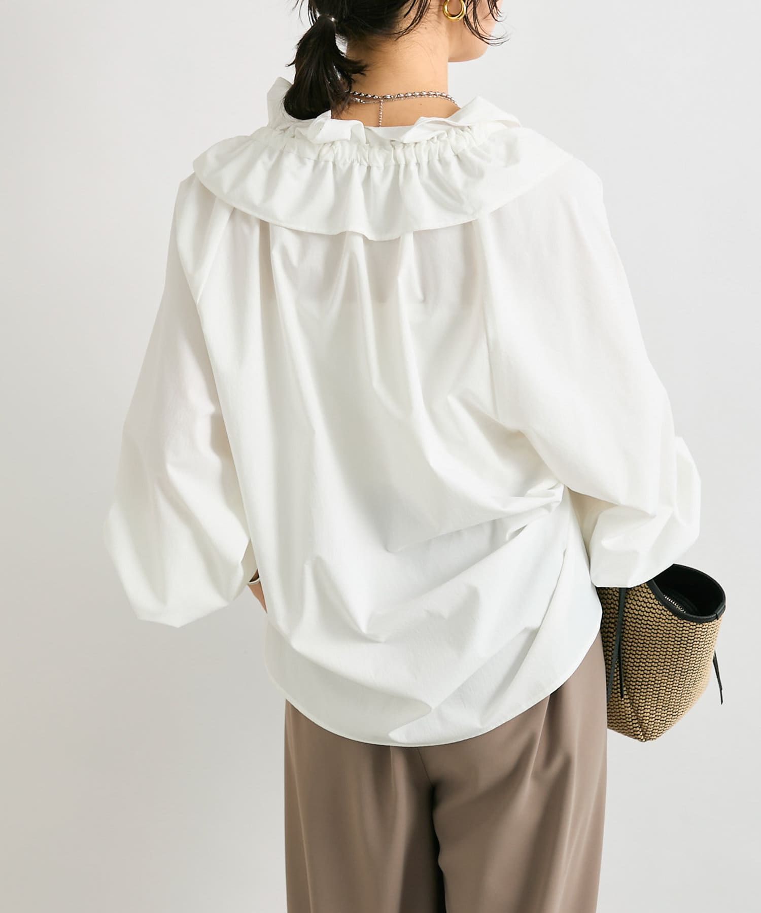 くしゅくしゅっとギャザーを寄せてフェミニンに仕上げたり、ギャザーを寄せずにフラットな衿にしてみたりと自由自在。