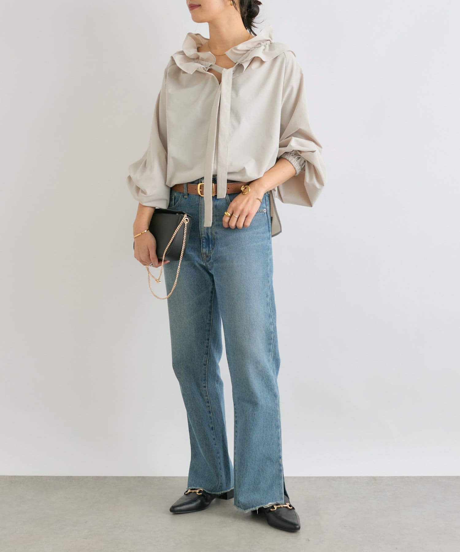 トレンド感のあるボリュームスリーブ。軽い素材感でバランスよく着て頂けます。