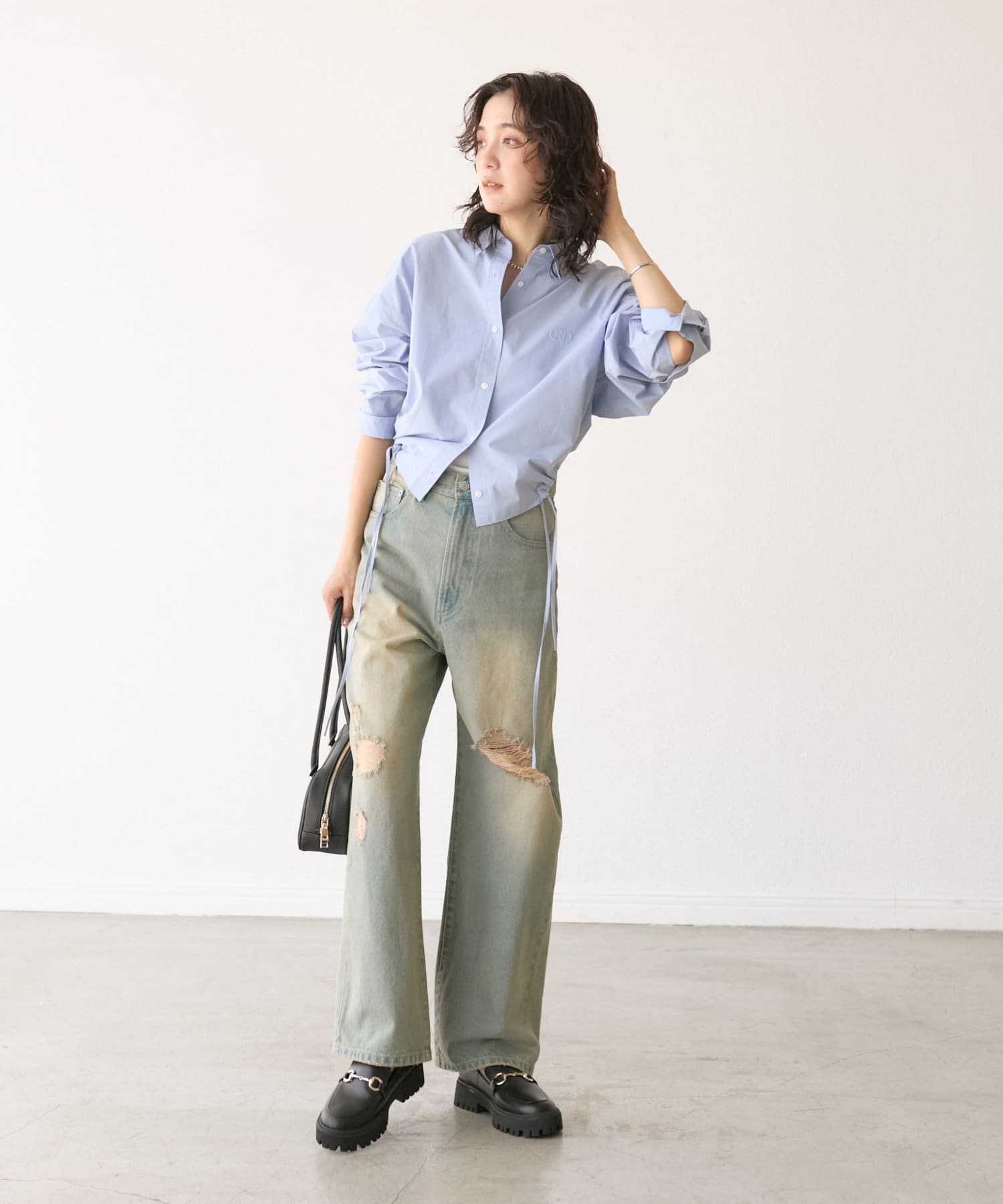裾をグッと絞って裾のボタンを2~3個はずすと、チラッと肌見せをするスタイルもおすすめです。