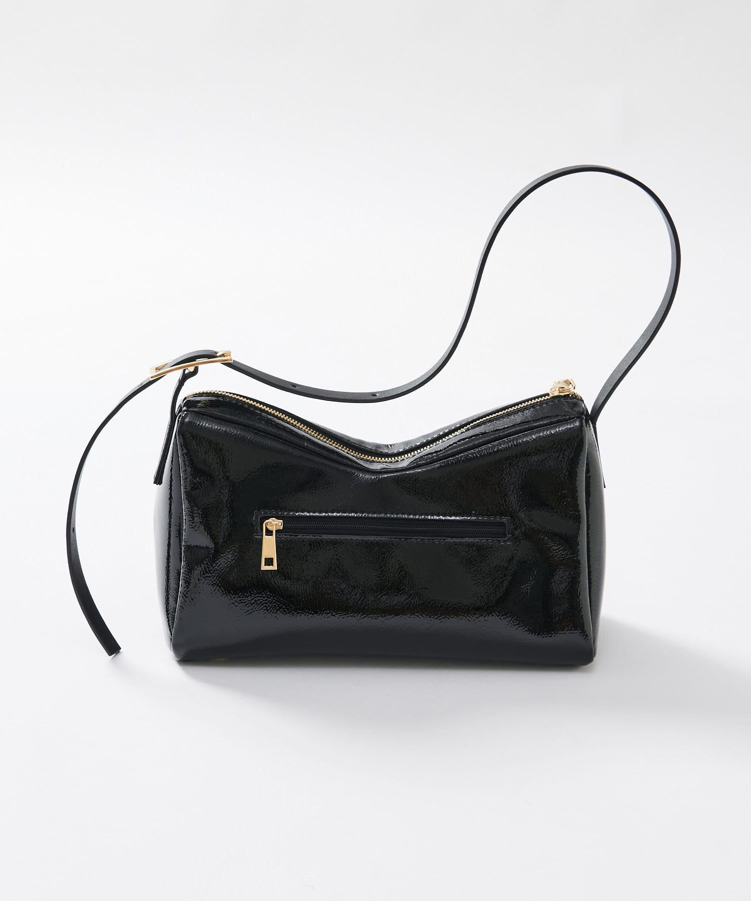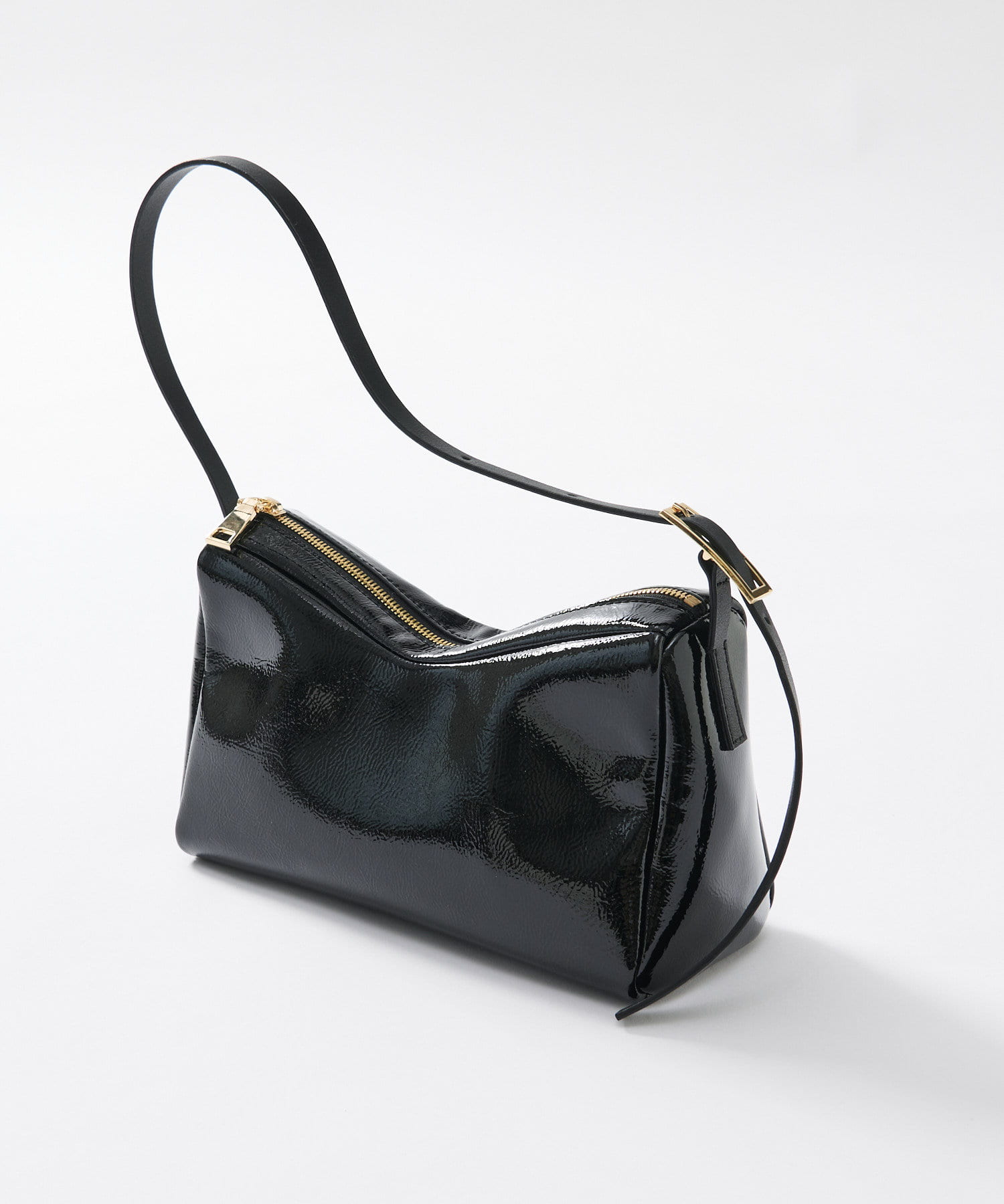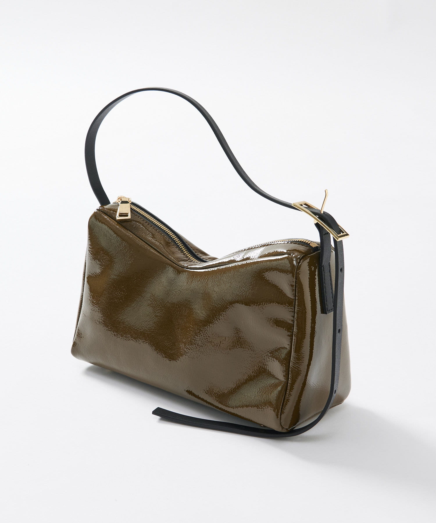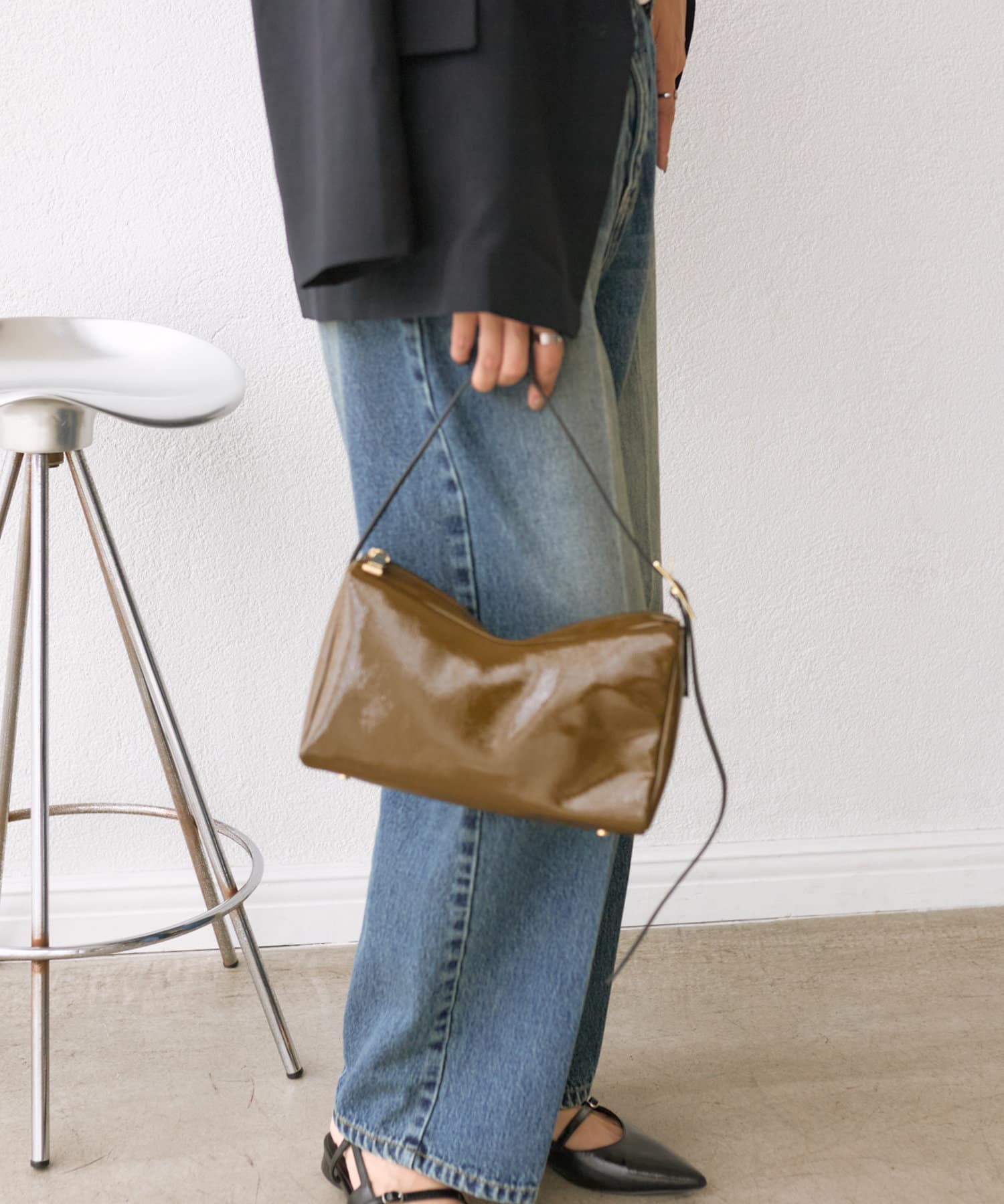スタイリングのアクセントになる光沢感のあるバッグ。
