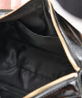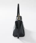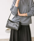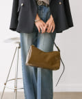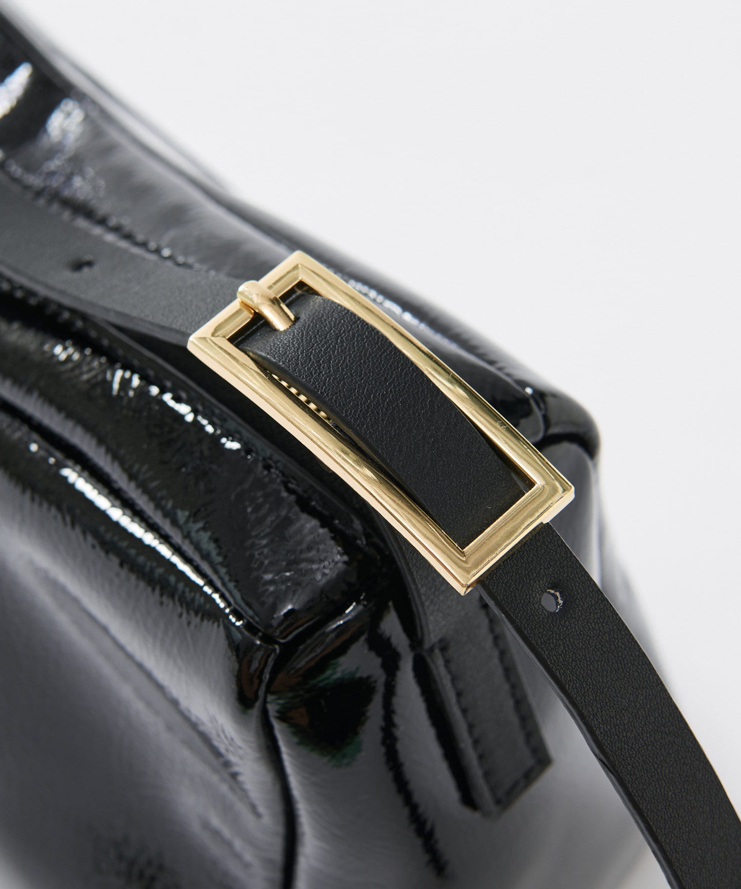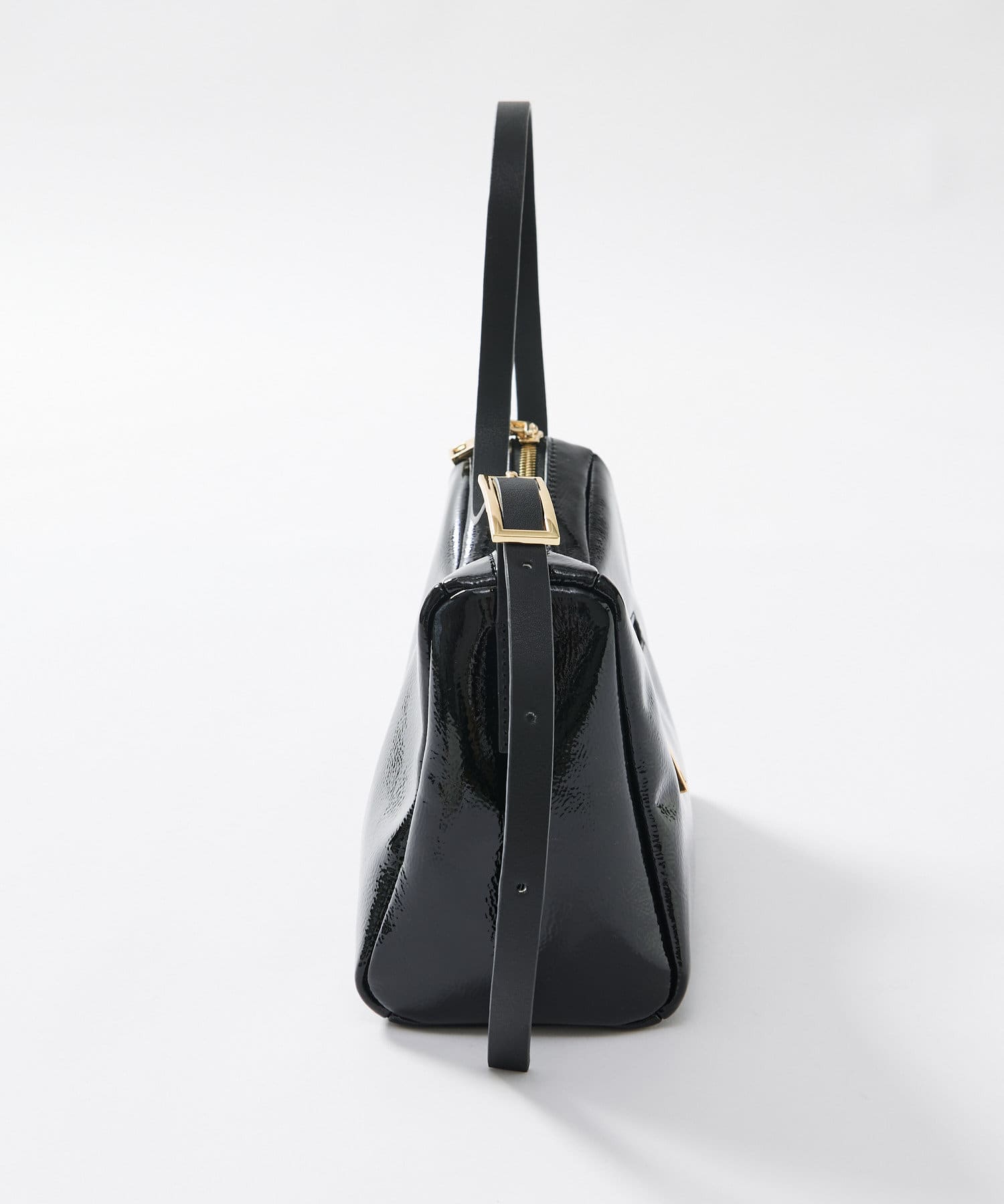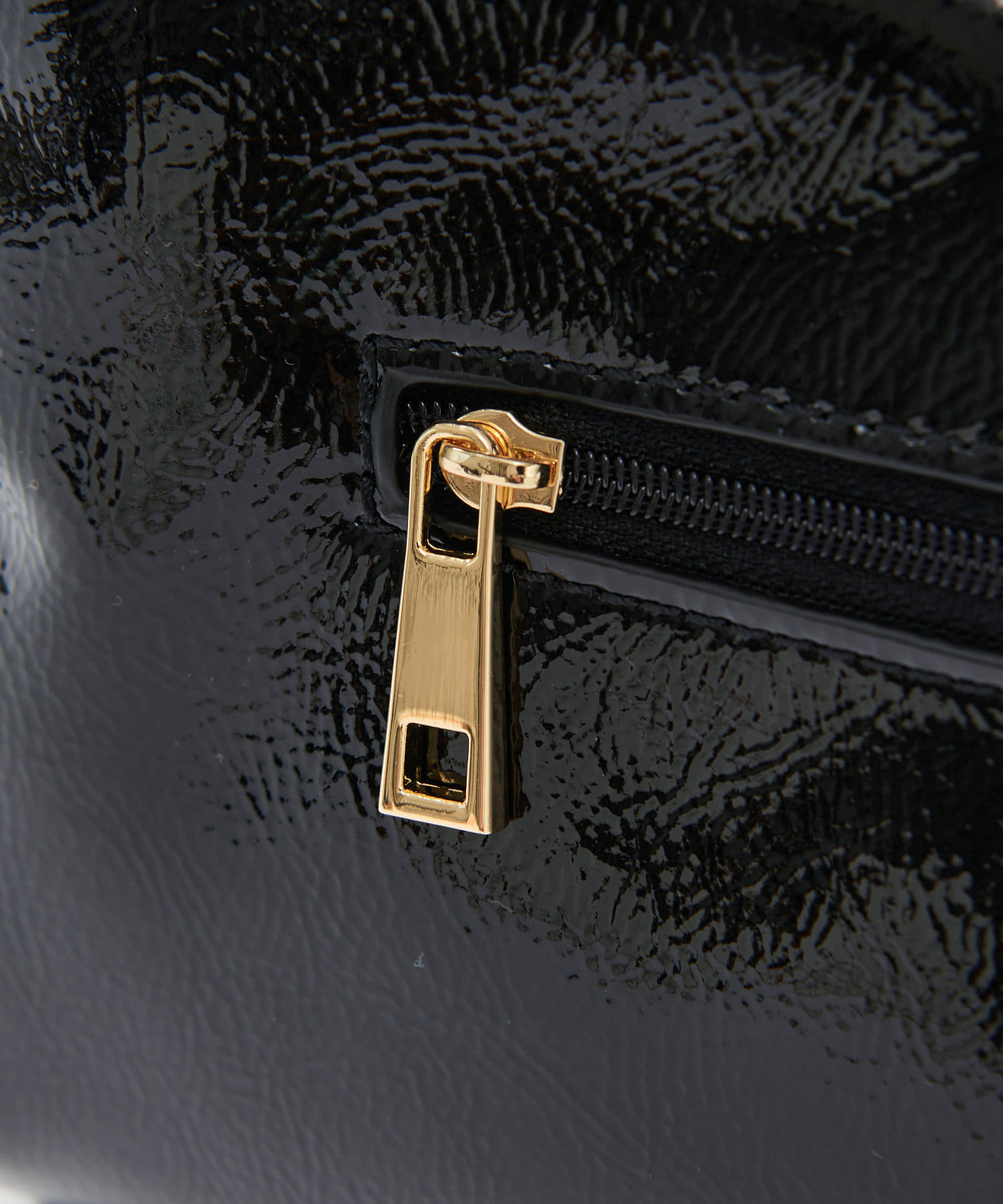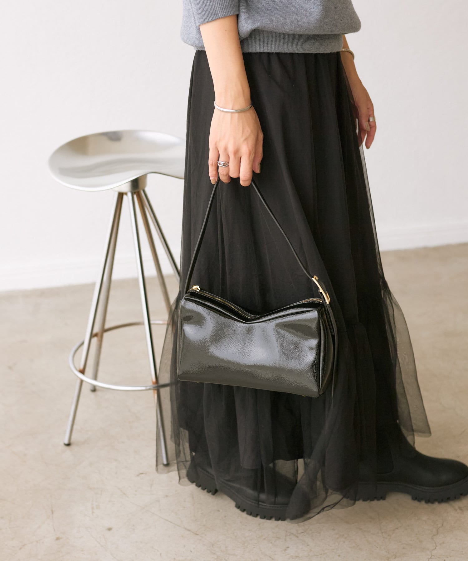 スタイリングのアクセントになる光沢感のあるバッグ。