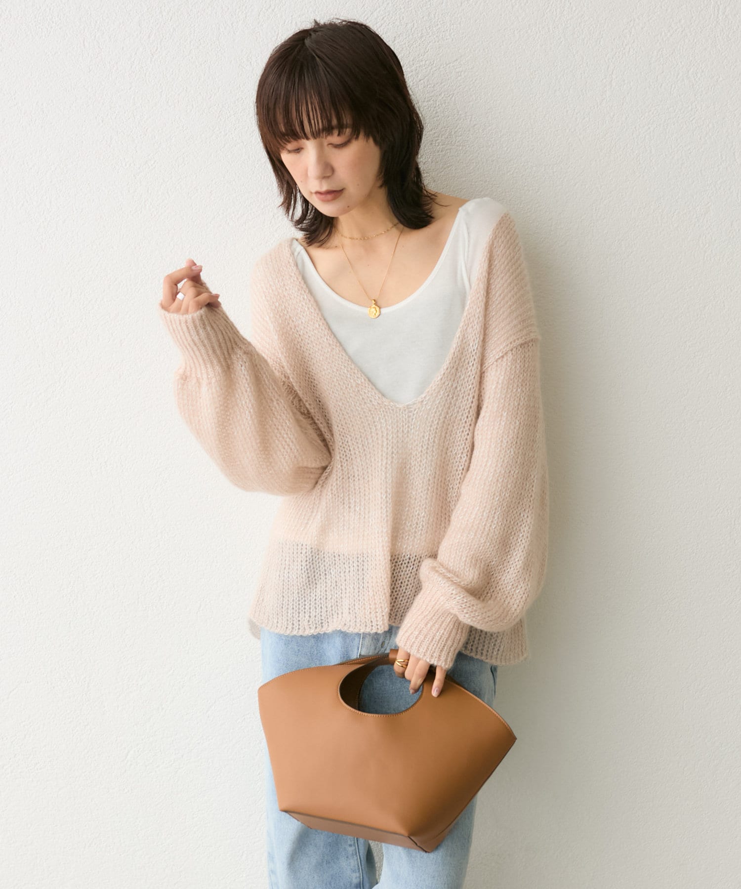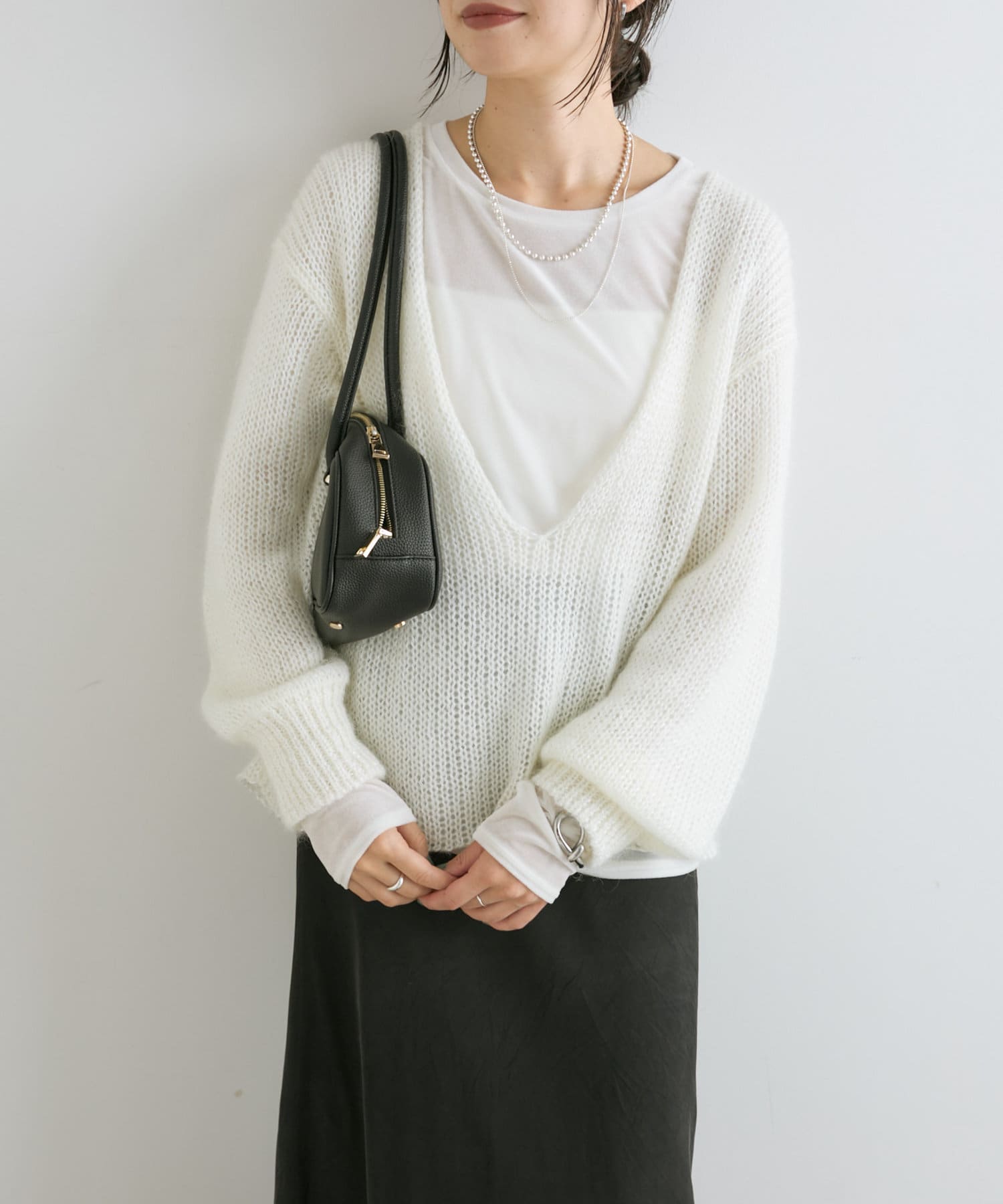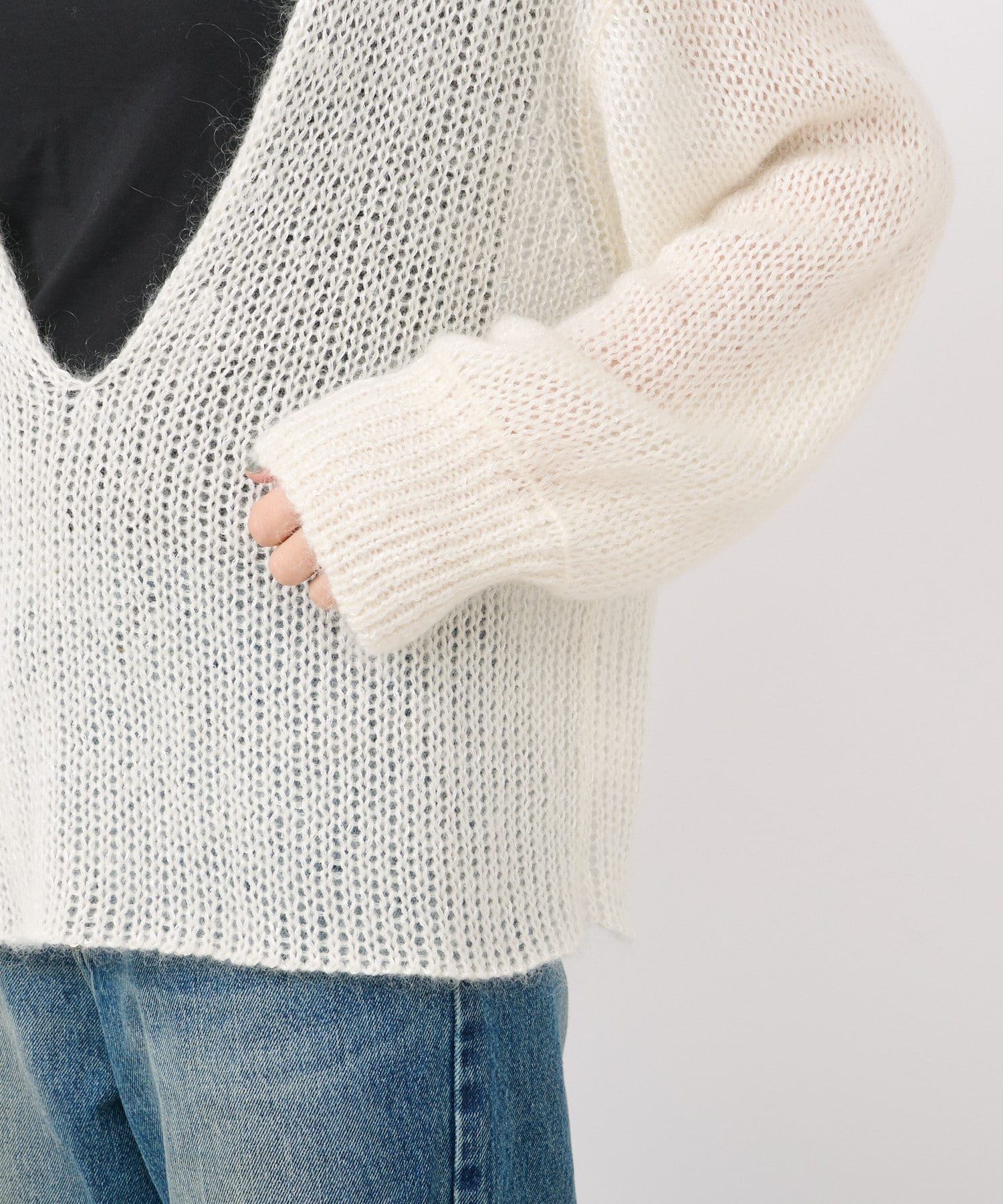 ほんのり甘さのあるへアリーな編地とプランジネックが女性らしく、シーズンムードもたっぷり。