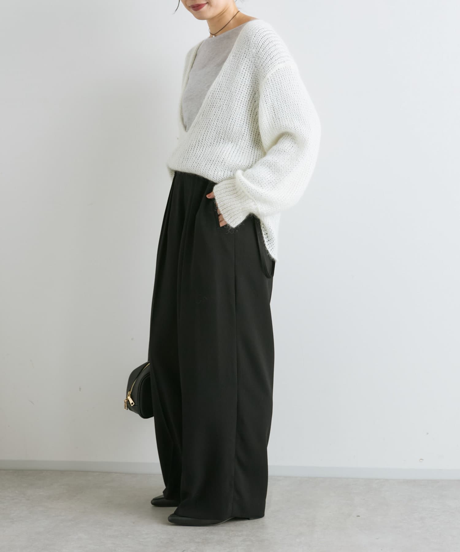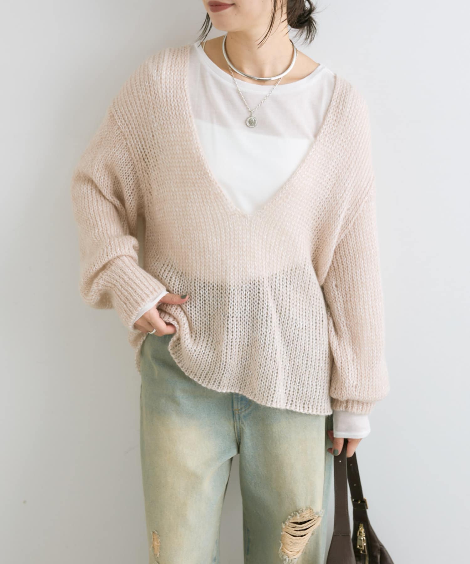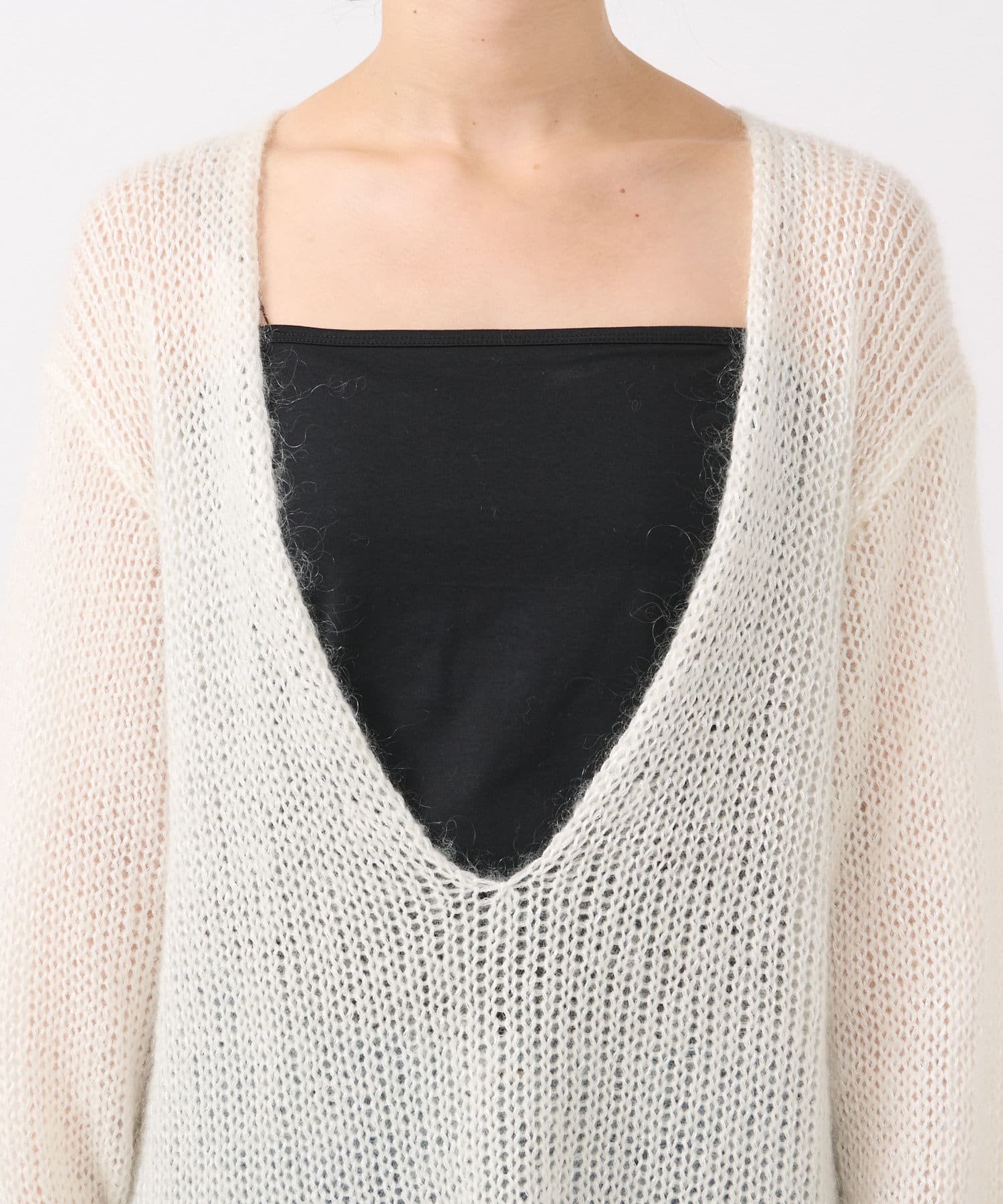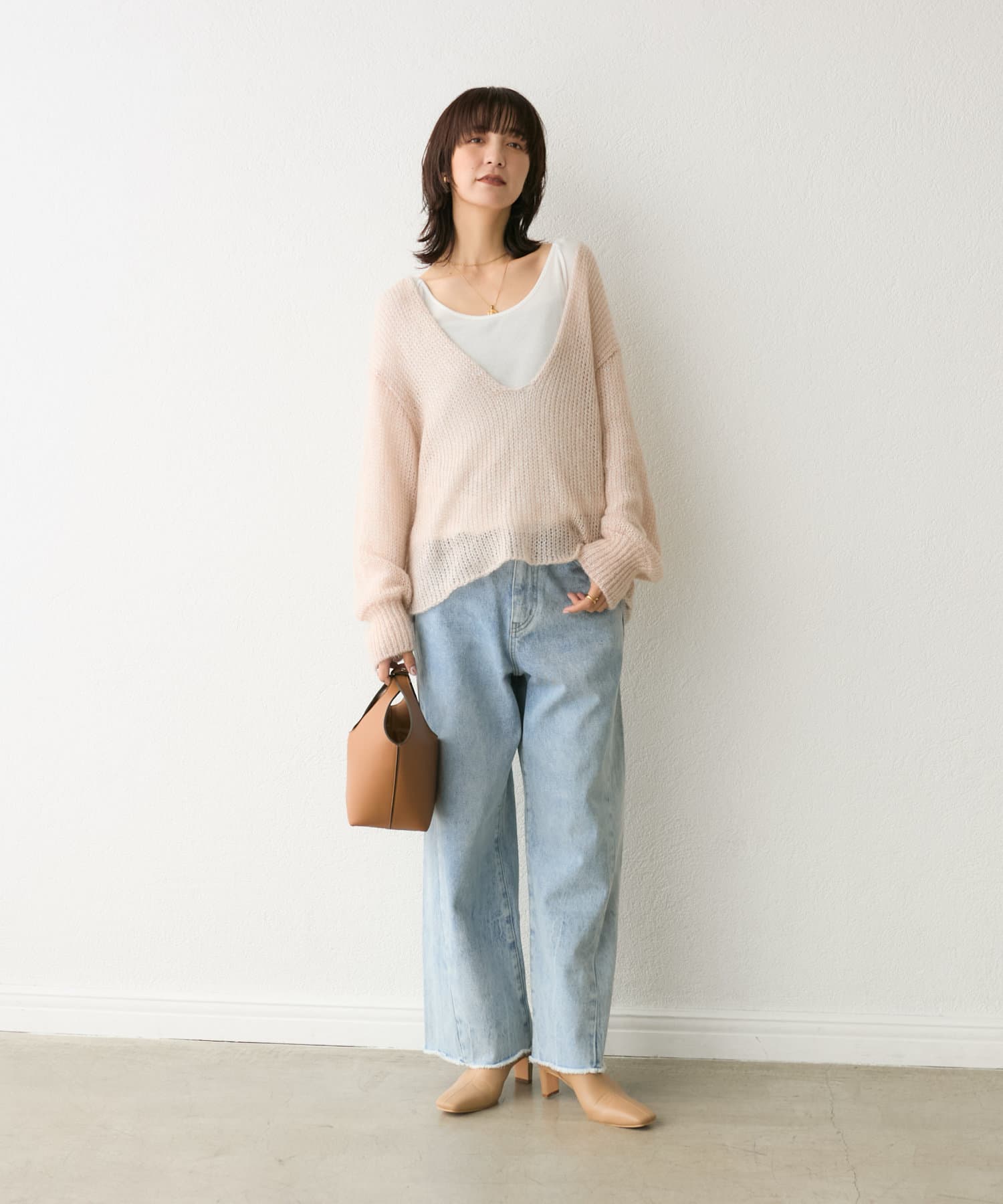 ほんのり甘さのあるへアリーな編地とプランジネックが女性らしく、シーズンムードもたっぷり。