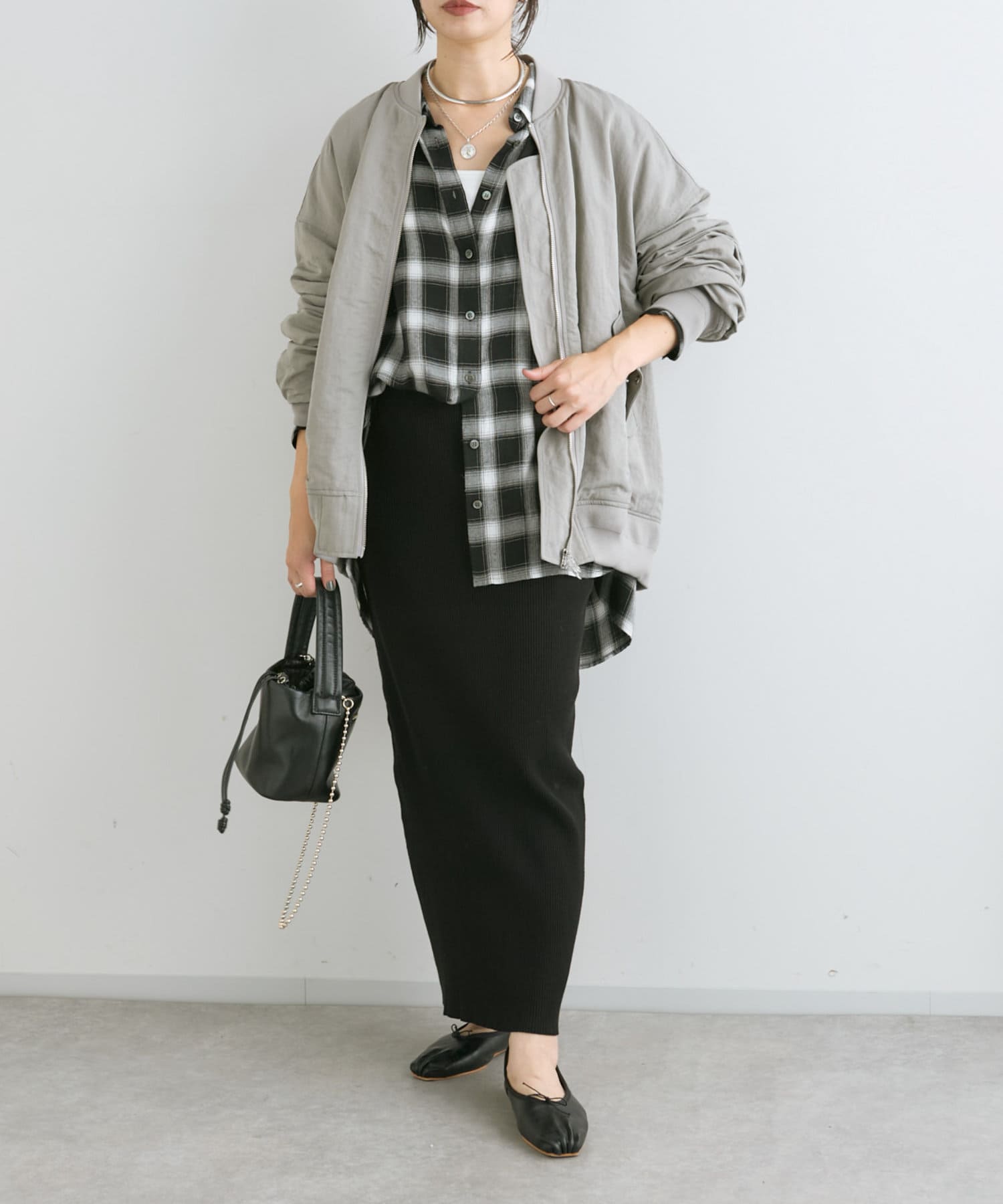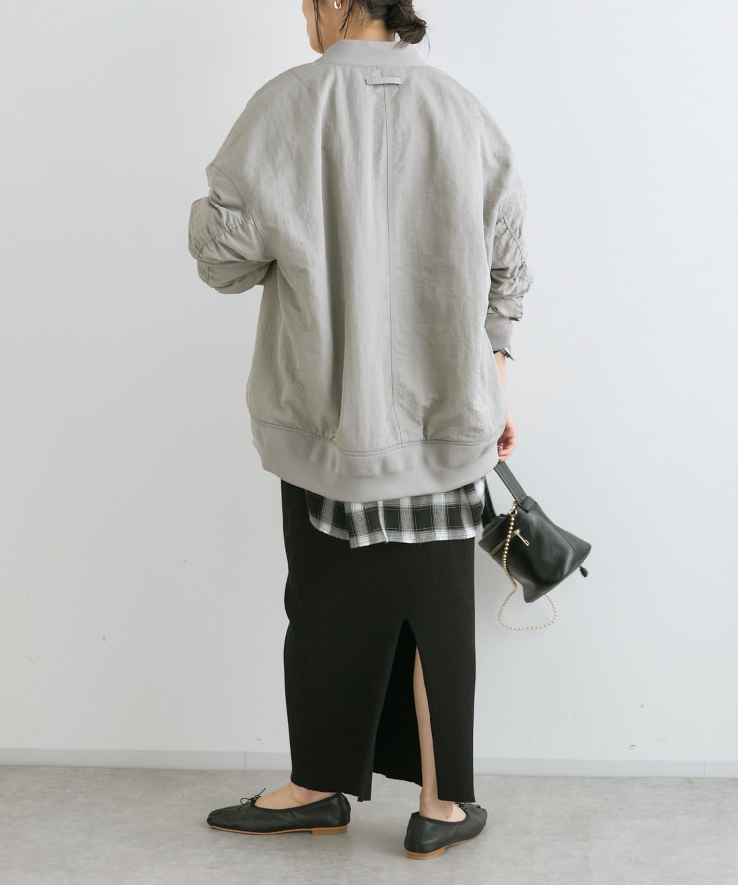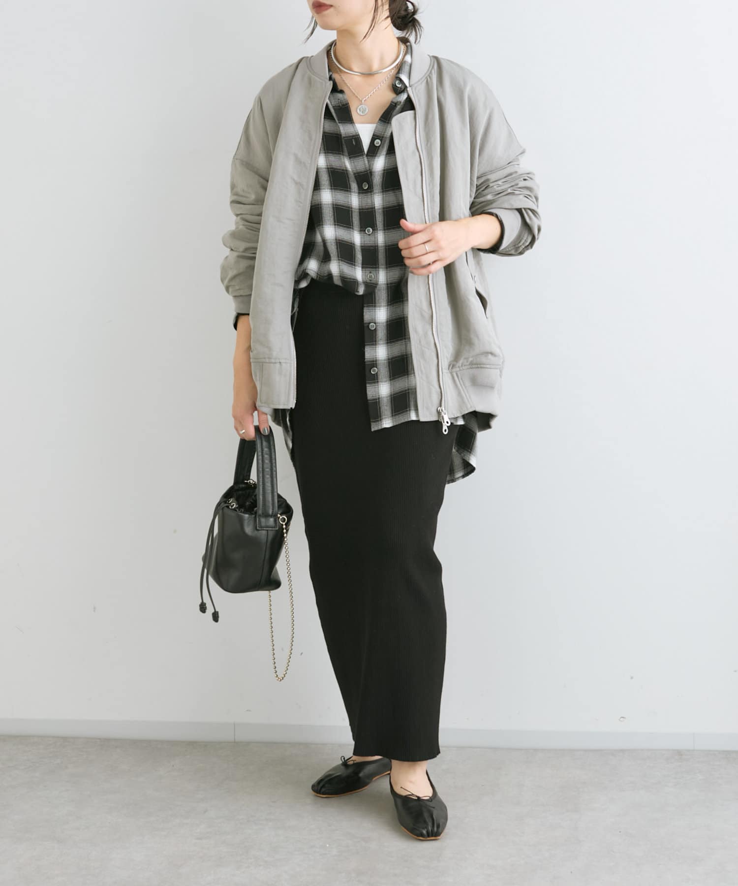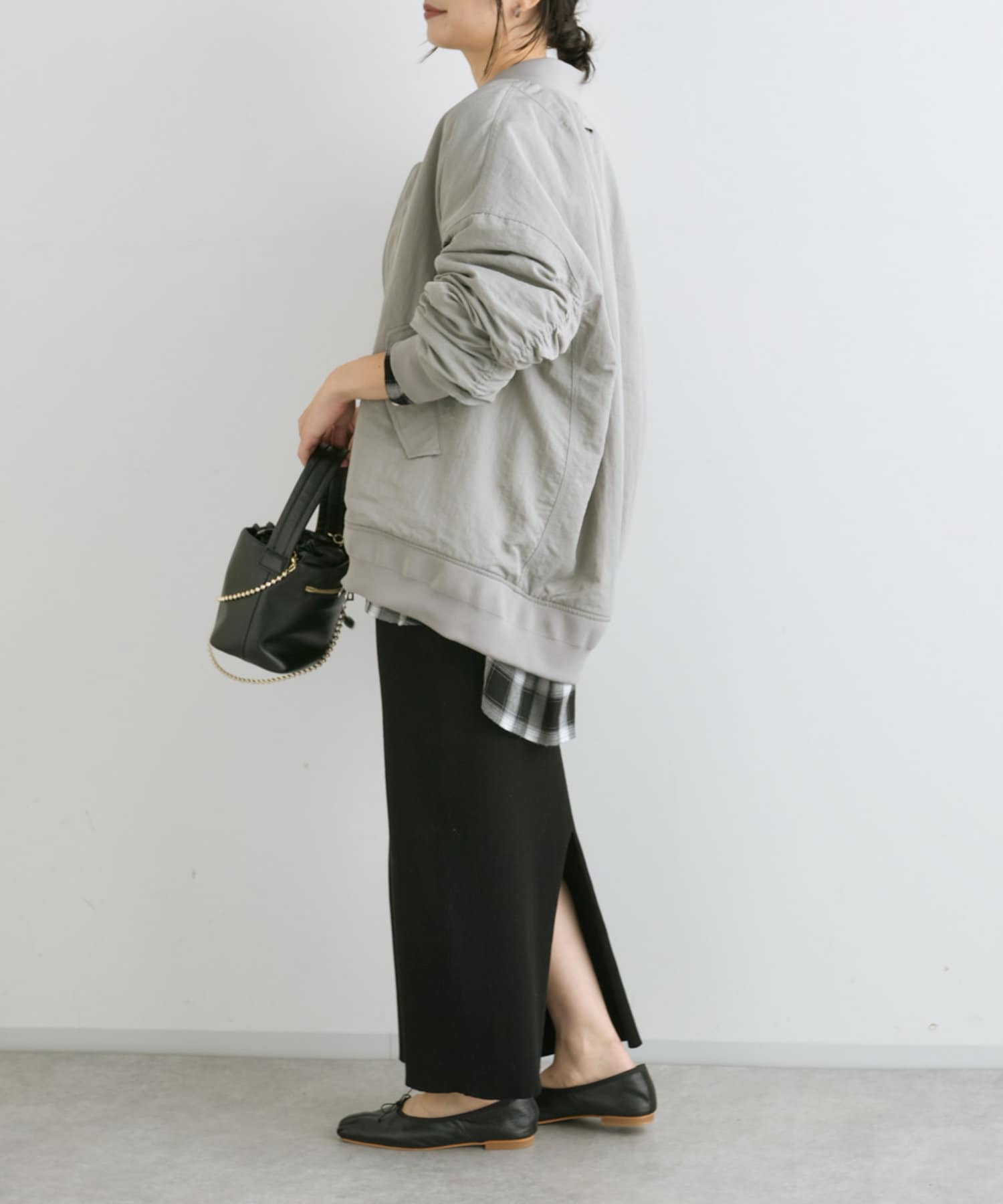 丸みを出したフォルムなので、ボトムはタイトにまとめるとメリハリがついてバランスよく着て頂けます。