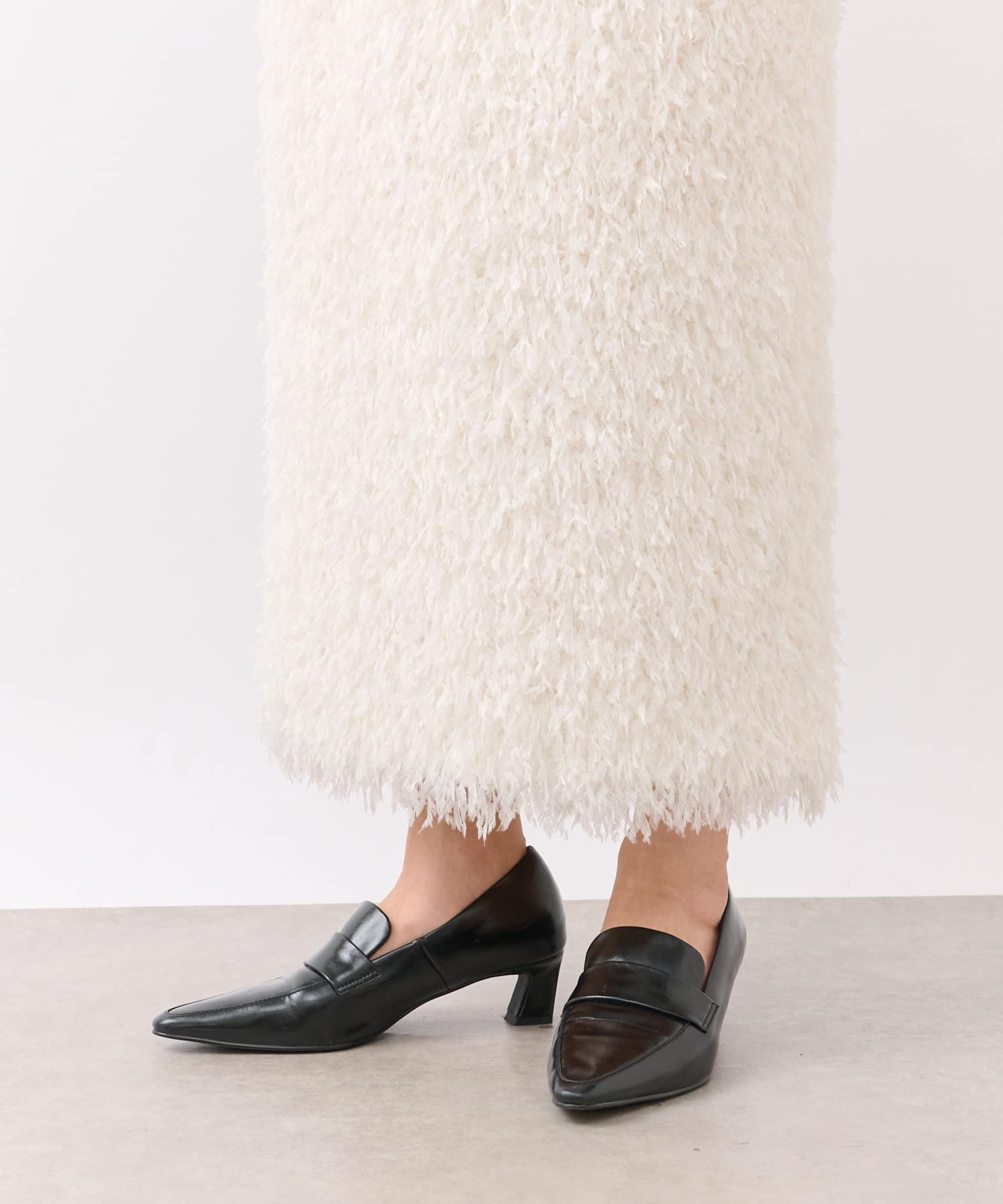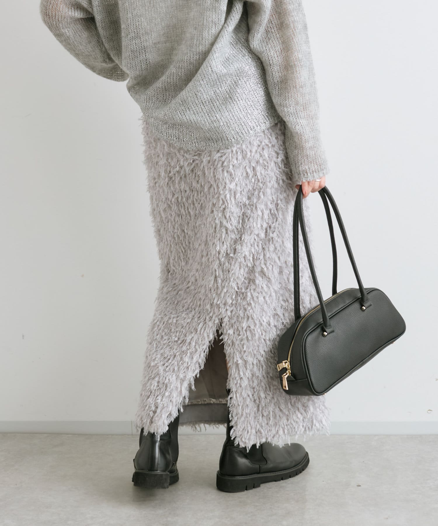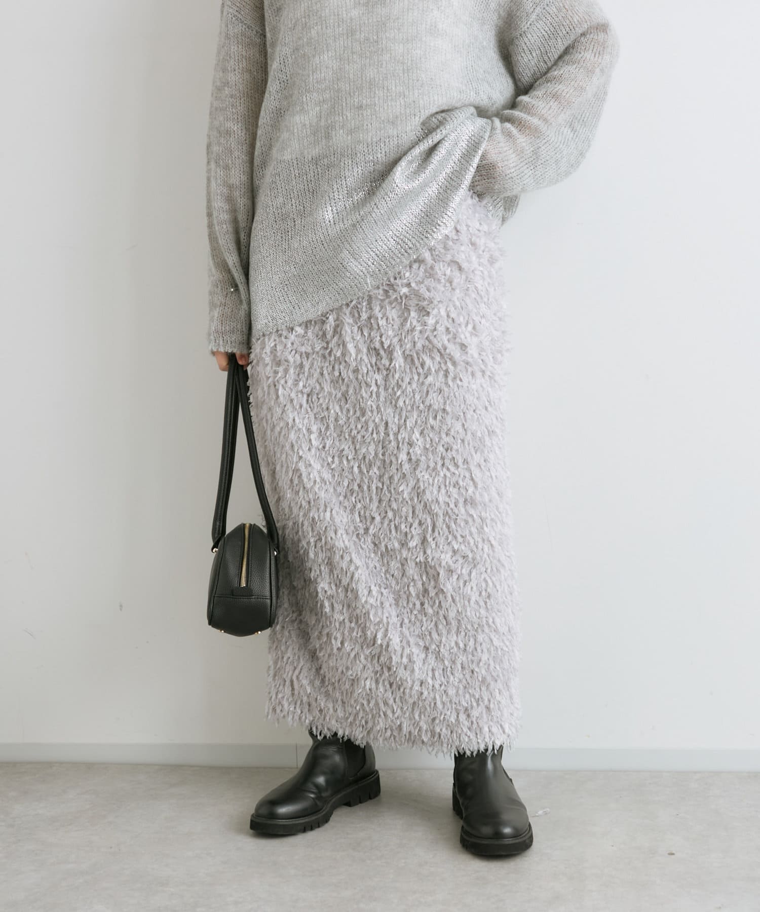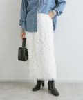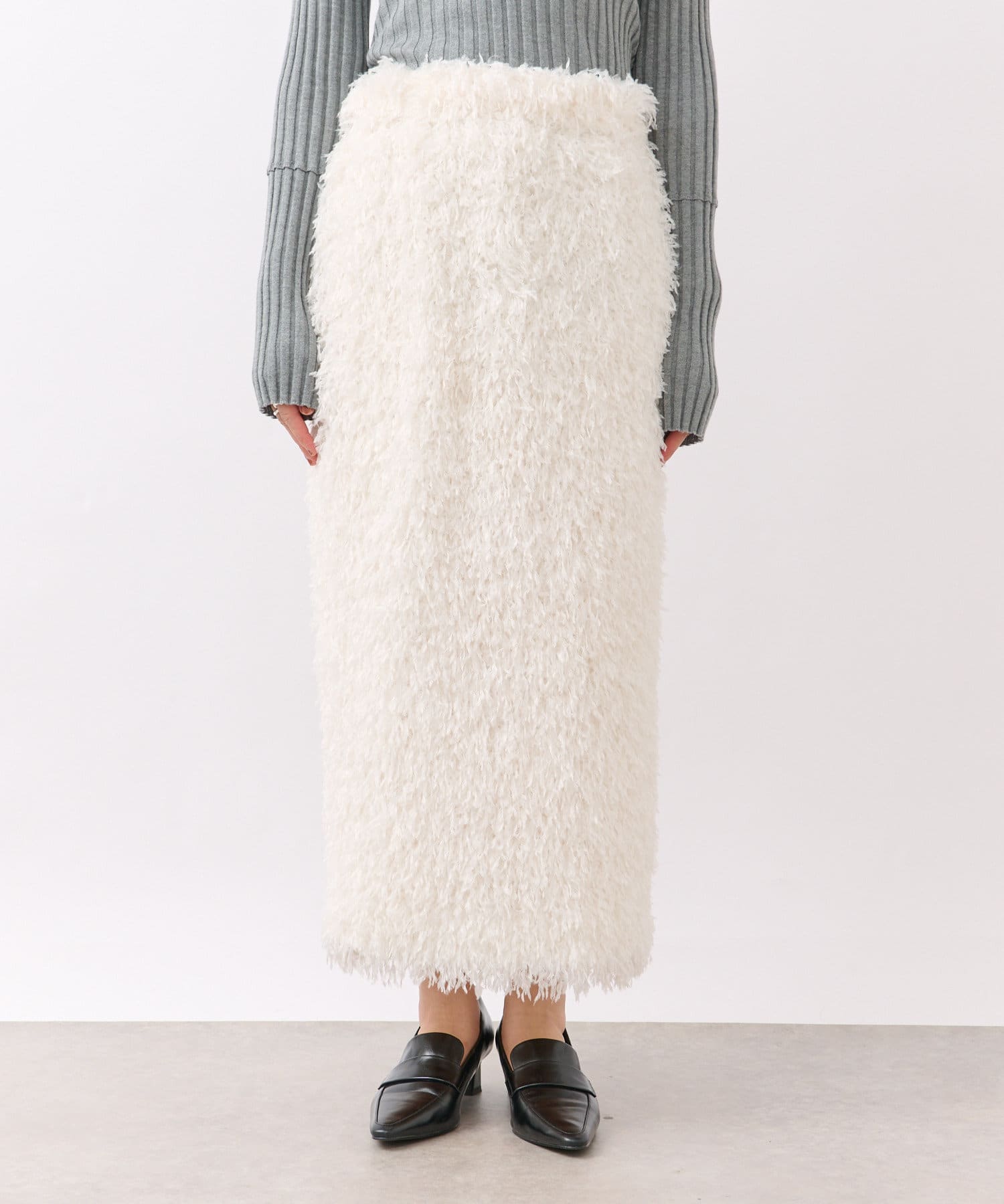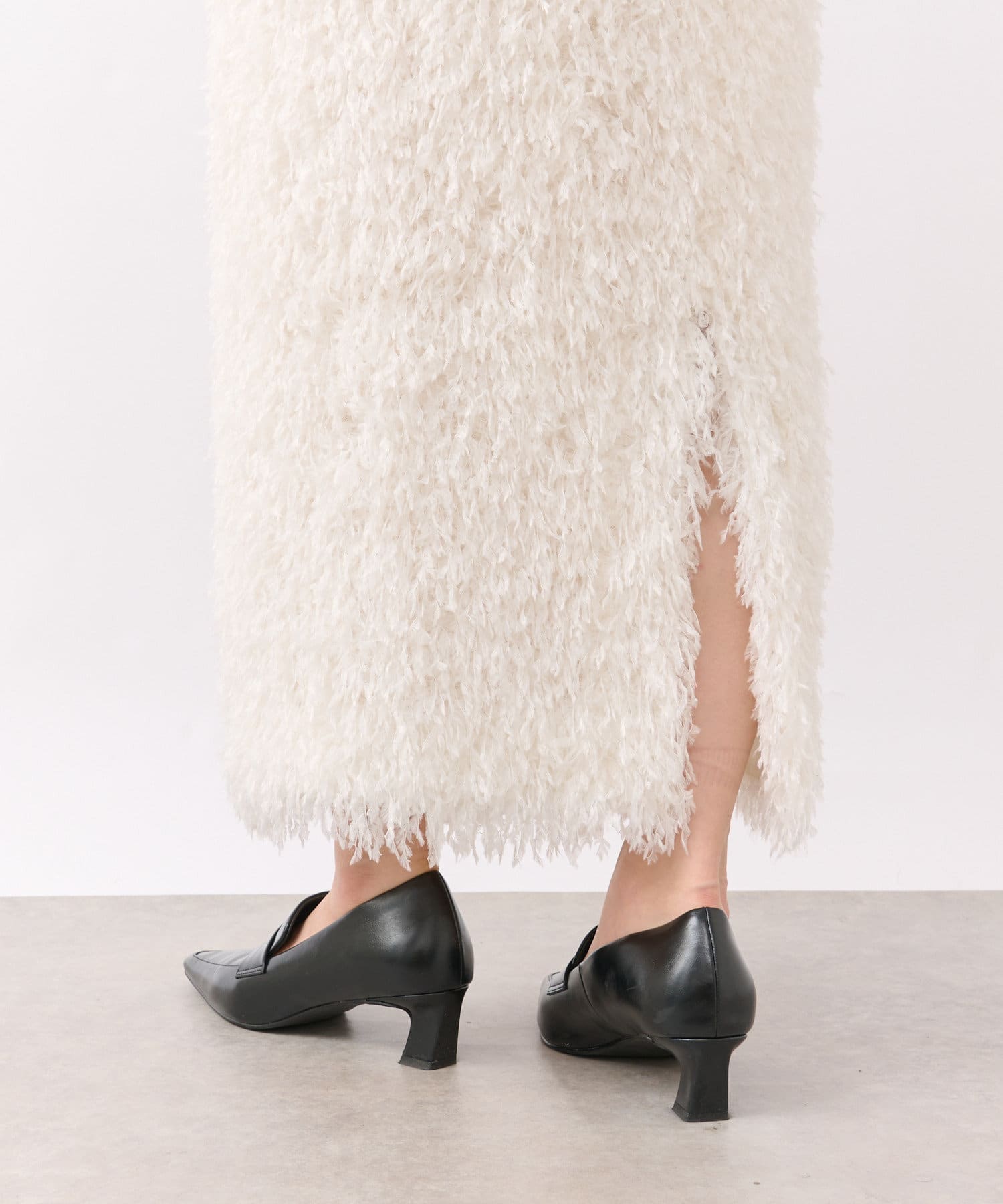 フェザーを思わせるふわふわのシャギーが華やかなタイトスカート。