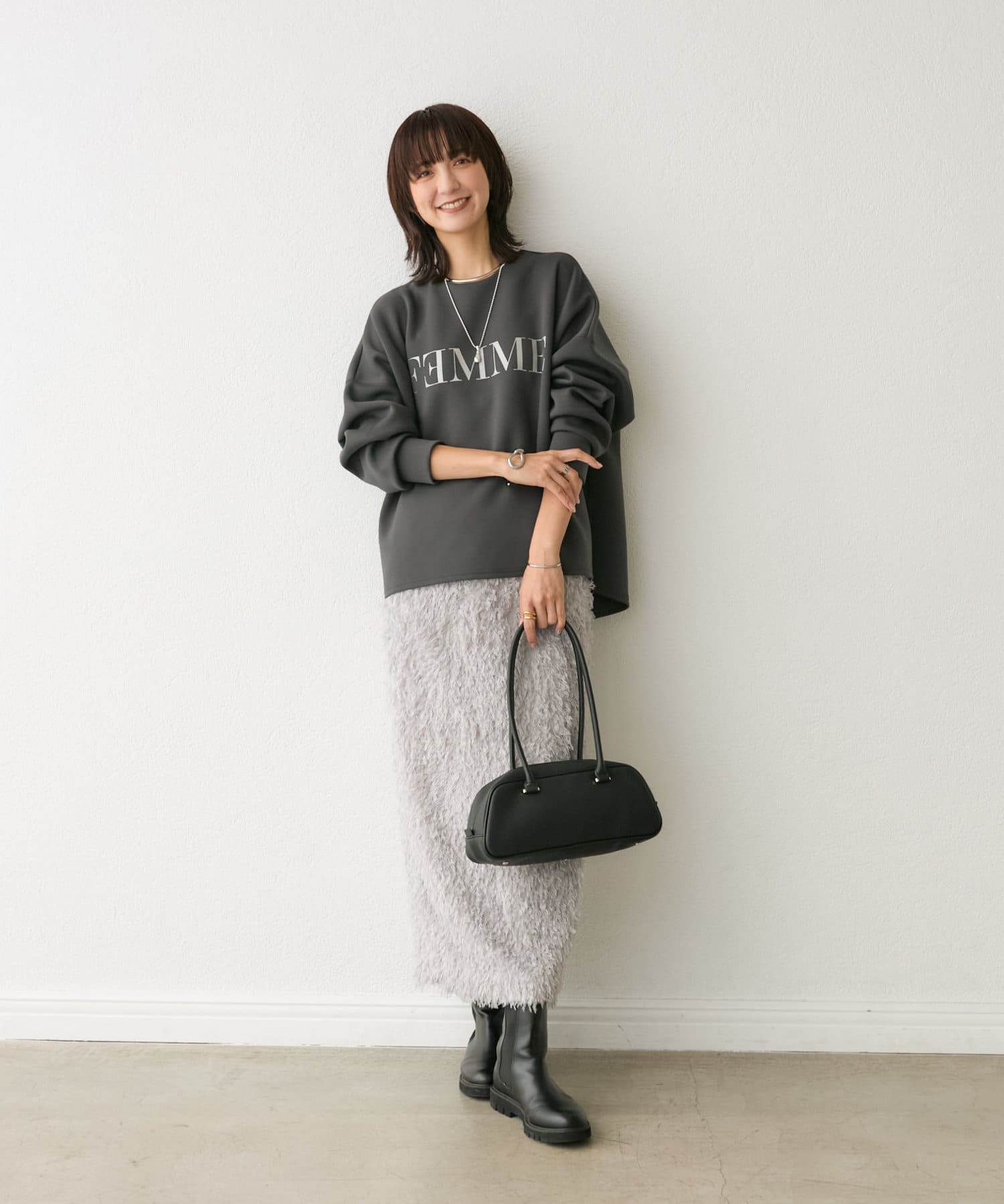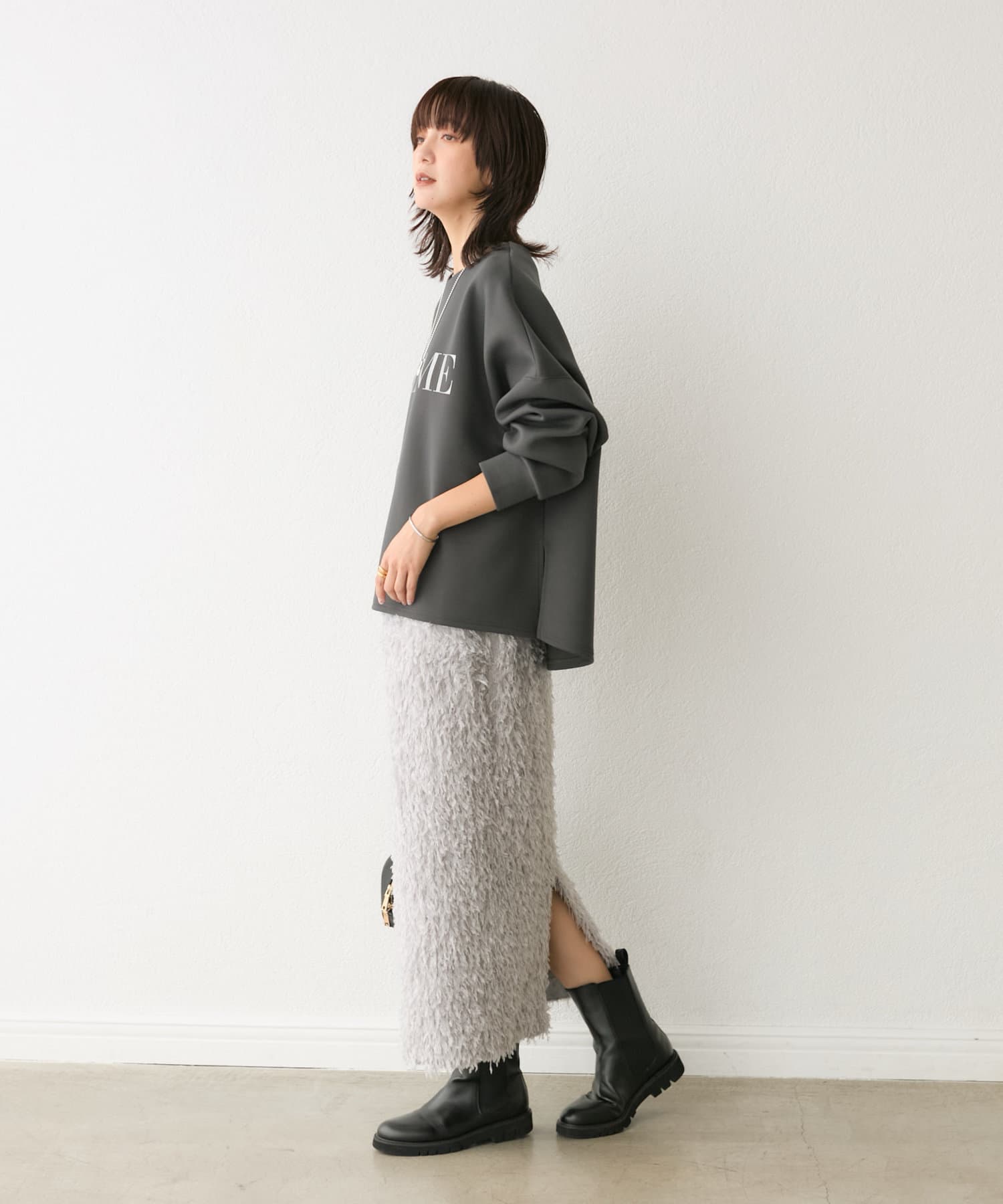 インパクト抜群なアイテムのため、スエットやコンパクトニットを合わせるとこなれたバランスに。