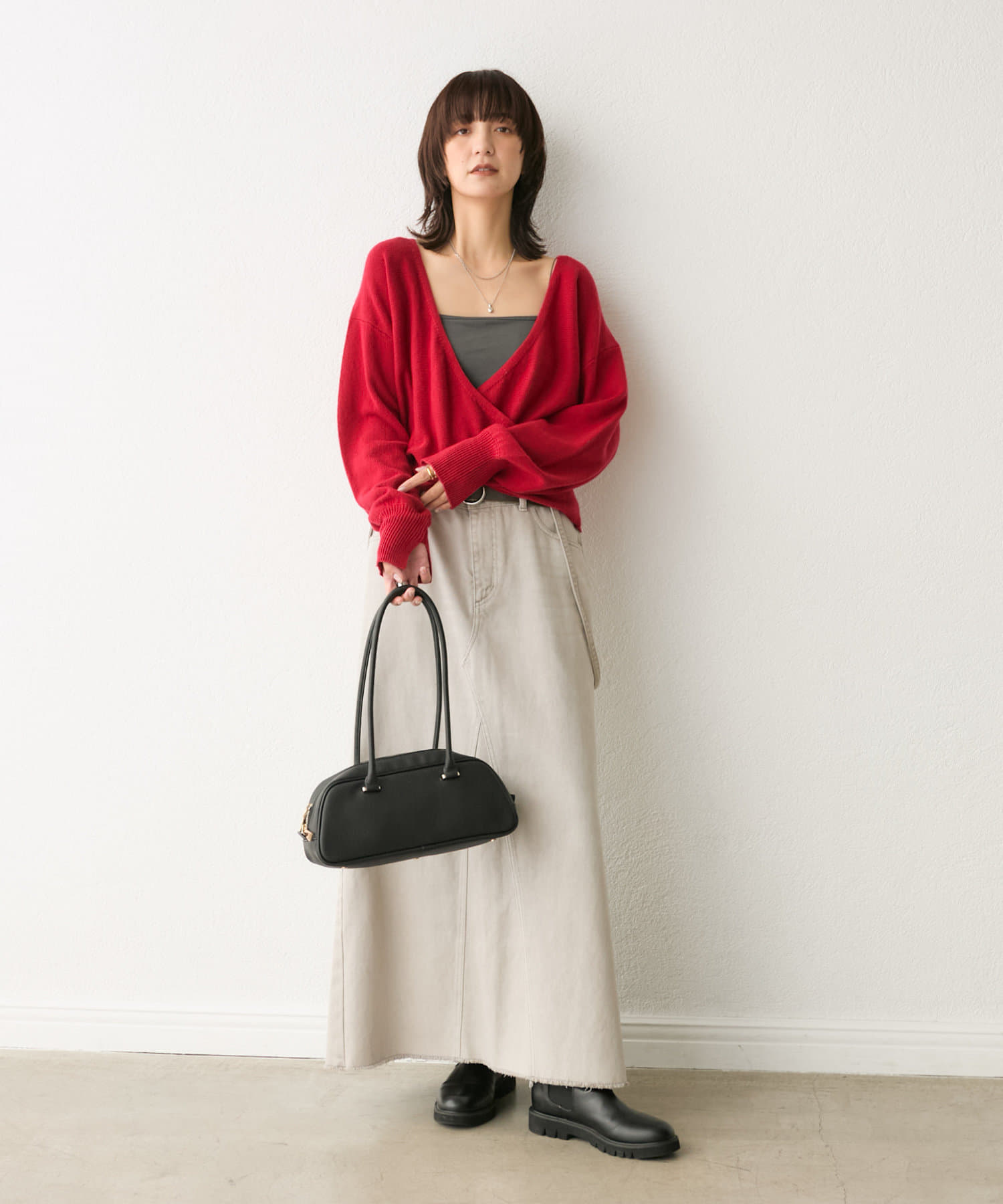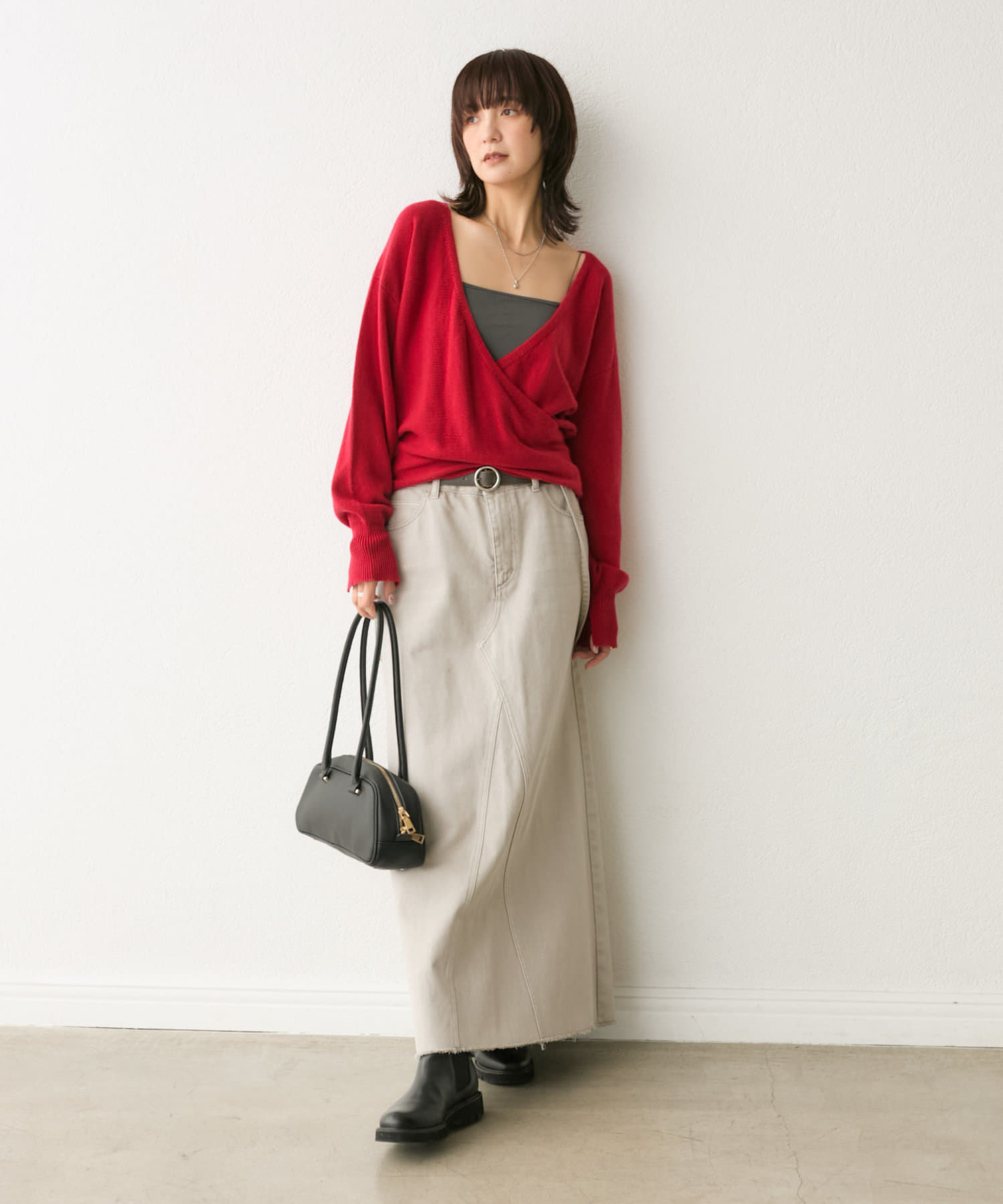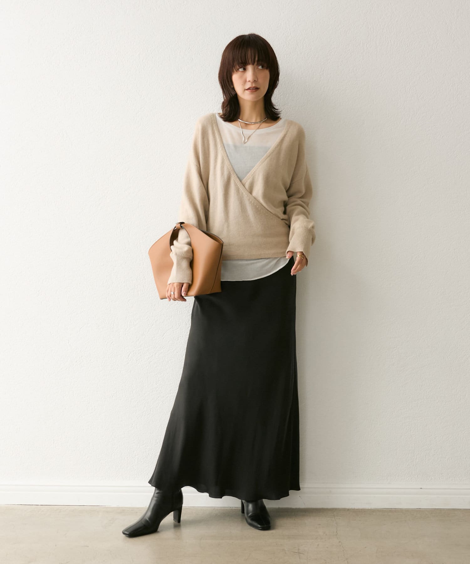 カシュクールは自然にデコルテ見せが叶うので、女っぽい抜けを作りたいときにピッタリなデザイン。