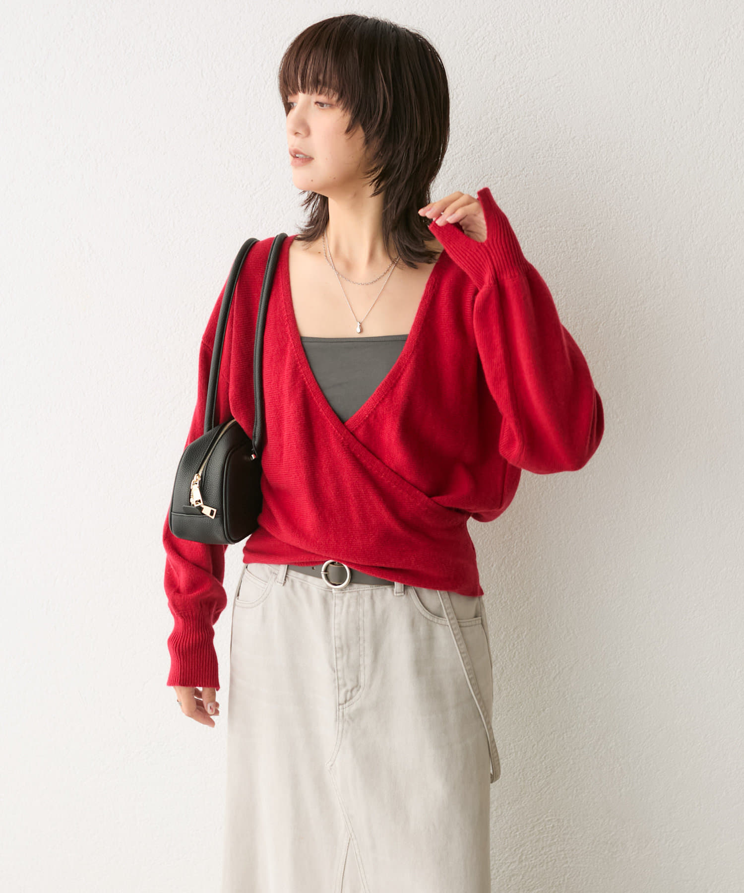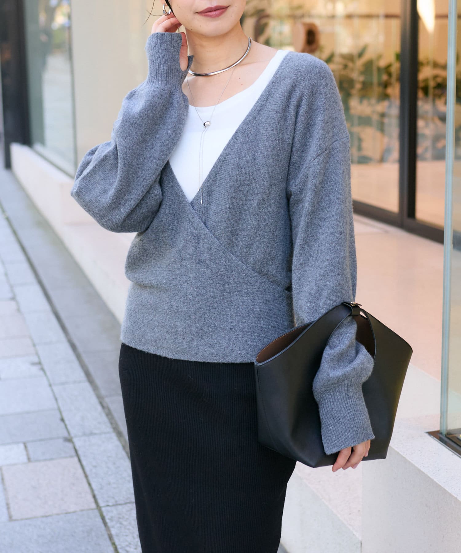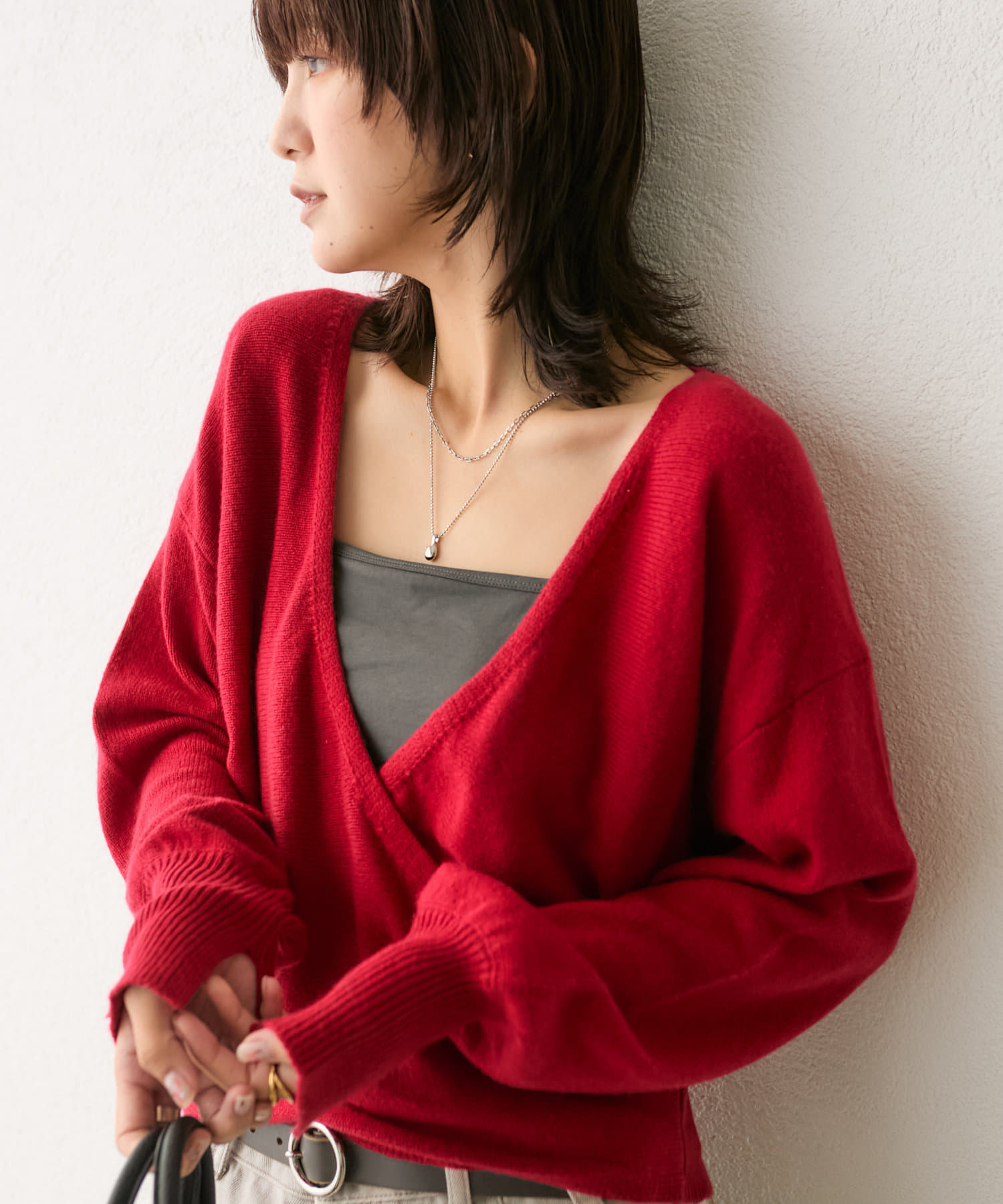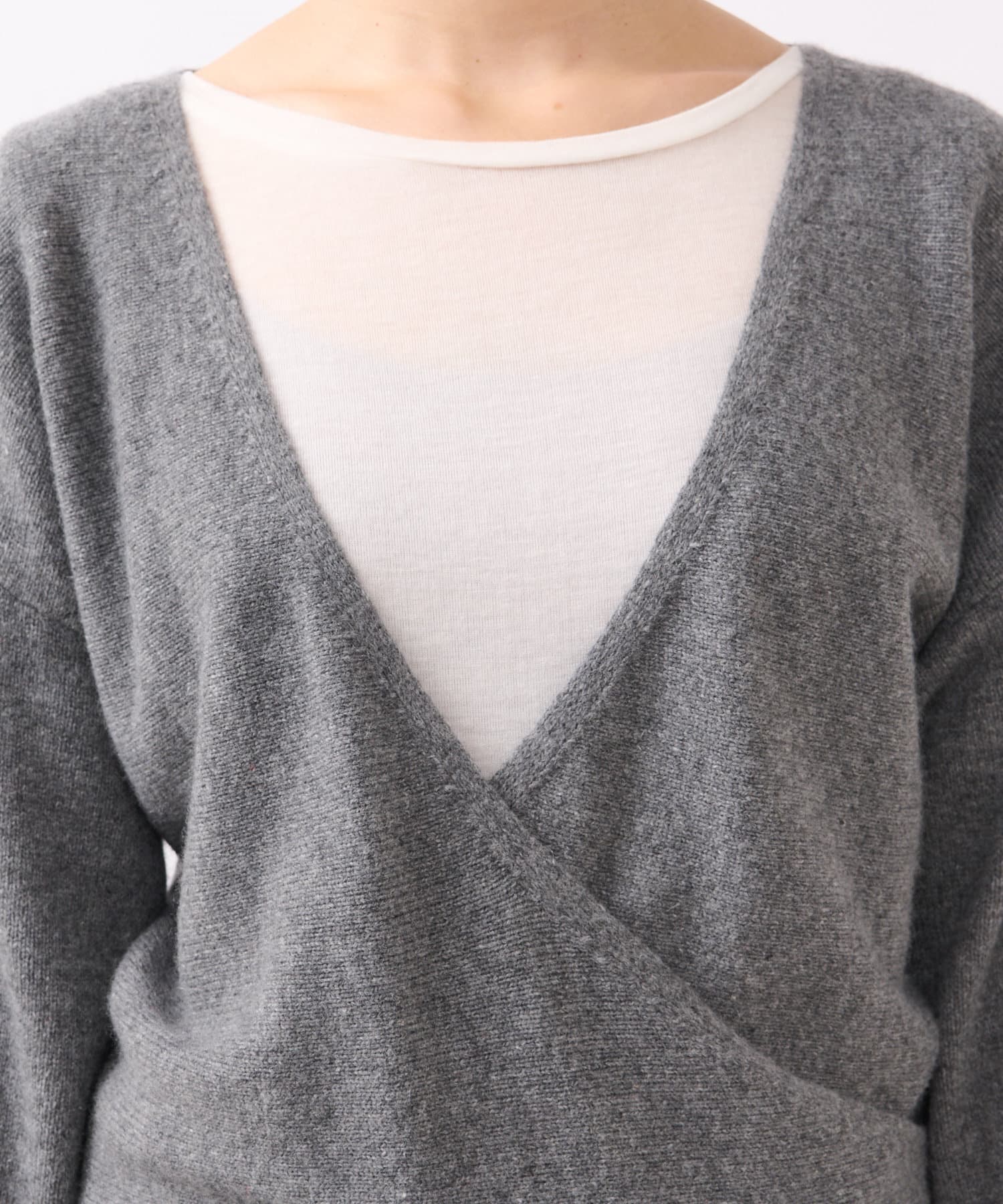 バランスのとりやすいコンパクトな着丈が特徴のカシュクールニット。