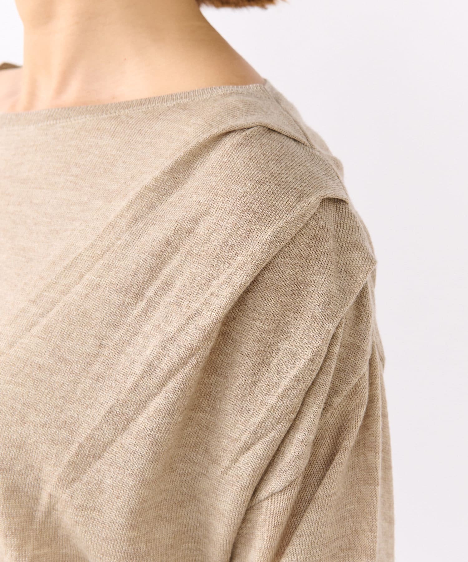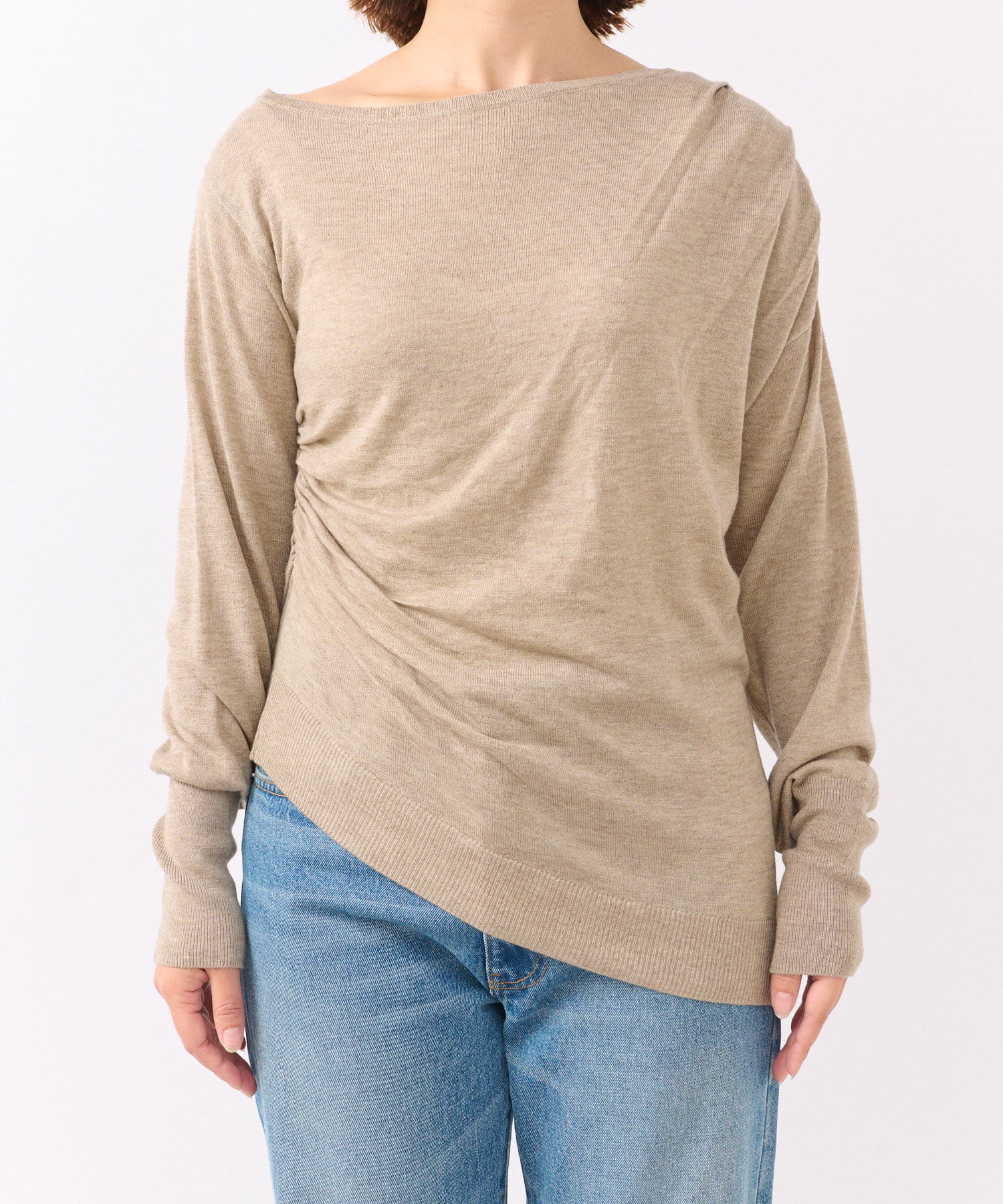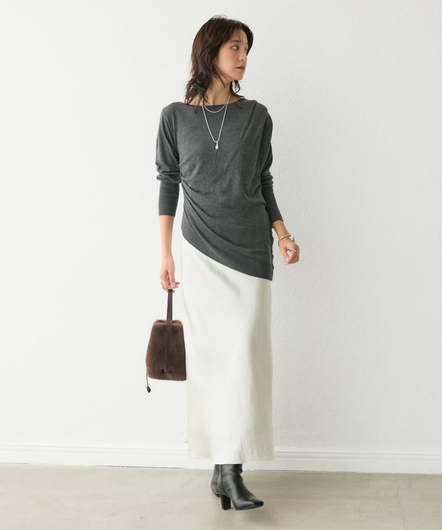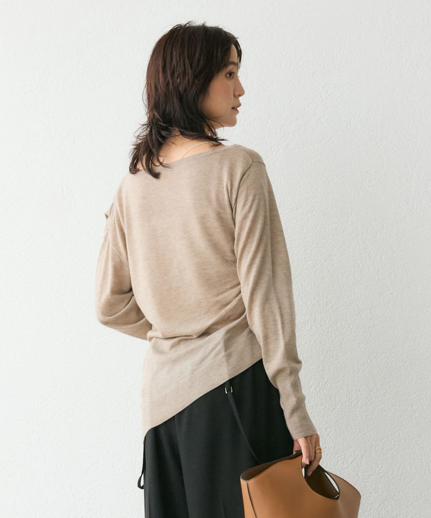 タックやギャザーのディテールで、アシンメトリーにドレープが出るシルエットを作っているので、着用するだけで自然に抜け感を出してくれます。