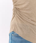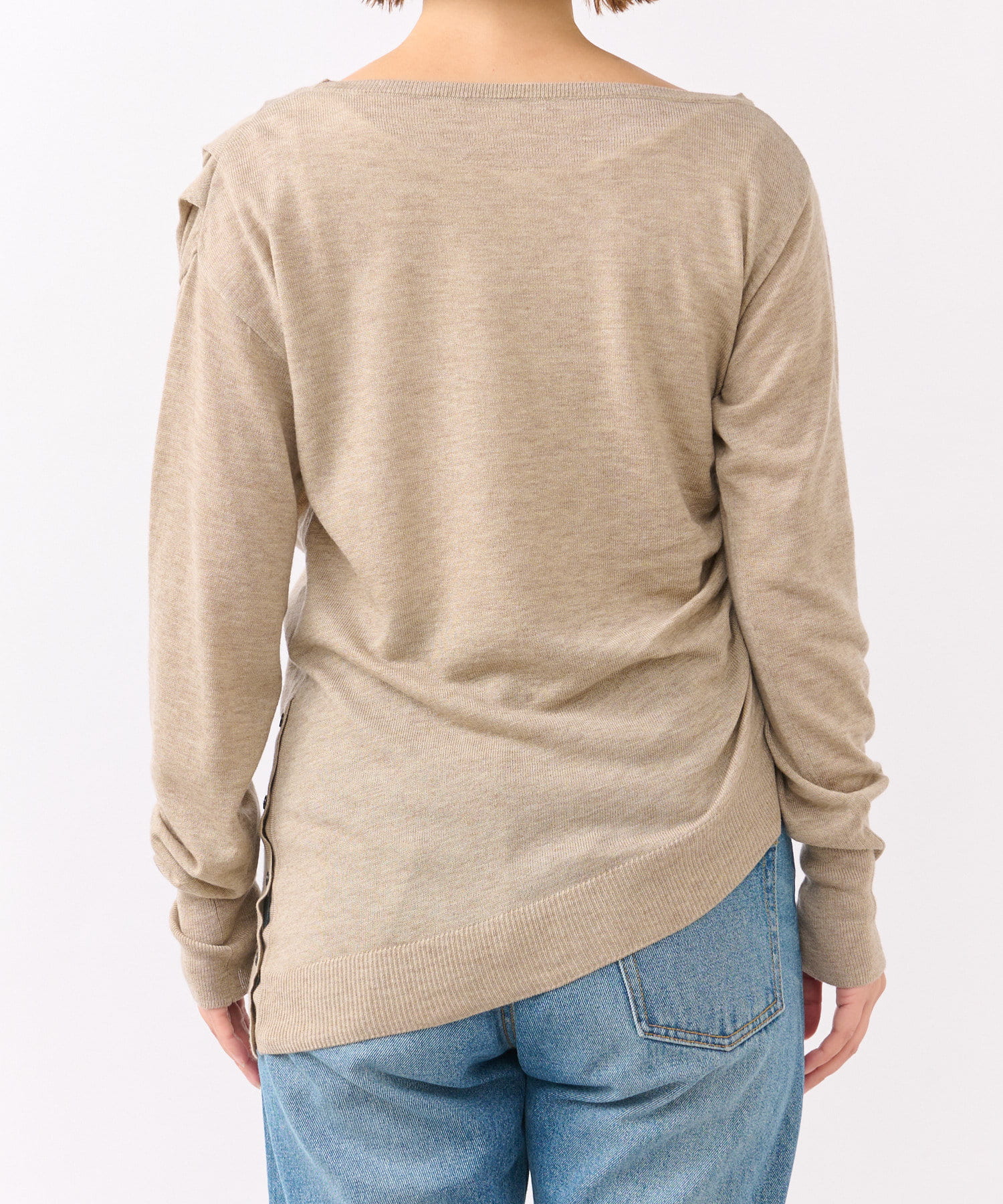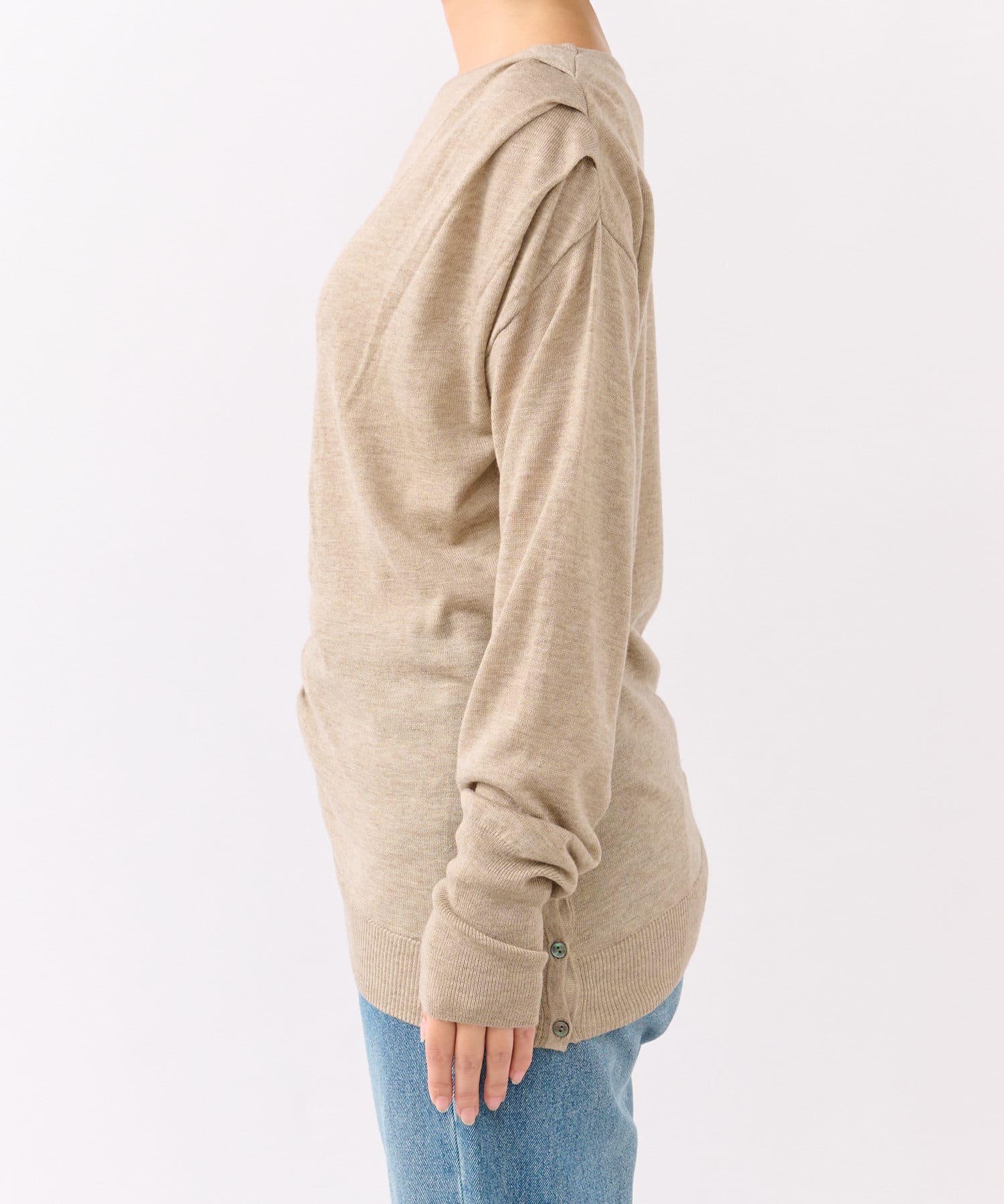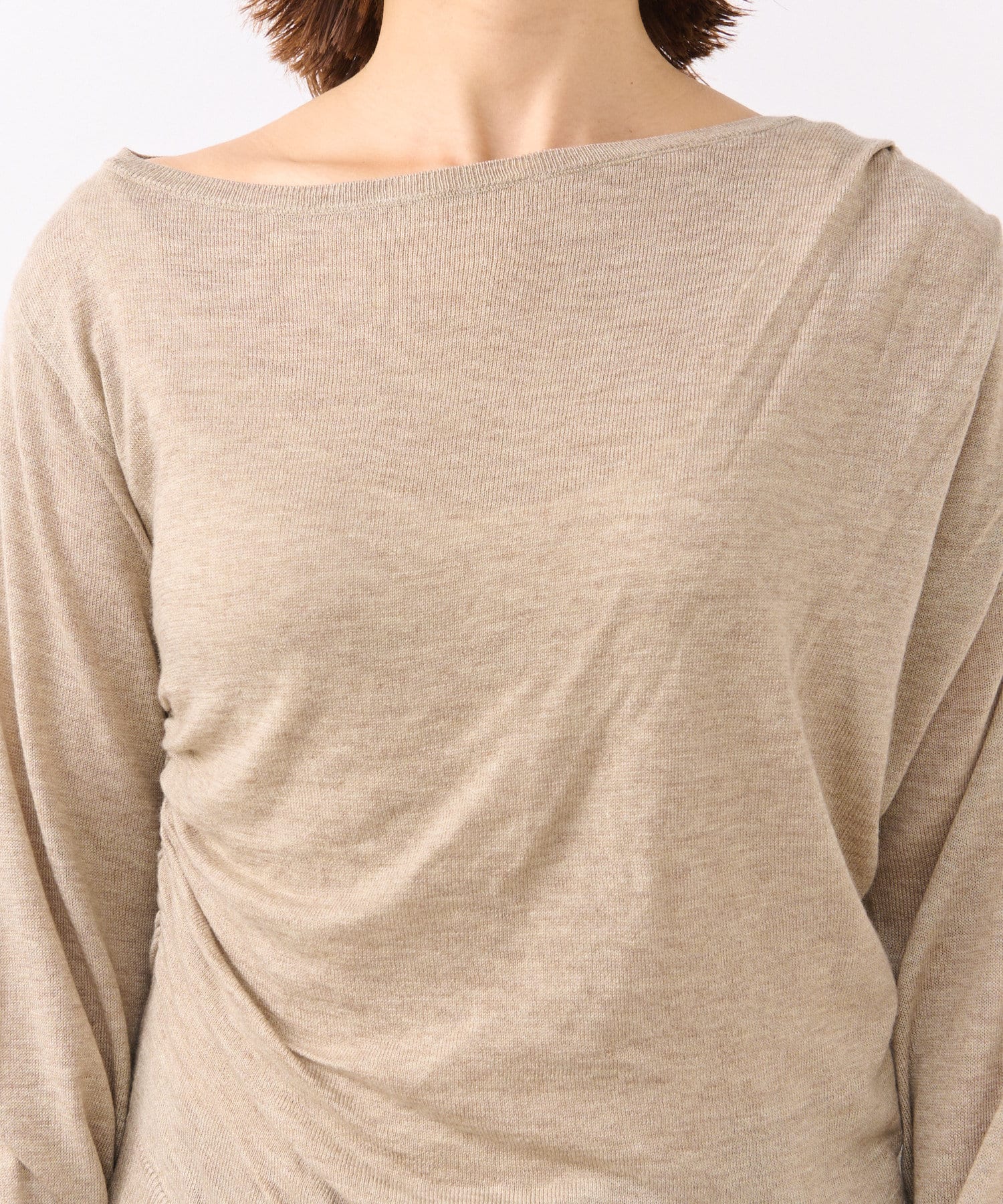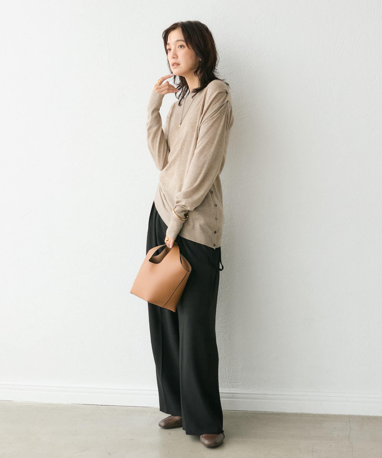 タックやギャザーのディテールで、アシンメトリーにドレープが出るシルエットを作っているので、着用するだけで自然に抜け感を出してくれます。