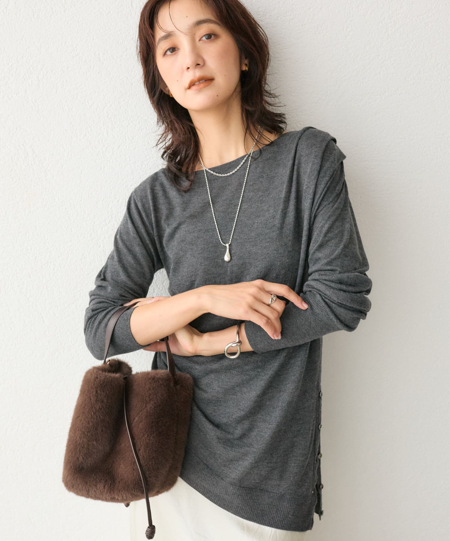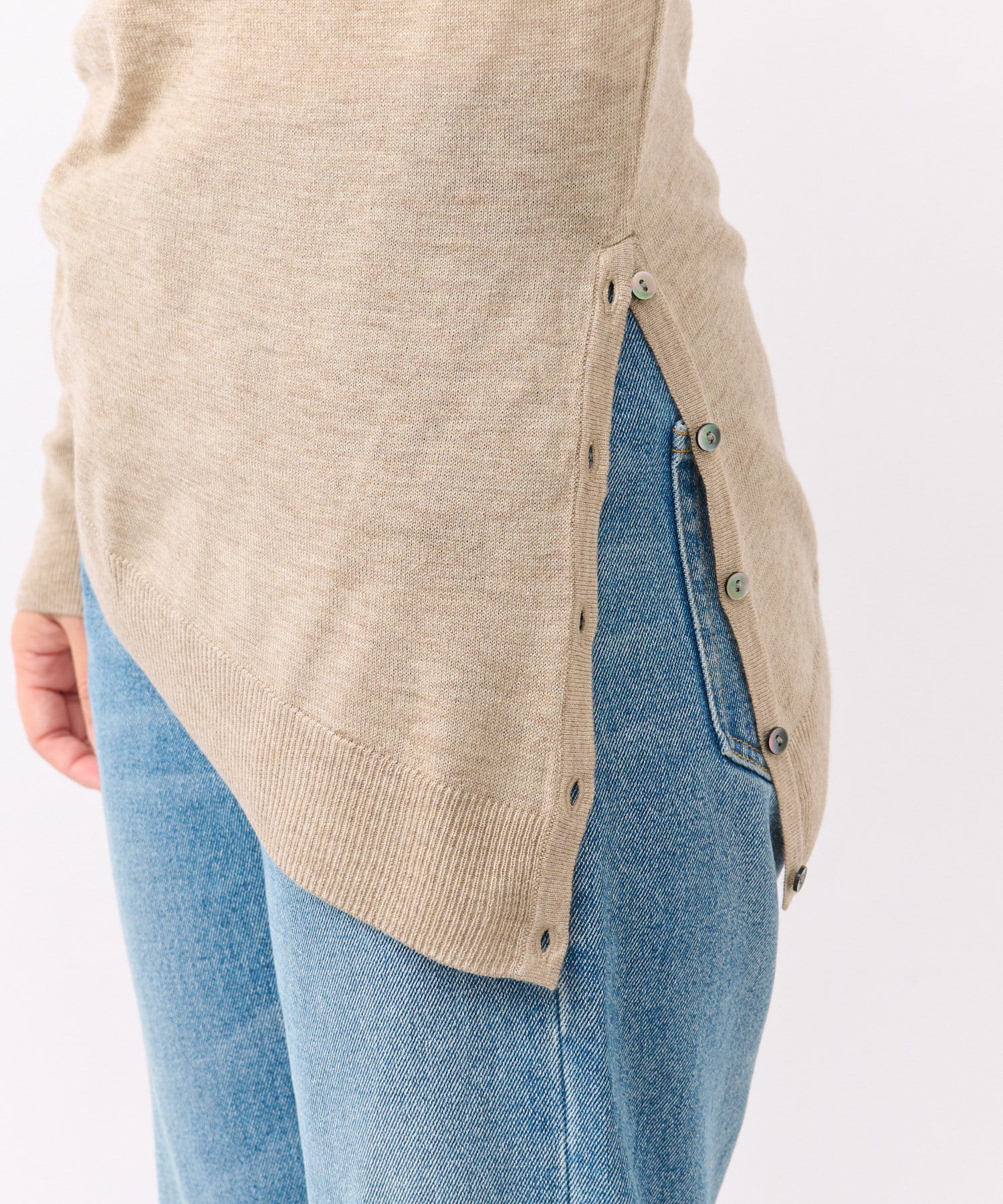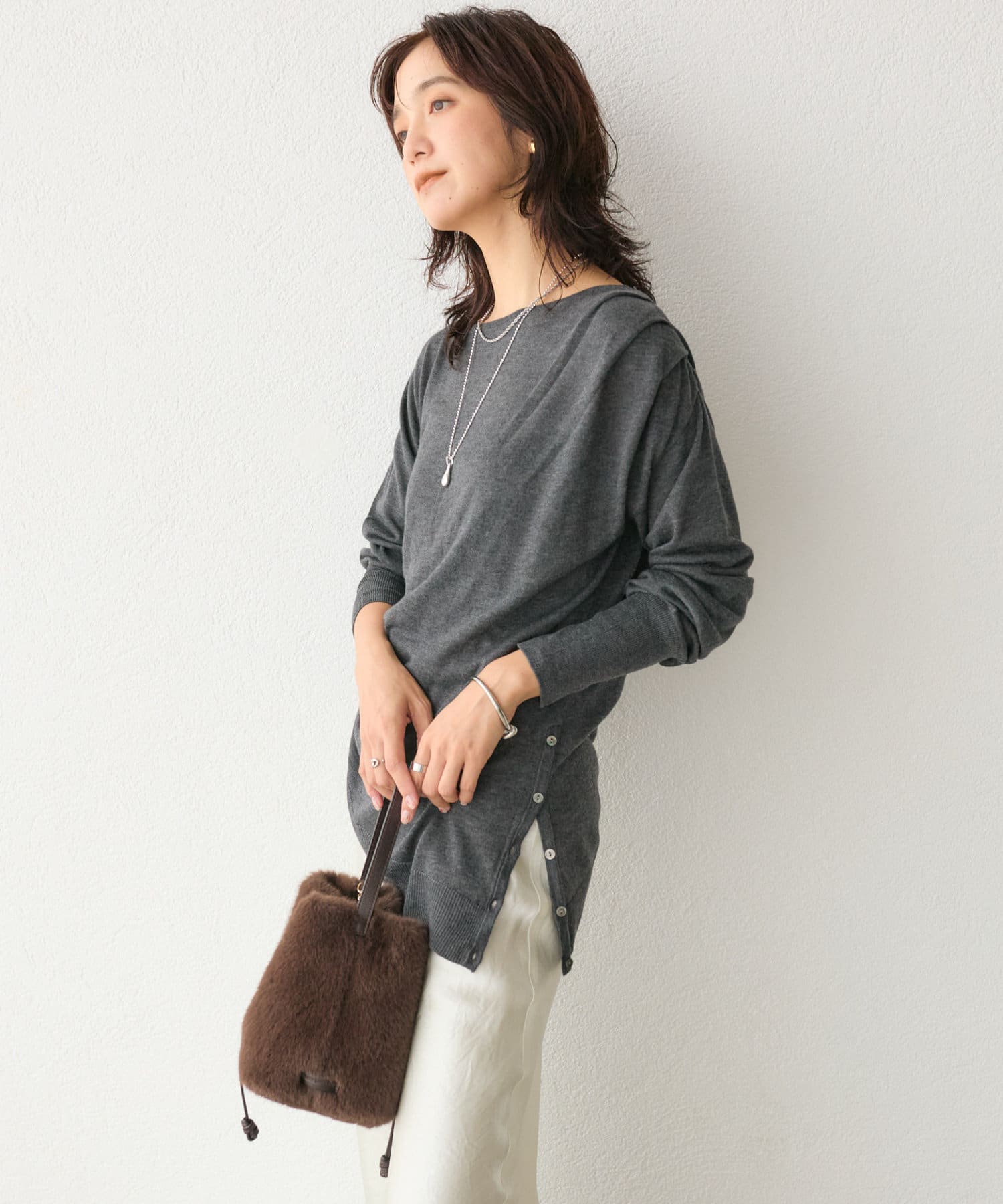左脇裾がボタンで開くようになっているので、スリットを開けるとシルエットに変化がでるので、合わせるボトムによって好みのバランスで楽しんでいただけます。