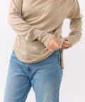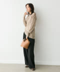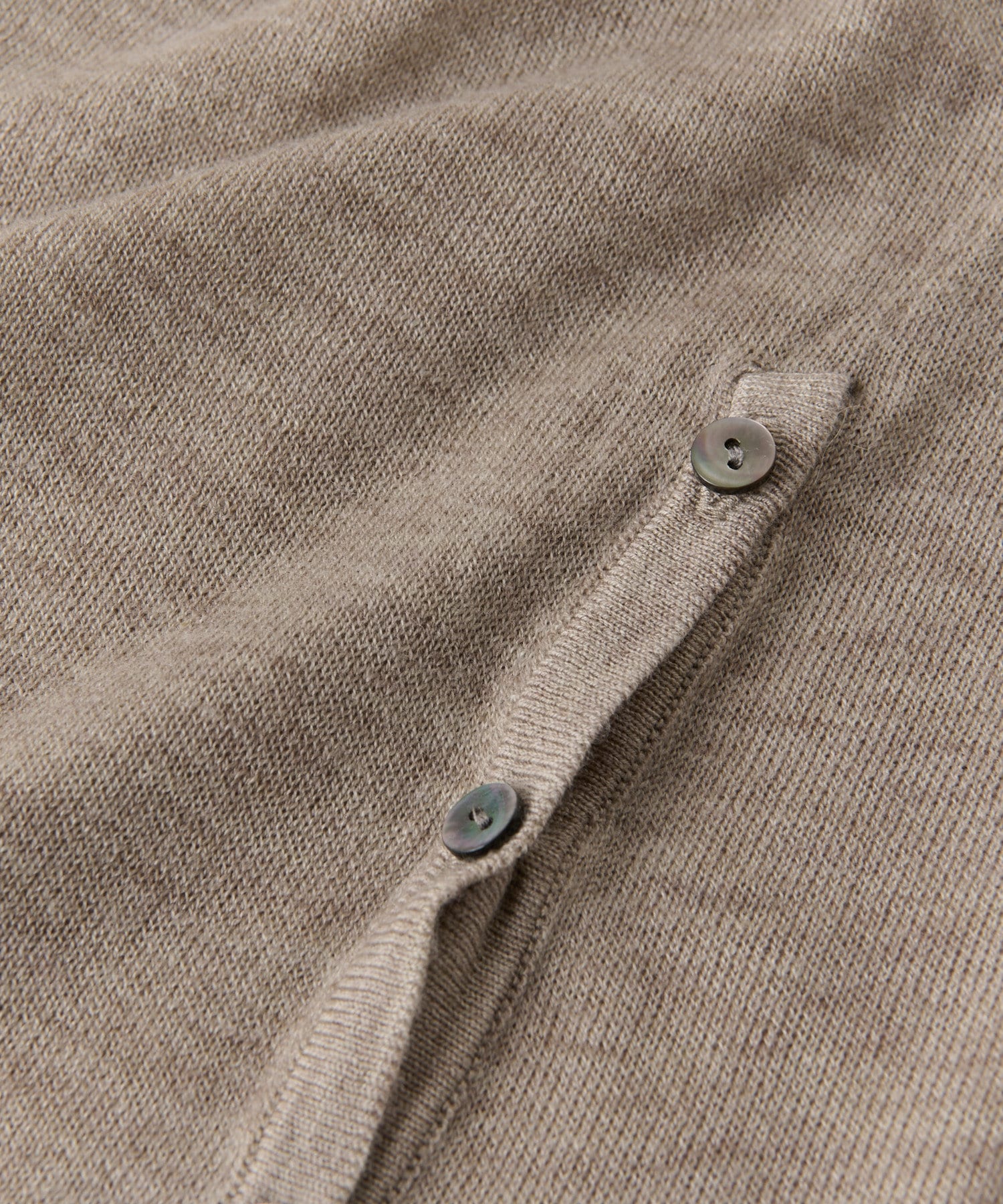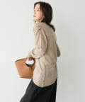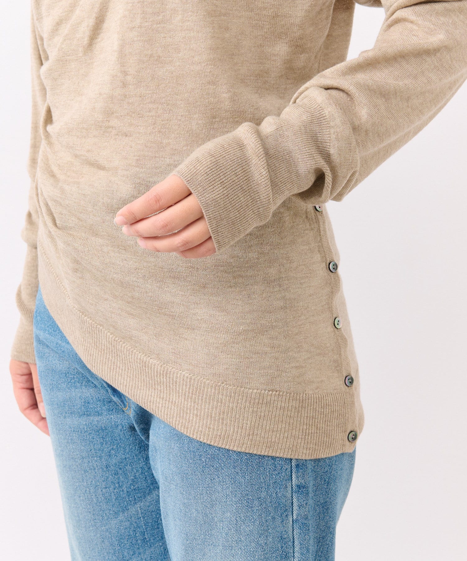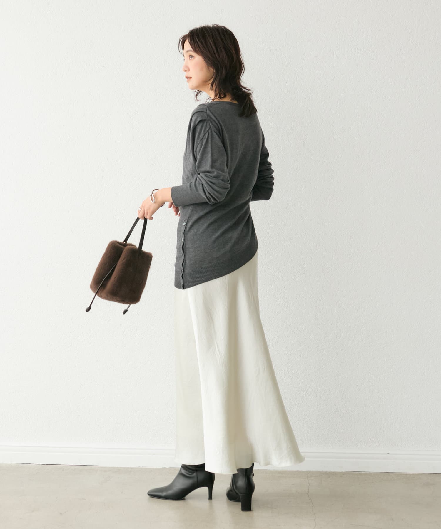 左脇裾がボタンで開くようになっているので、スリットを開けるとシルエットに変化がでるので、合わせるボトムによって好みのバランスで楽しんでいただけます。