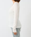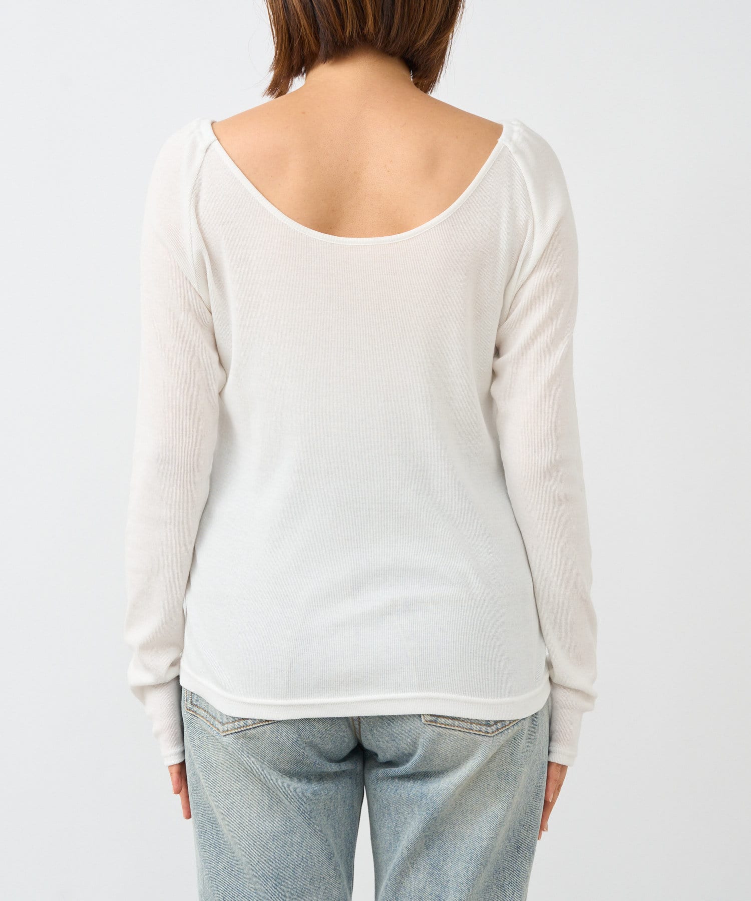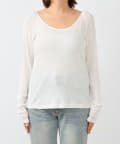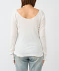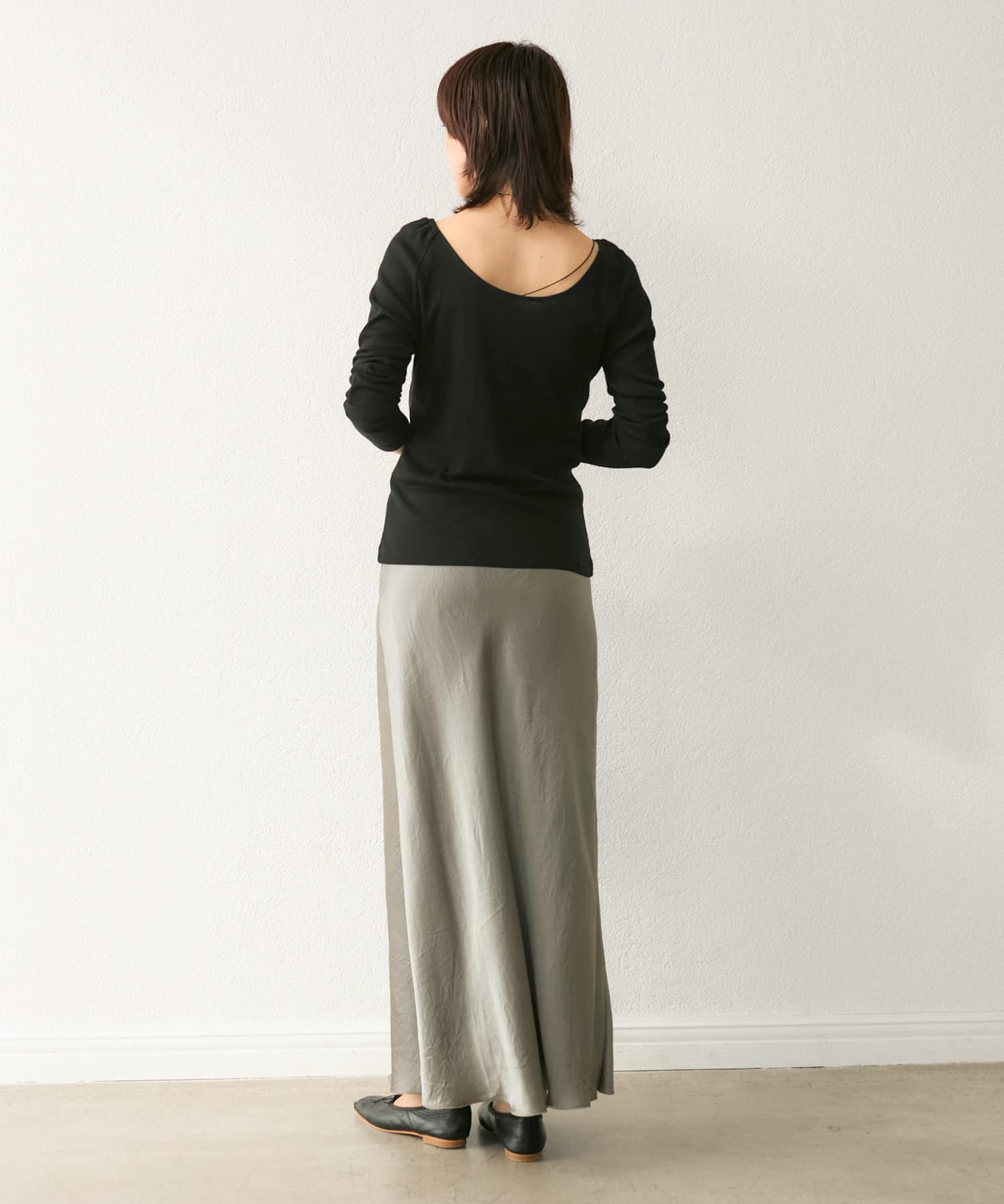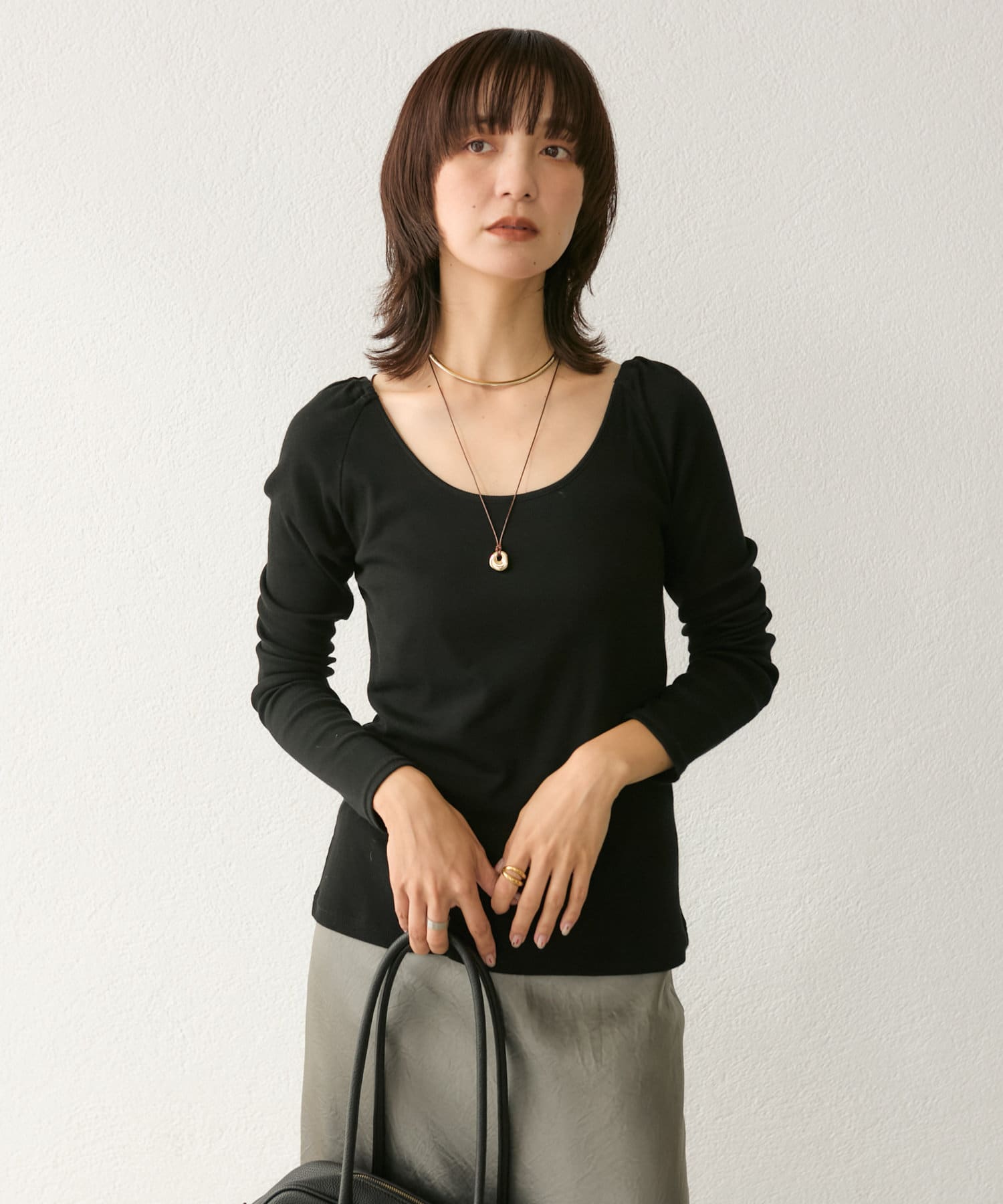 大きく開いた衿ぐりでデコルテラインが綺麗に見えるカットソー。