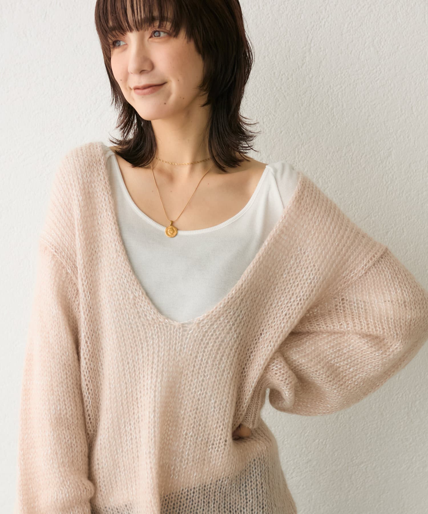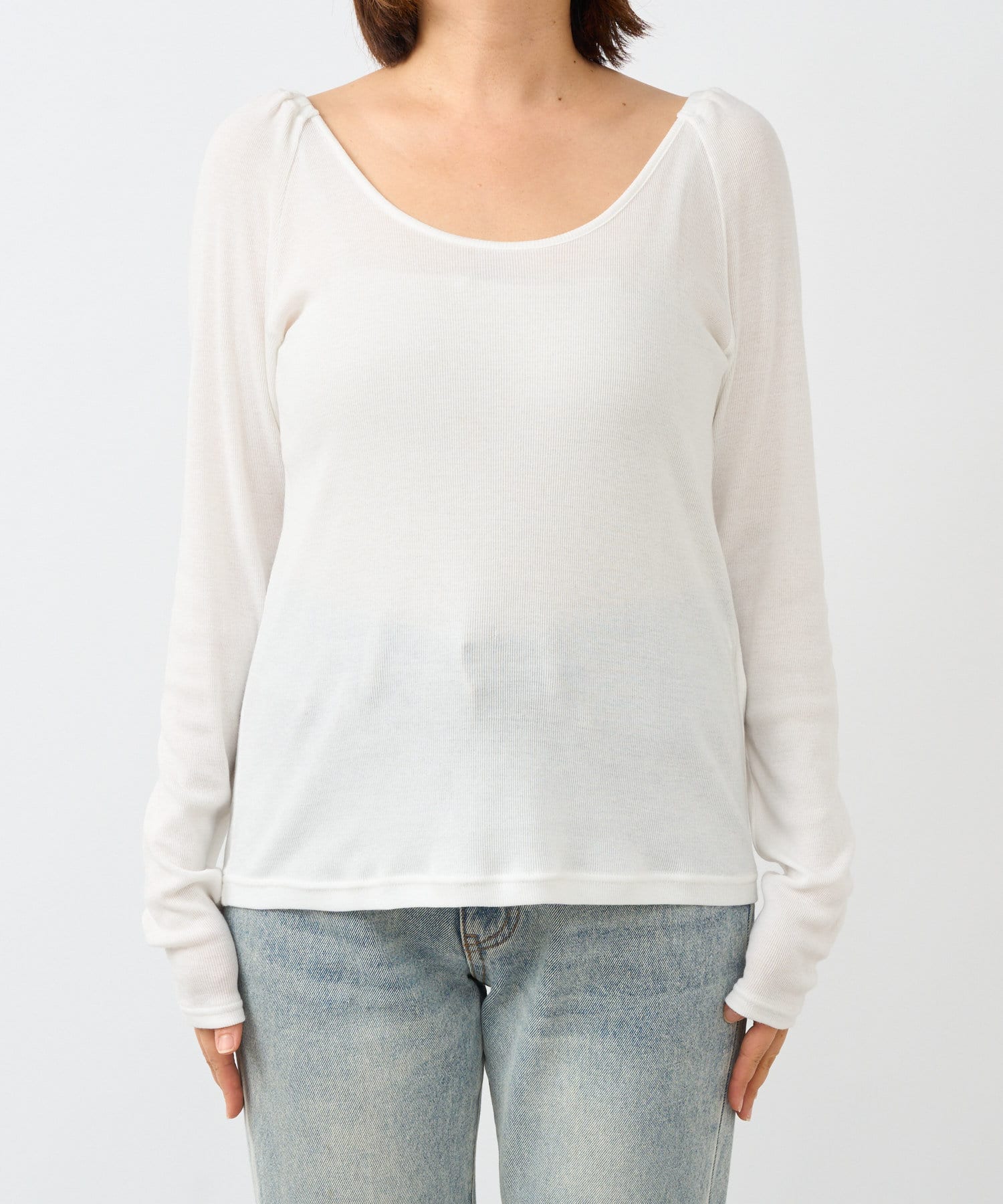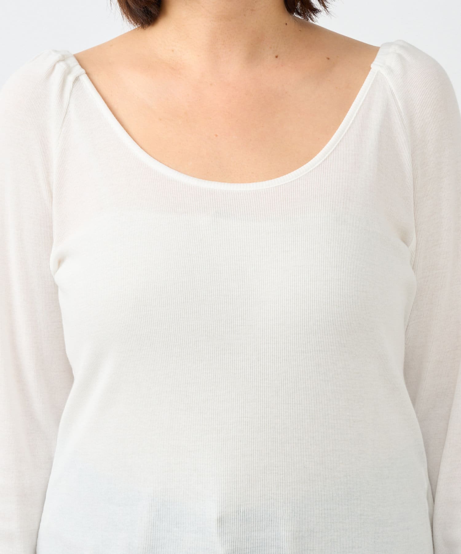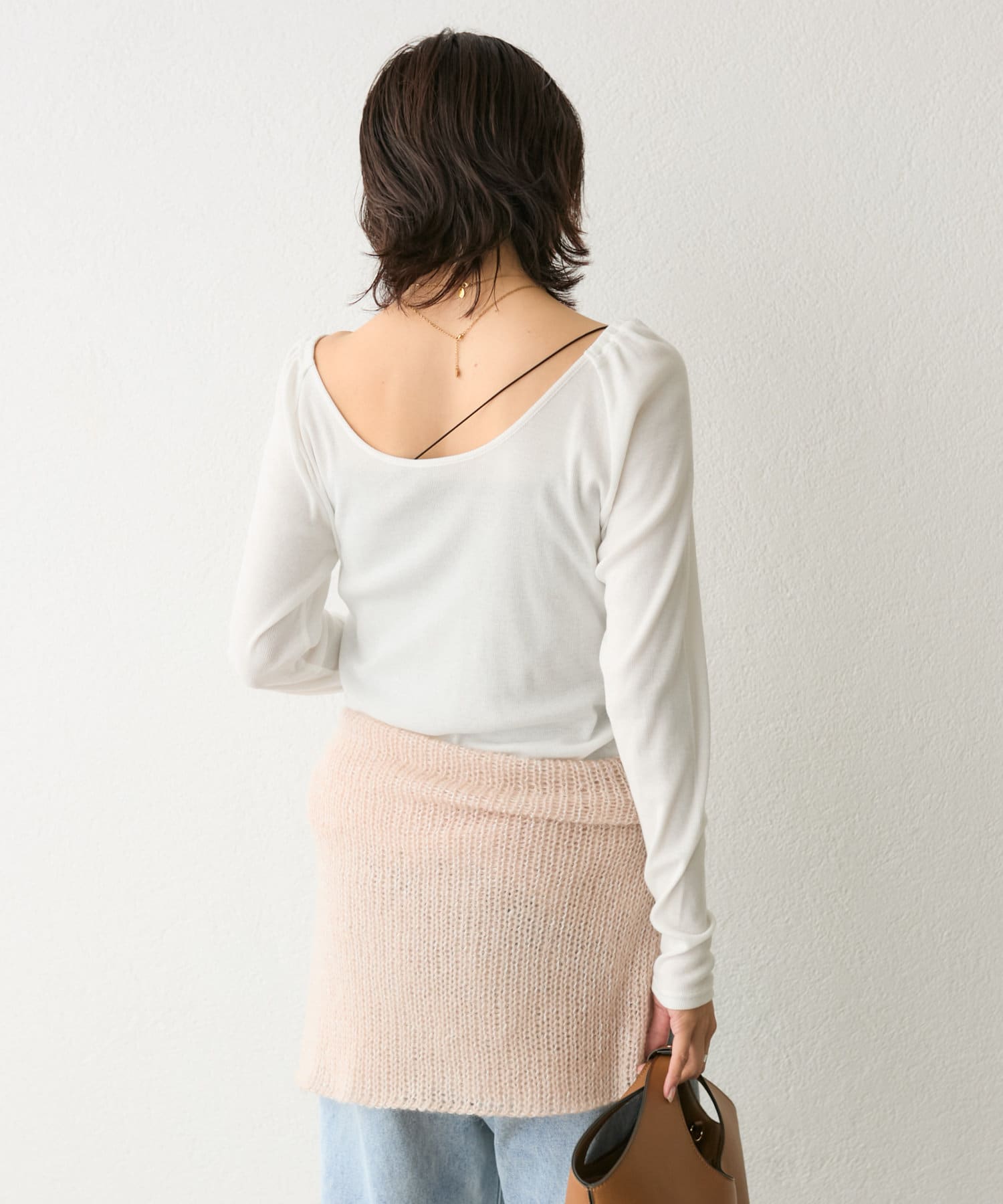肩の部分にゴムを入れており、オフショルダーにしても安定感があるので、肩を出すようなニットのインナーとしてもお使いいただけます。