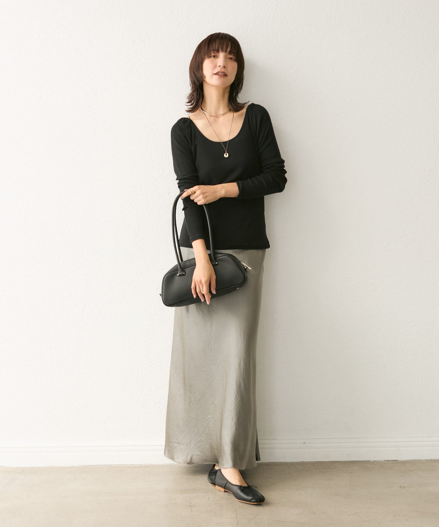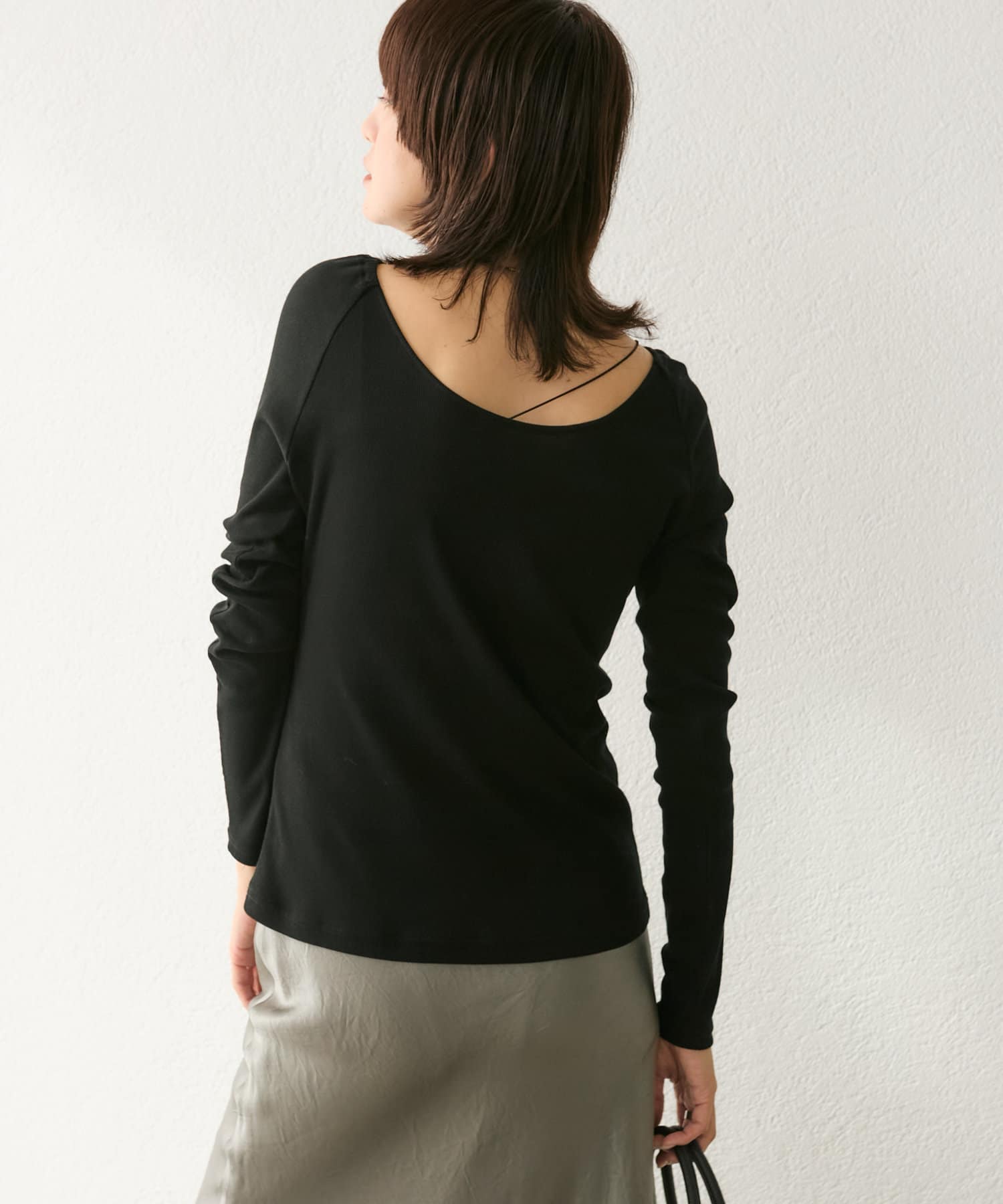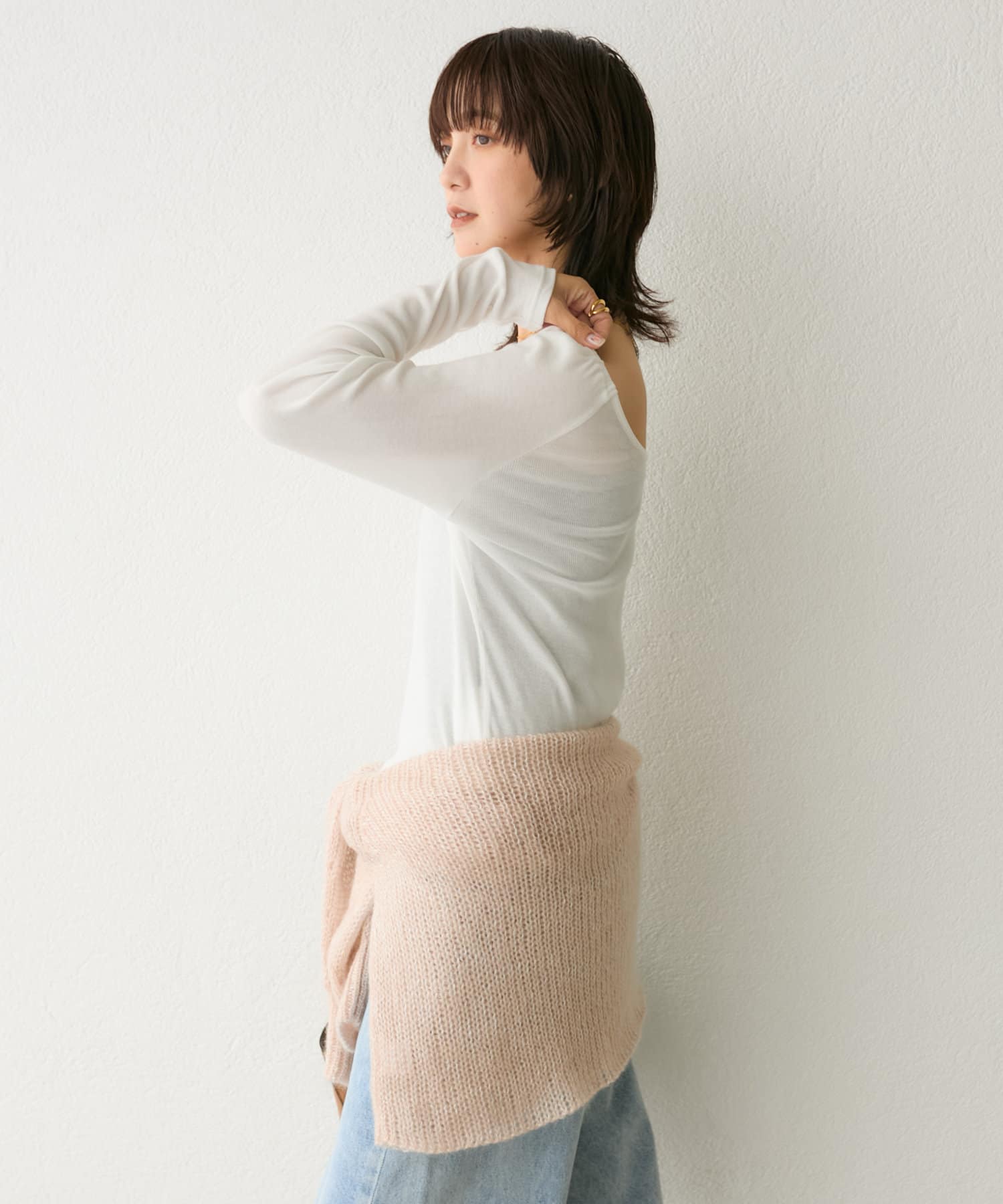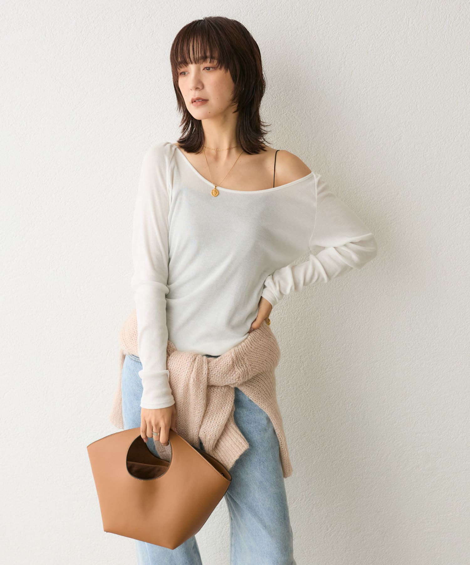 ボートネックだったり、衿ぐりのゆるっとしたトップスのインナーにしていただくと、女性らしい印象で抜け感のある着こなしに。