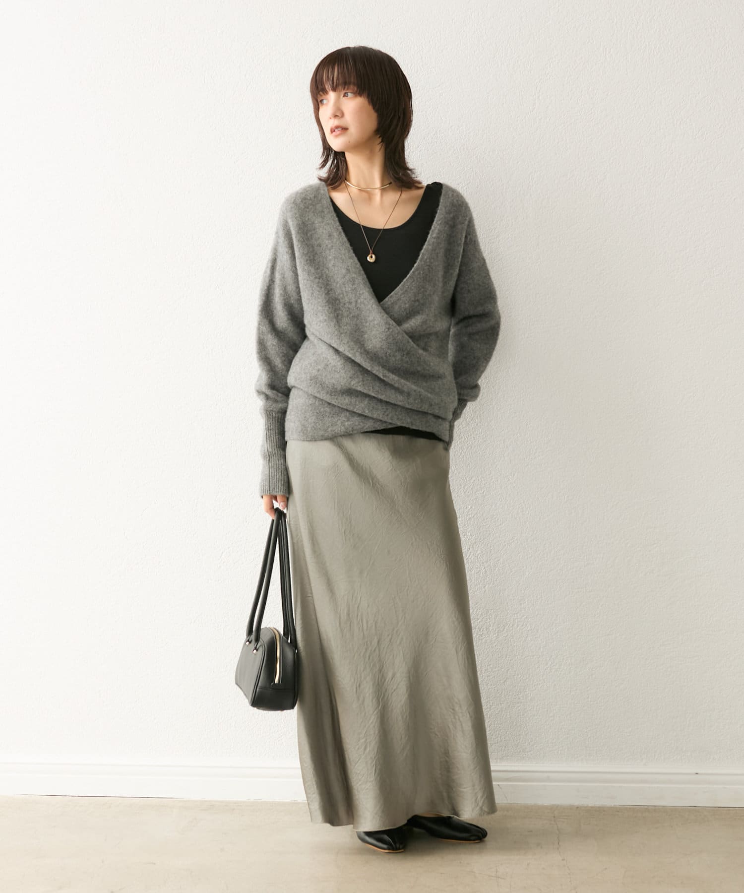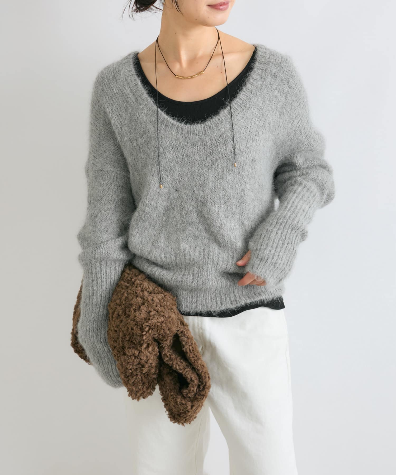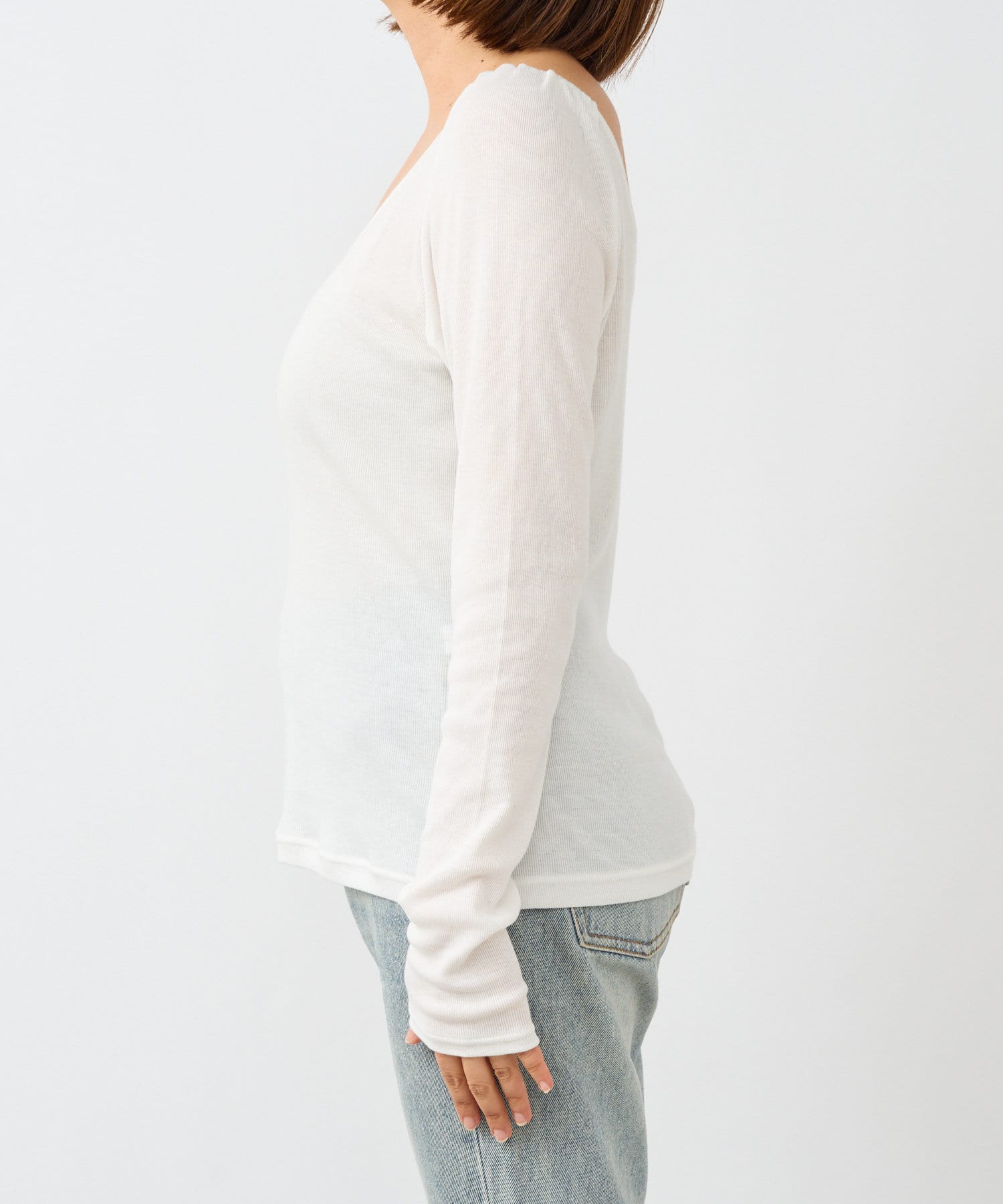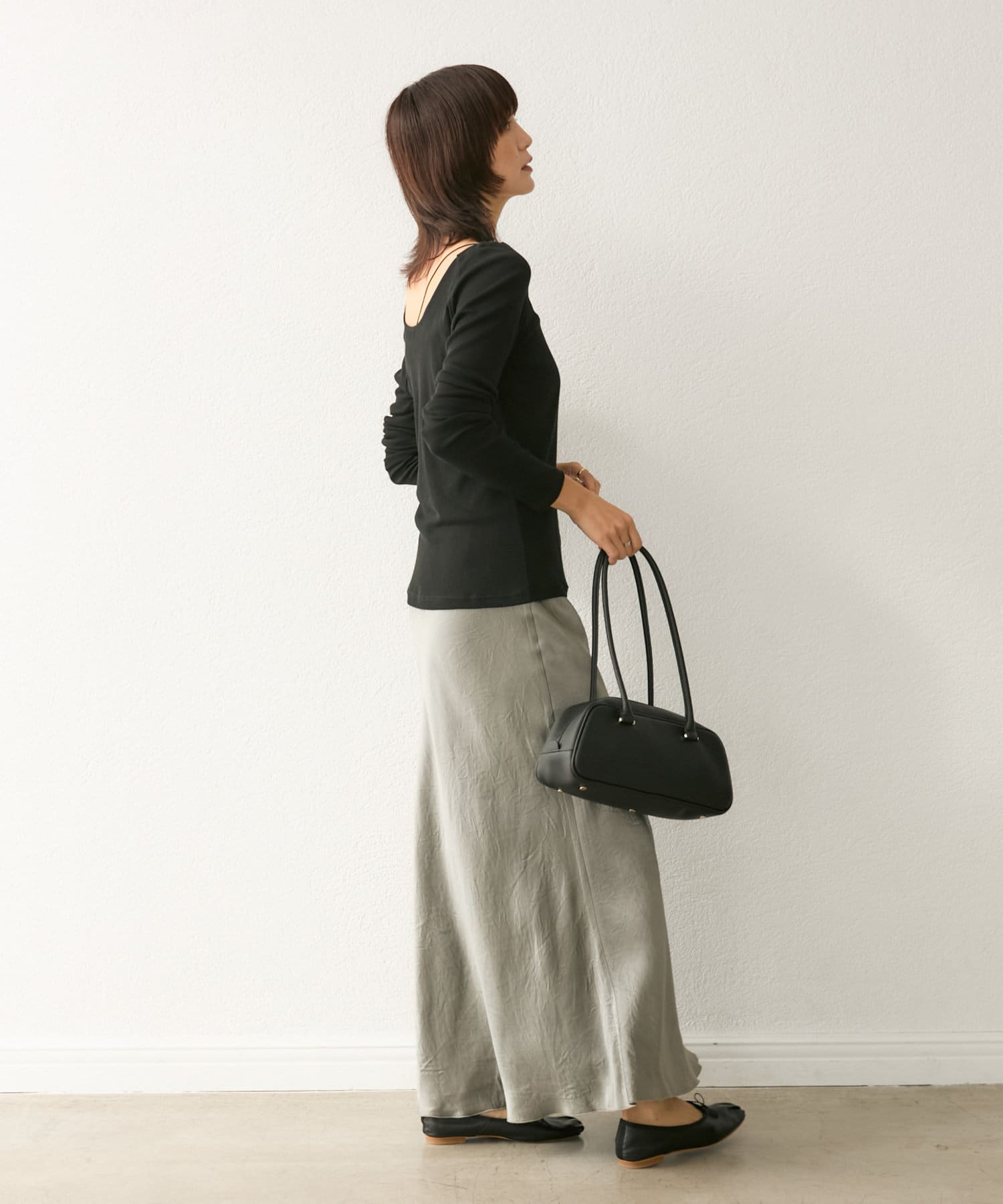 ボートネックだったり、衿ぐりのゆるっとしたトップスのインナーにしていただくと、女性らしい印象で抜け感のある着こなしに。