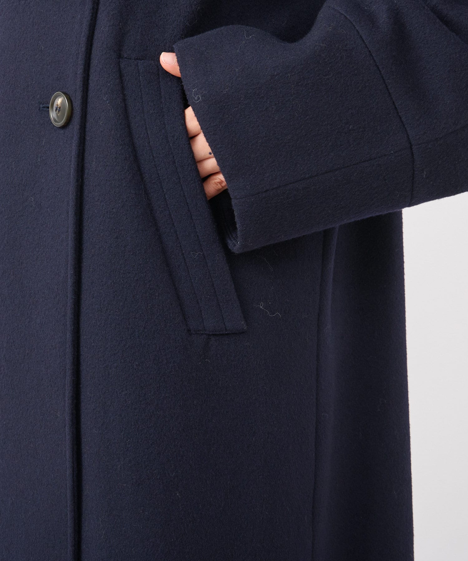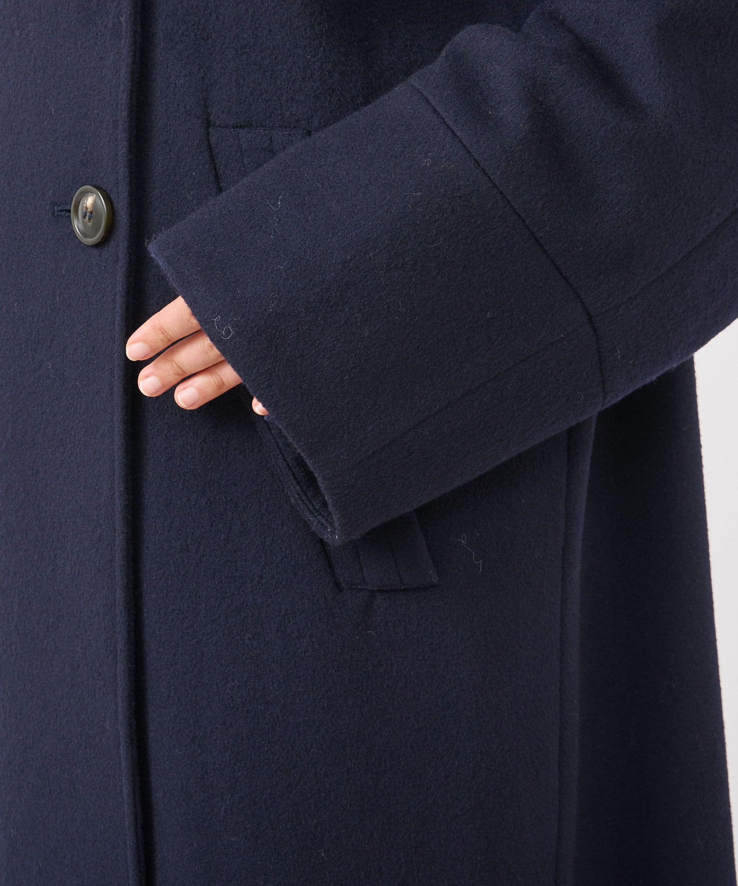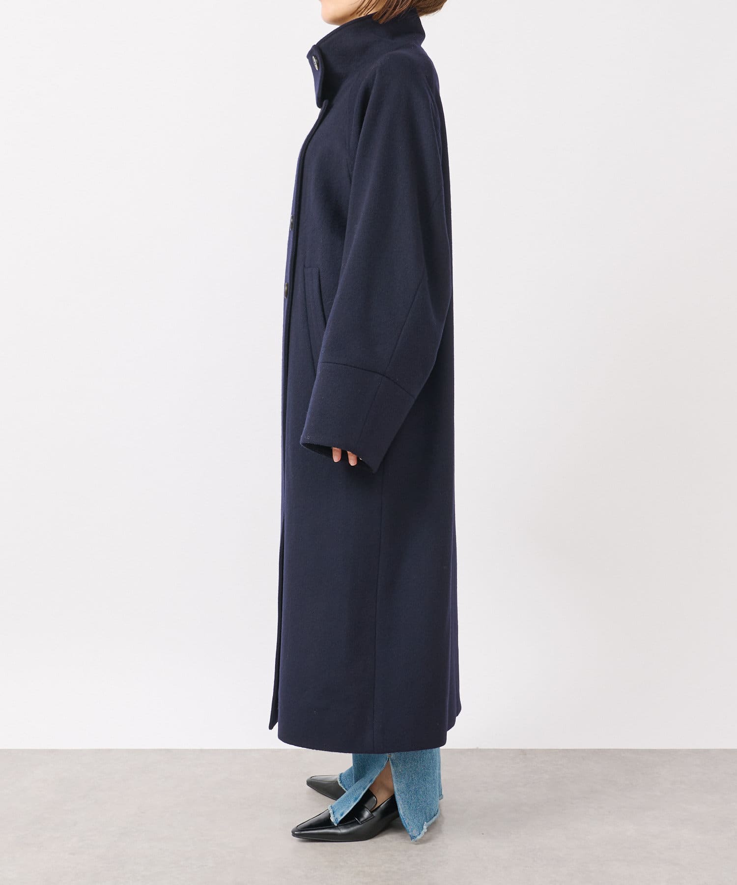 スタンドネックと言っても長すぎないため、着る人を選ばず、タートルネックなどのインナーとのレイヤードも可能。